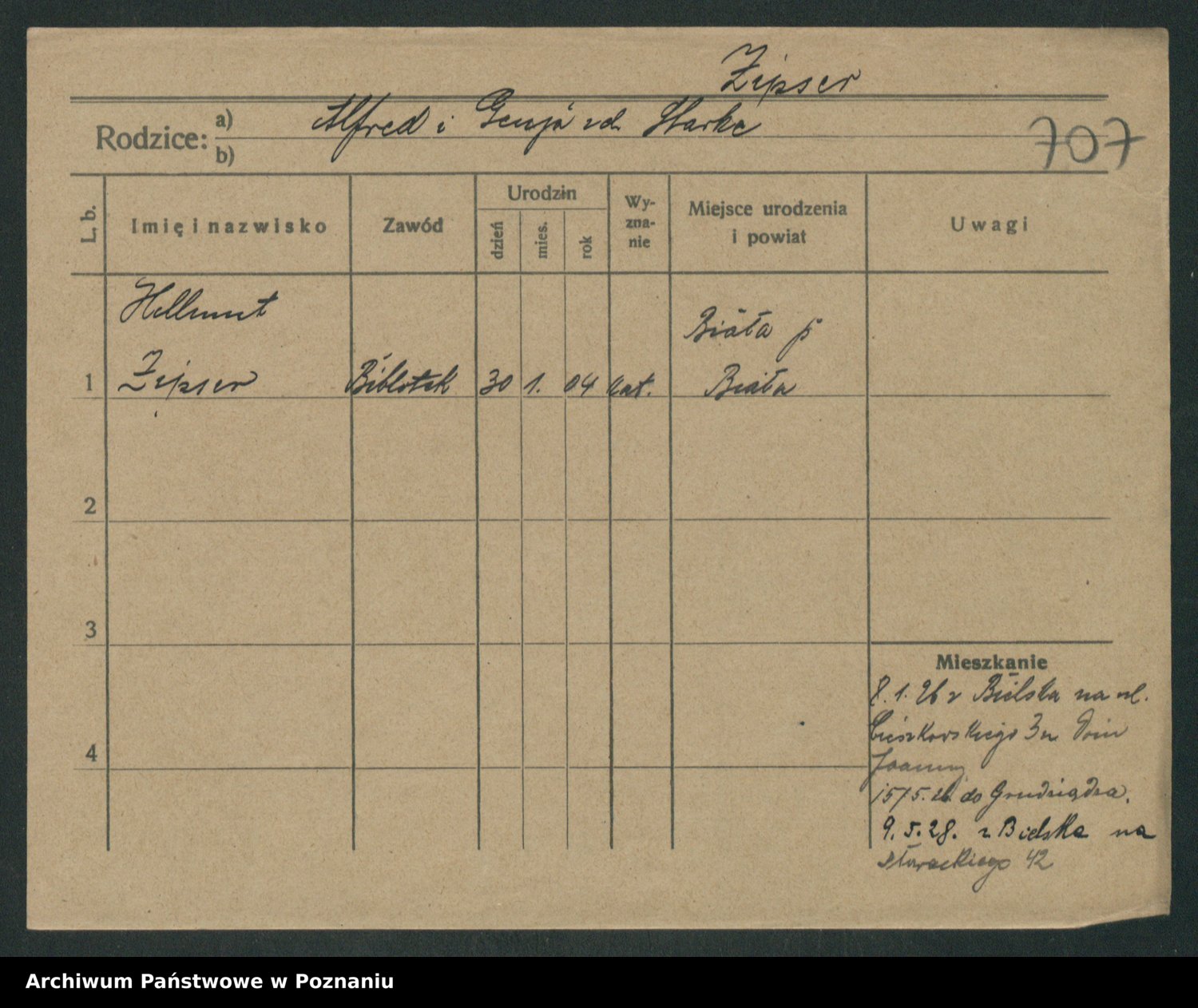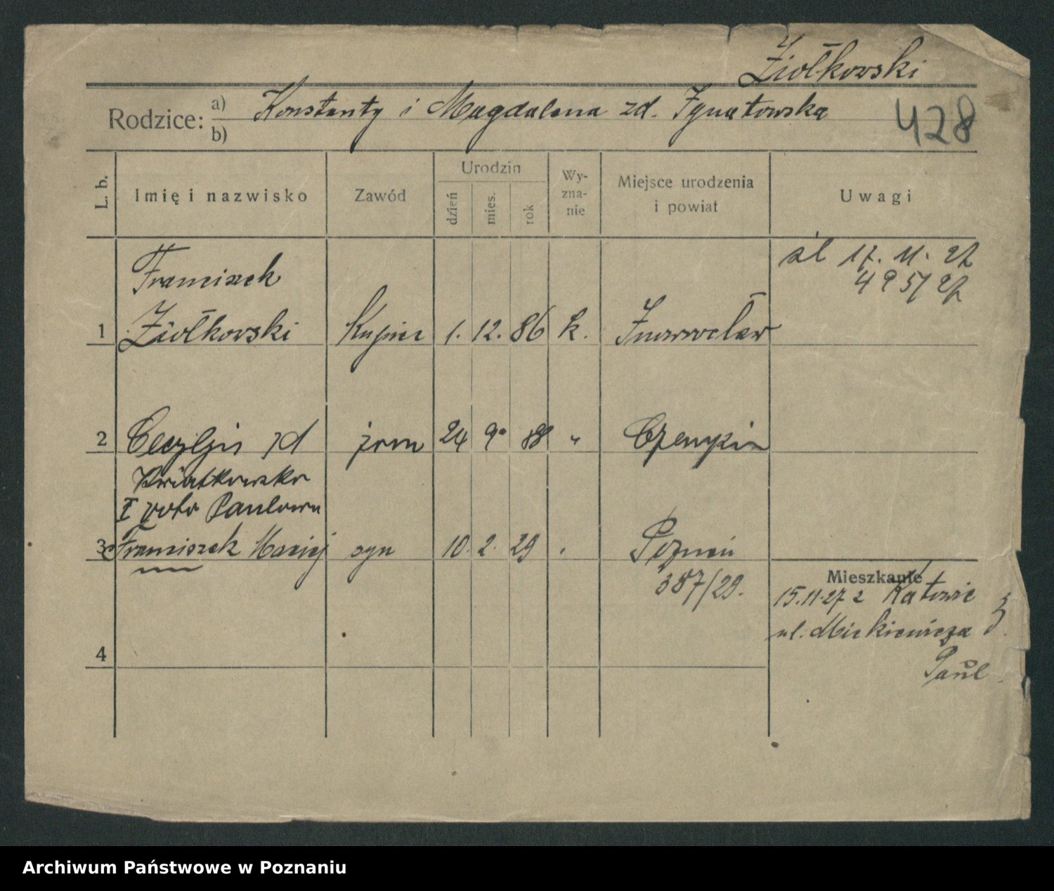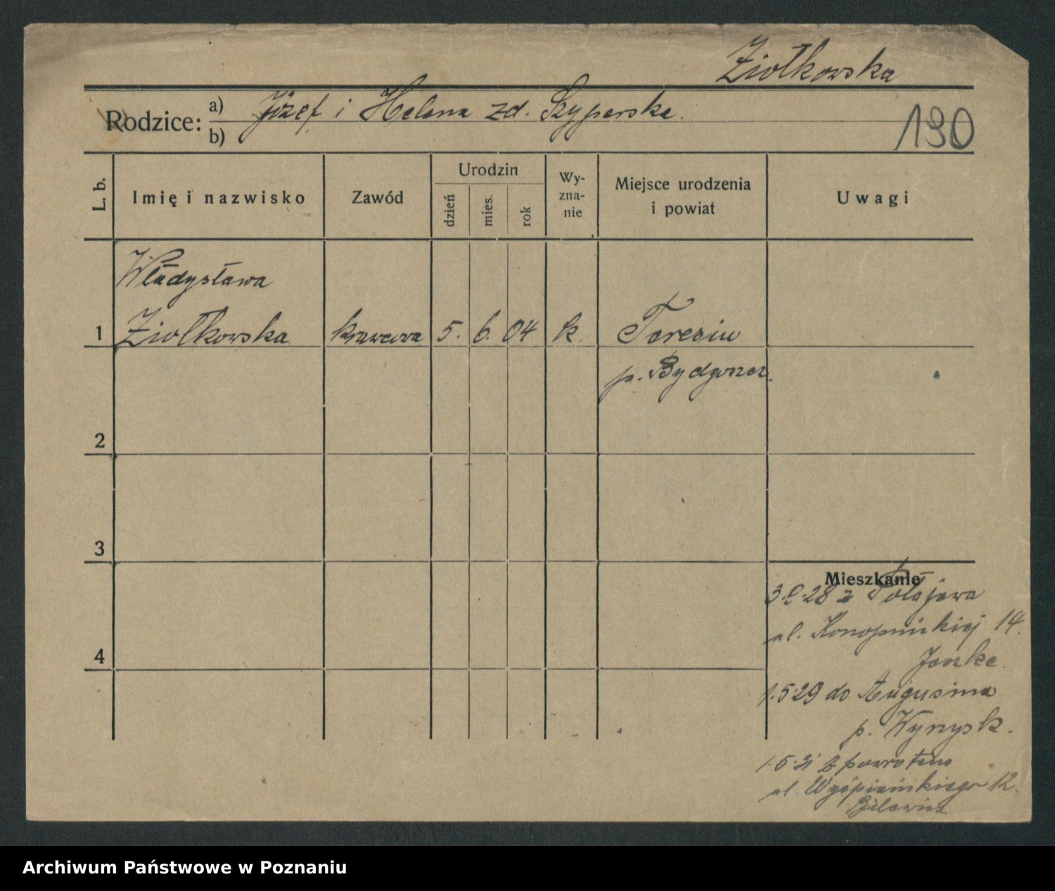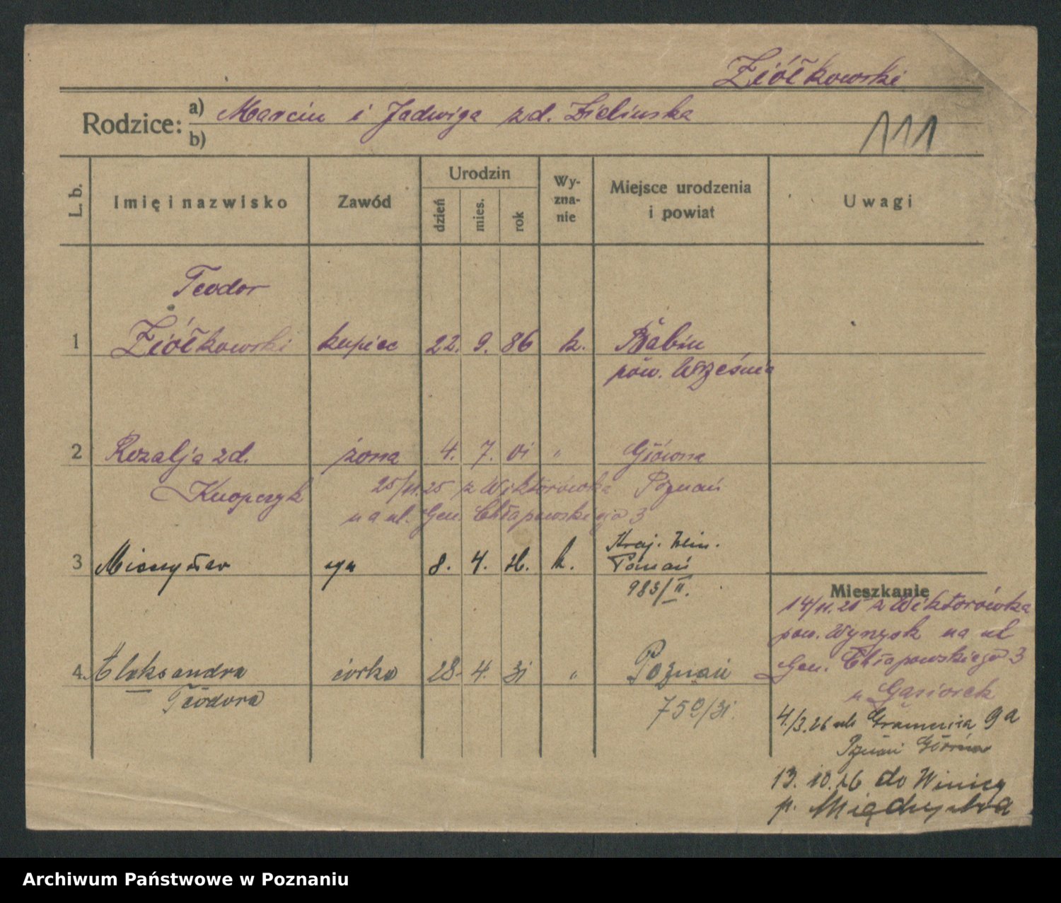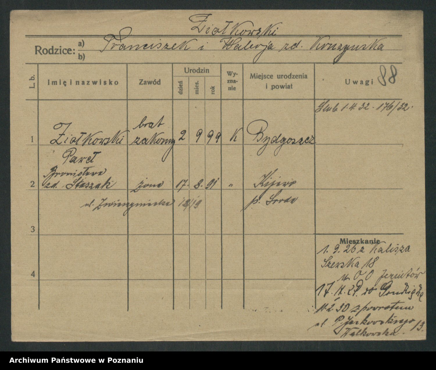 Podgląd karty osobowej dostępny jest po kliknięciu na nazwisko lub ikonkę karty. Można dokonywać powiększenia (ikony na górze) lub przechodzić między kolejnymi skanami (strzałki po bokach).