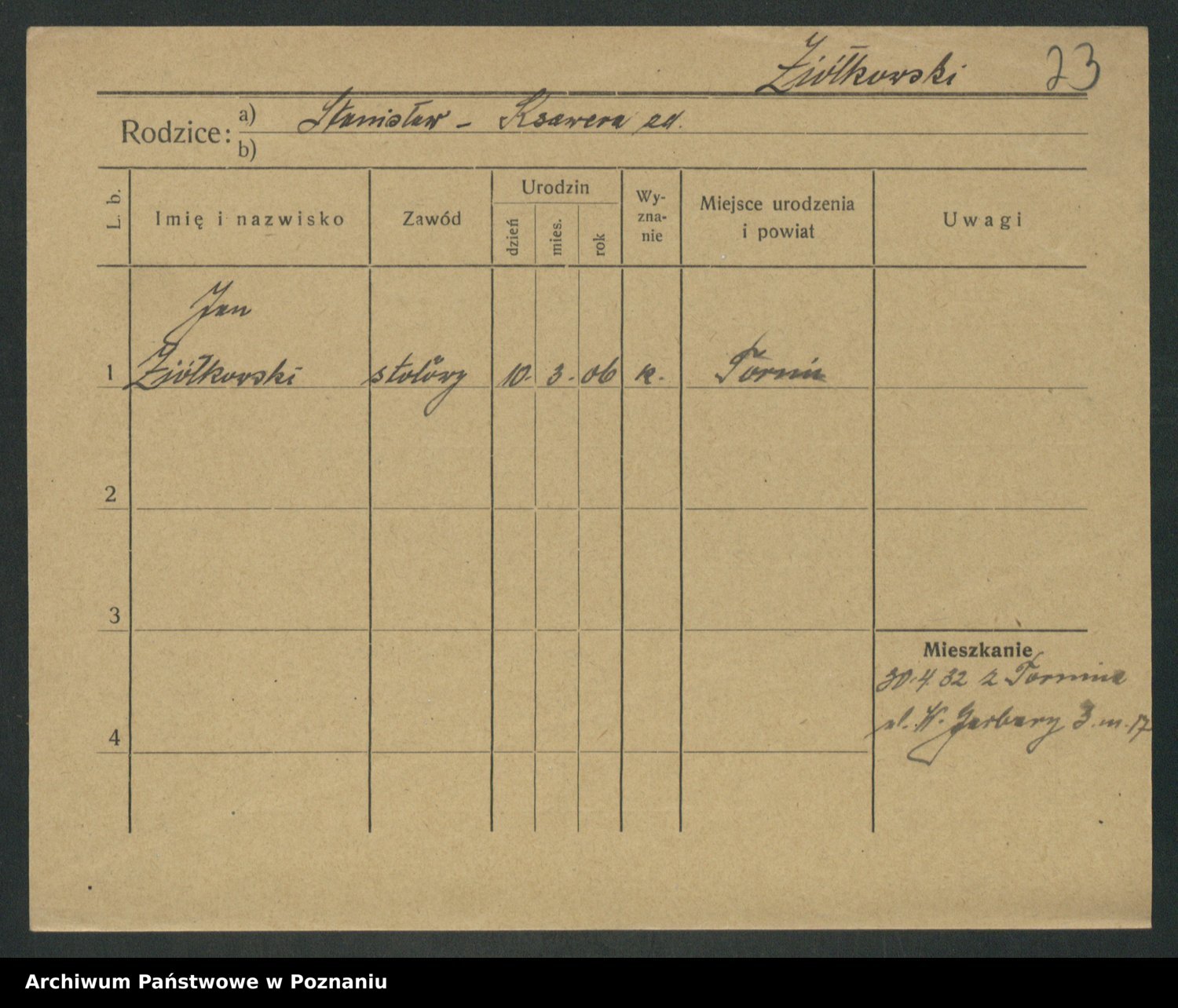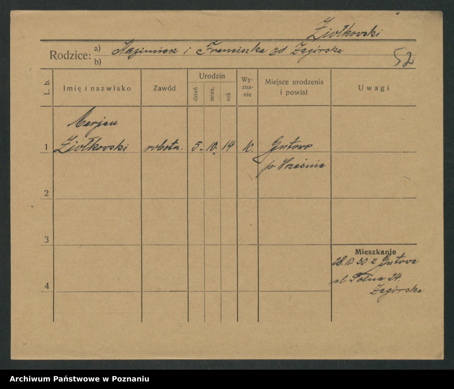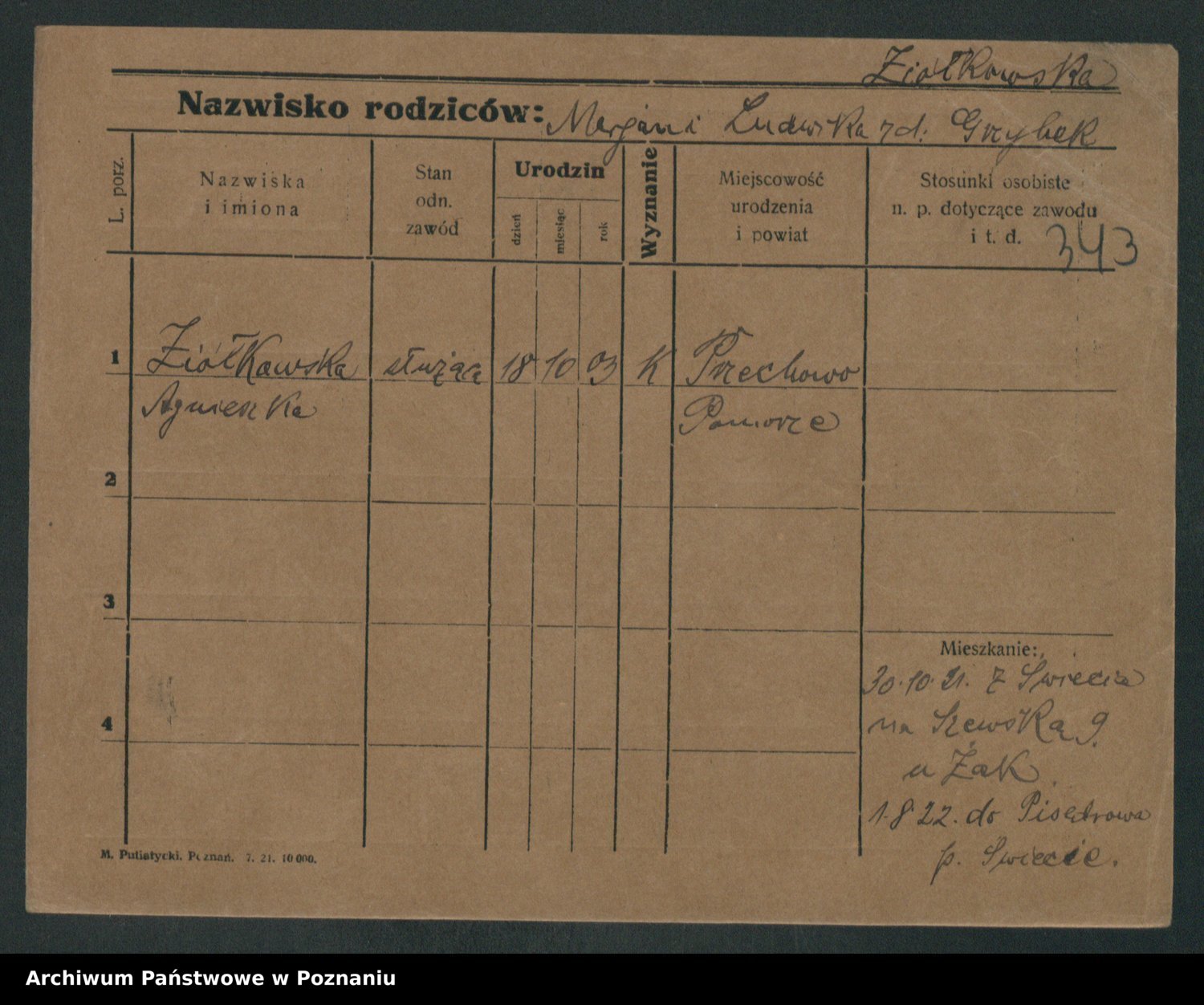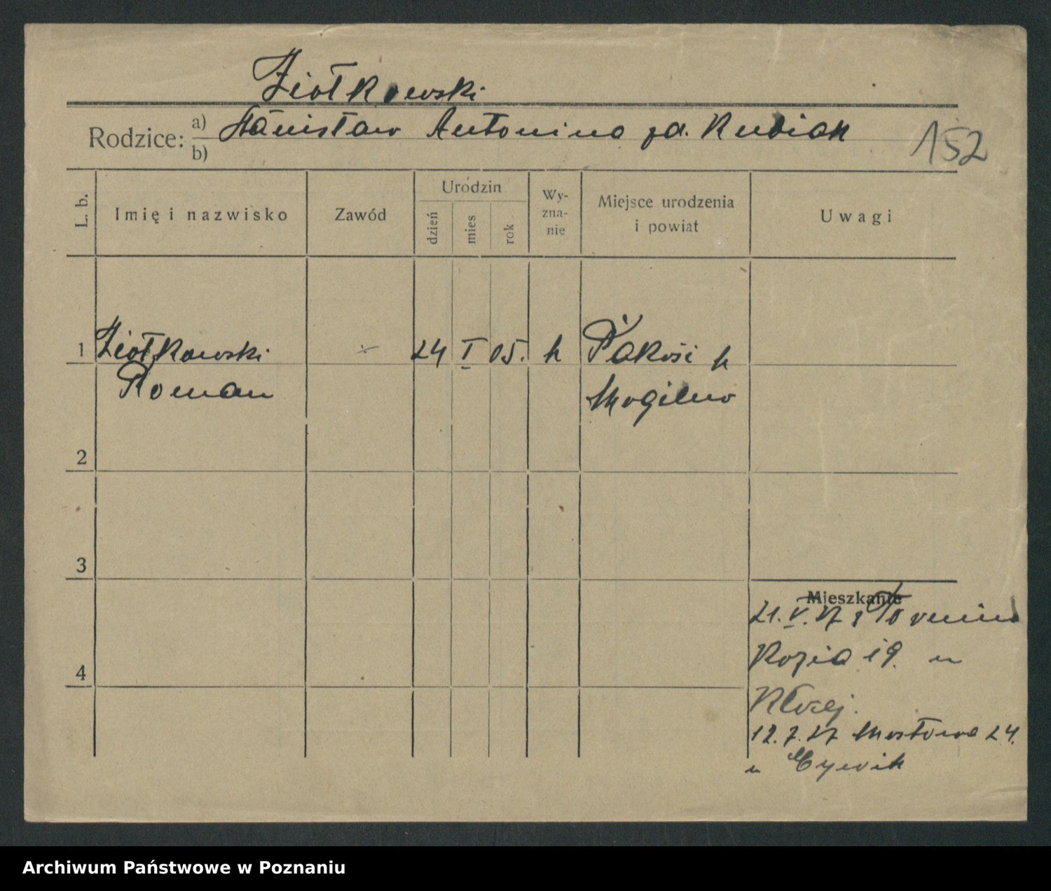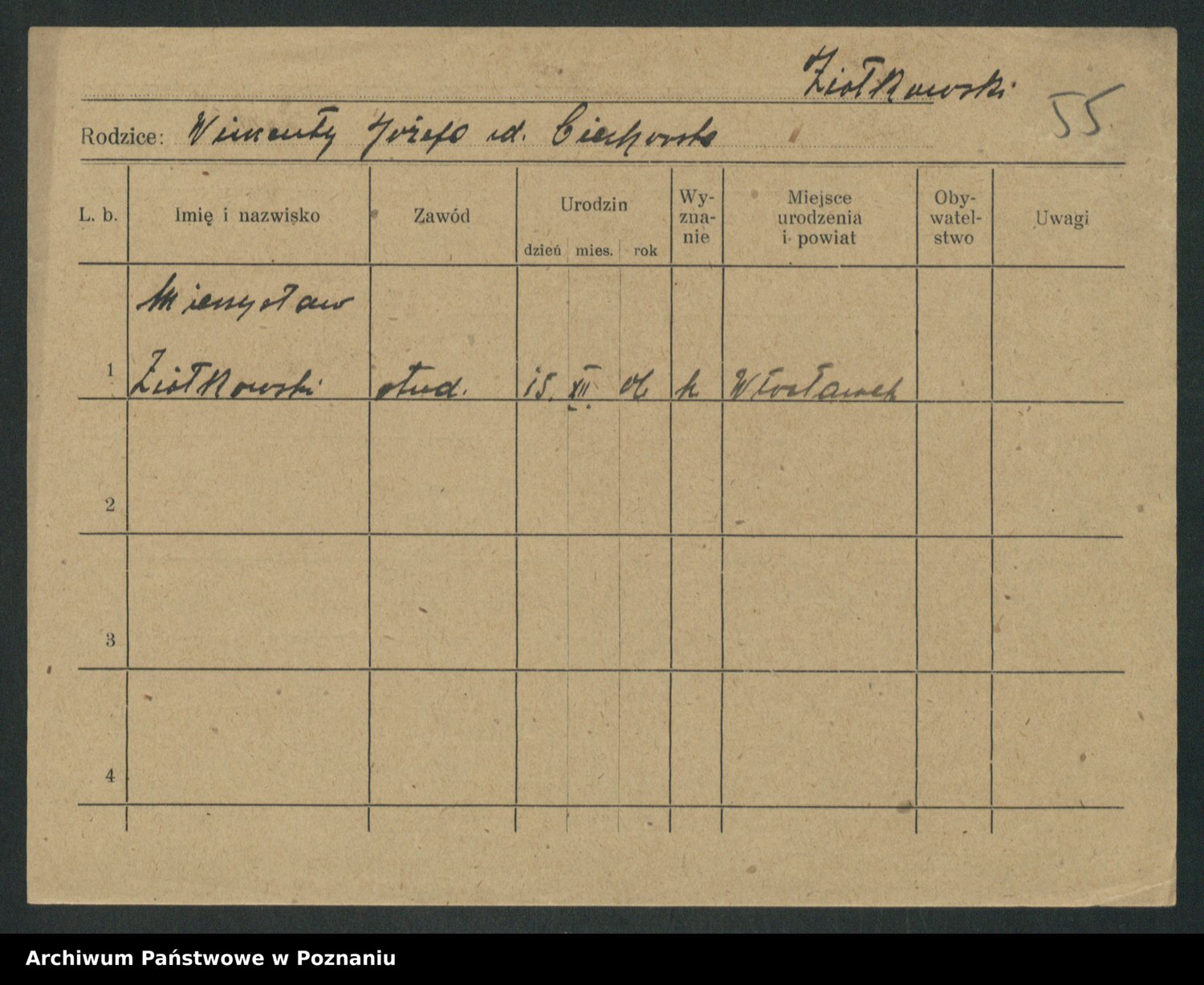 Podgląd karty osobowej dostępny jest po kliknięciu na nazwisko lub ikonkę karty. Można dokonywać powiększenia (ikony na górze) lub przechodzić między kolejnymi skanami (strzałki po bokach).
