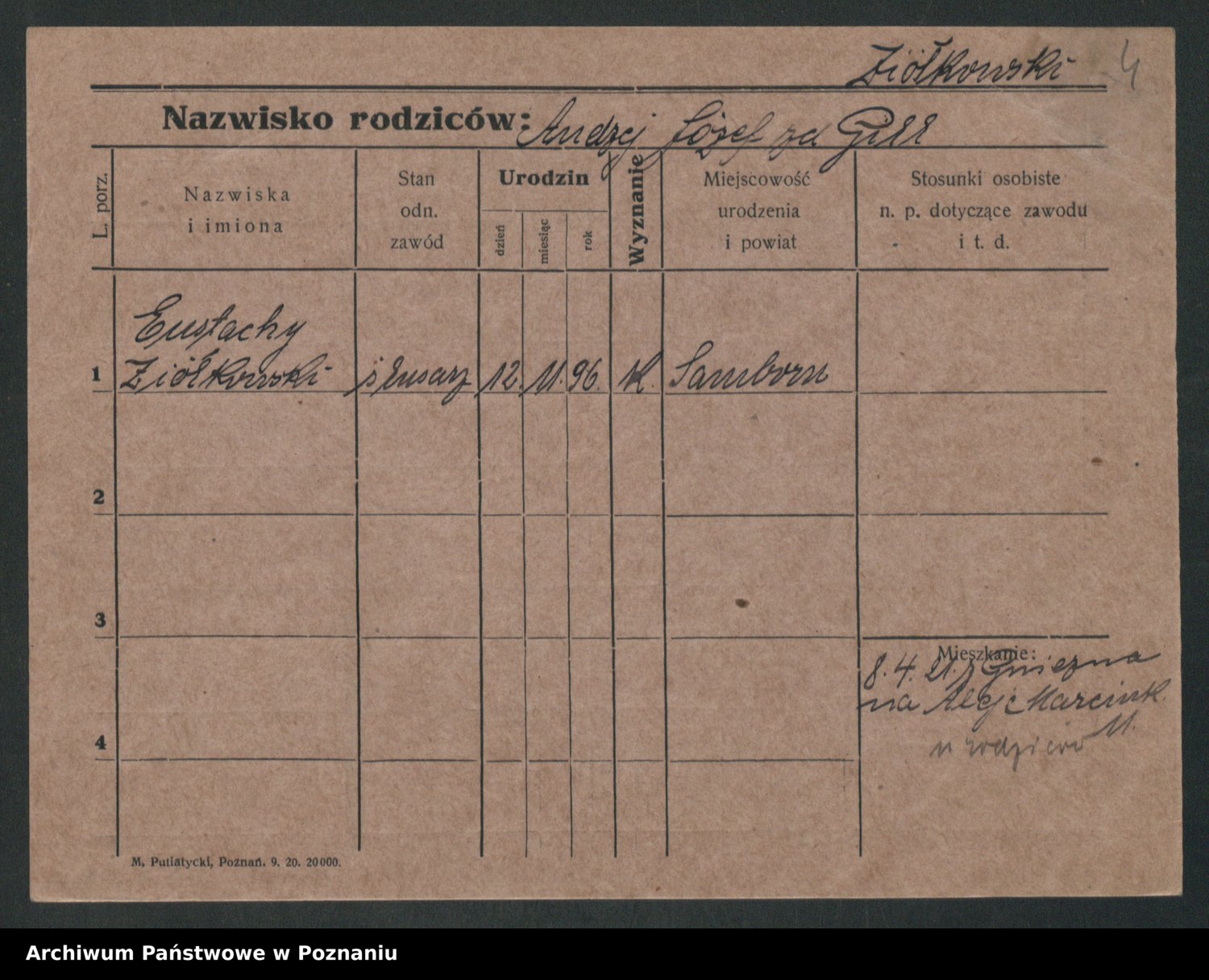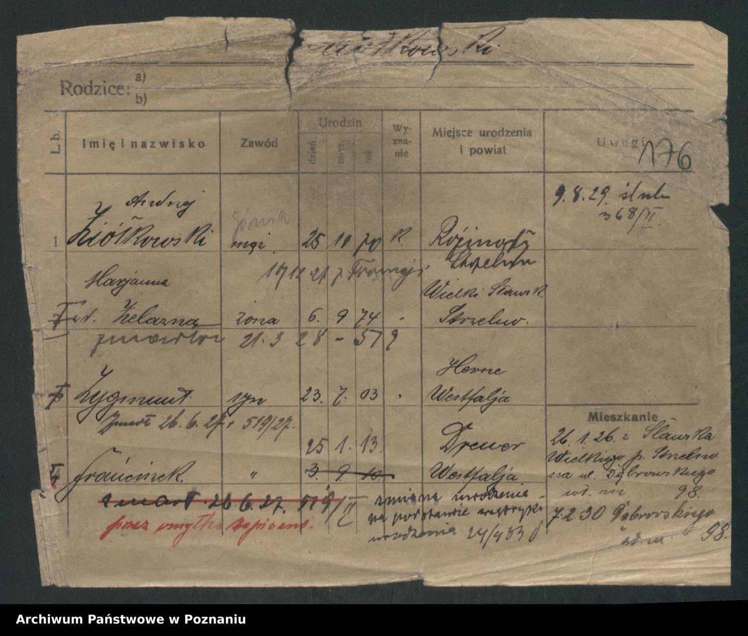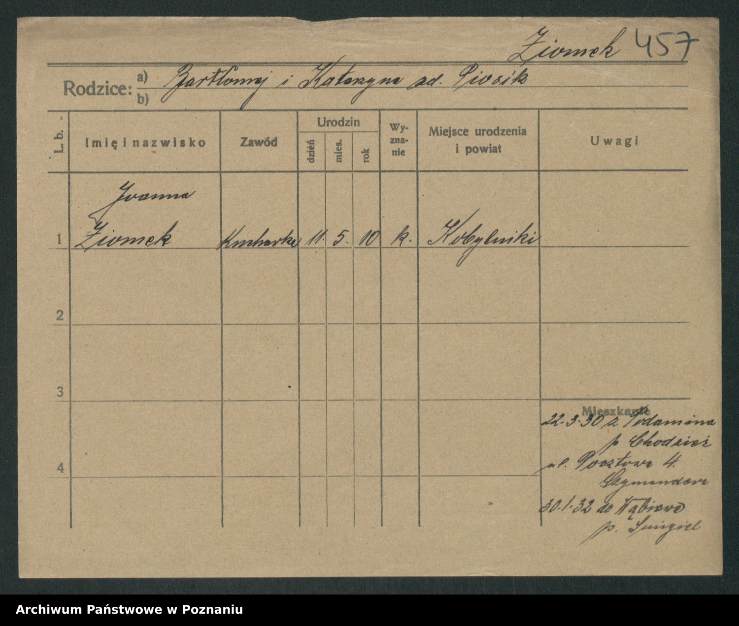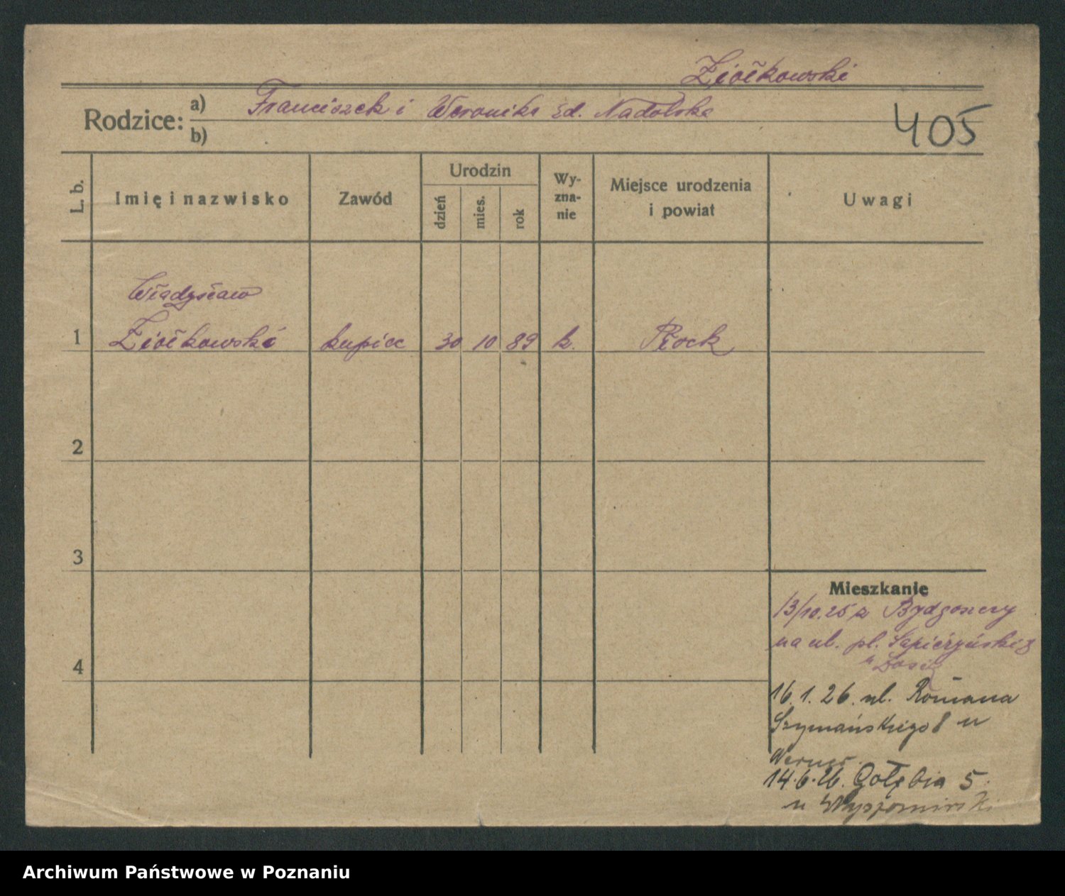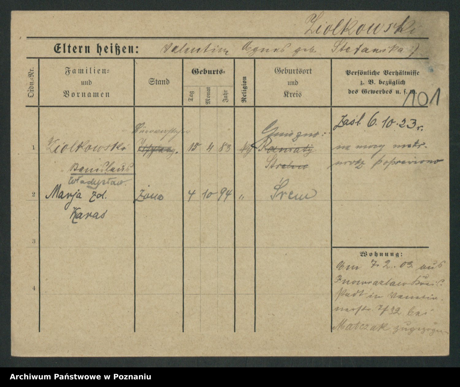 Podgląd karty osobowej dostępny jest po kliknięciu na nazwisko lub ikonkę karty. Można dokonywać powiększenia (ikony na górze) lub przechodzić między kolejnymi skanami (strzałki po bokach).