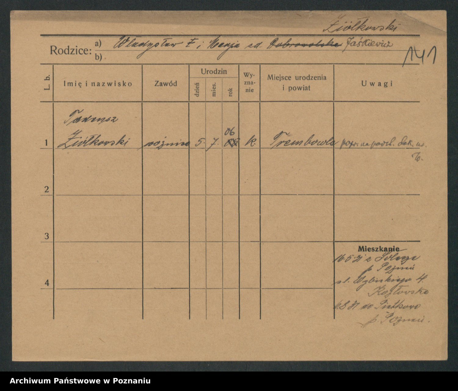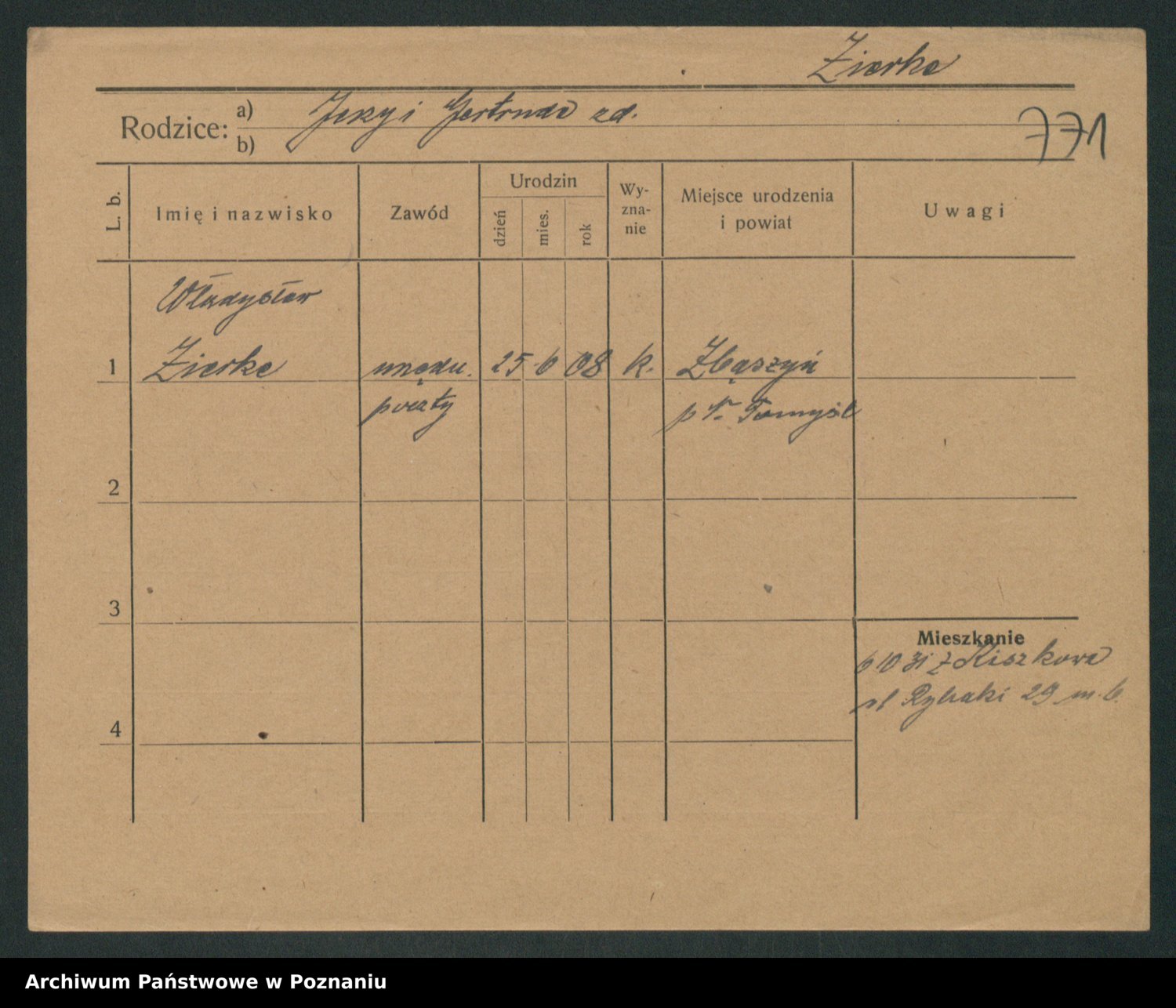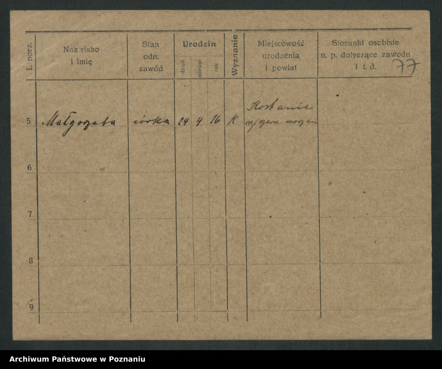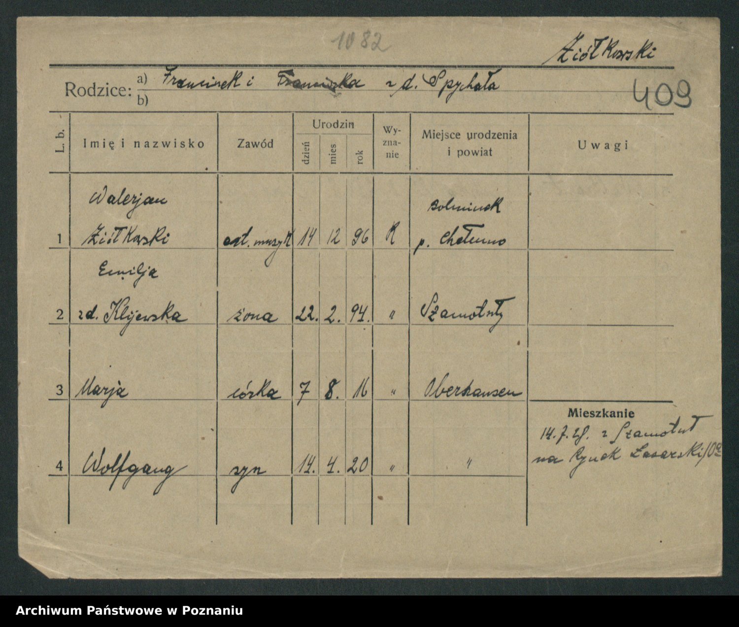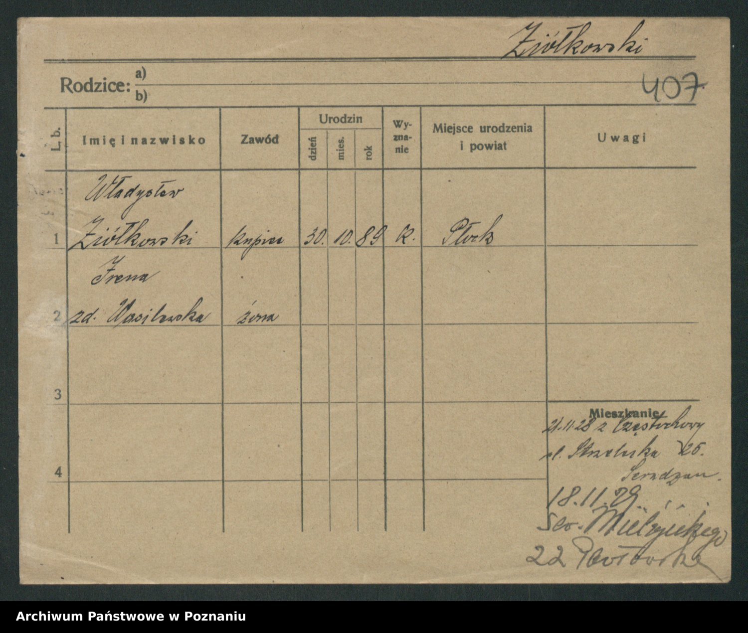 Podgląd karty osobowej dostępny jest po kliknięciu na nazwisko lub ikonkę karty. Można dokonywać powiększenia (ikony na górze) lub przechodzić między kolejnymi skanami (strzałki po bokach).