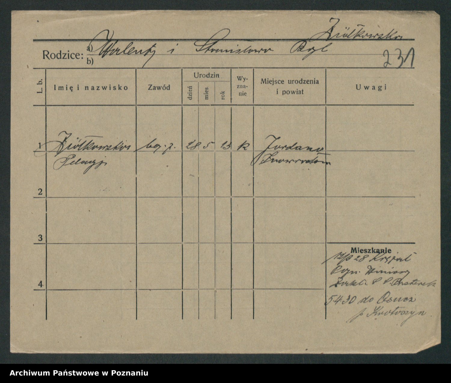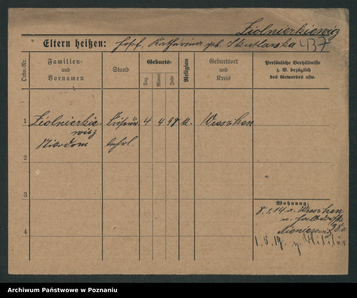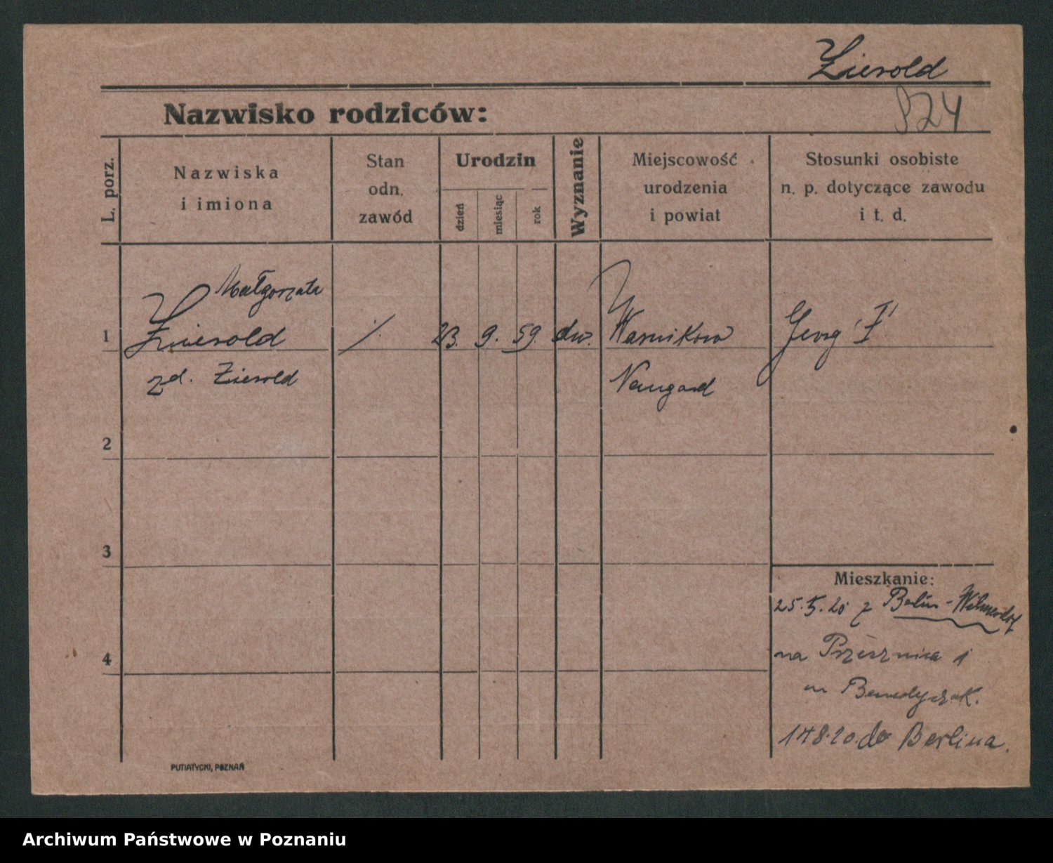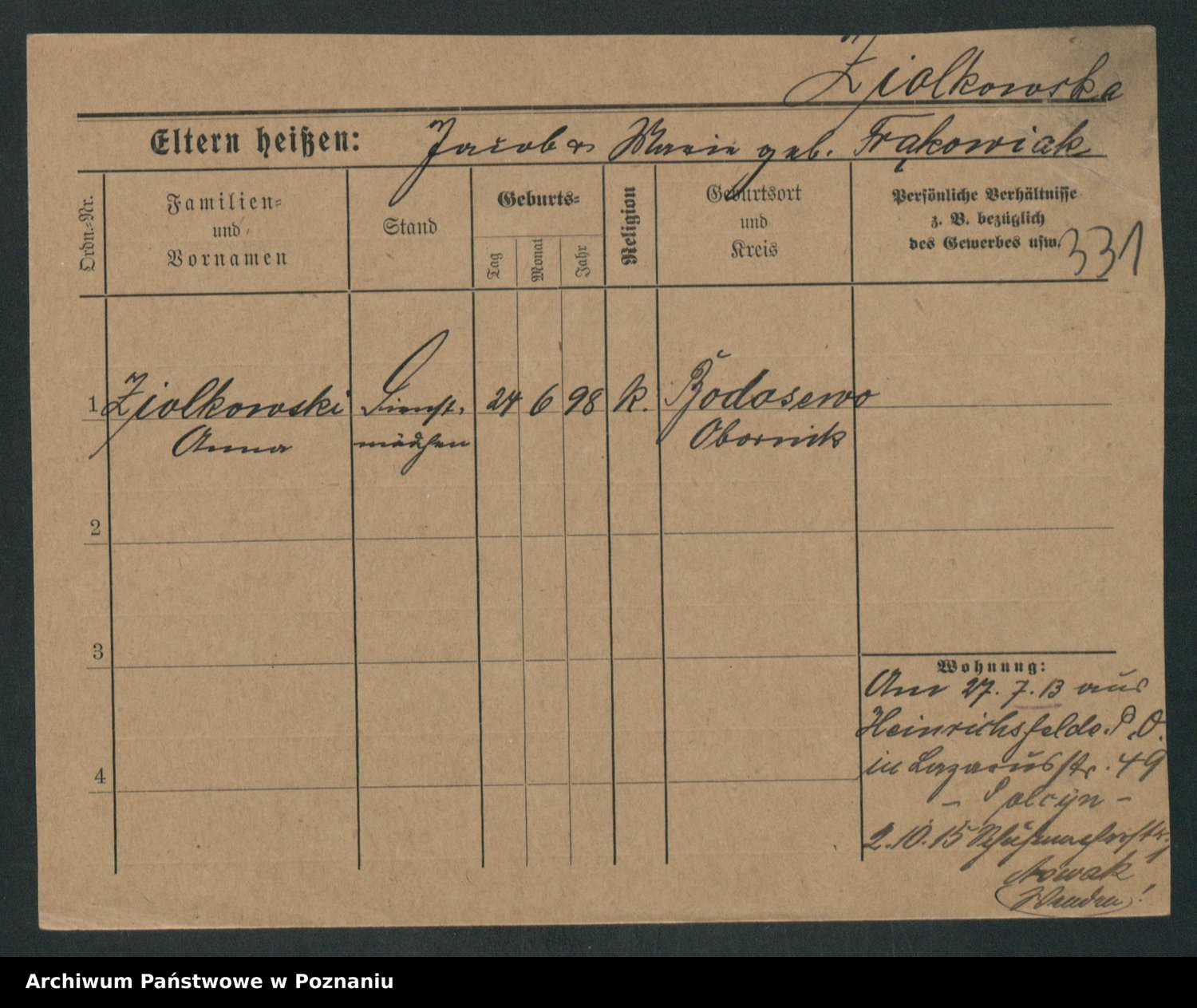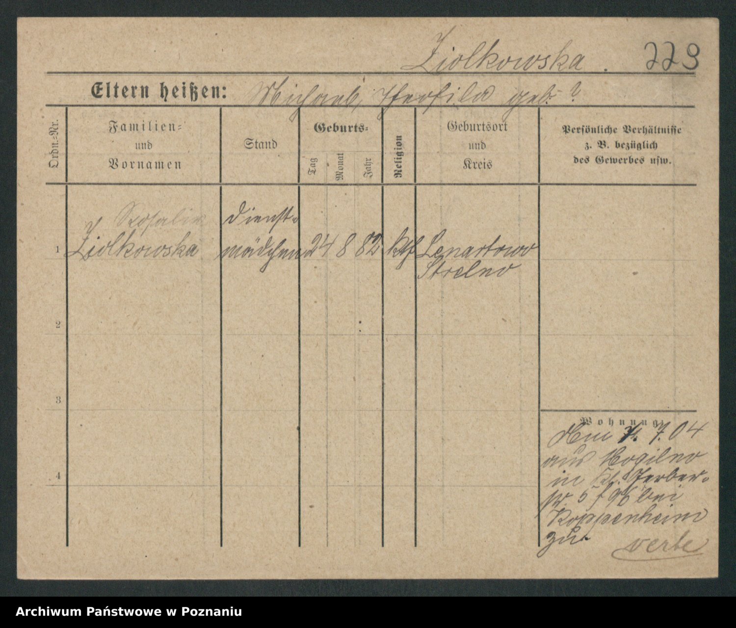 Podgląd karty osobowej dostępny jest po kliknięciu na nazwisko lub ikonkę karty. Można dokonywać powiększenia (ikony na górze) lub przechodzić między kolejnymi skanami (strzałki po bokach).