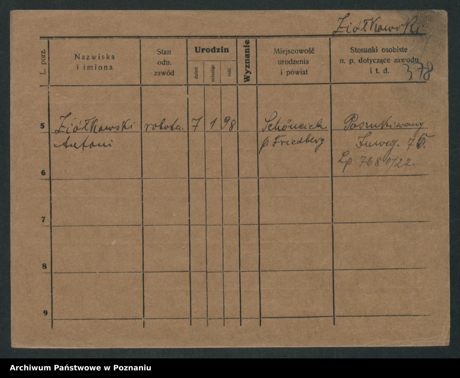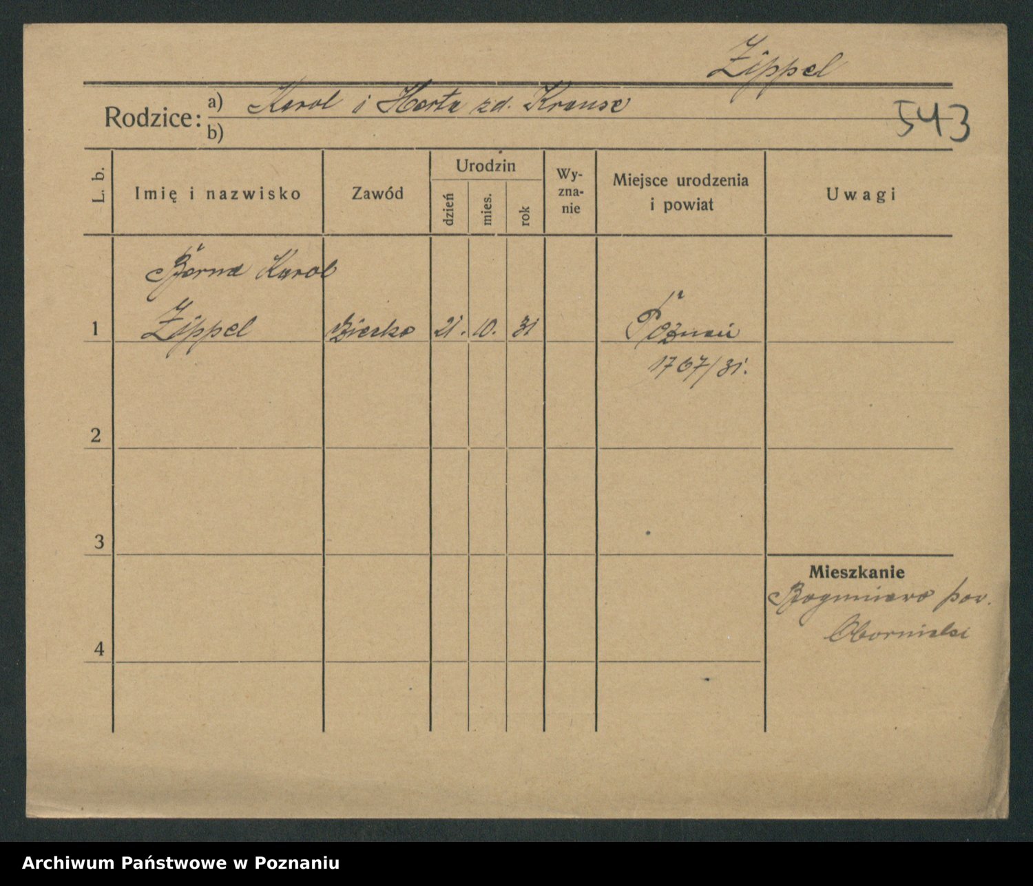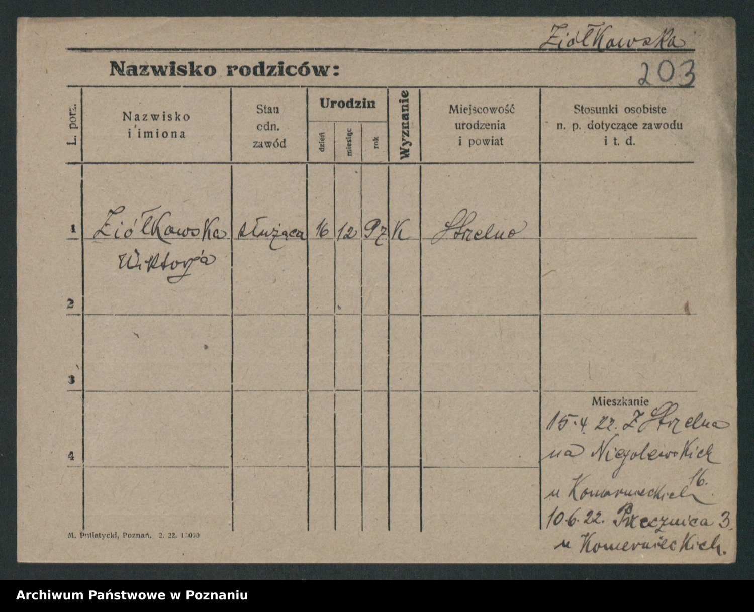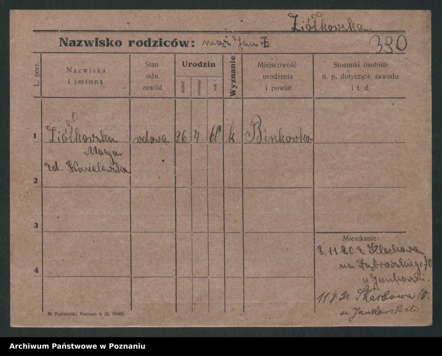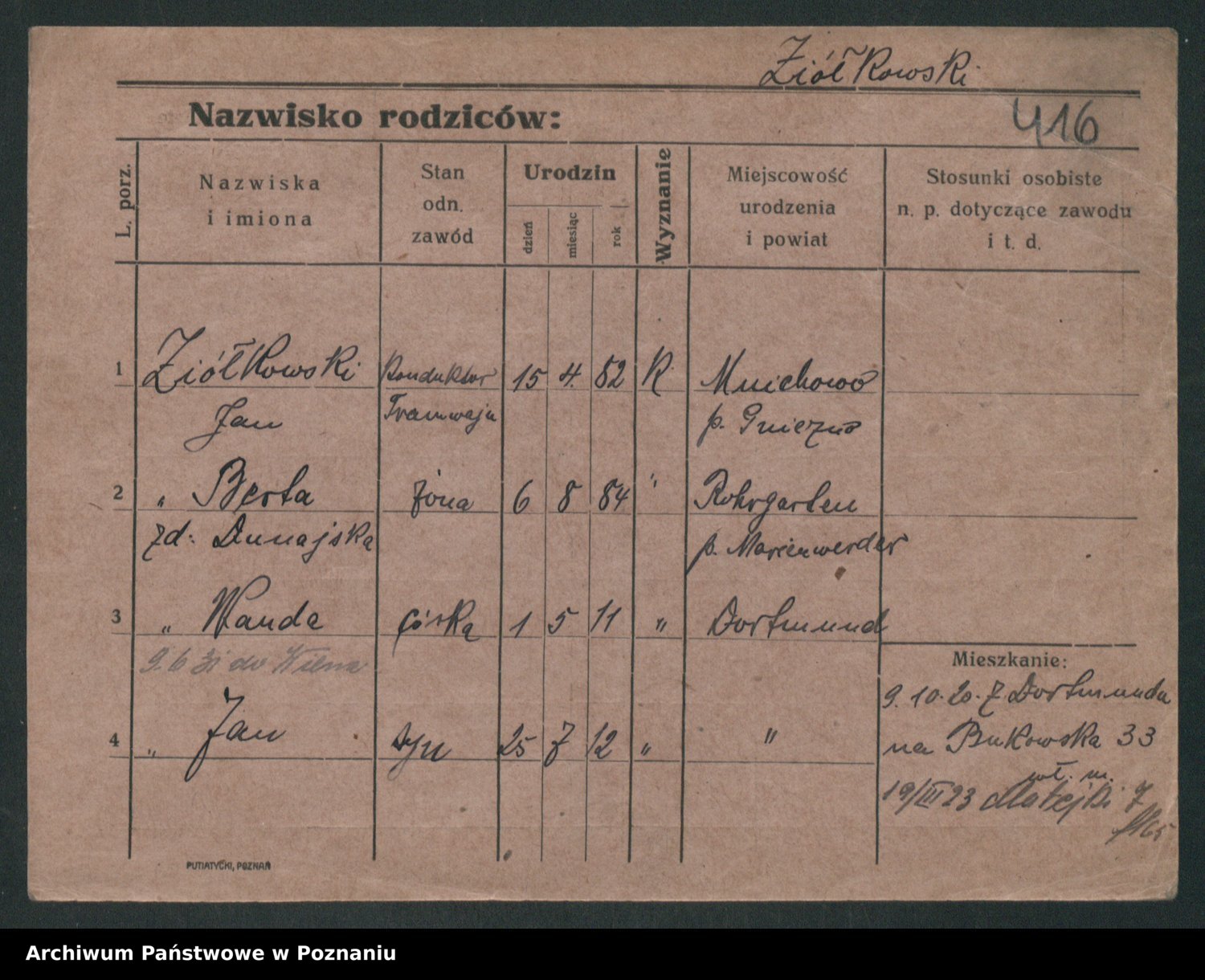 Podgląd karty osobowej dostępny jest po kliknięciu na nazwisko lub ikonkę karty. Można dokonywać powiększenia (ikony na górze) lub przechodzić między kolejnymi skanami (strzałki po bokach).