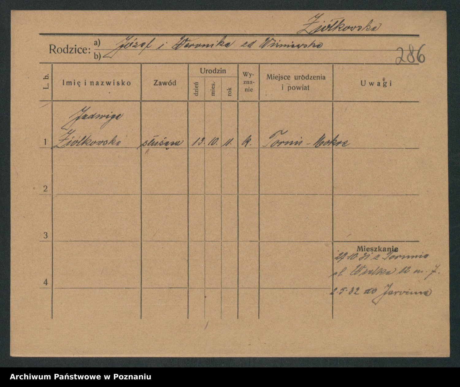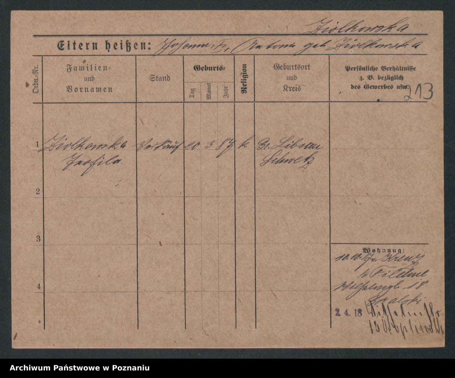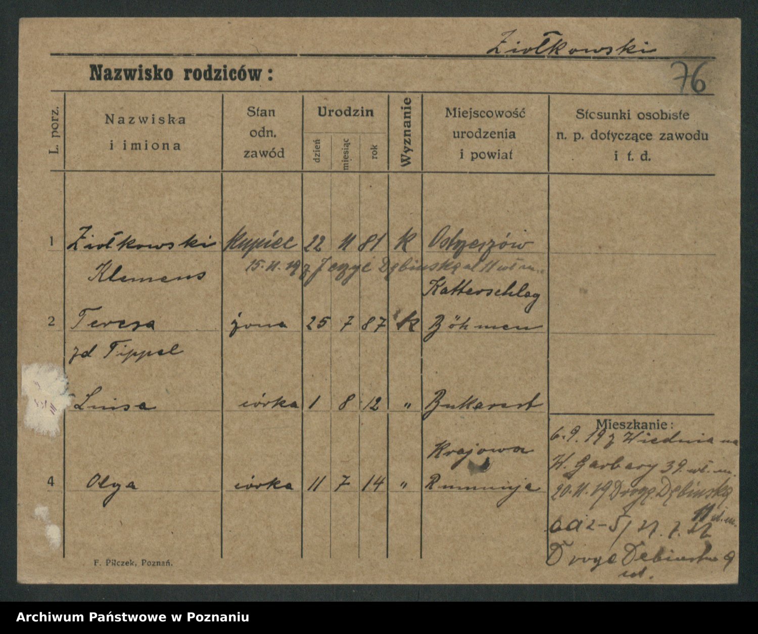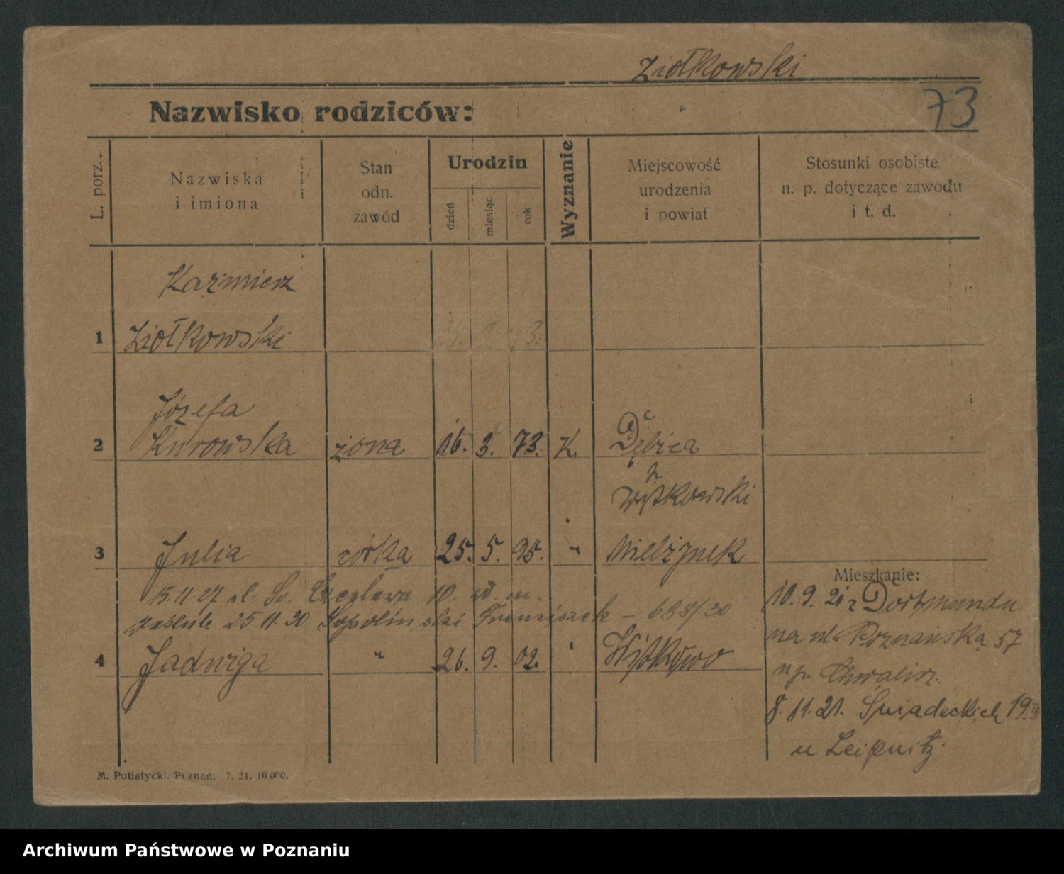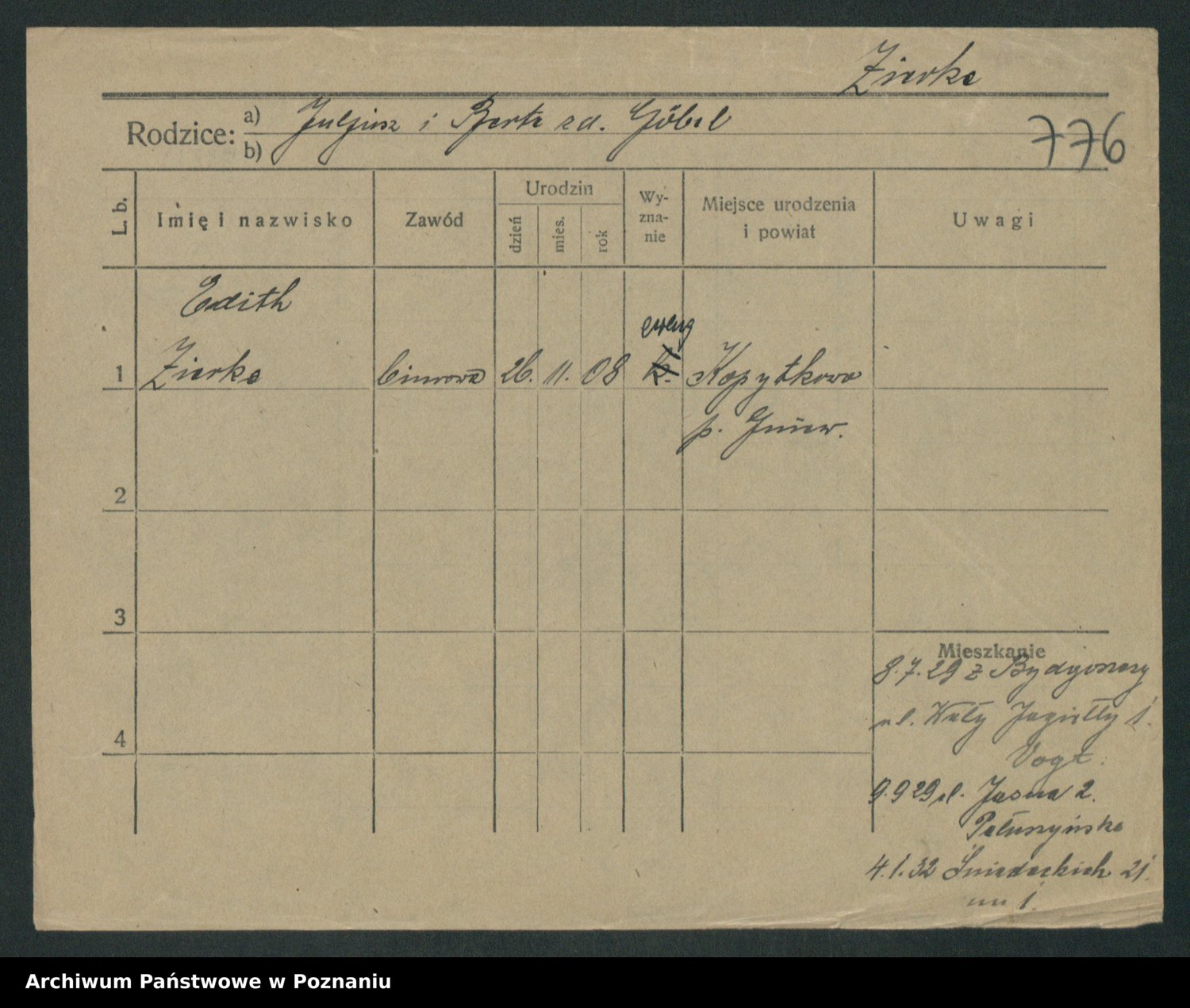 Podgląd karty osobowej dostępny jest po kliknięciu na nazwisko lub ikonkę karty. Można dokonywać powiększenia (ikony na górze) lub przechodzić między kolejnymi skanami (strzałki po bokach).