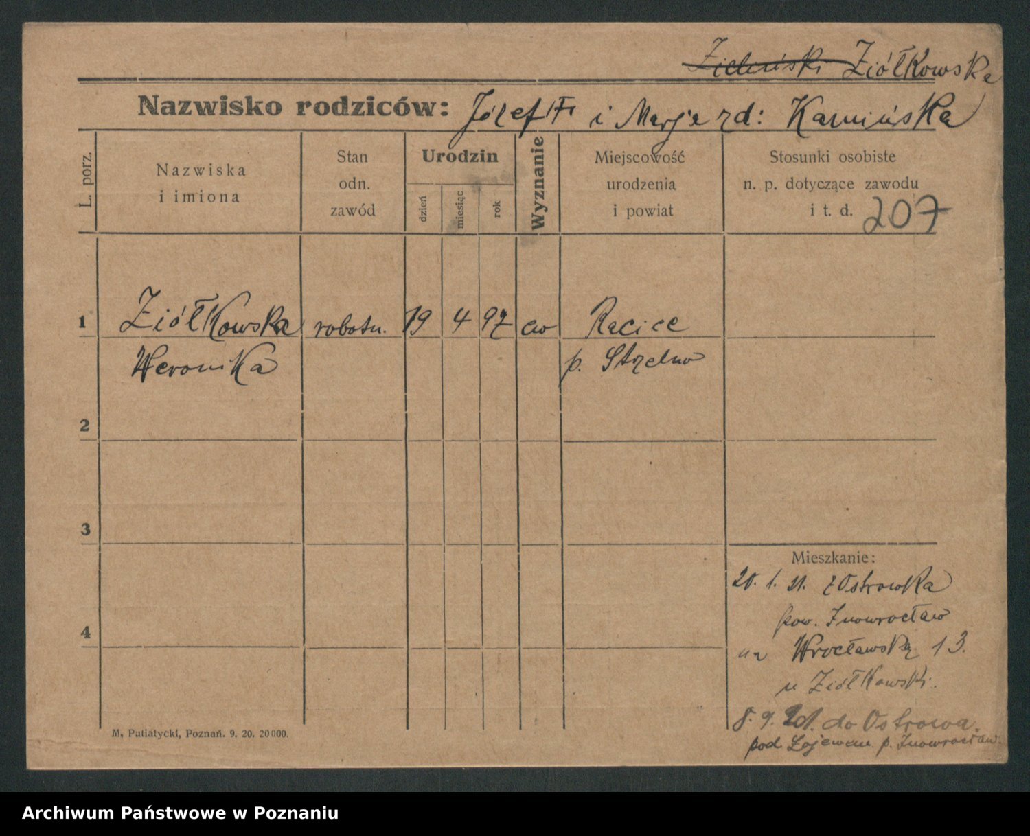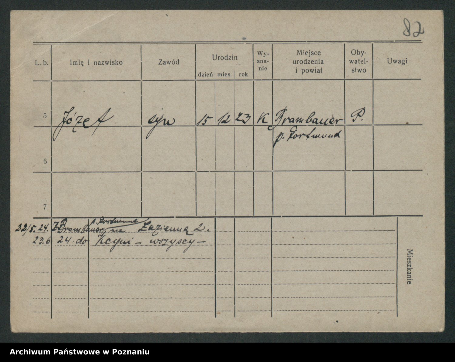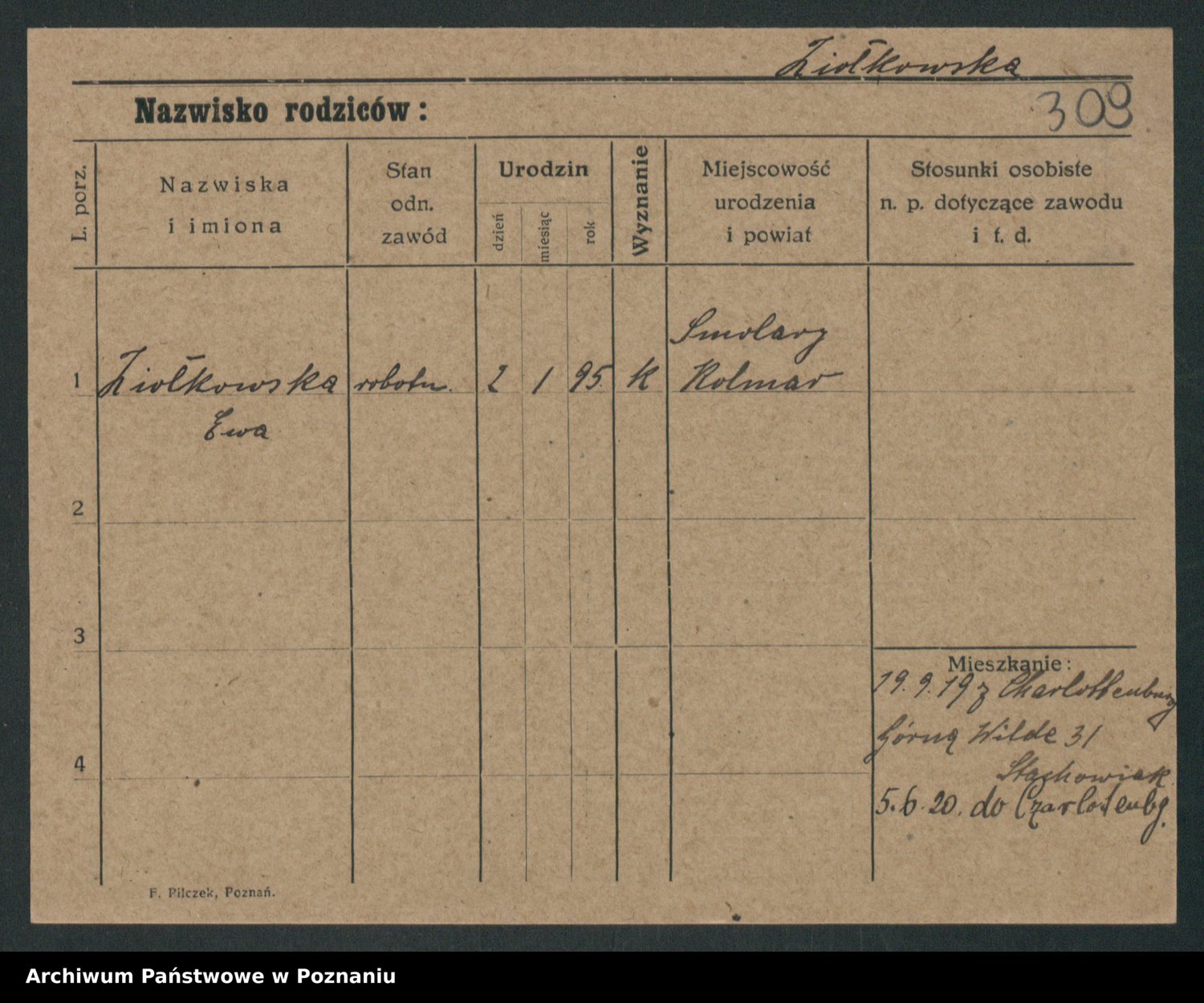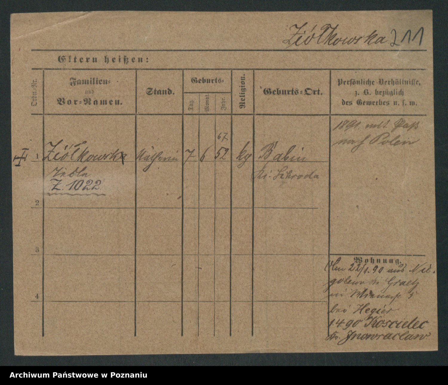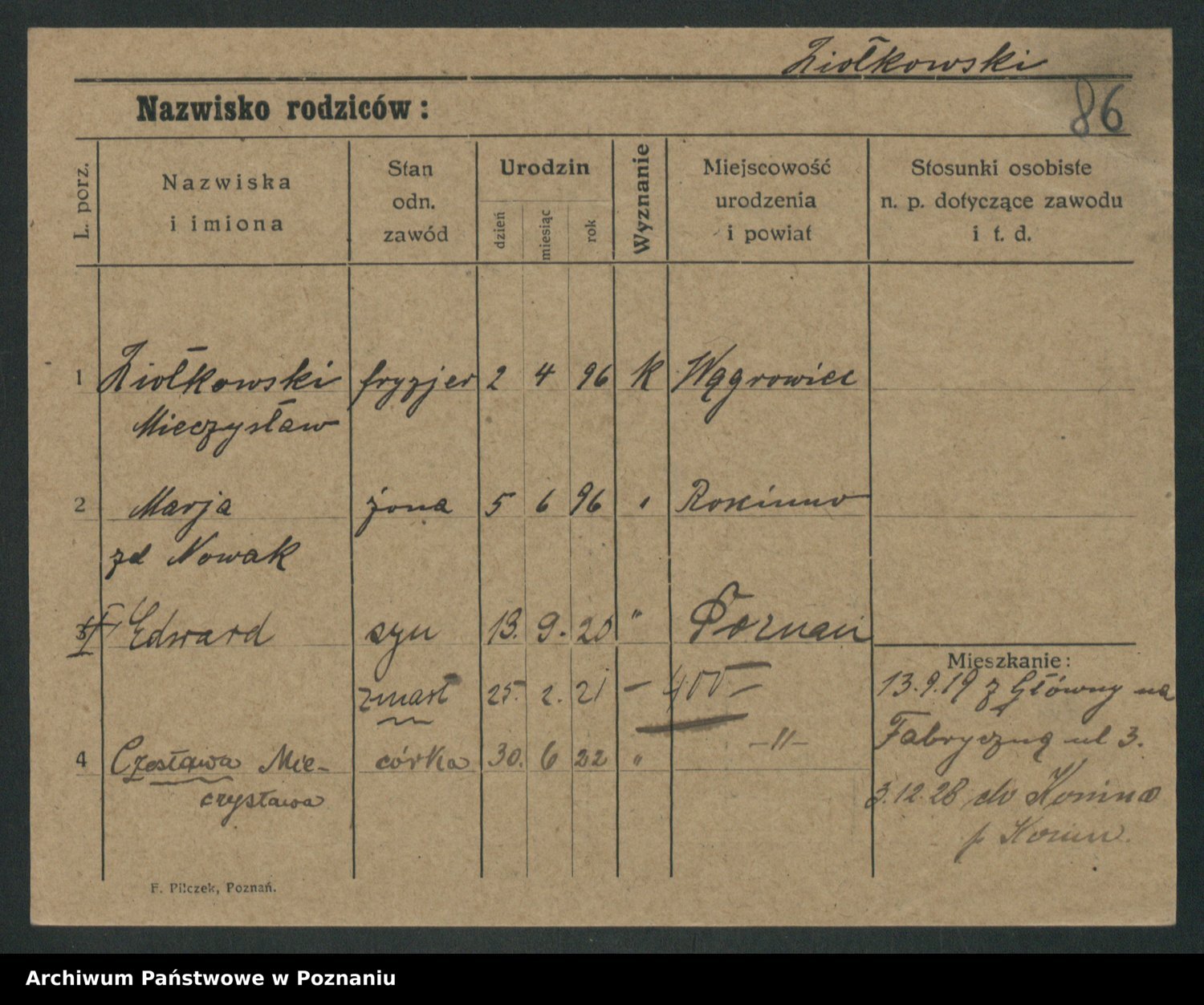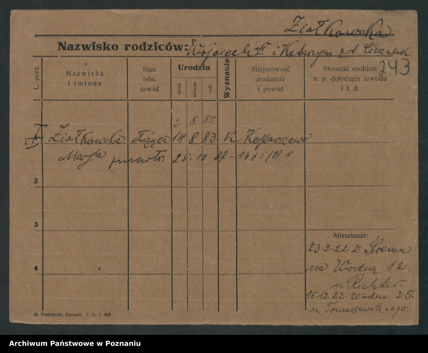 Podgląd karty osobowej dostępny jest po kliknięciu na nazwisko lub ikonkę karty. Można dokonywać powiększenia (ikony na górze) lub przechodzić między kolejnymi skanami (strzałki po bokach).