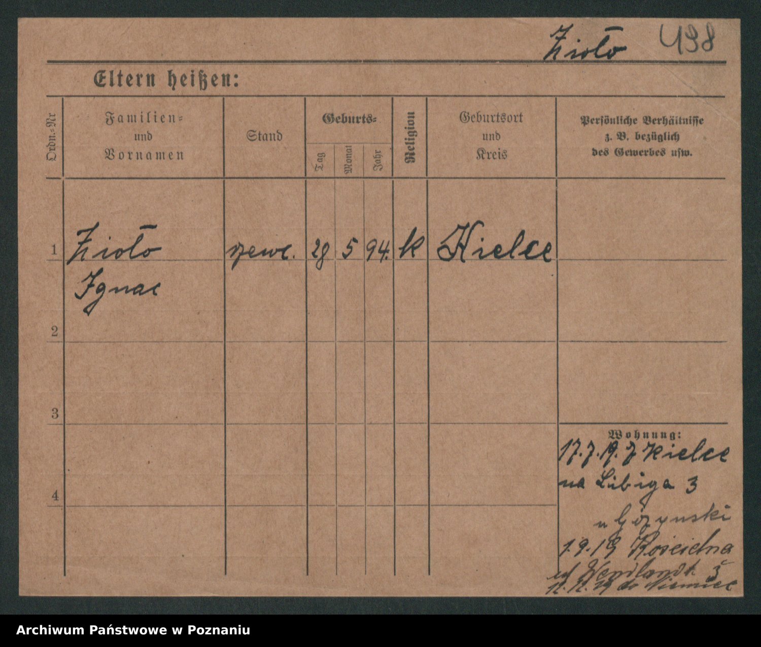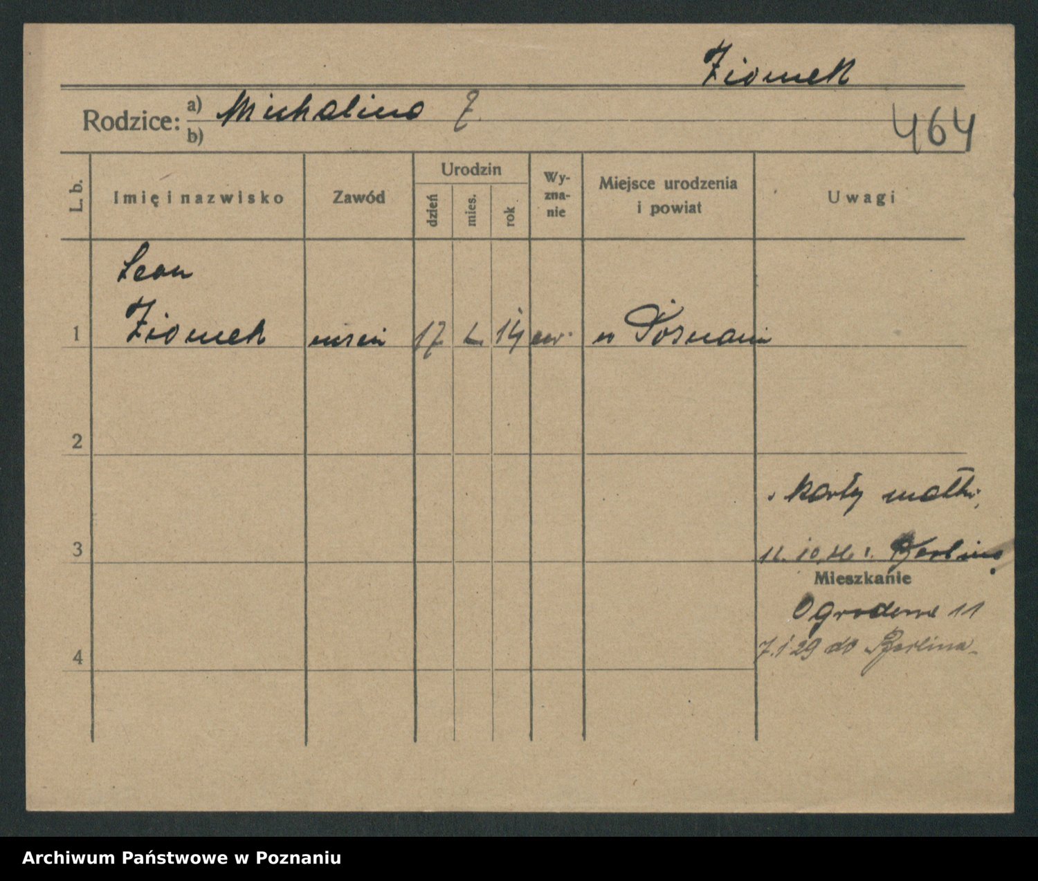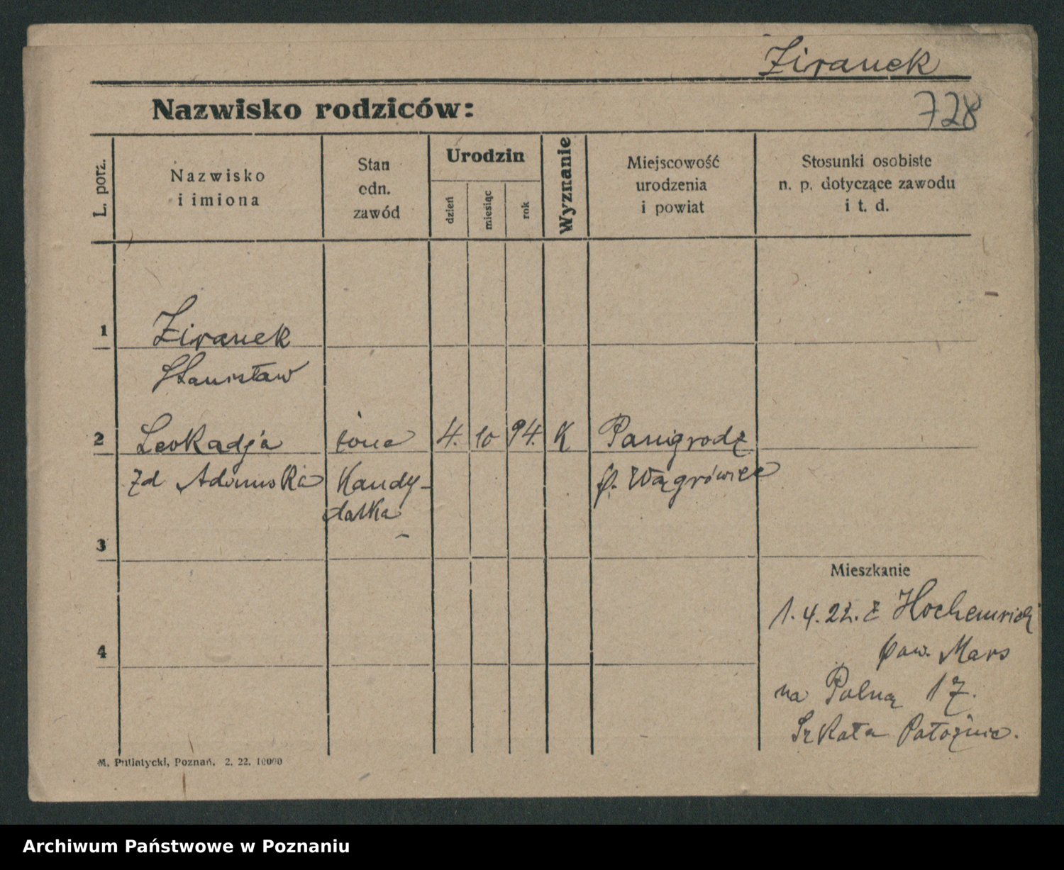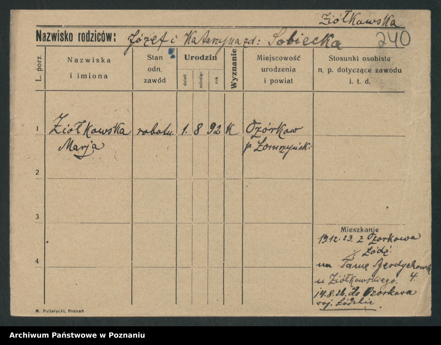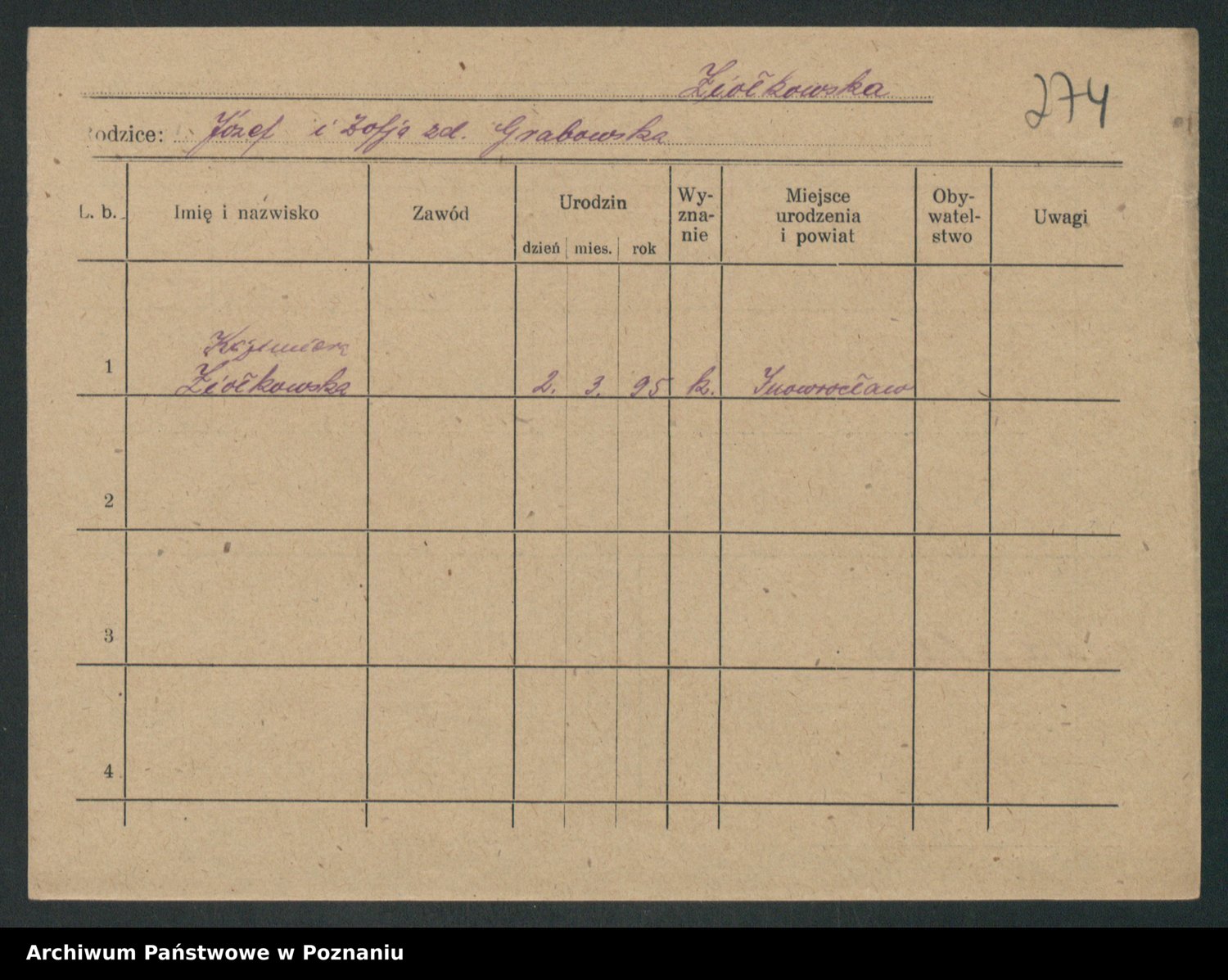 Podgląd karty osobowej dostępny jest po kliknięciu na nazwisko lub ikonkę karty. Można dokonywać powiększenia (ikony na górze) lub przechodzić między kolejnymi skanami (strzałki po bokach).