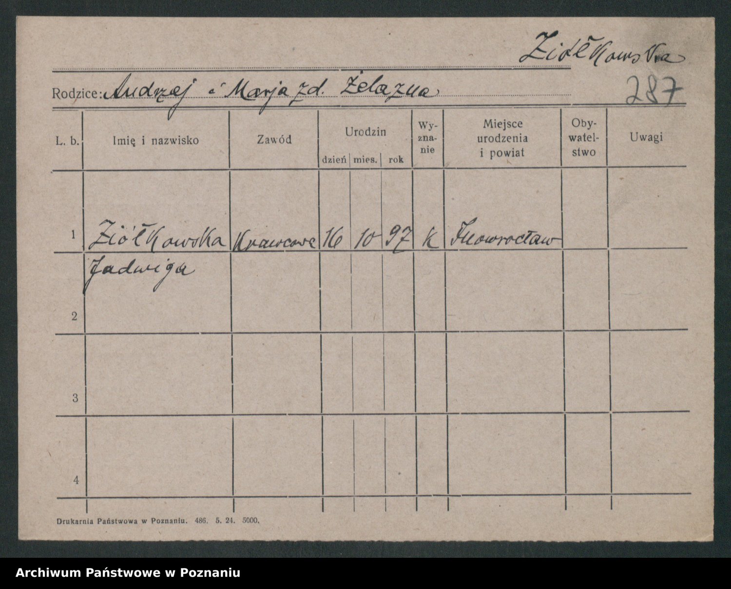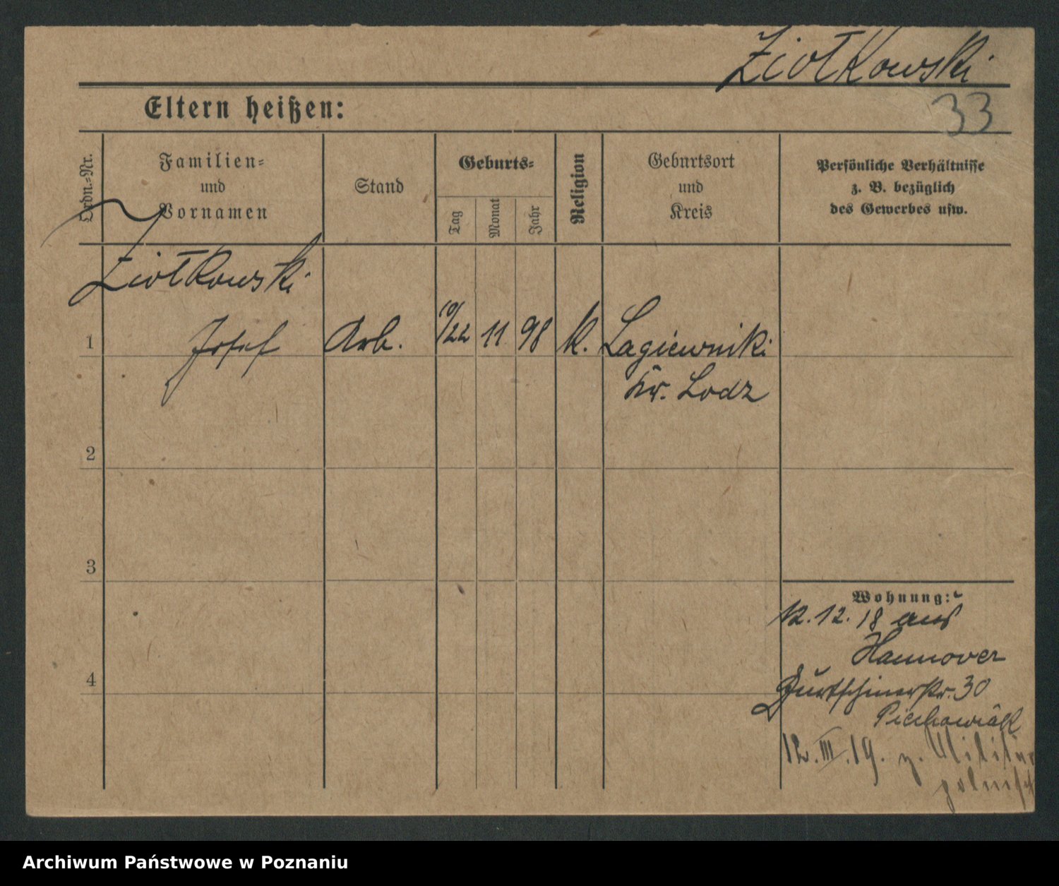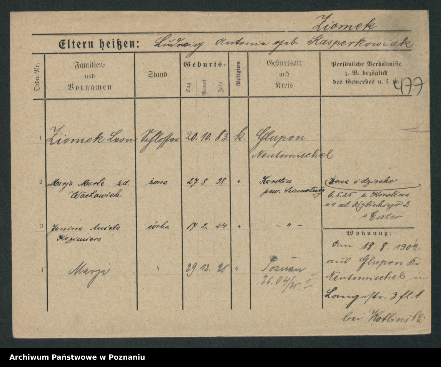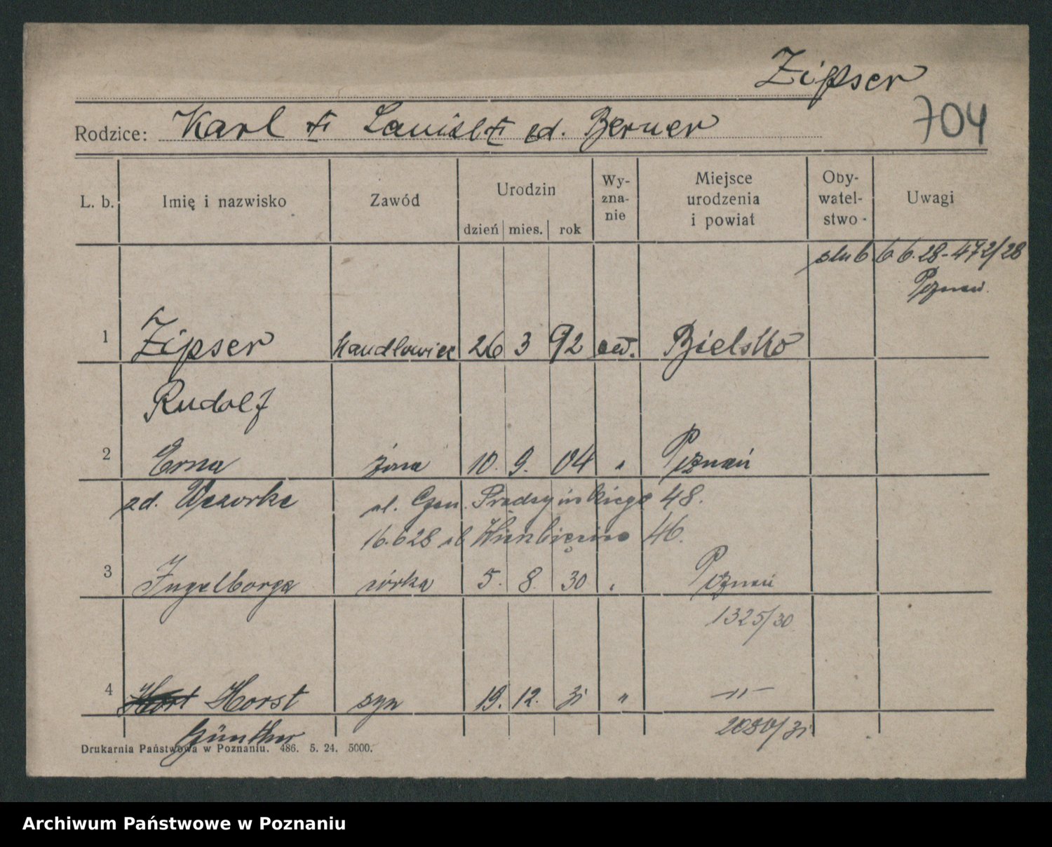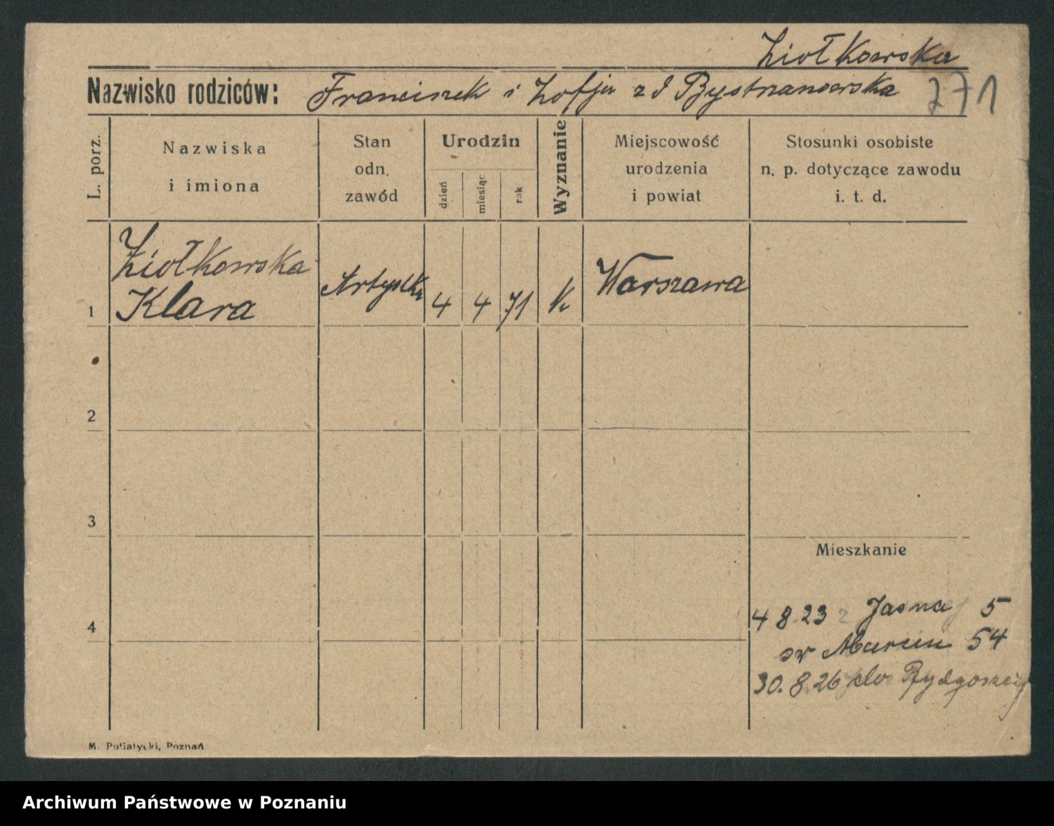 Podgląd karty osobowej dostępny jest po kliknięciu na nazwisko lub ikonkę karty. Można dokonywać powiększenia (ikony na górze) lub przechodzić między kolejnymi skanami (strzałki po bokach).