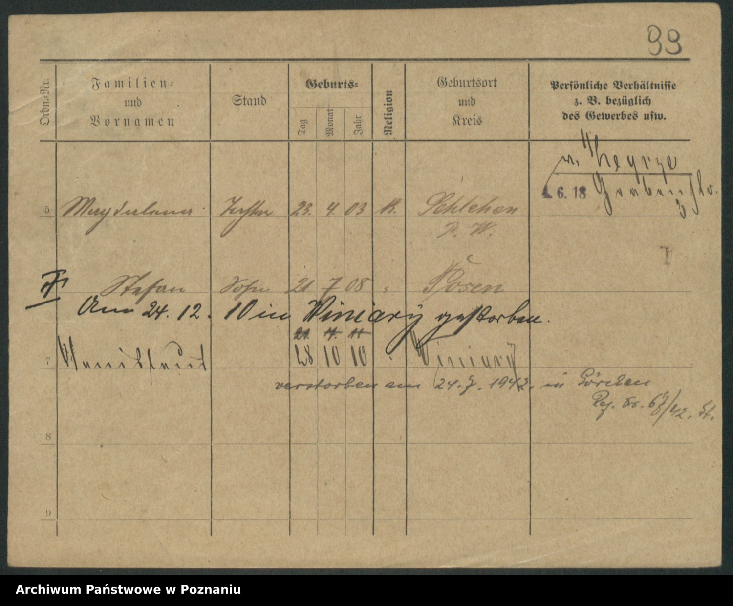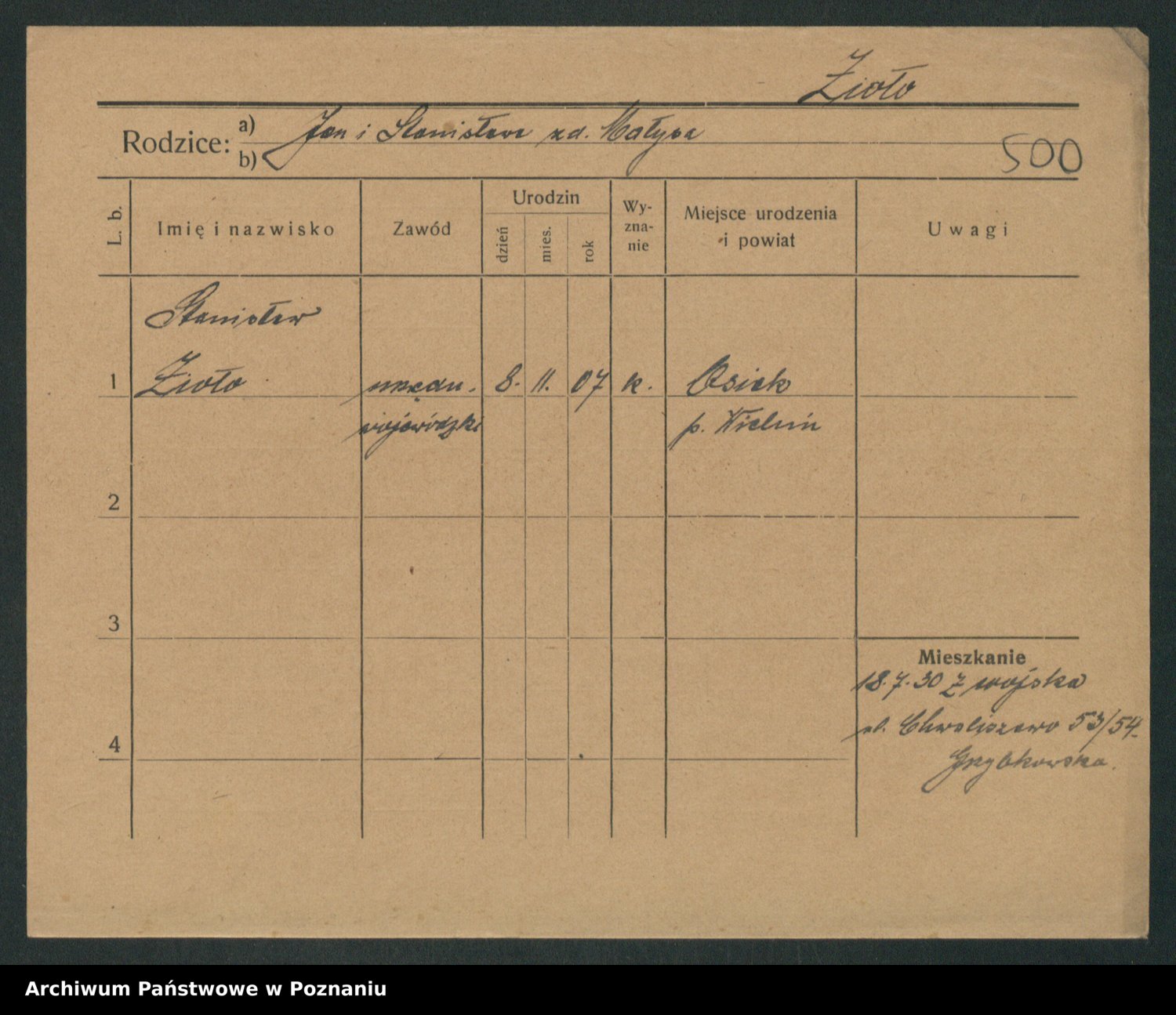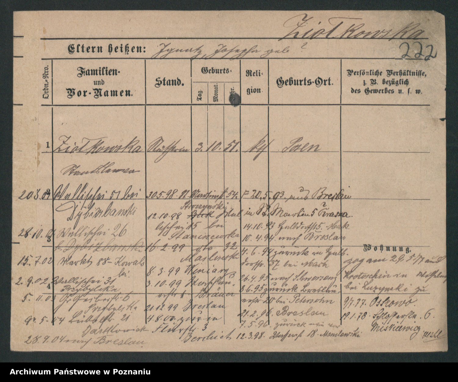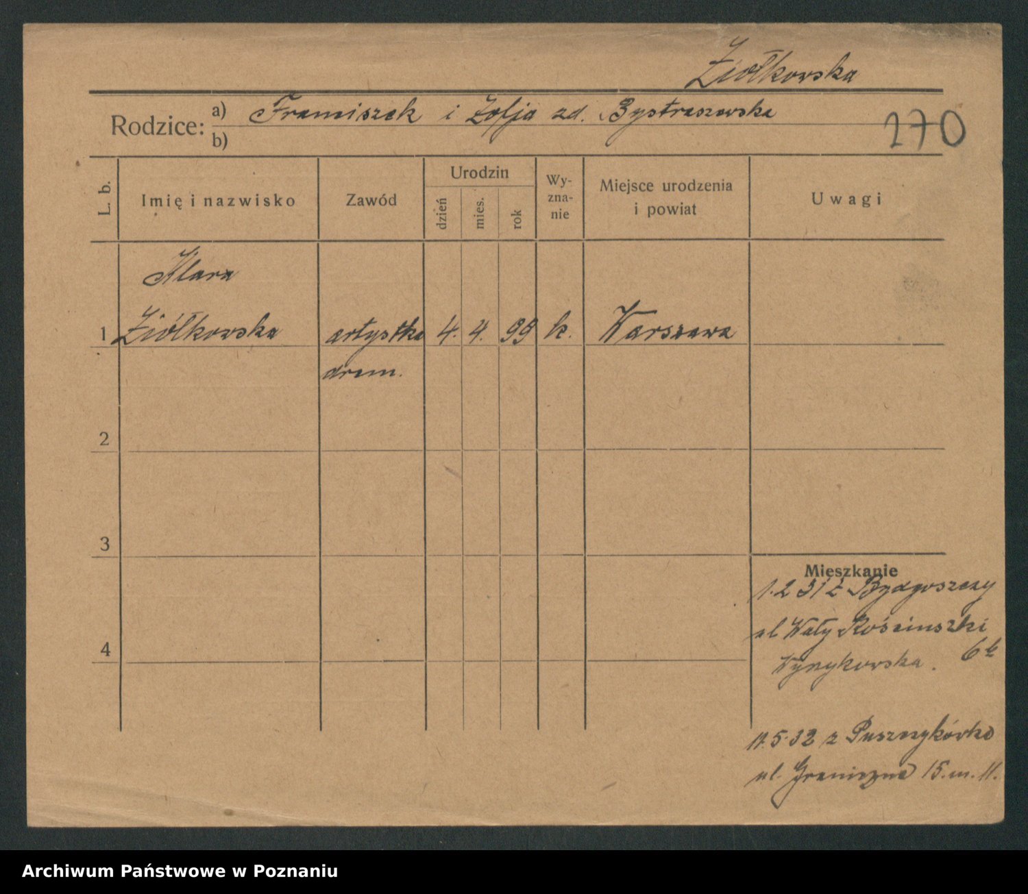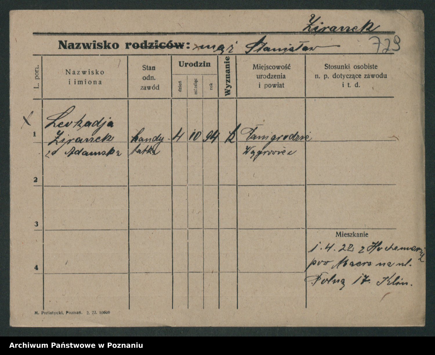 Podgląd karty osobowej dostępny jest po kliknięciu na nazwisko lub ikonkę karty. Można dokonywać powiększenia (ikony na górze) lub przechodzić między kolejnymi skanami (strzałki po bokach).