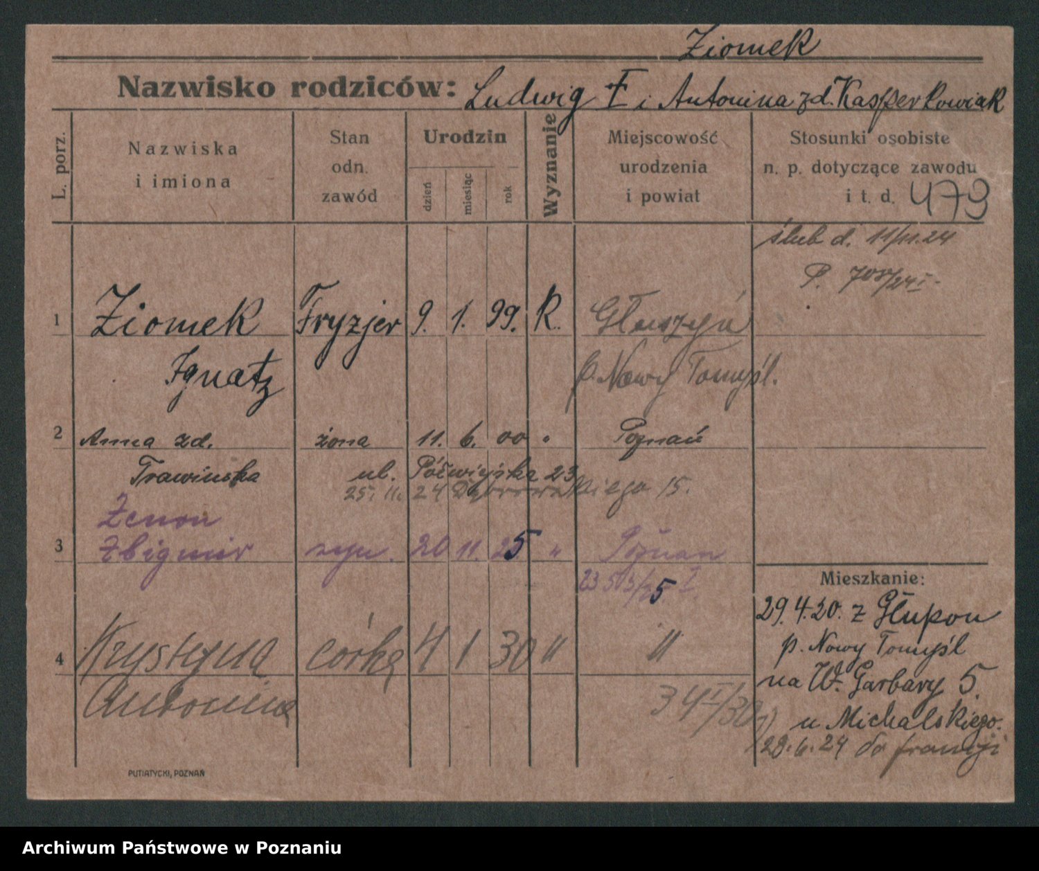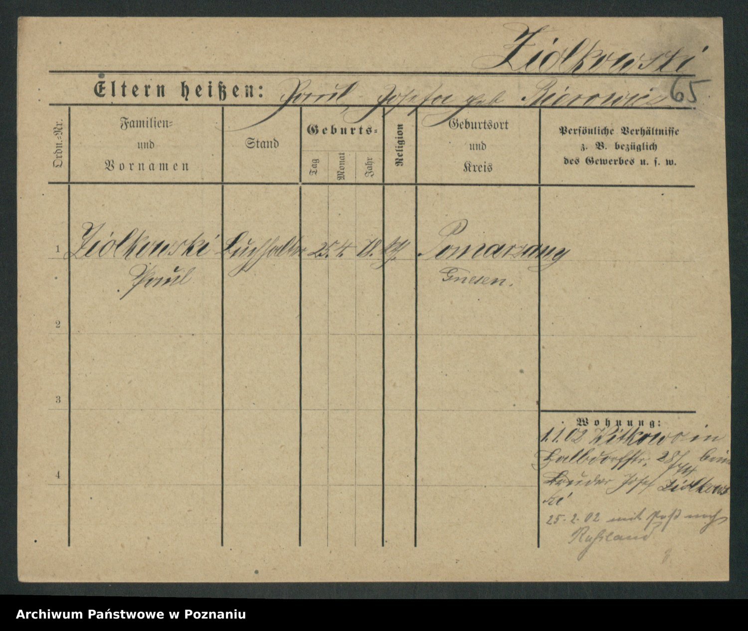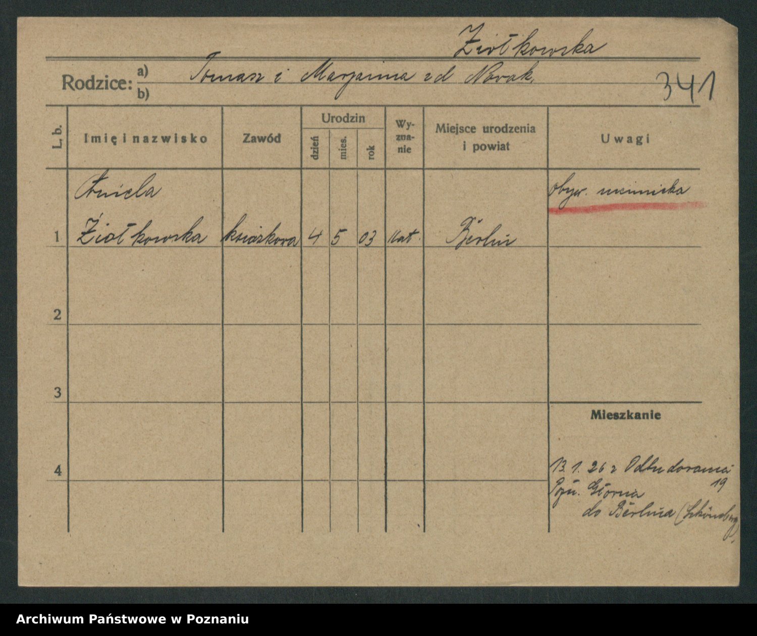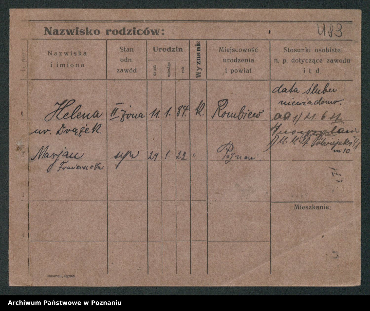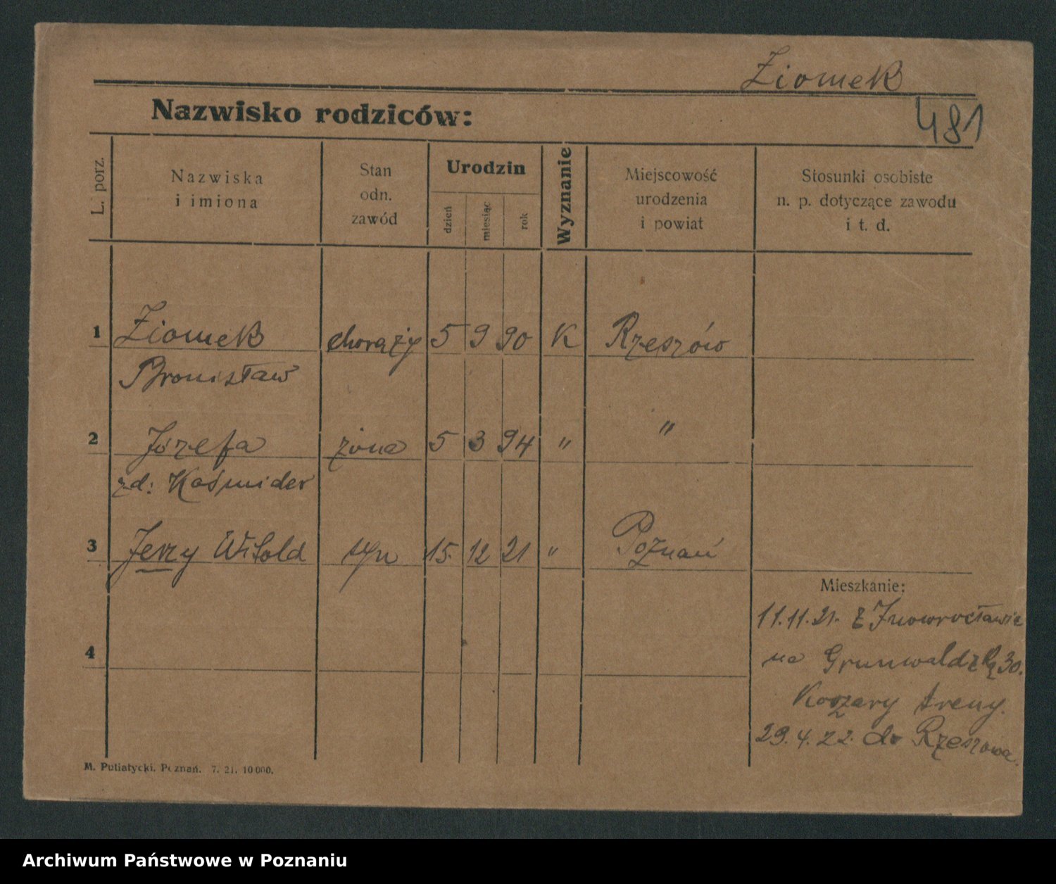 Podgląd karty osobowej dostępny jest po kliknięciu na nazwisko lub ikonkę karty. Można dokonywać powiększenia (ikony na górze) lub przechodzić między kolejnymi skanami (strzałki po bokach).