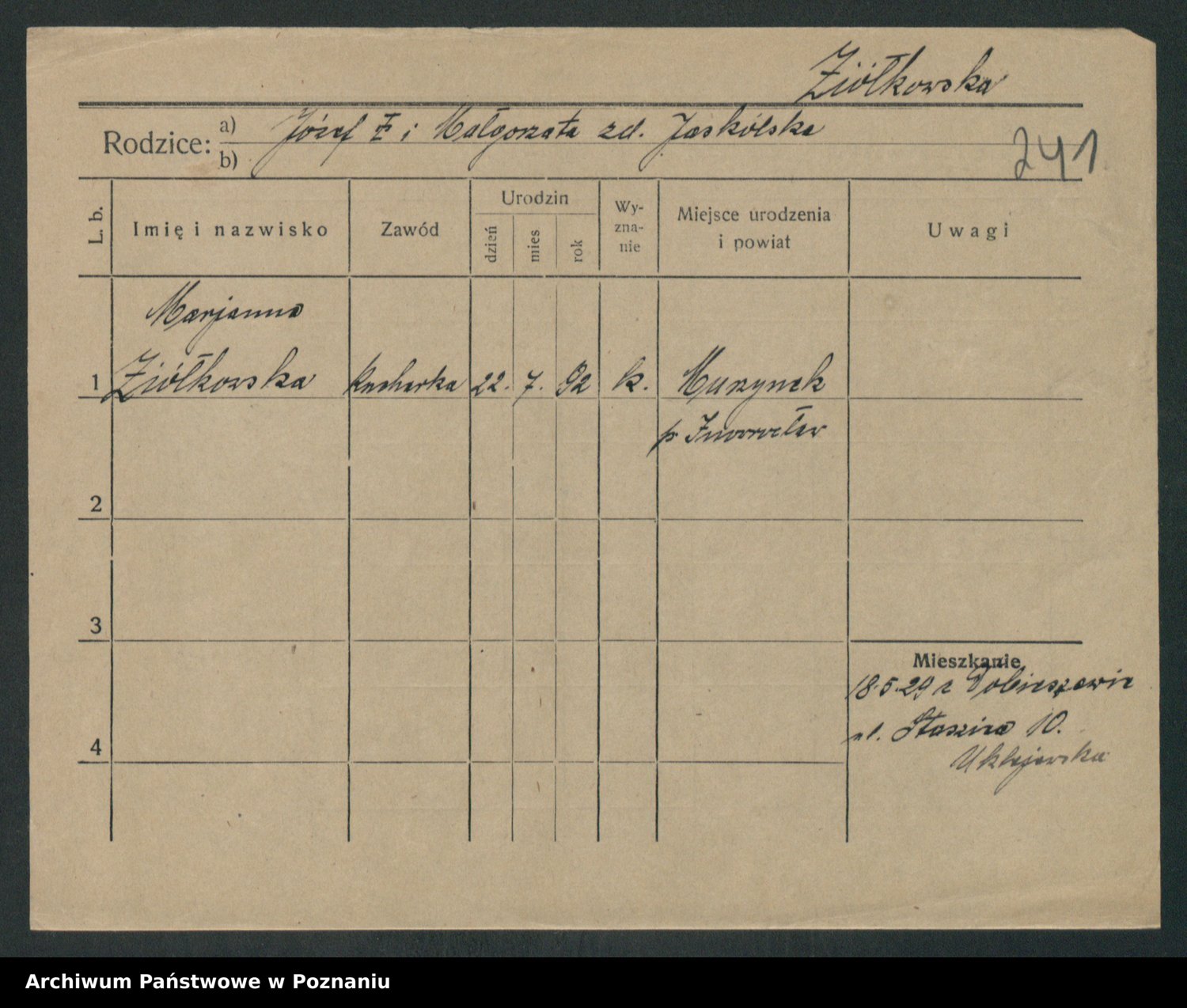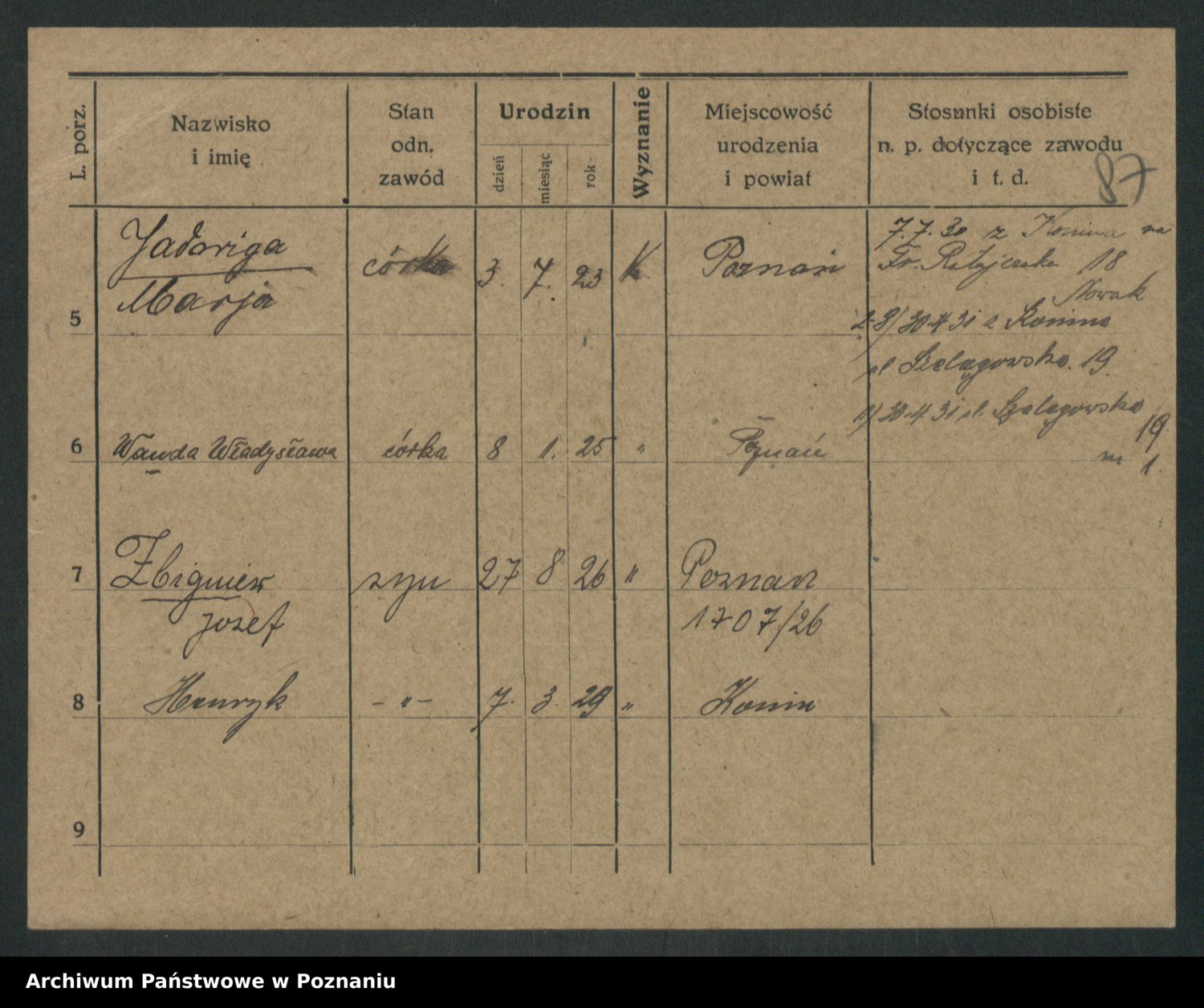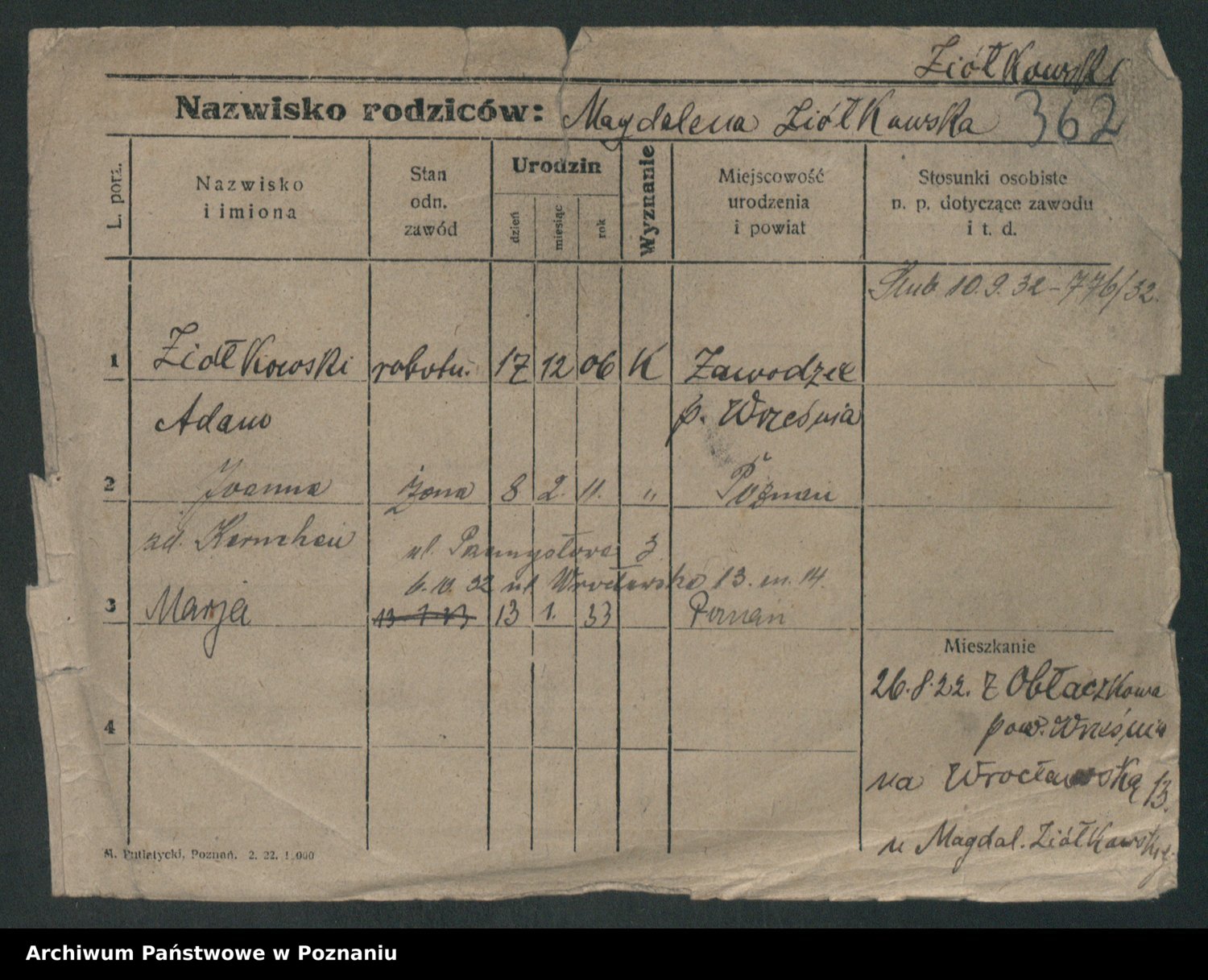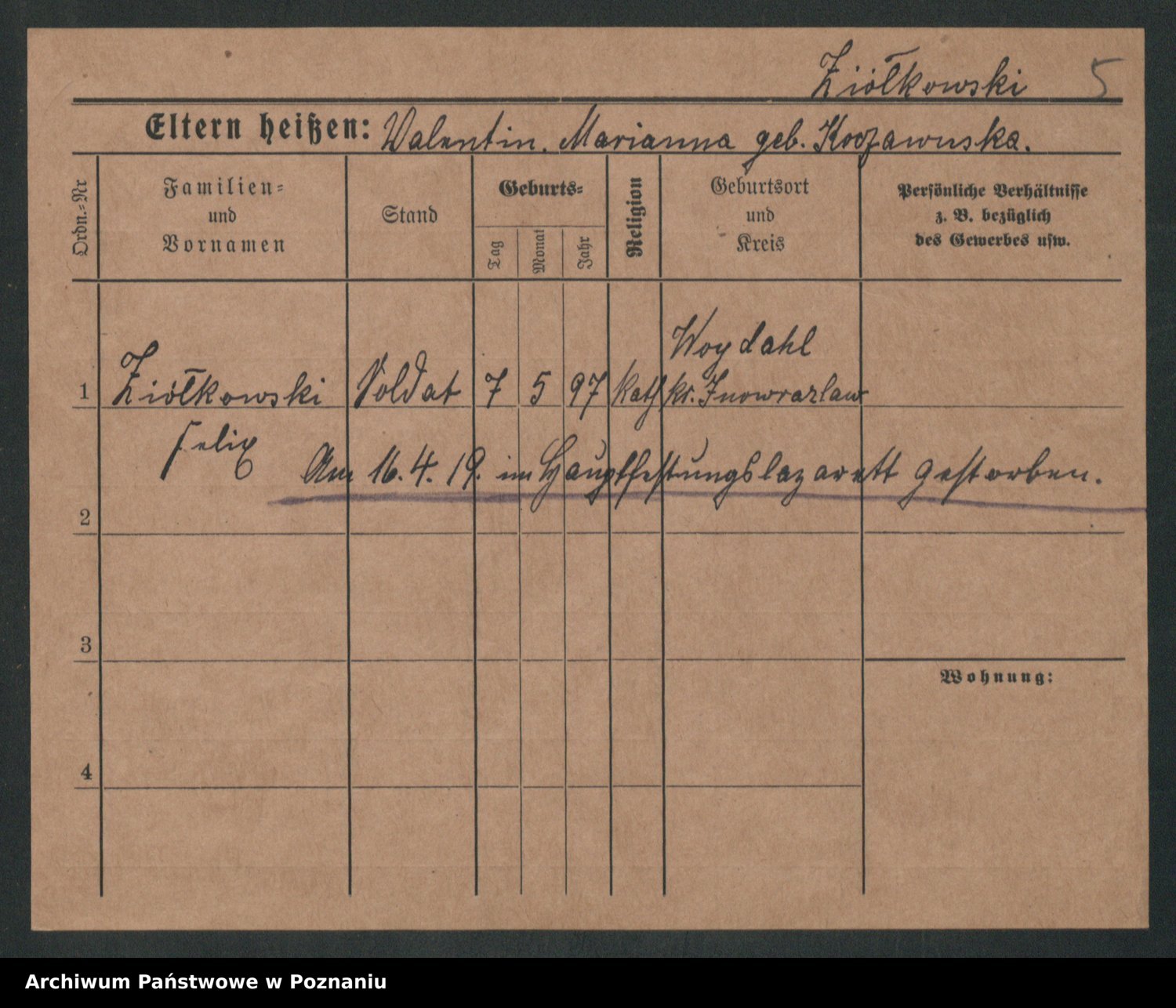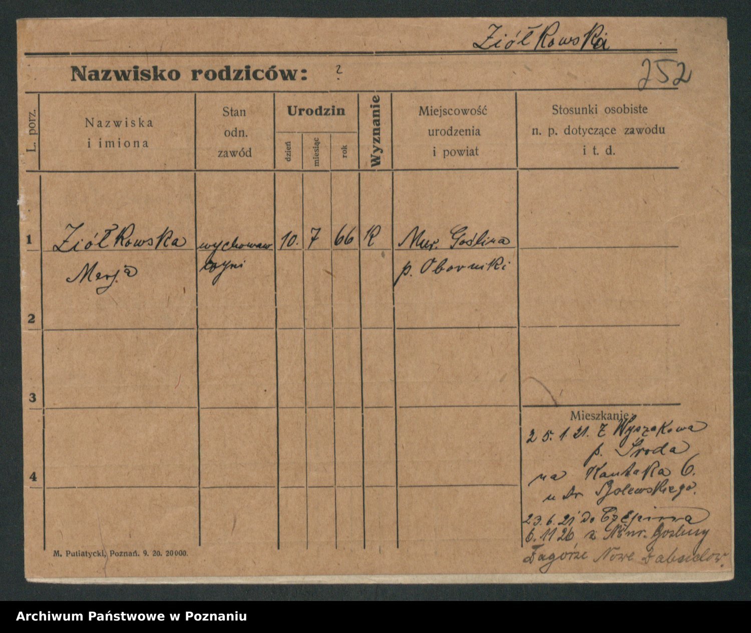 Podgląd karty osobowej dostępny jest po kliknięciu na nazwisko lub ikonkę karty. Można dokonywać powiększenia (ikony na górze) lub przechodzić między kolejnymi skanami (strzałki po bokach).