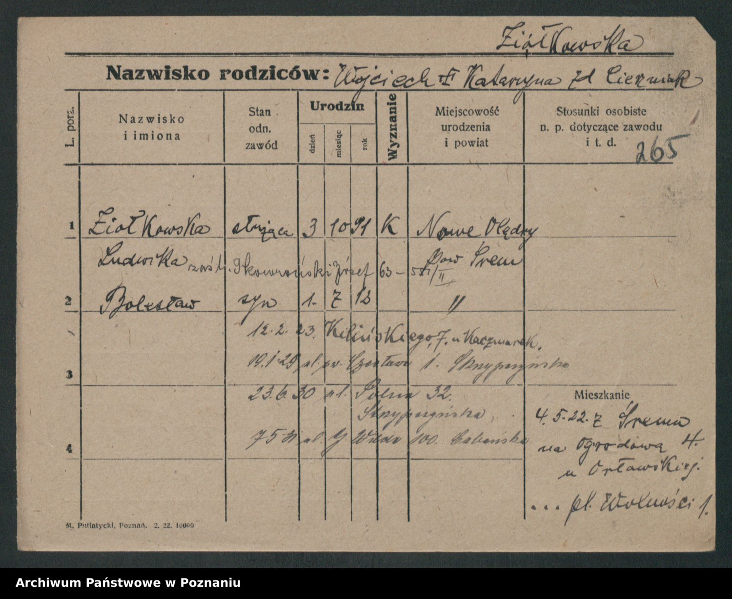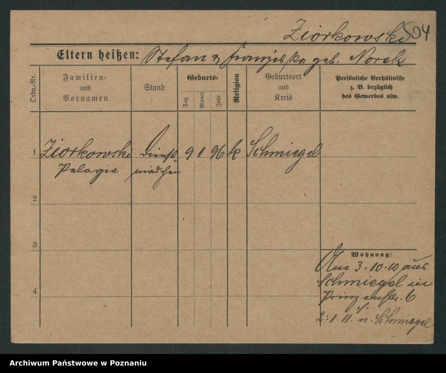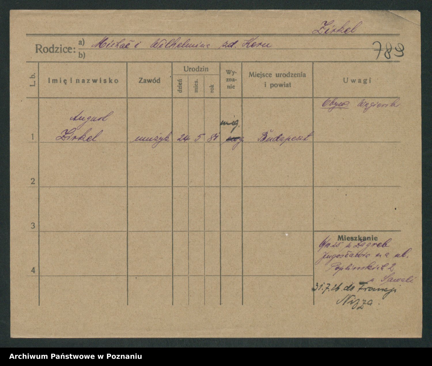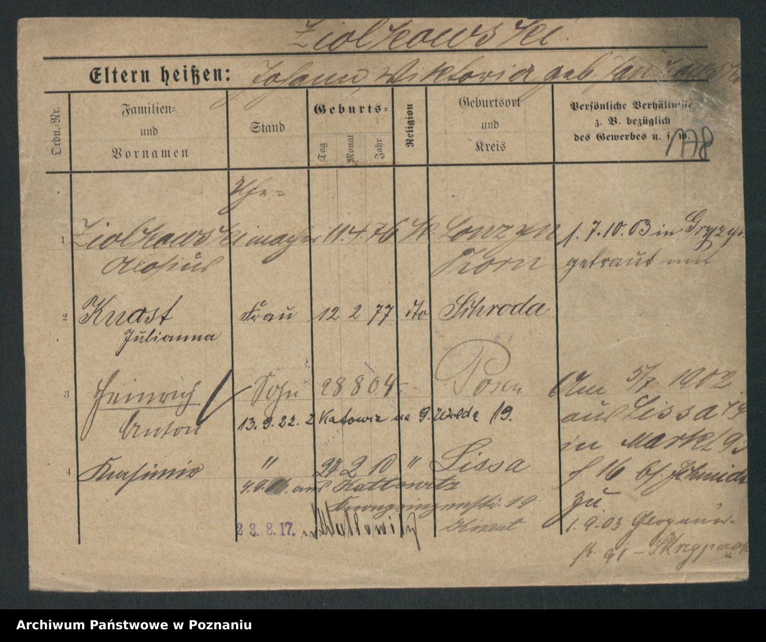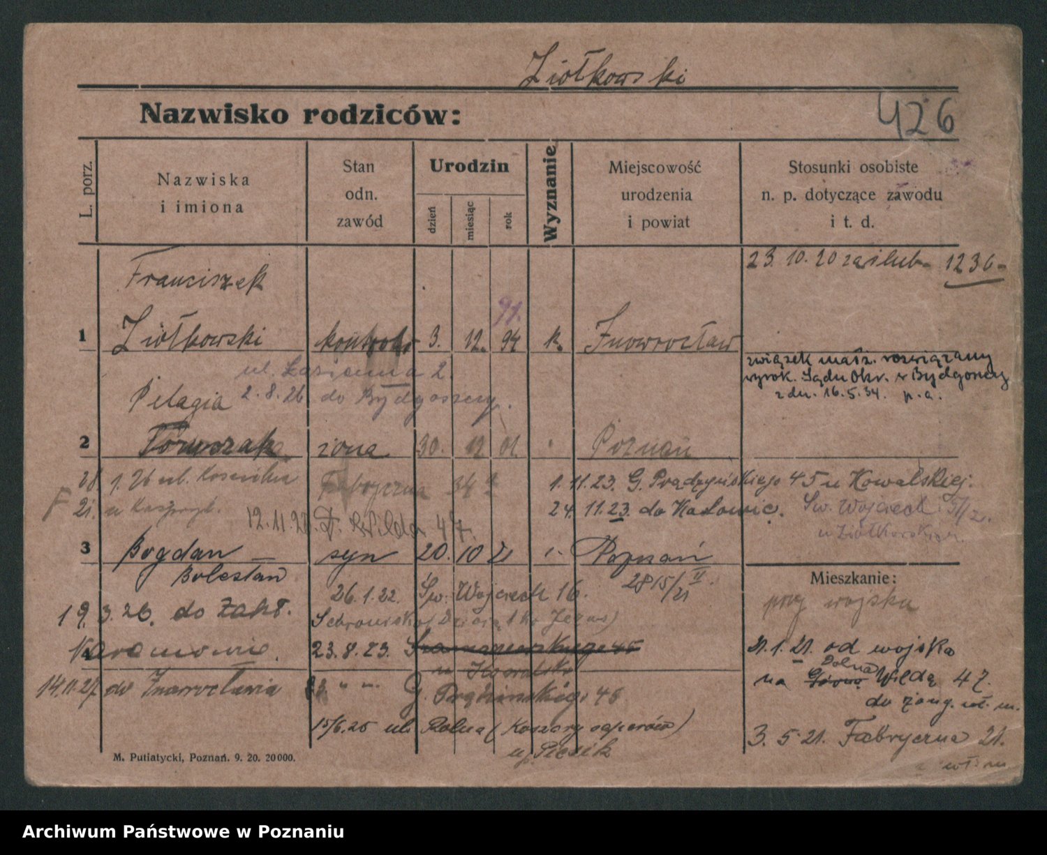 Podgląd karty osobowej dostępny jest po kliknięciu na nazwisko lub ikonkę karty. Można dokonywać powiększenia (ikony na górze) lub przechodzić między kolejnymi skanami (strzałki po bokach).