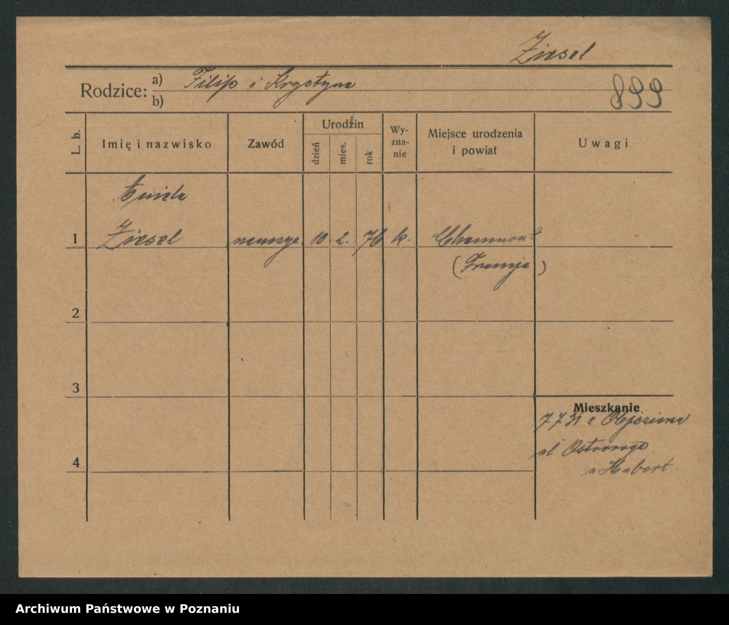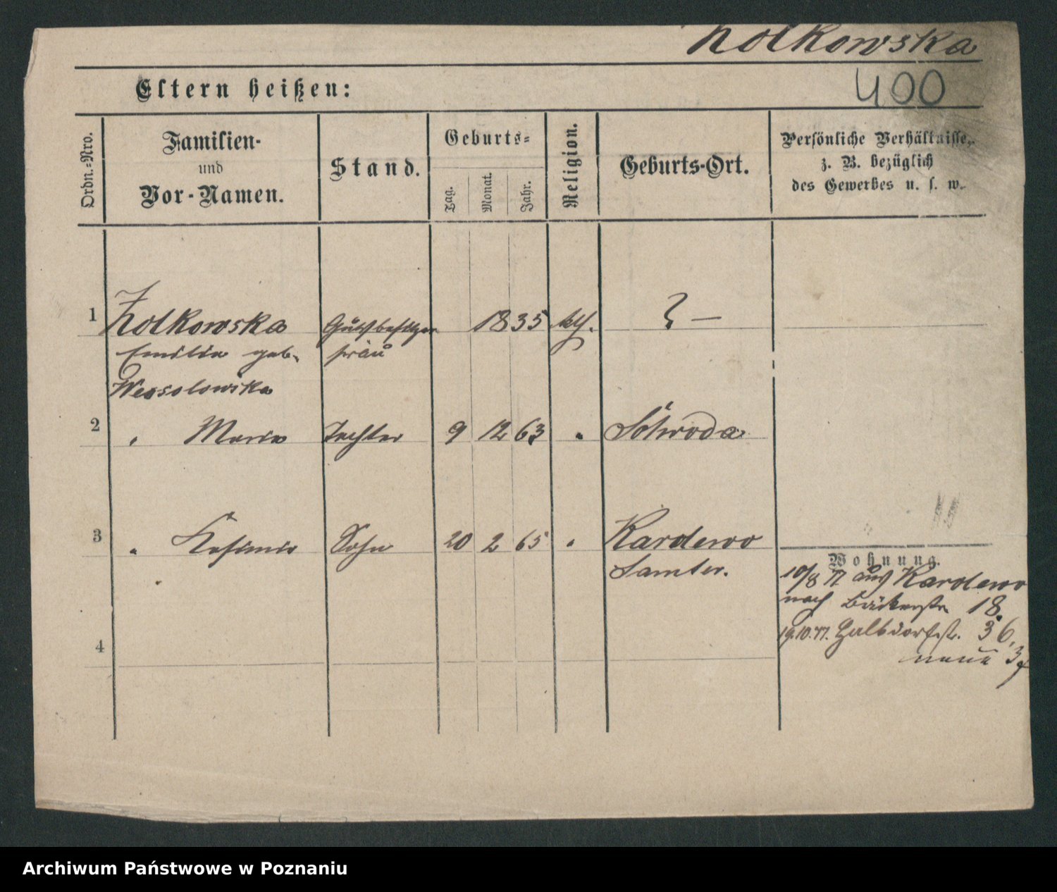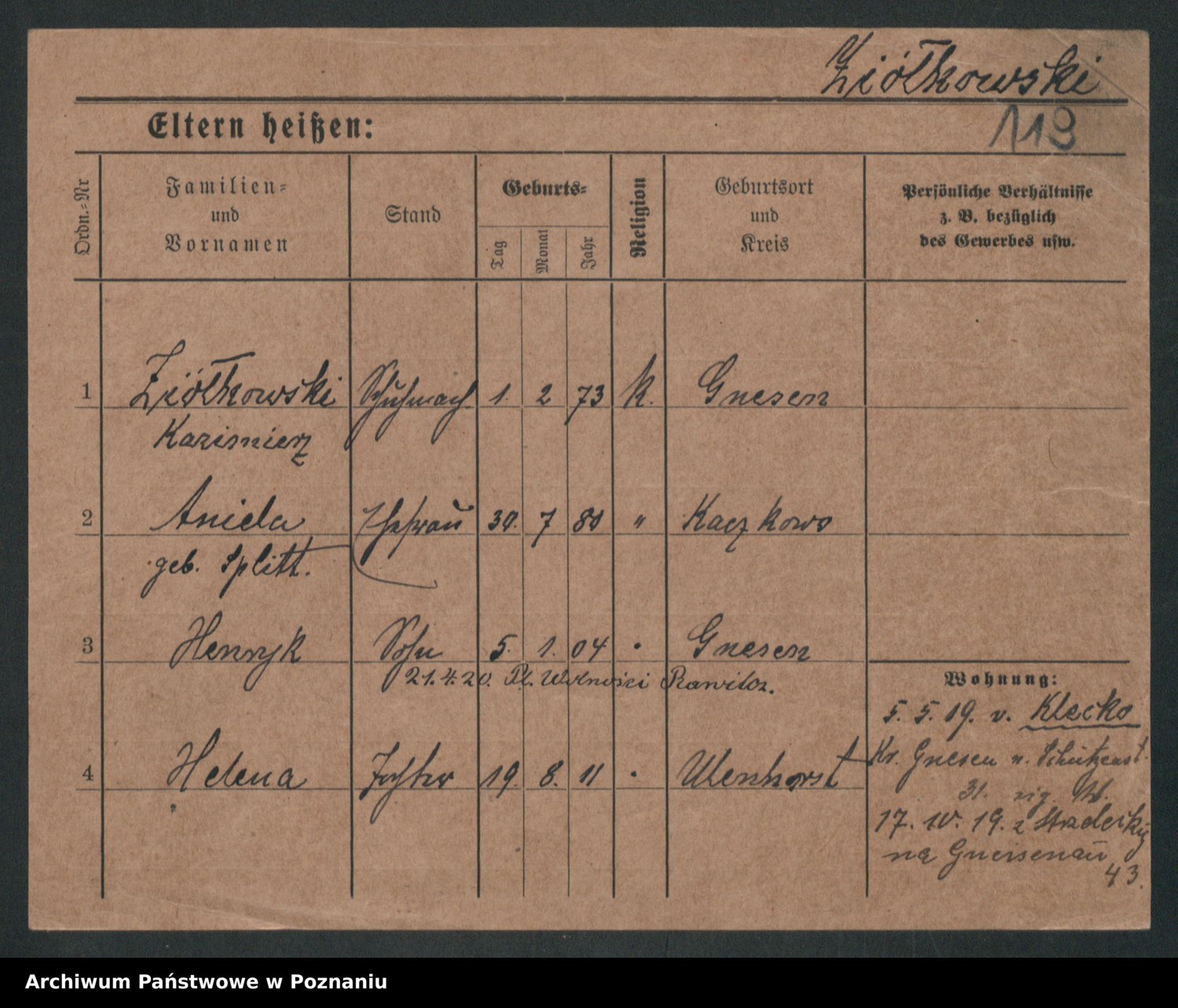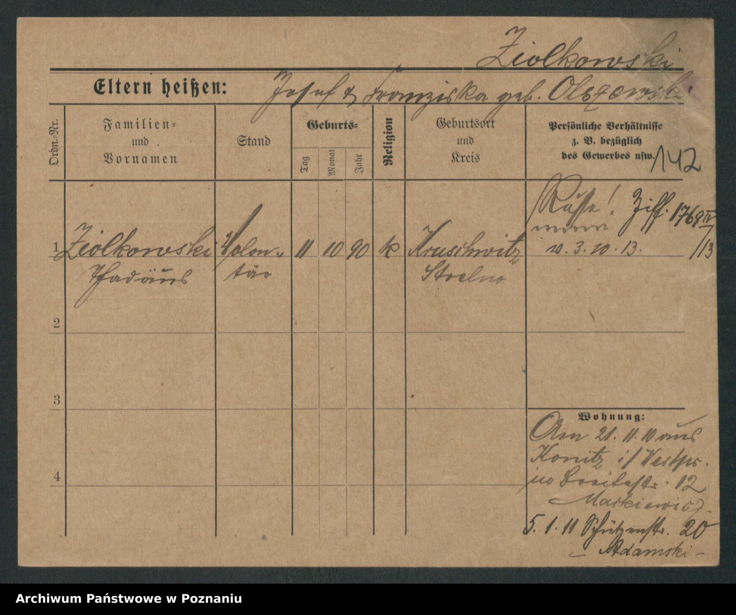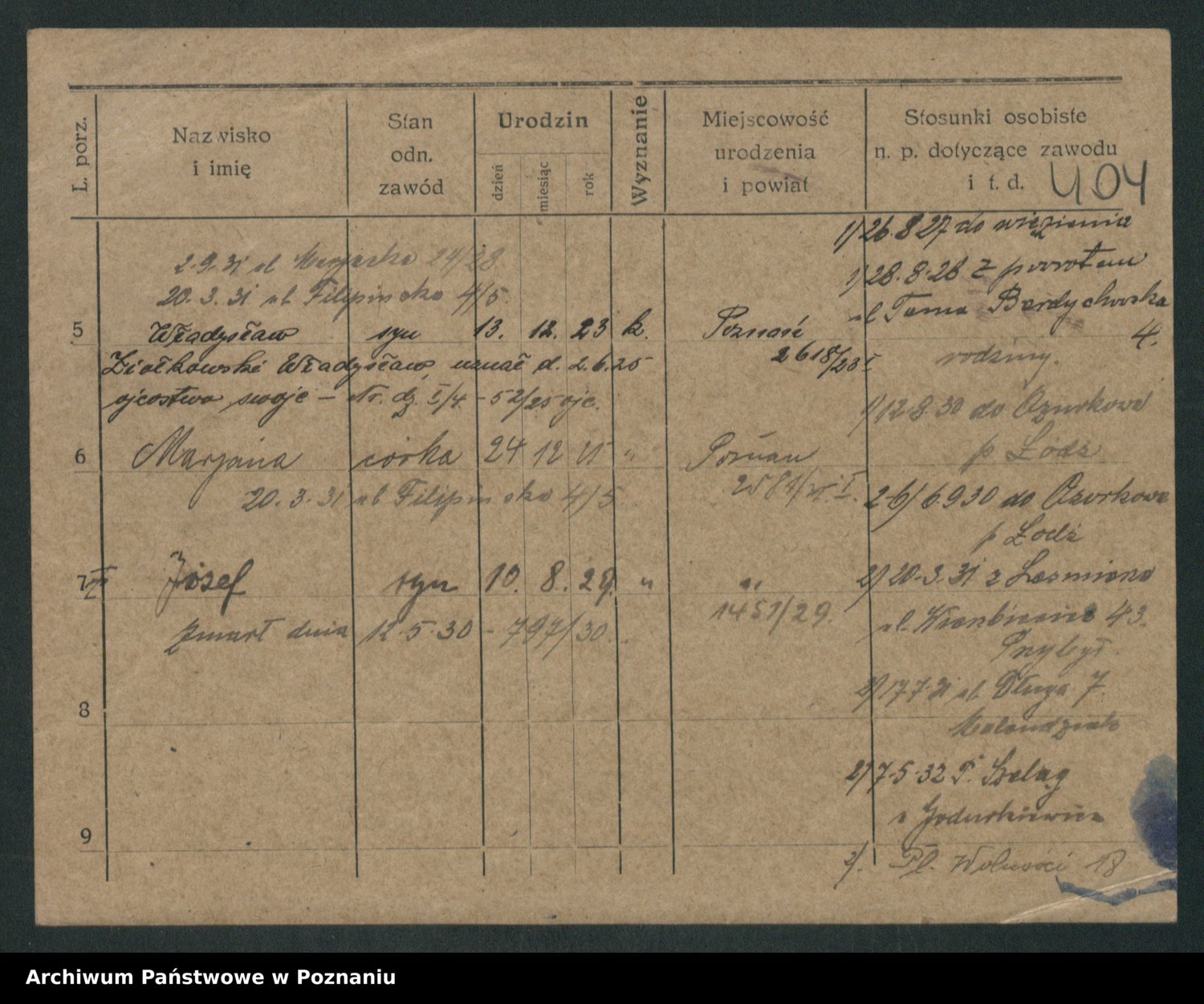 Podgląd karty osobowej dostępny jest po kliknięciu na nazwisko lub ikonkę karty. Można dokonywać powiększenia (ikony na górze) lub przechodzić między kolejnymi skanami (strzałki po bokach).