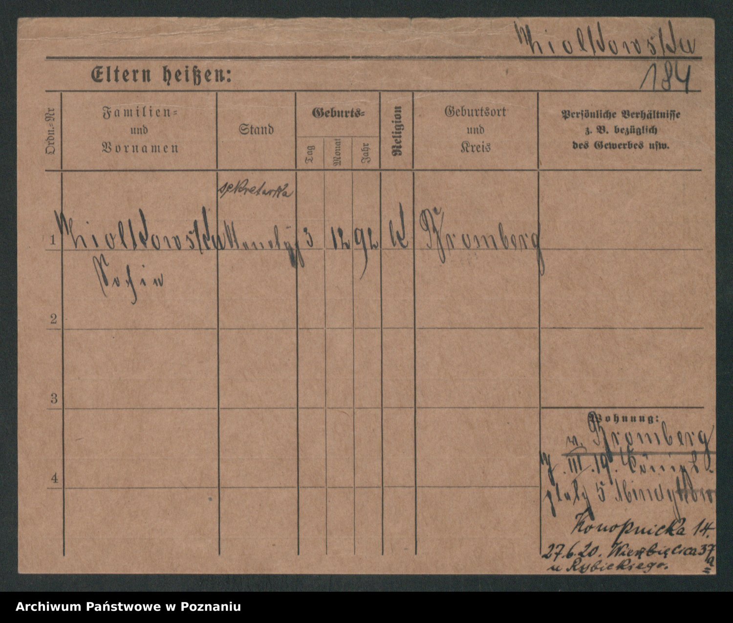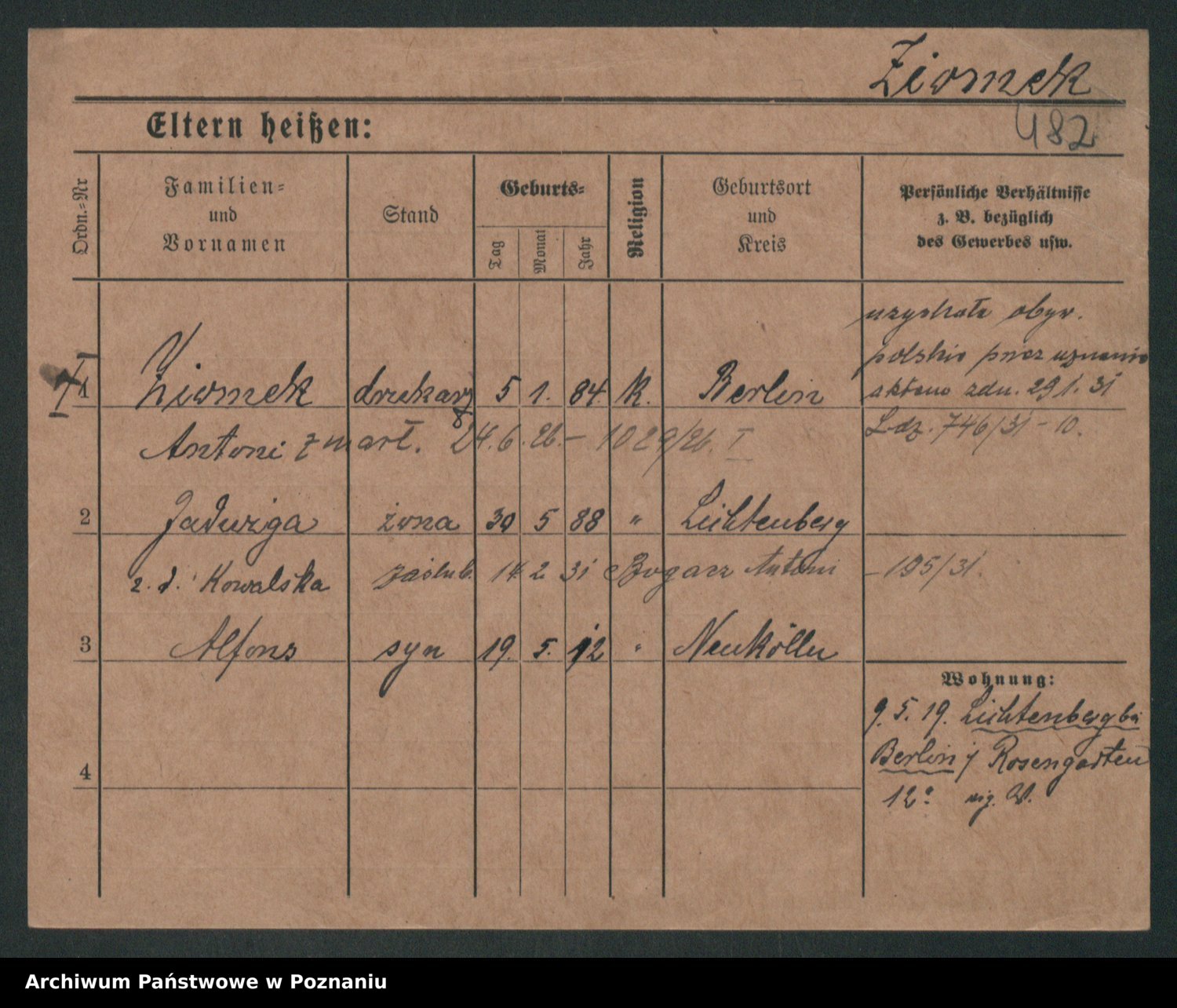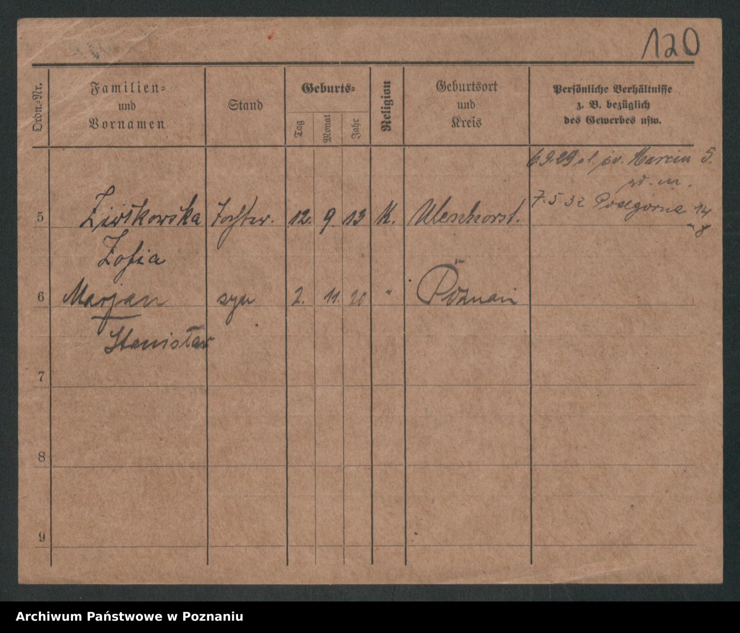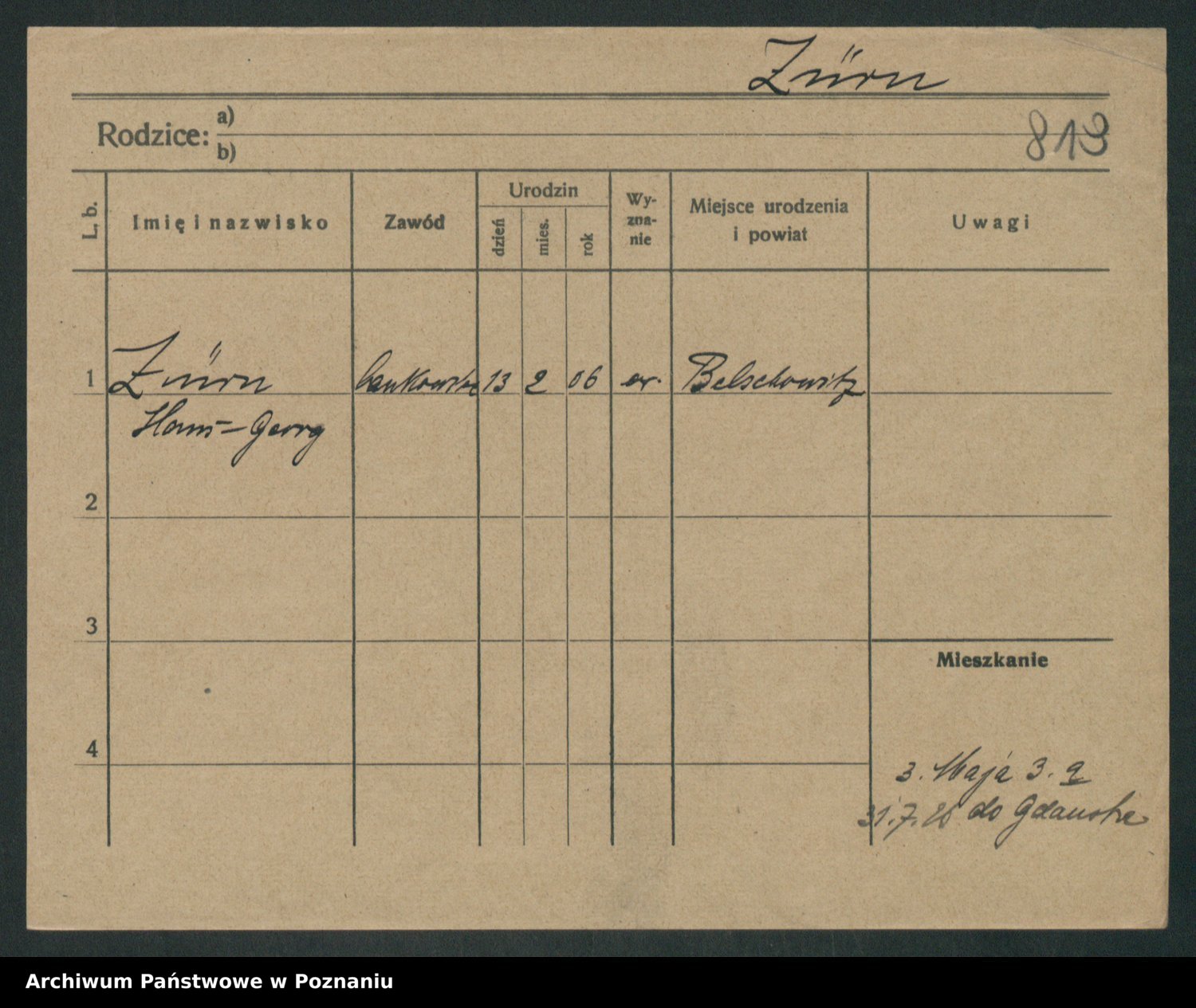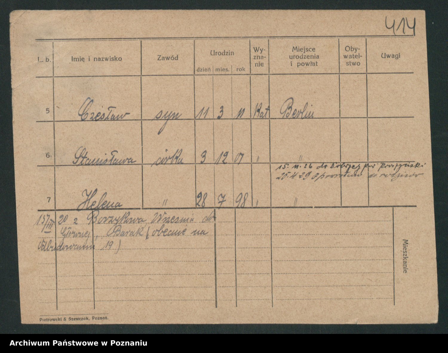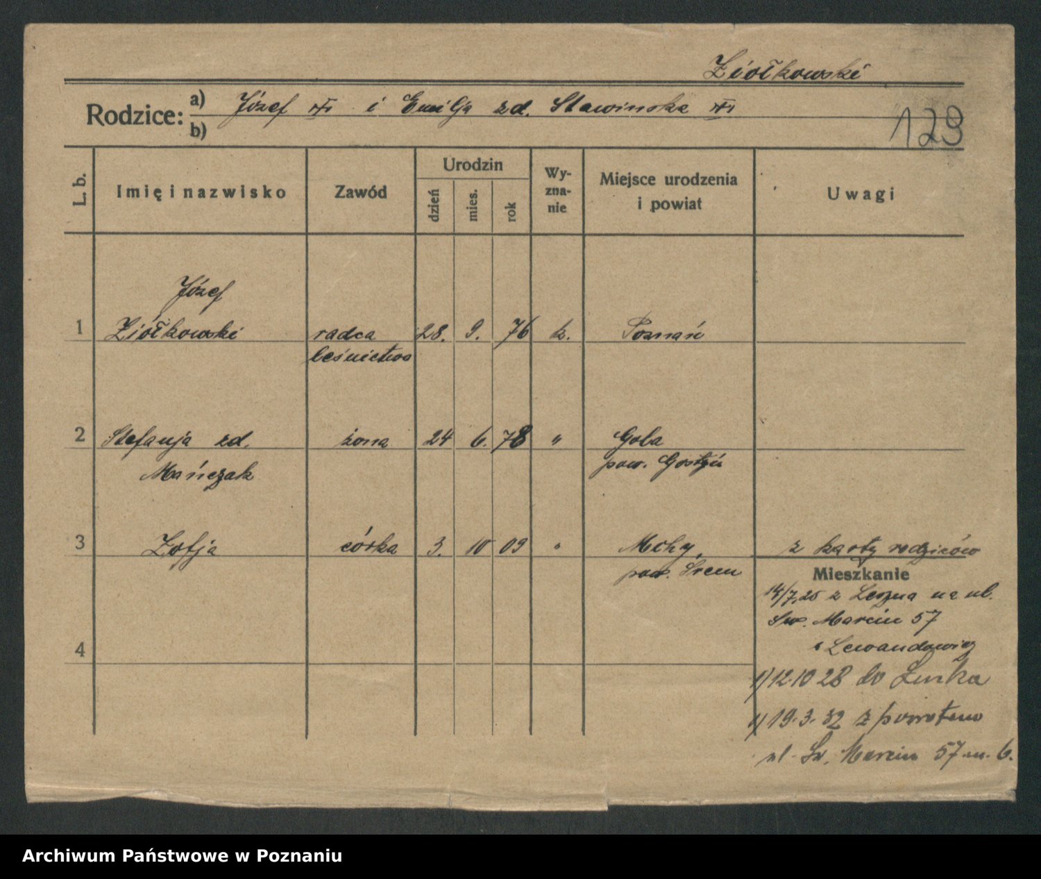 Podgląd karty osobowej dostępny jest po kliknięciu na nazwisko lub ikonkę karty. Można dokonywać powiększenia (ikony na górze) lub przechodzić między kolejnymi skanami (strzałki po bokach).