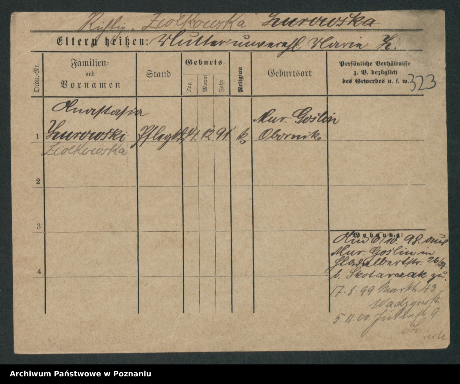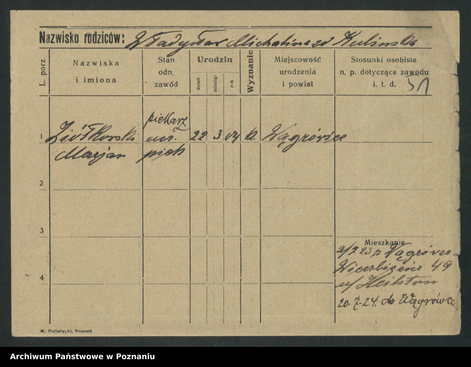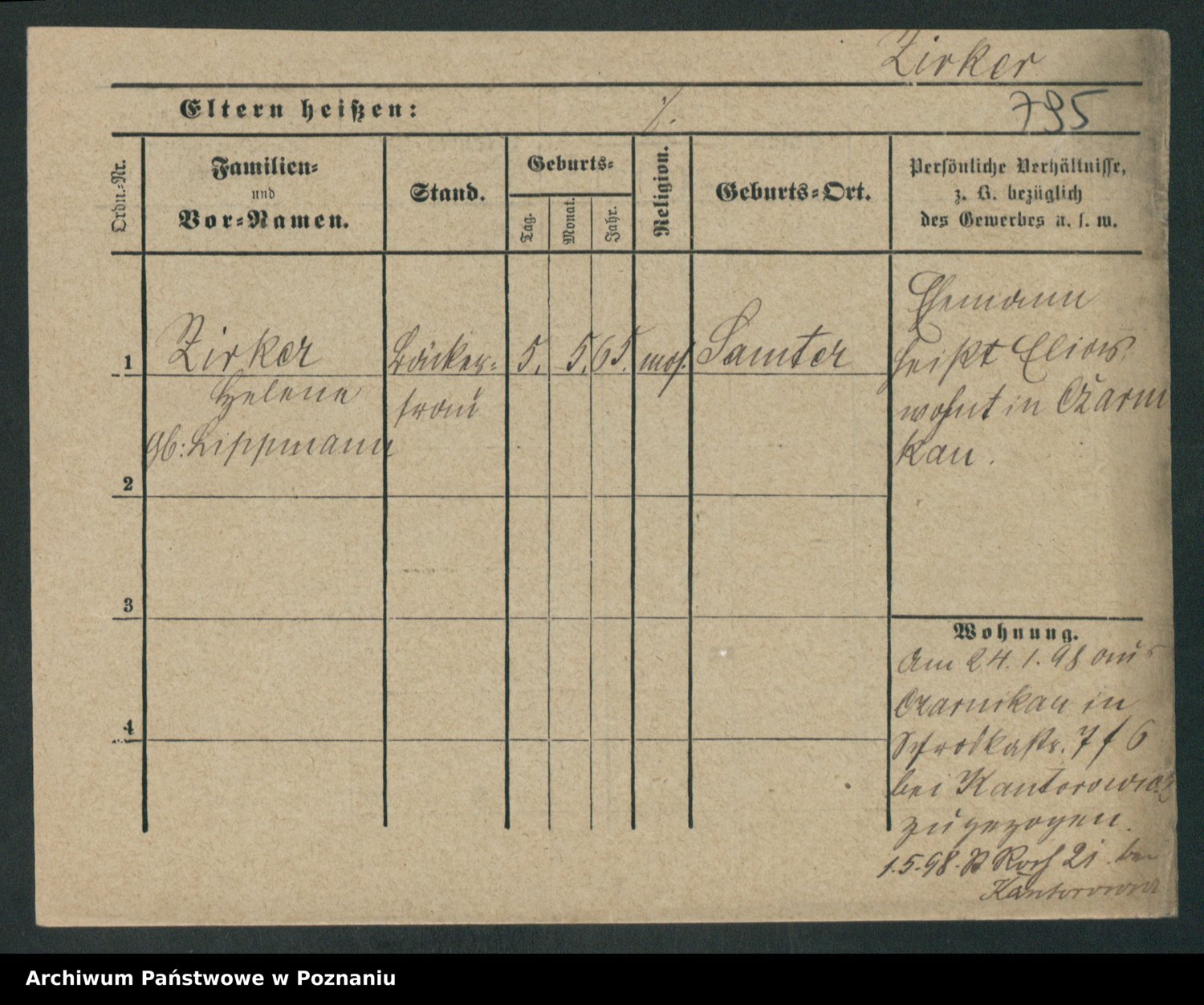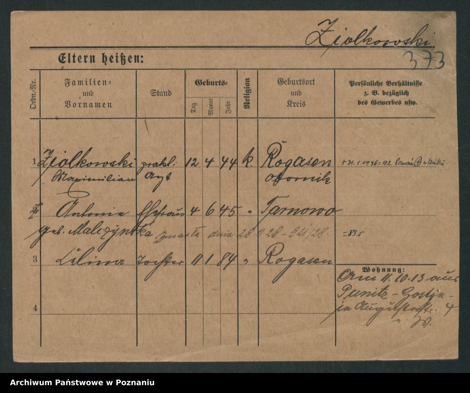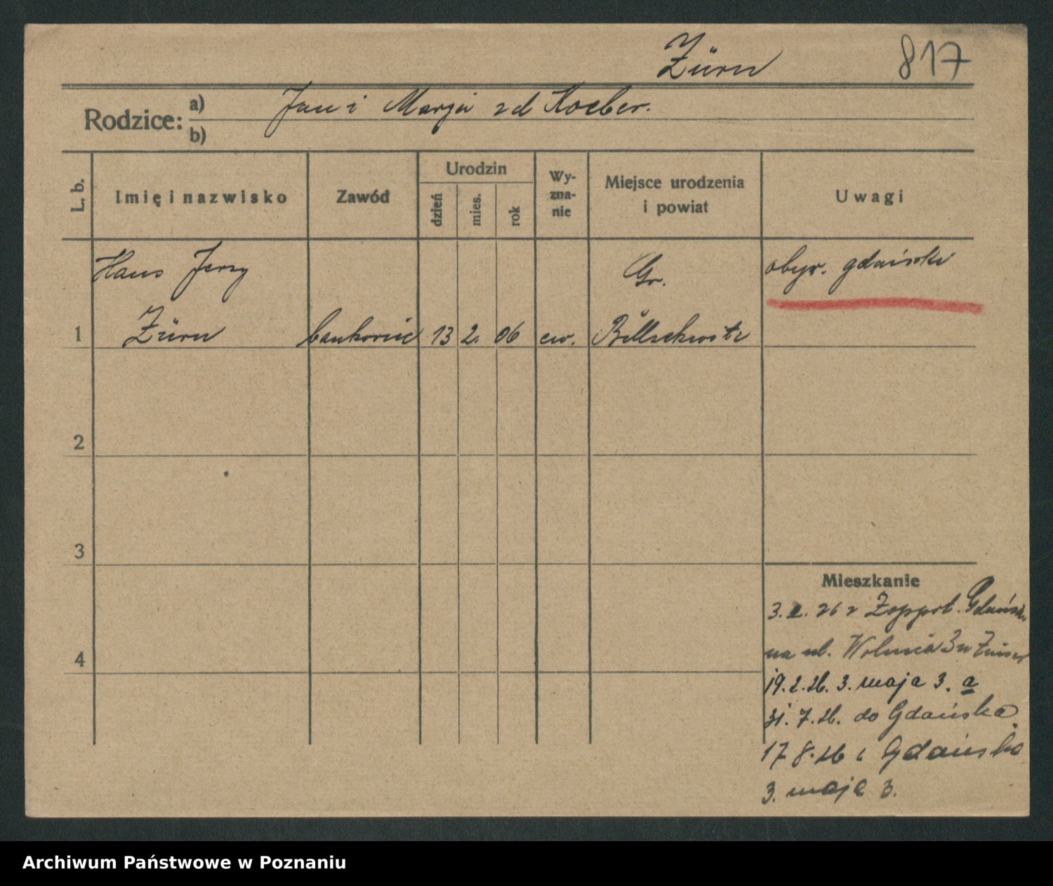Podgląd karty osobowej dostępny jest po kliknięciu na nazwisko lub ikonkę karty. Można dokonywać powiększenia (ikony na górze) lub przechodzić między kolejnymi skanami (strzałki po bokach).