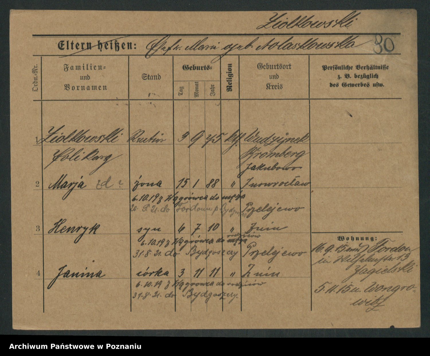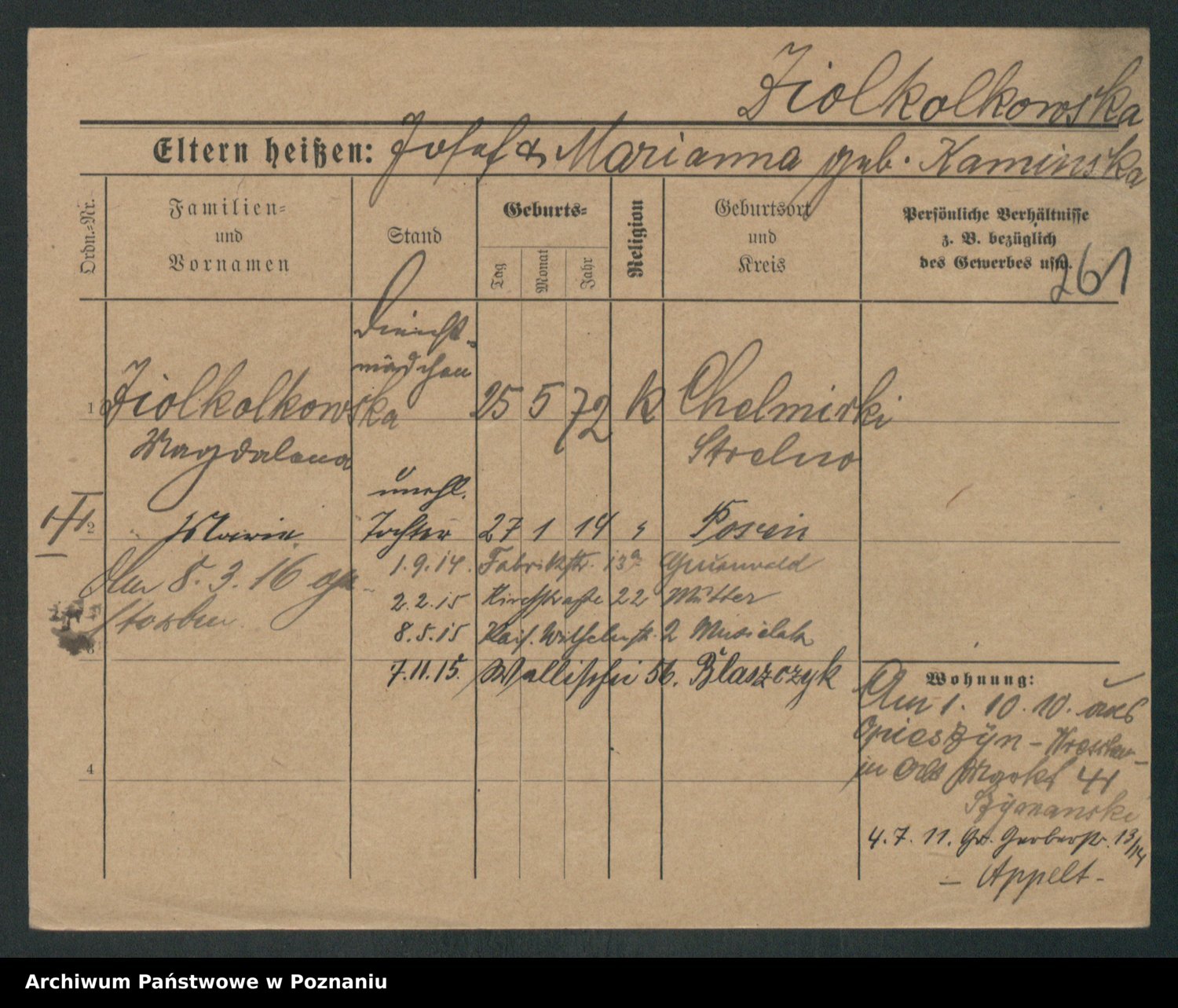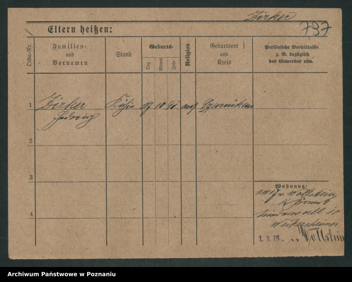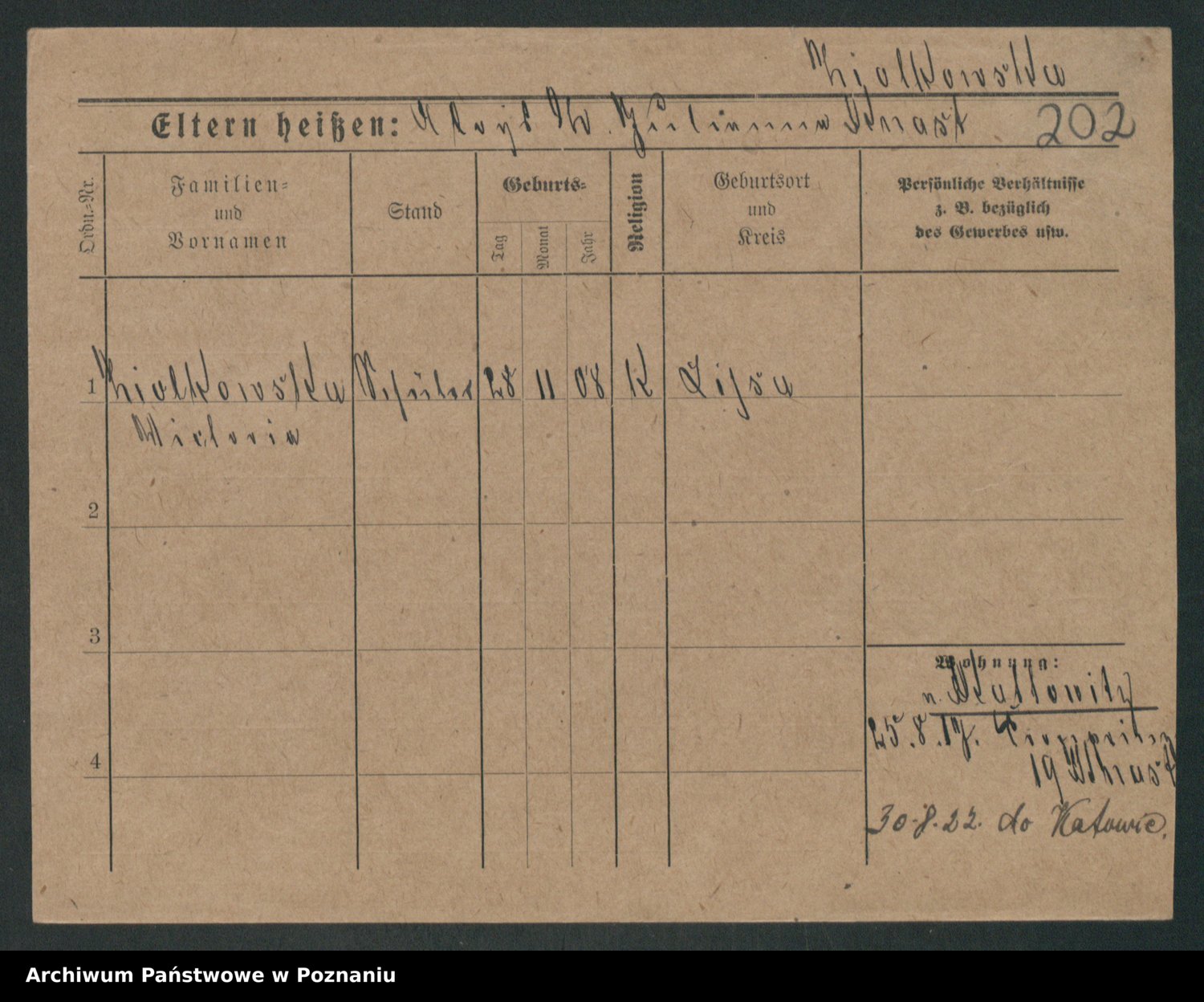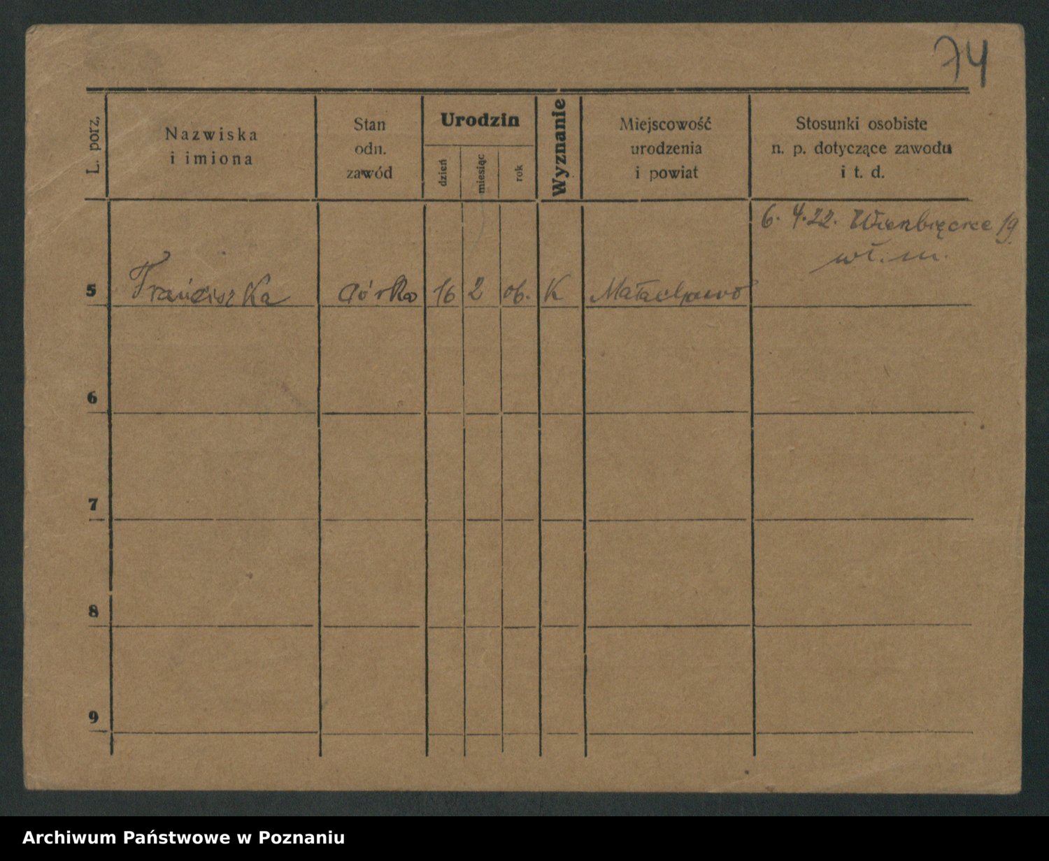 Podgląd karty osobowej dostępny jest po kliknięciu na nazwisko lub ikonkę karty. Można dokonywać powiększenia (ikony na górze) lub przechodzić między kolejnymi skanami (strzałki po bokach).