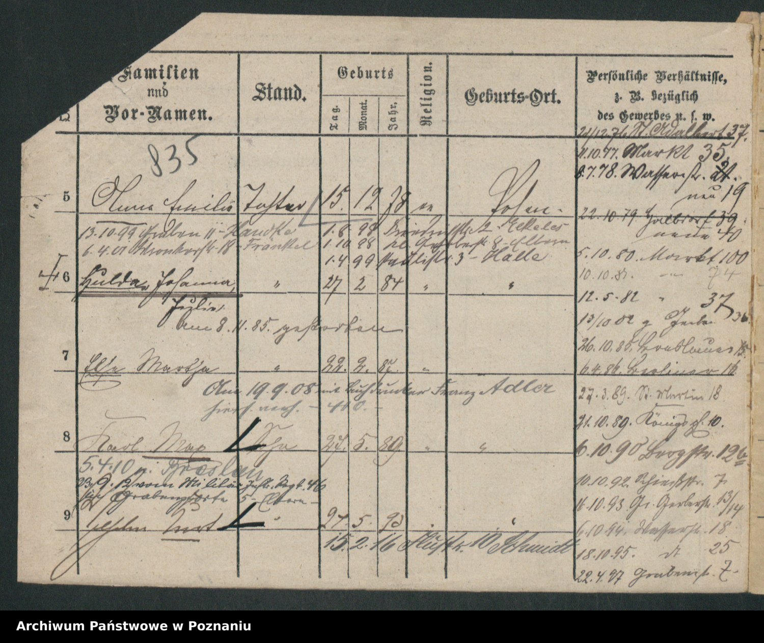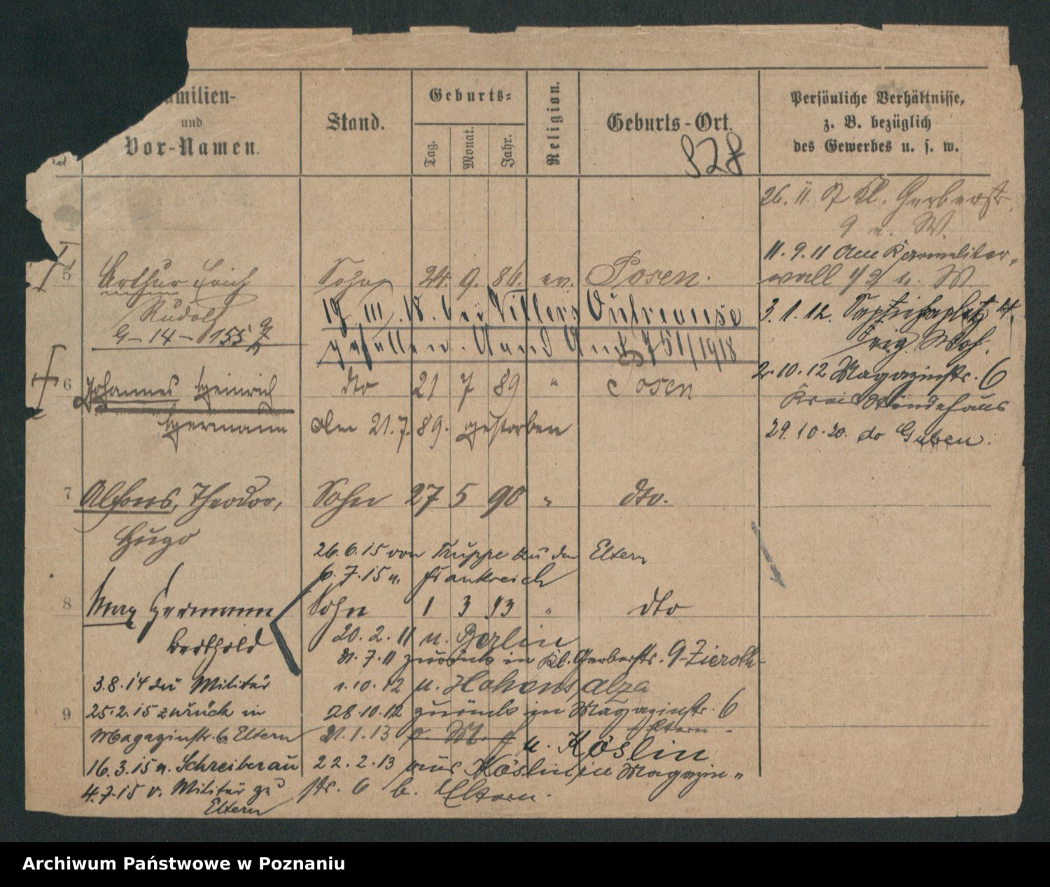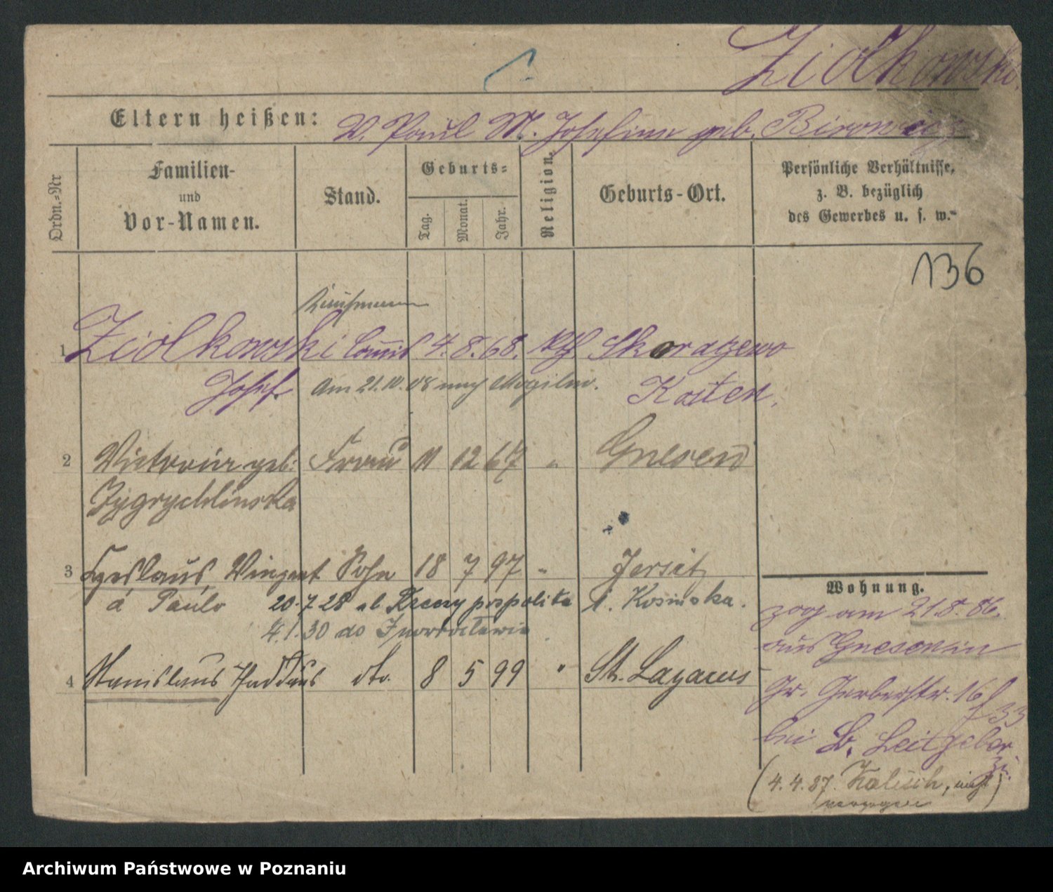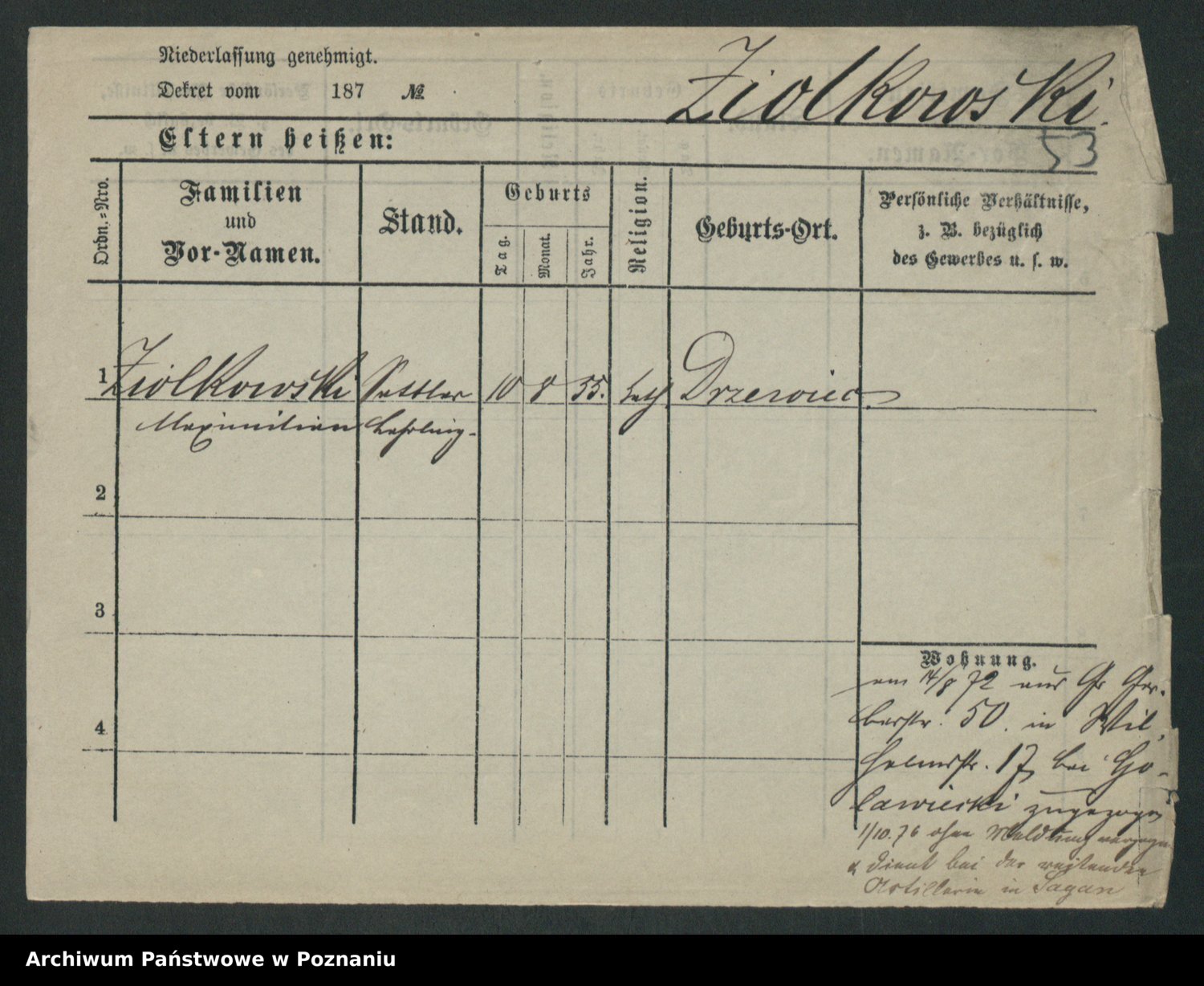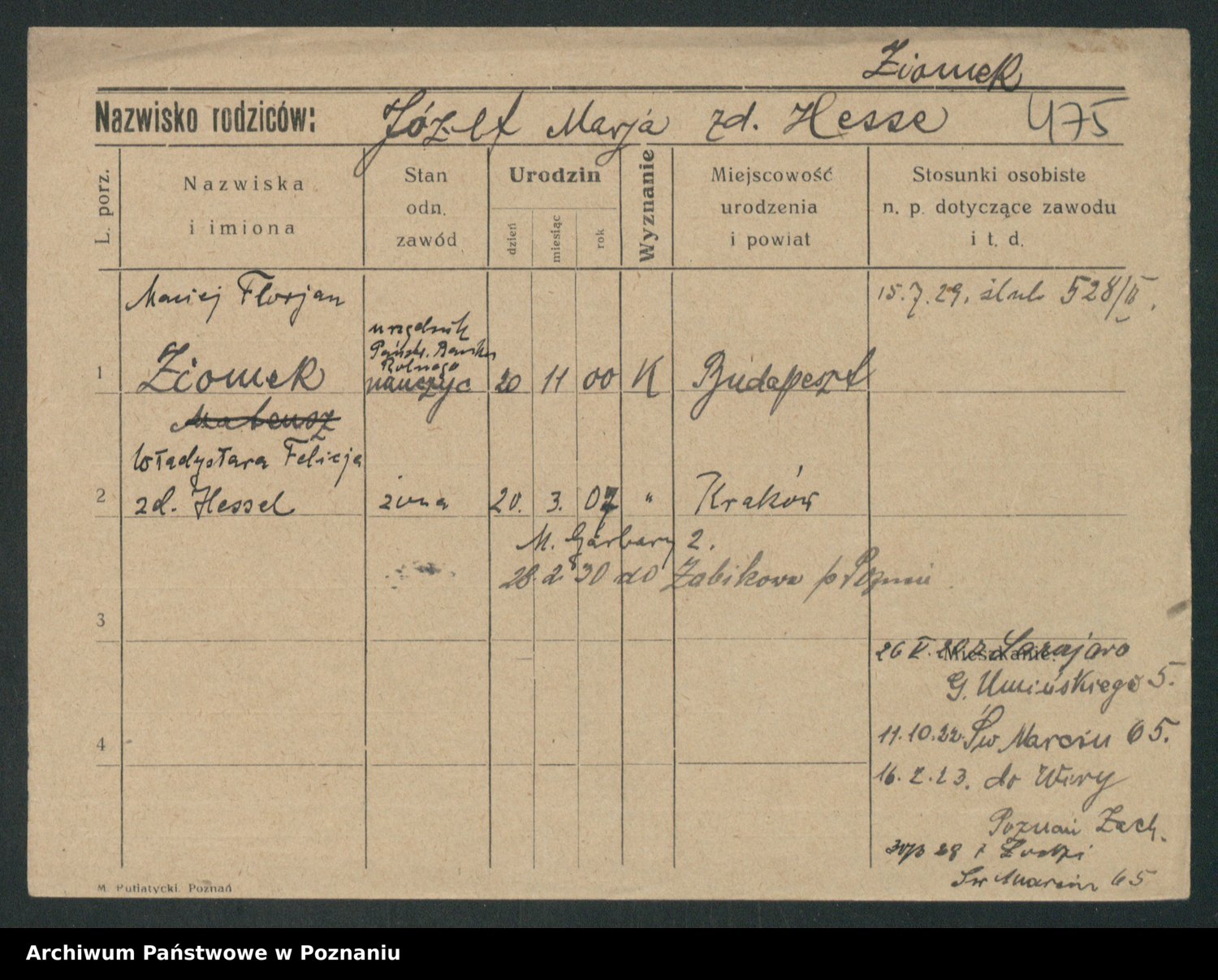 Podgląd karty osobowej dostępny jest po kliknięciu na nazwisko lub ikonkę karty. Można dokonywać powiększenia (ikony na górze) lub przechodzić między kolejnymi skanami (strzałki po bokach).