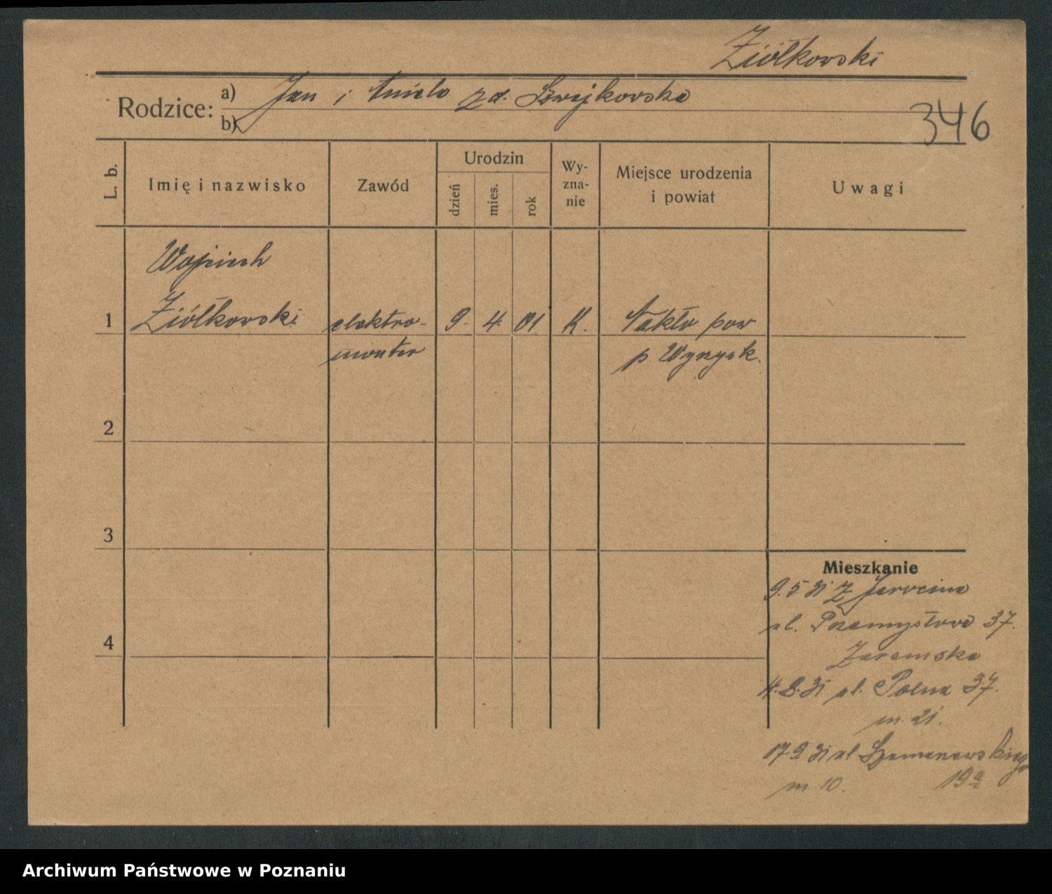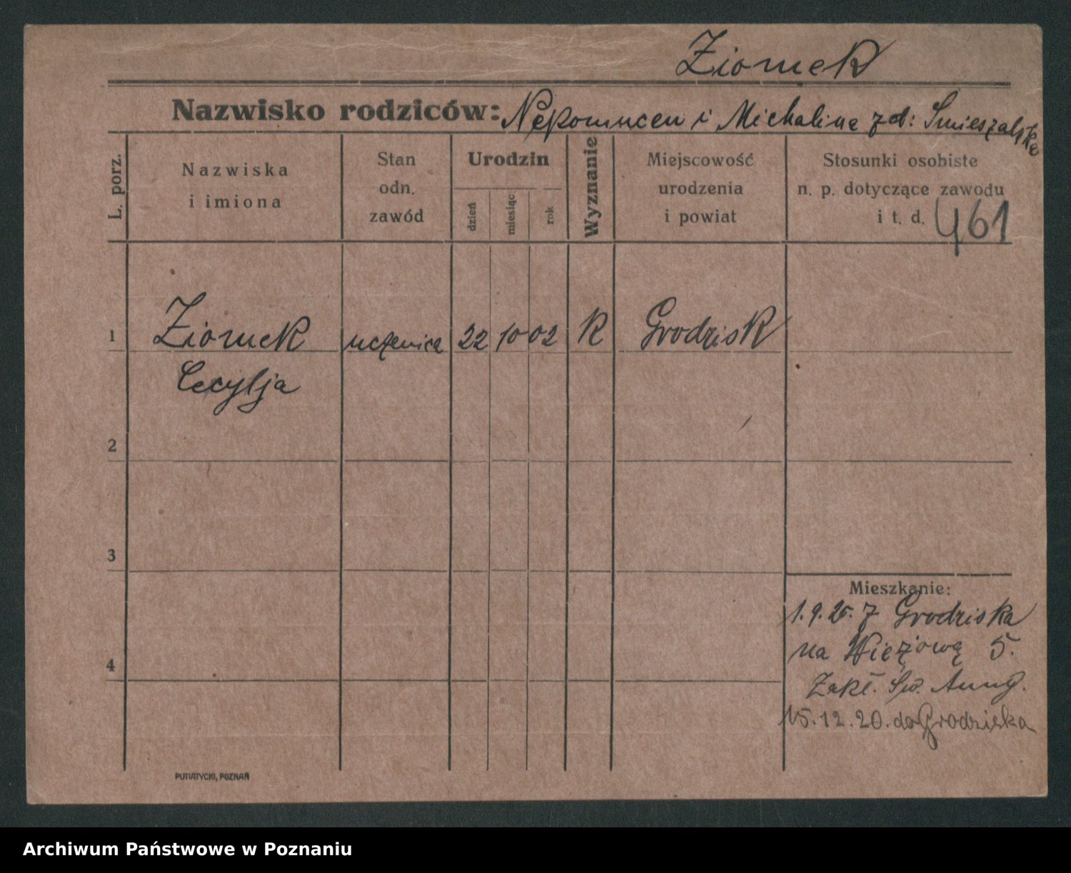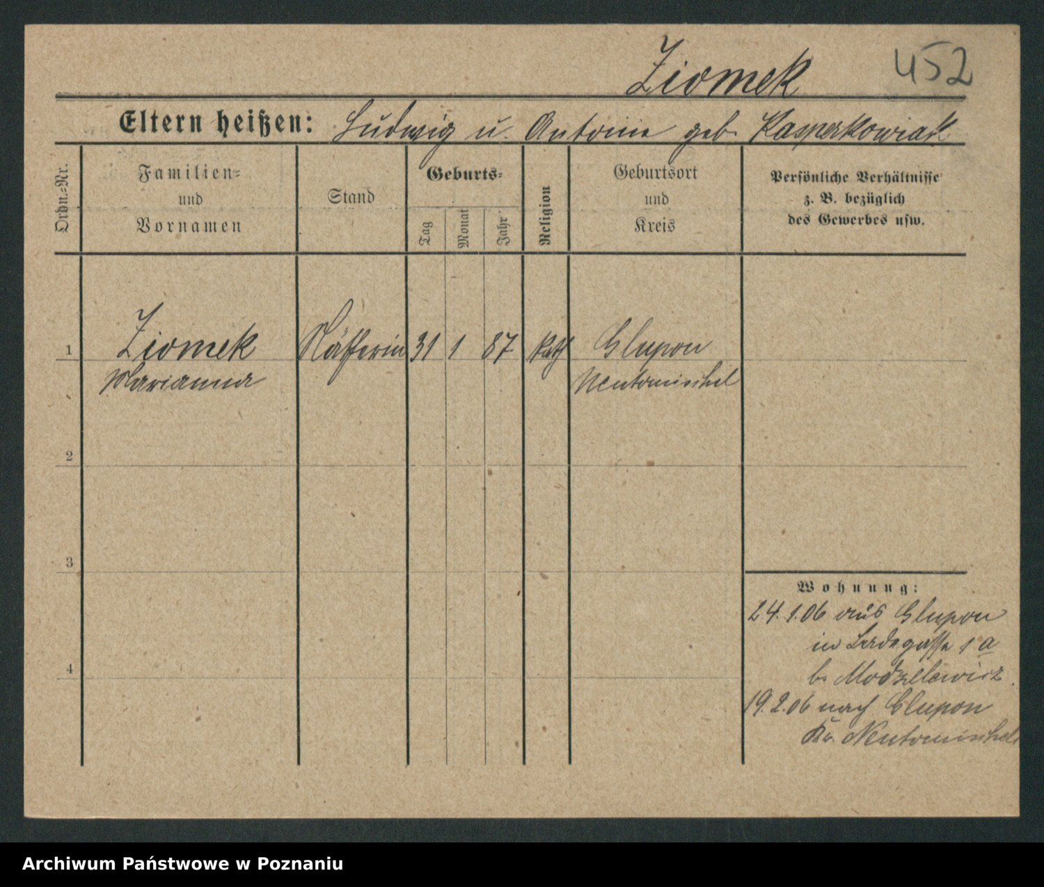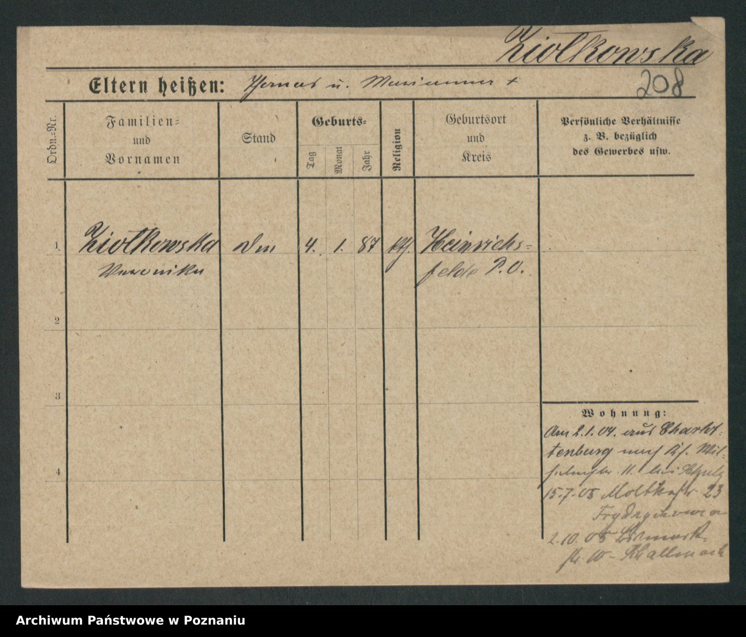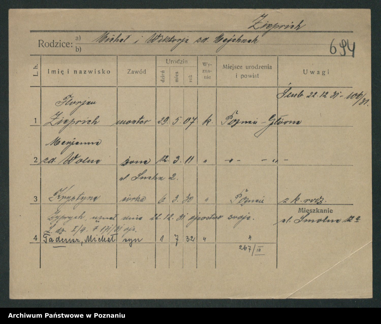 Podgląd karty osobowej dostępny jest po kliknięciu na nazwisko lub ikonkę karty. Można dokonywać powiększenia (ikony na górze) lub przechodzić między kolejnymi skanami (strzałki po bokach).