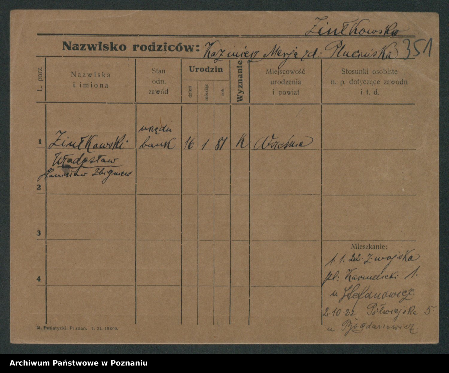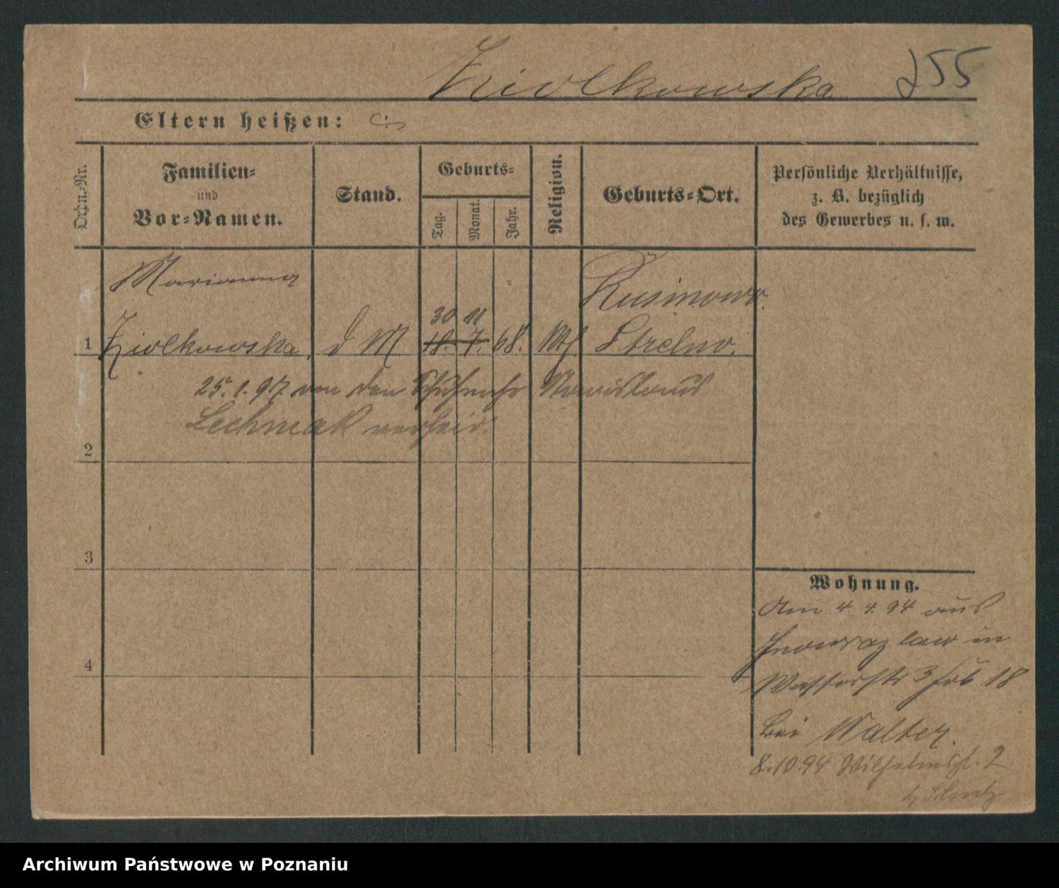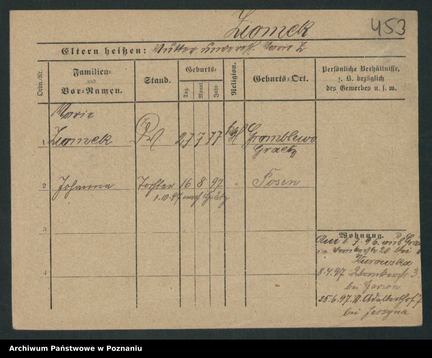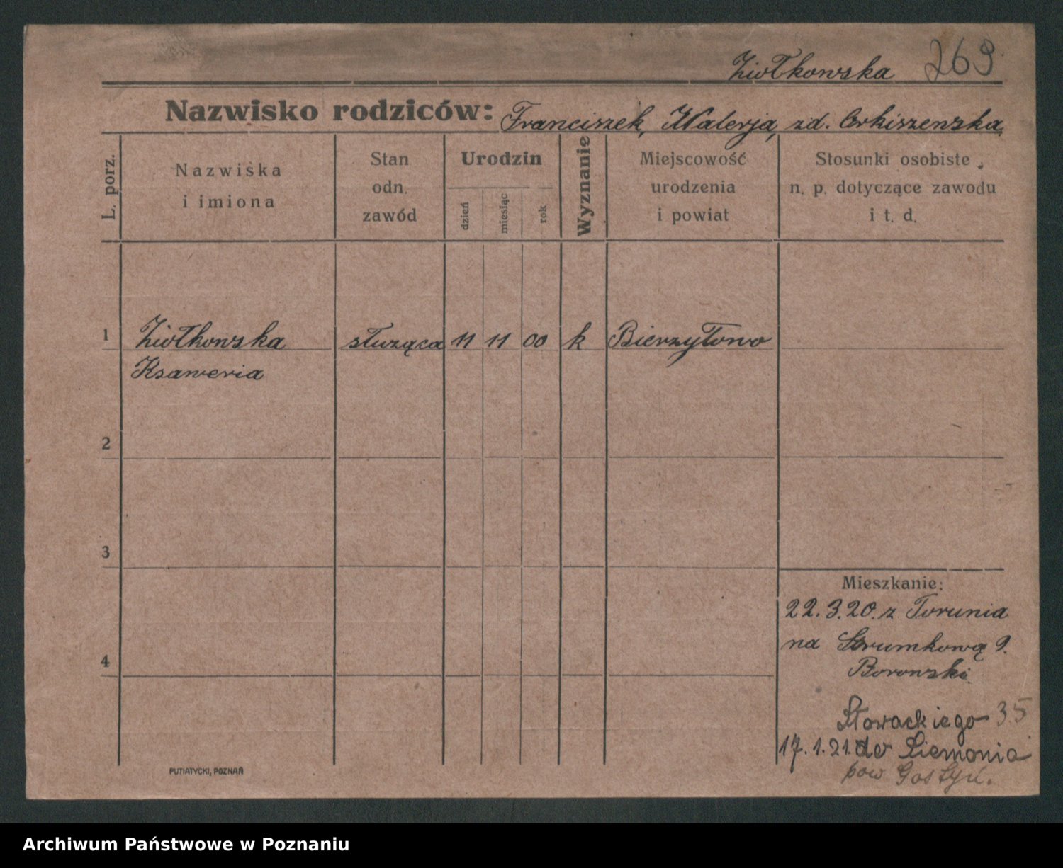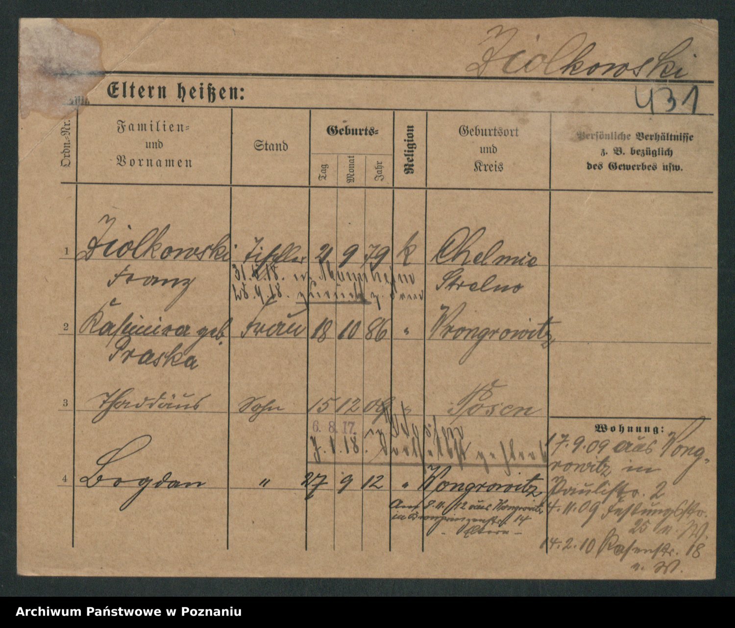 Podgląd karty osobowej dostępny jest po kliknięciu na nazwisko lub ikonkę karty. Można dokonywać powiększenia (ikony na górze) lub przechodzić między kolejnymi skanami (strzałki po bokach).