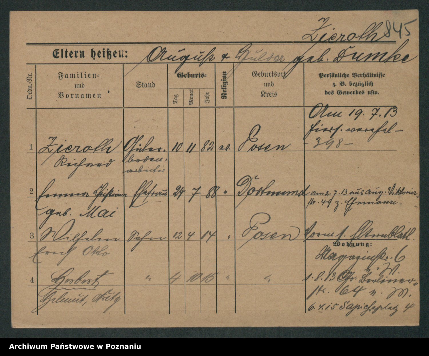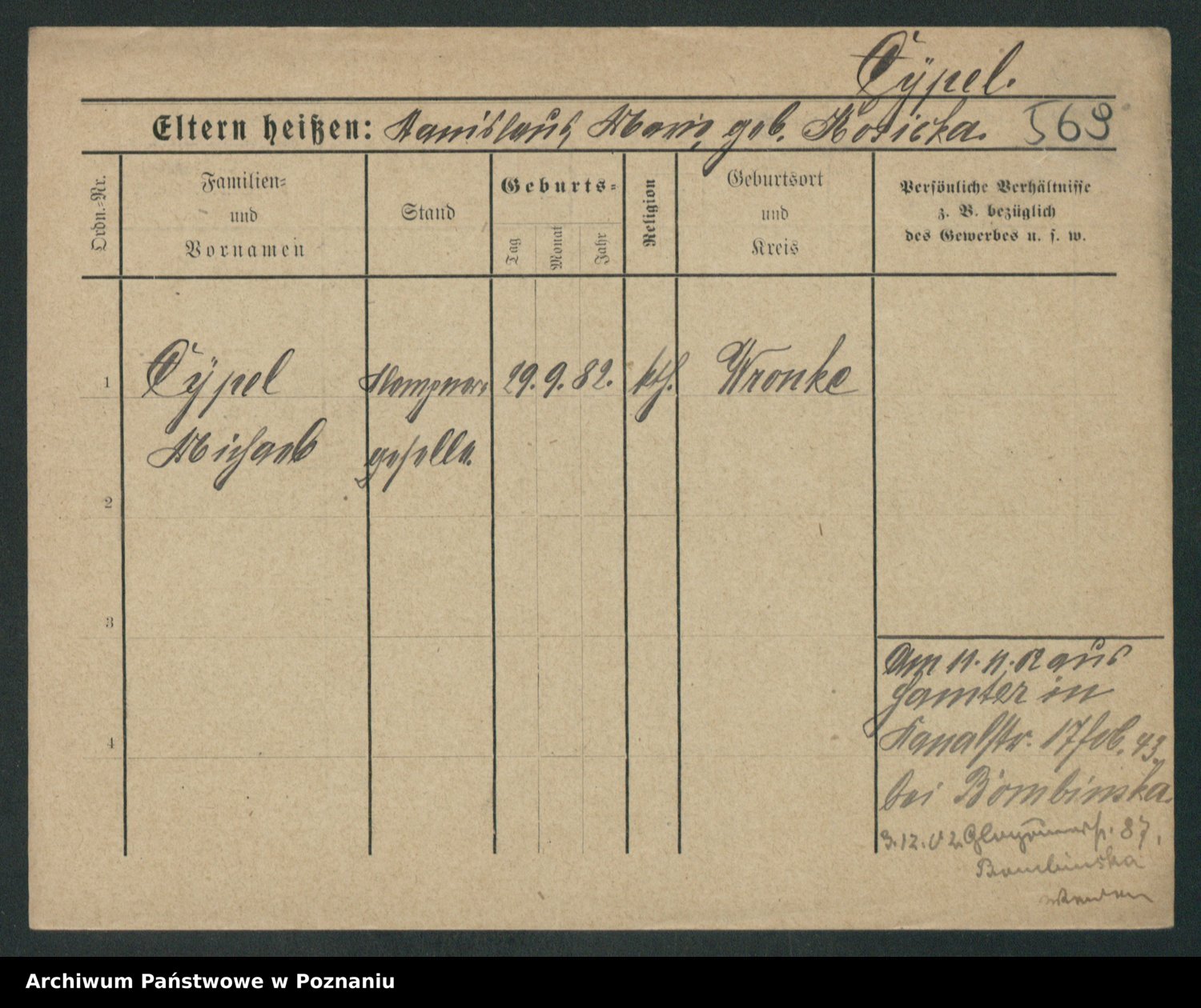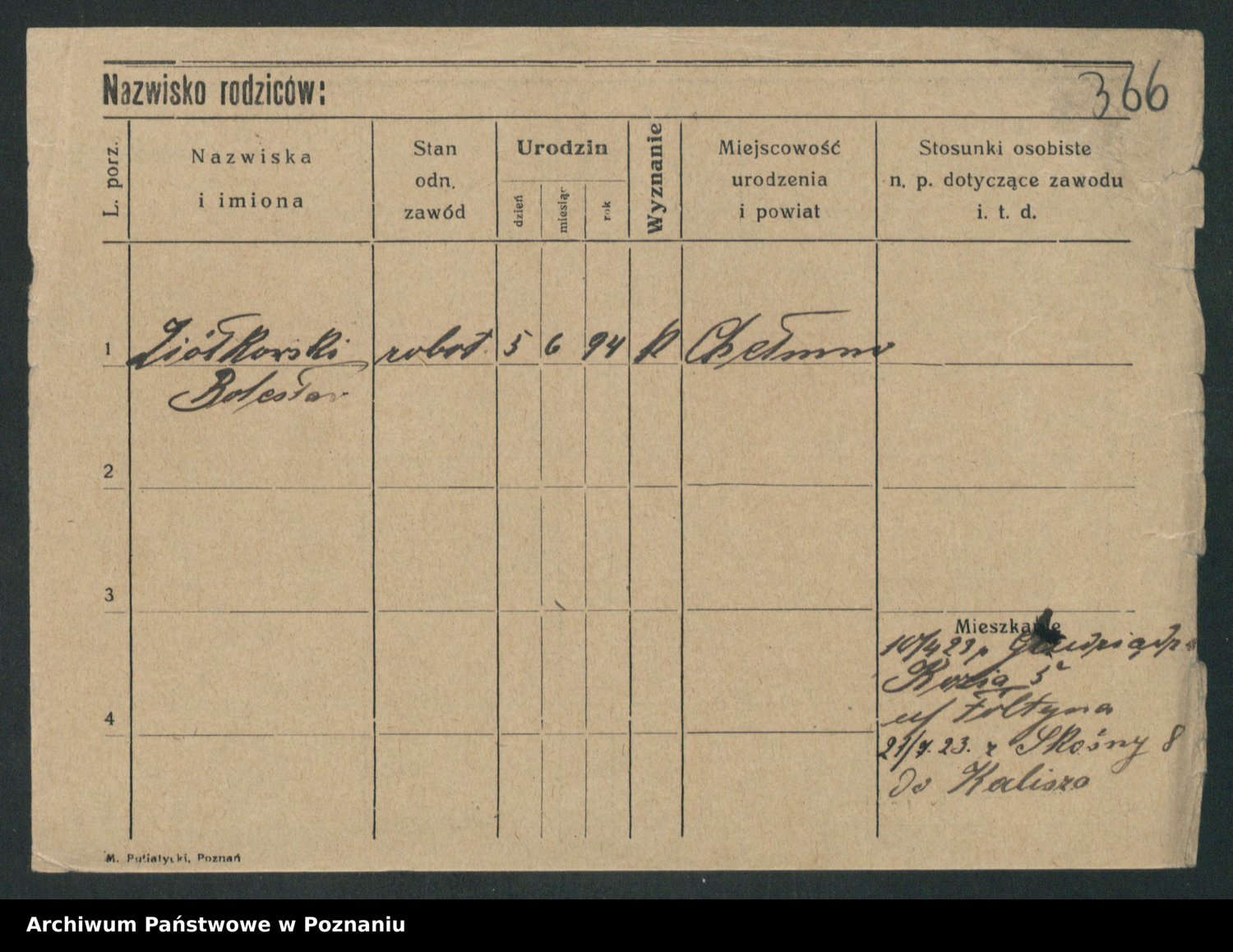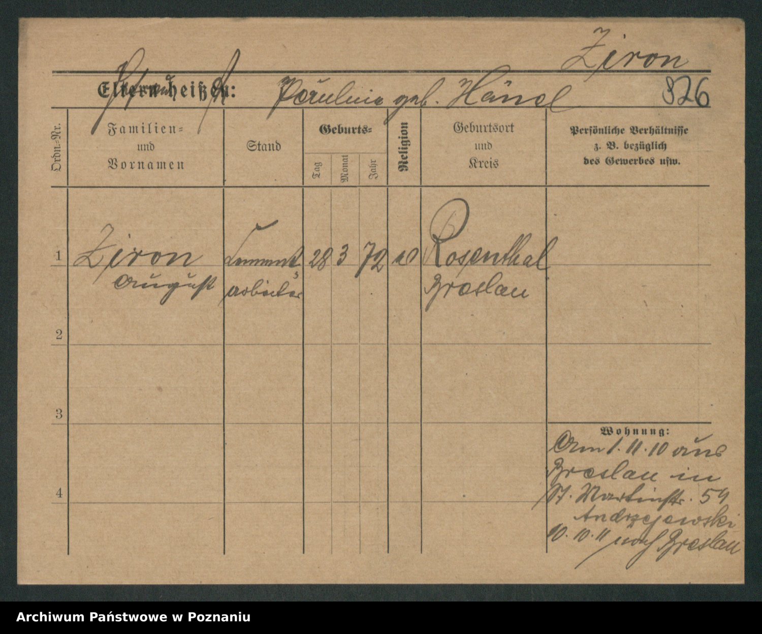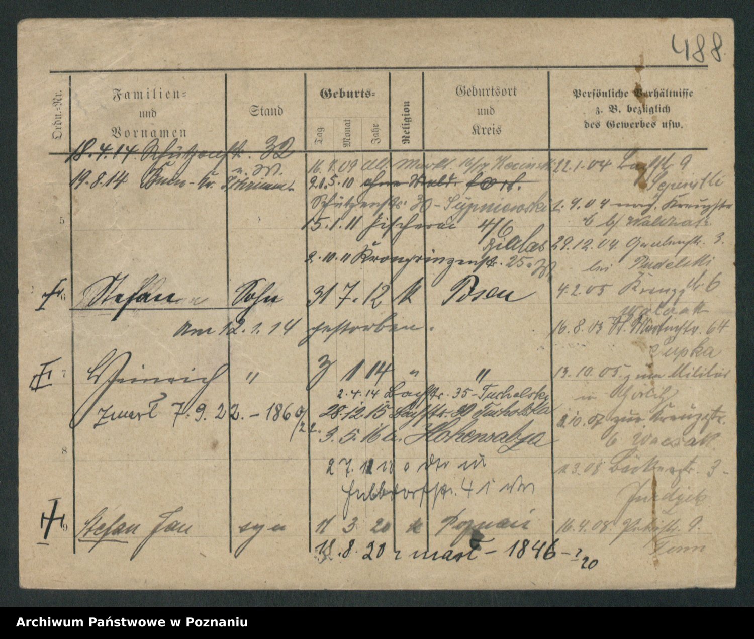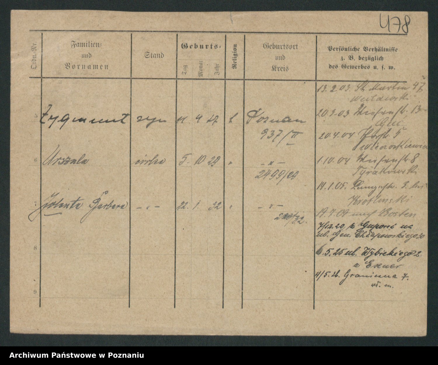 Podgląd karty osobowej dostępny jest po kliknięciu na nazwisko lub ikonkę karty. Można dokonywać powiększenia (ikony na górze) lub przechodzić między kolejnymi skanami (strzałki po bokach).