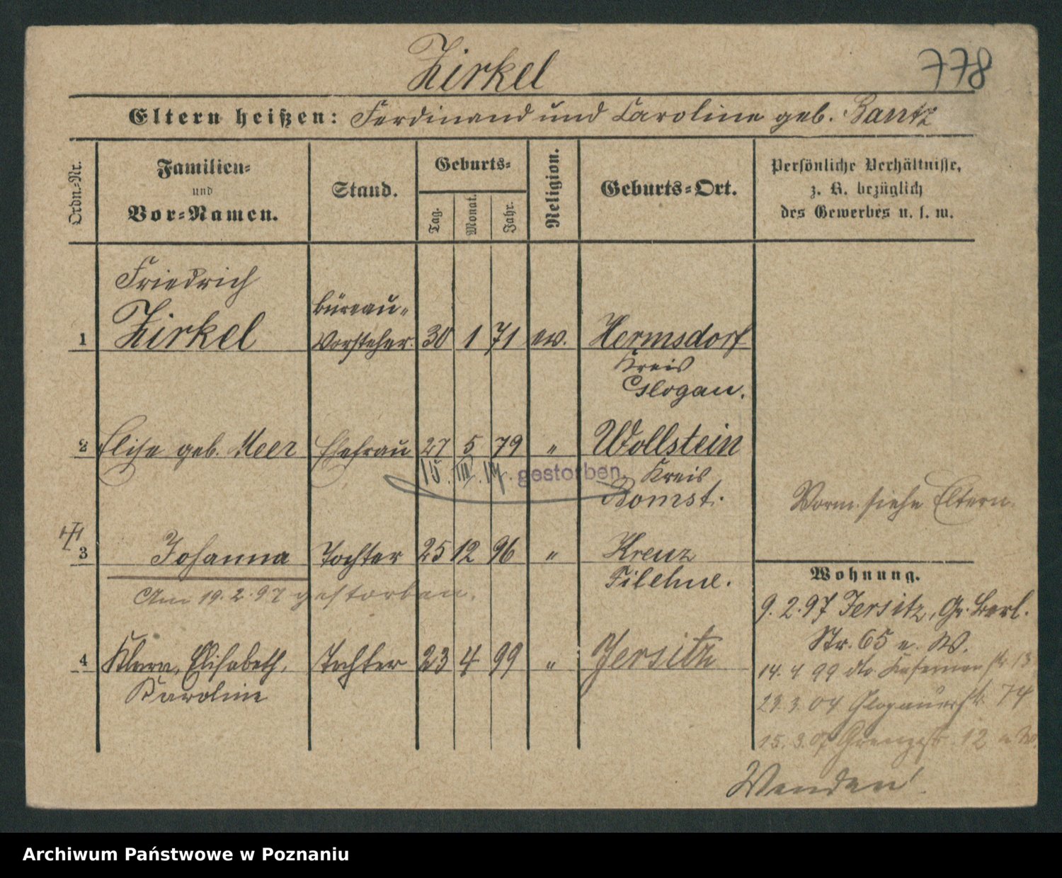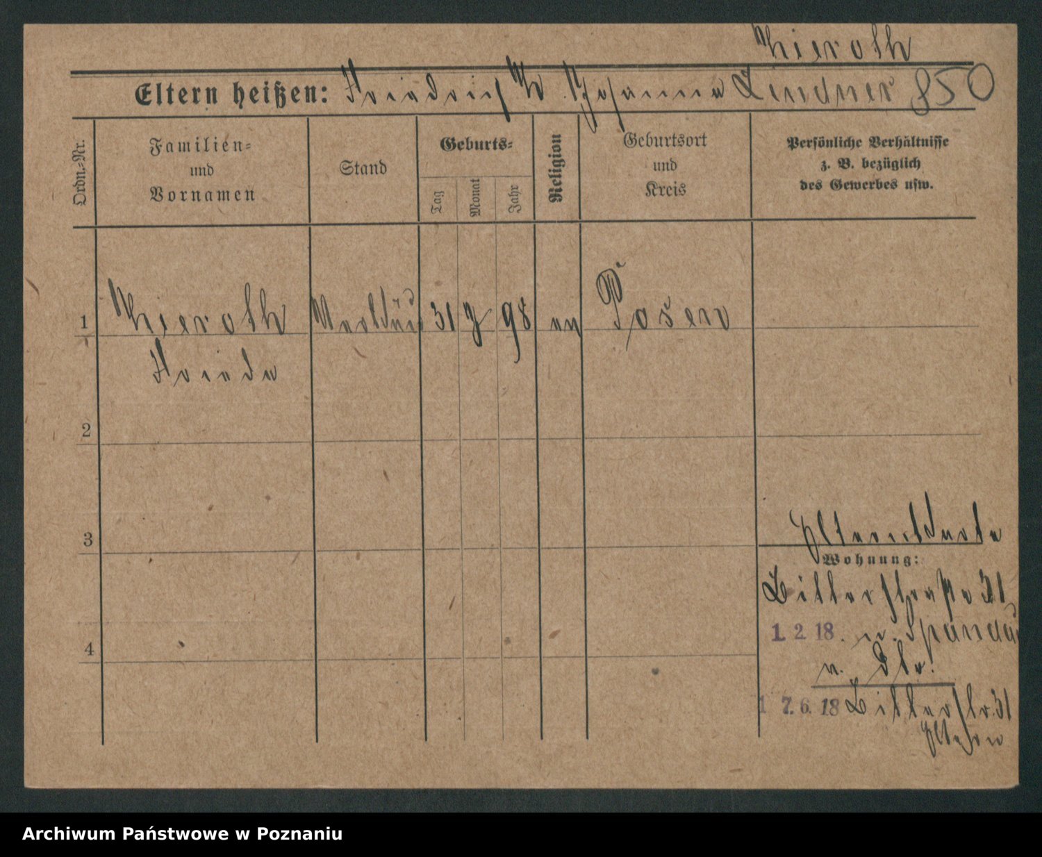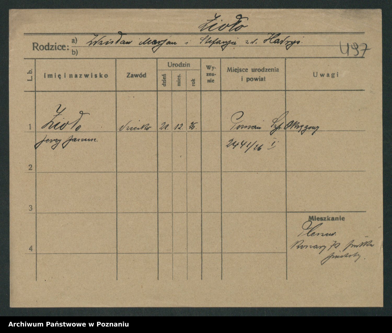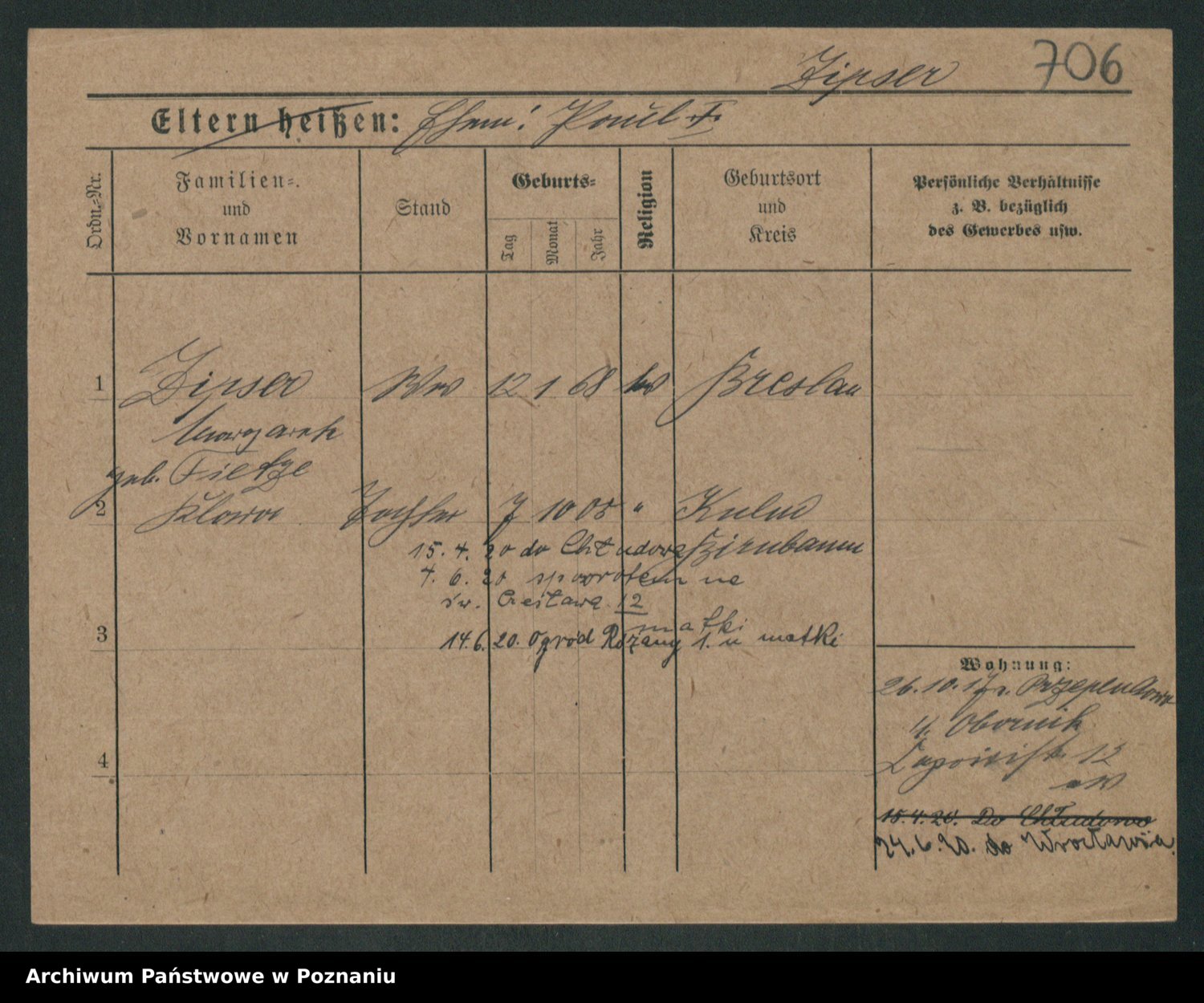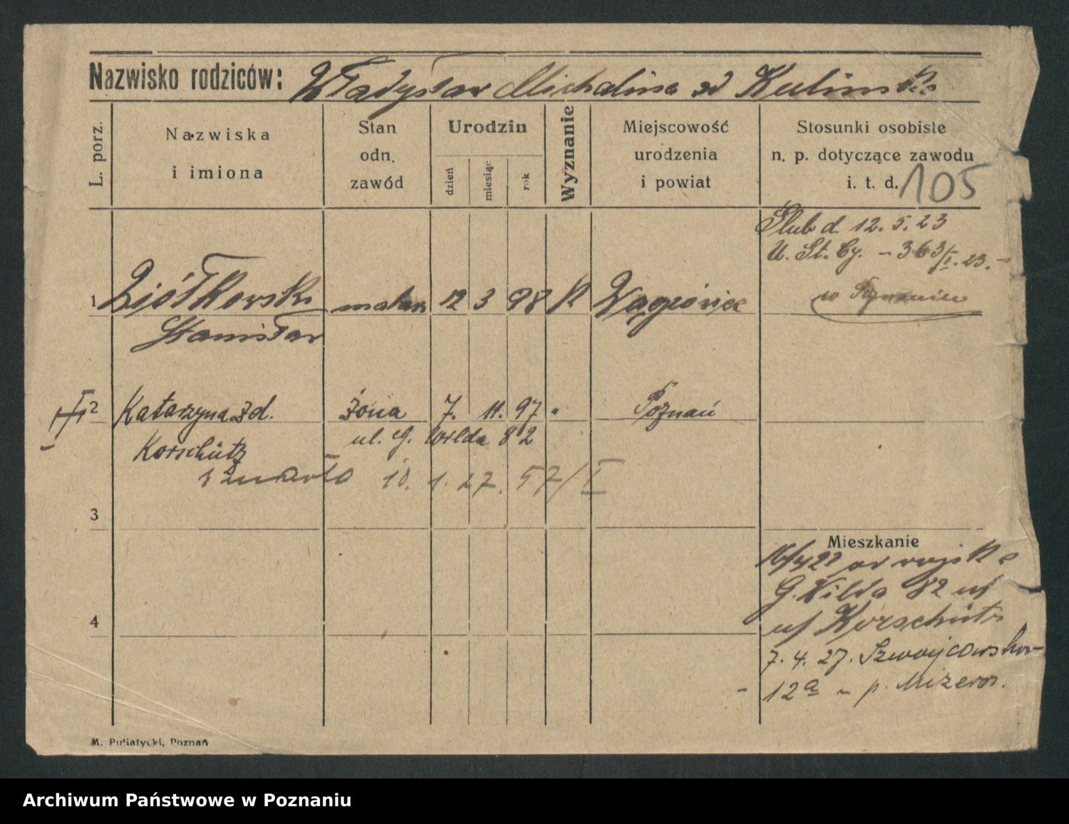 Podgląd karty osobowej dostępny jest po kliknięciu na nazwisko lub ikonkę karty. Można dokonywać powiększenia (ikony na górze) lub przechodzić między kolejnymi skanami (strzałki po bokach).