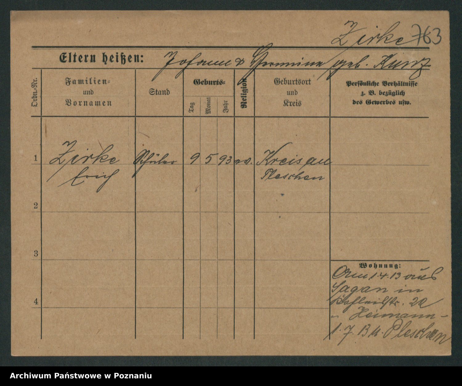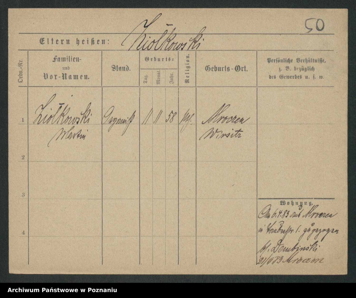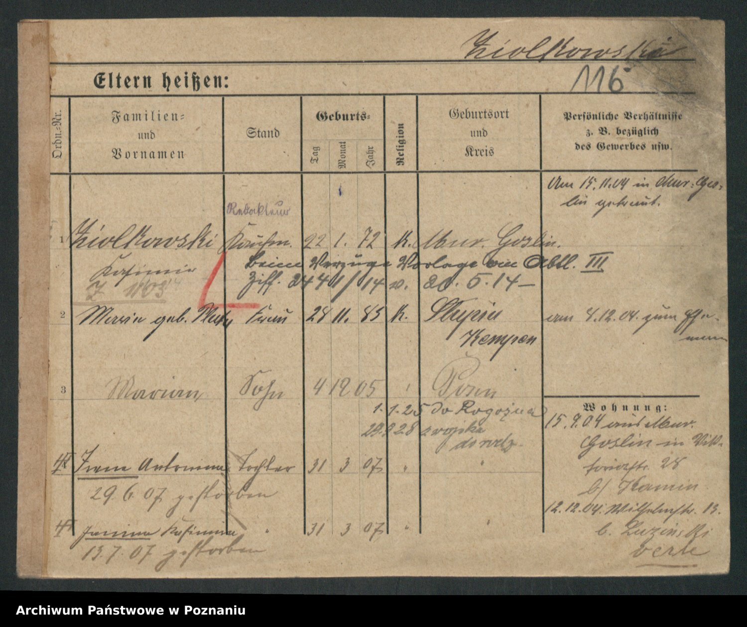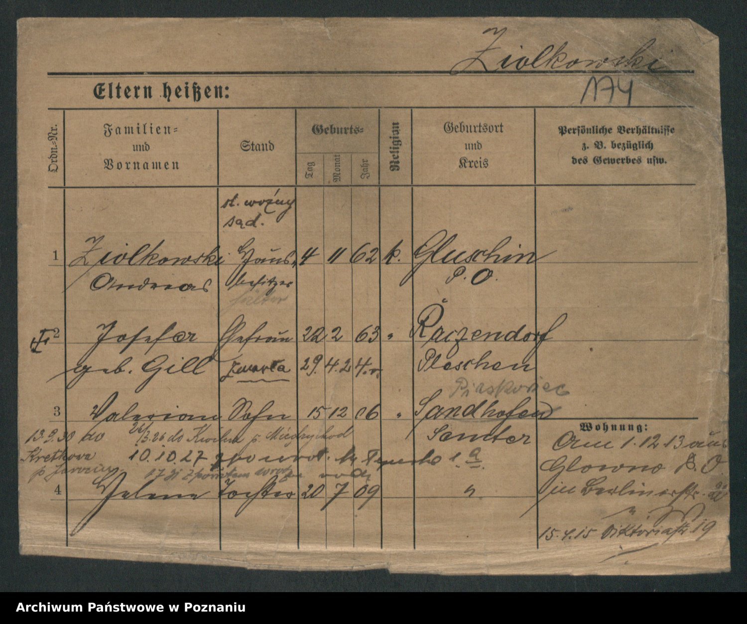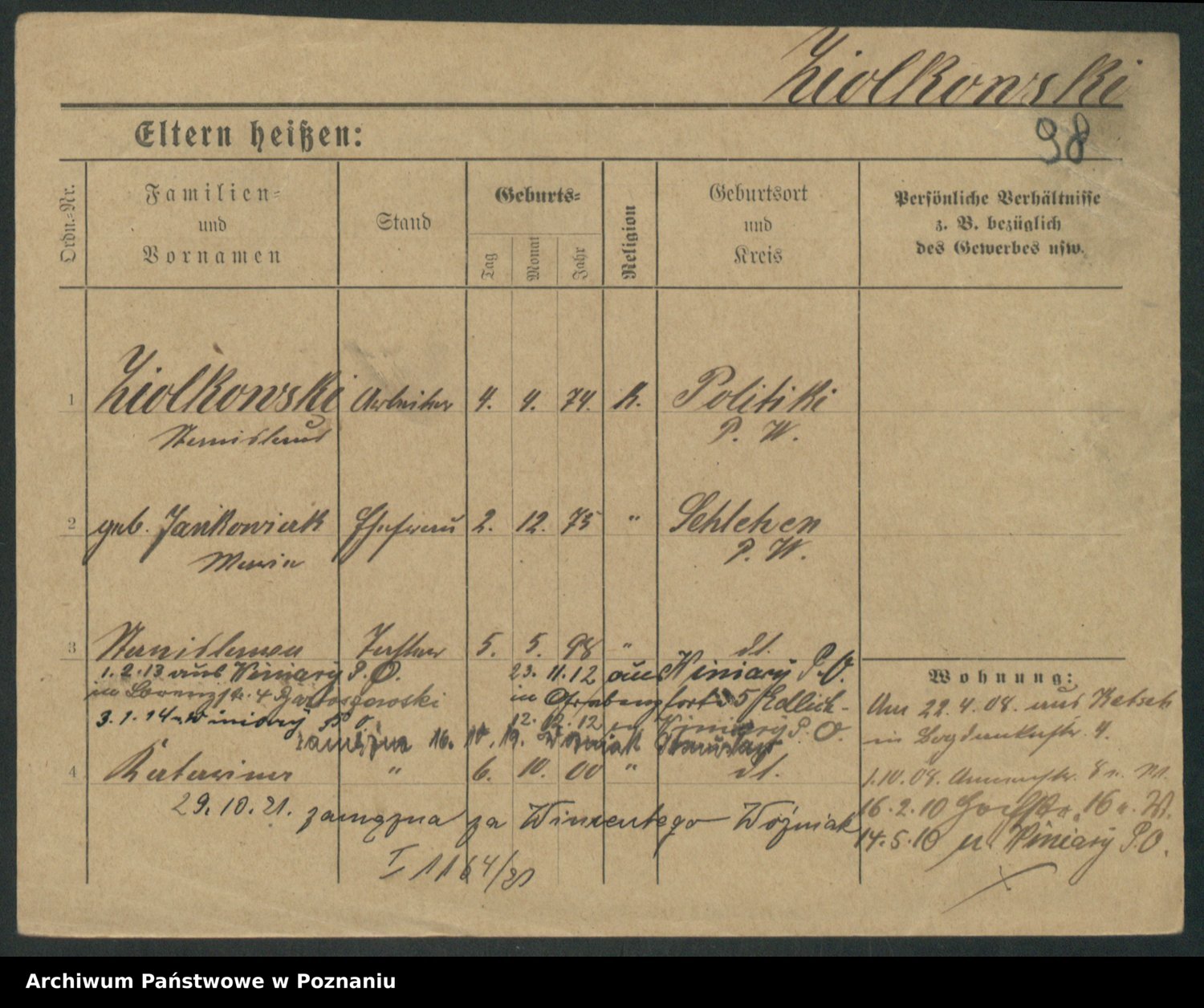Podgląd karty osobowej dostępny jest po kliknięciu na nazwisko lub ikonkę karty. Można dokonywać powiększenia (ikony na górze) lub przechodzić między kolejnymi skanami (strzałki po bokach).