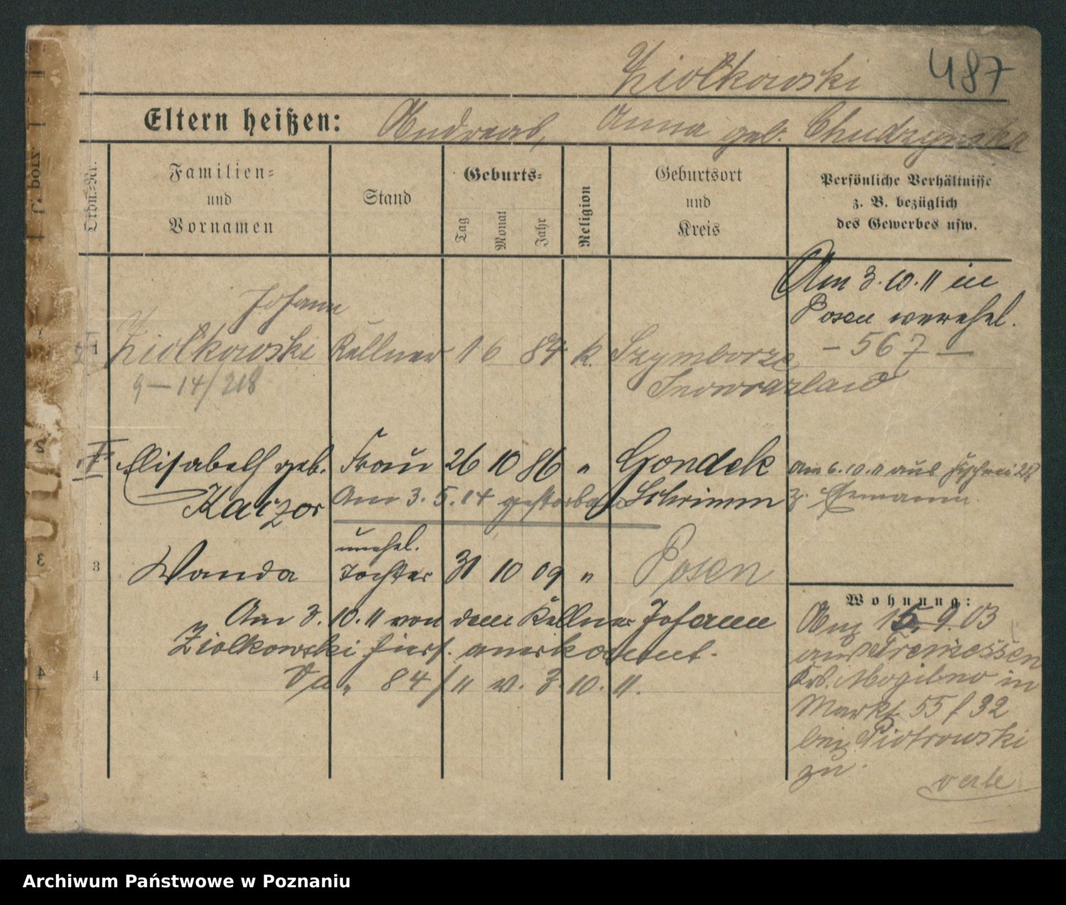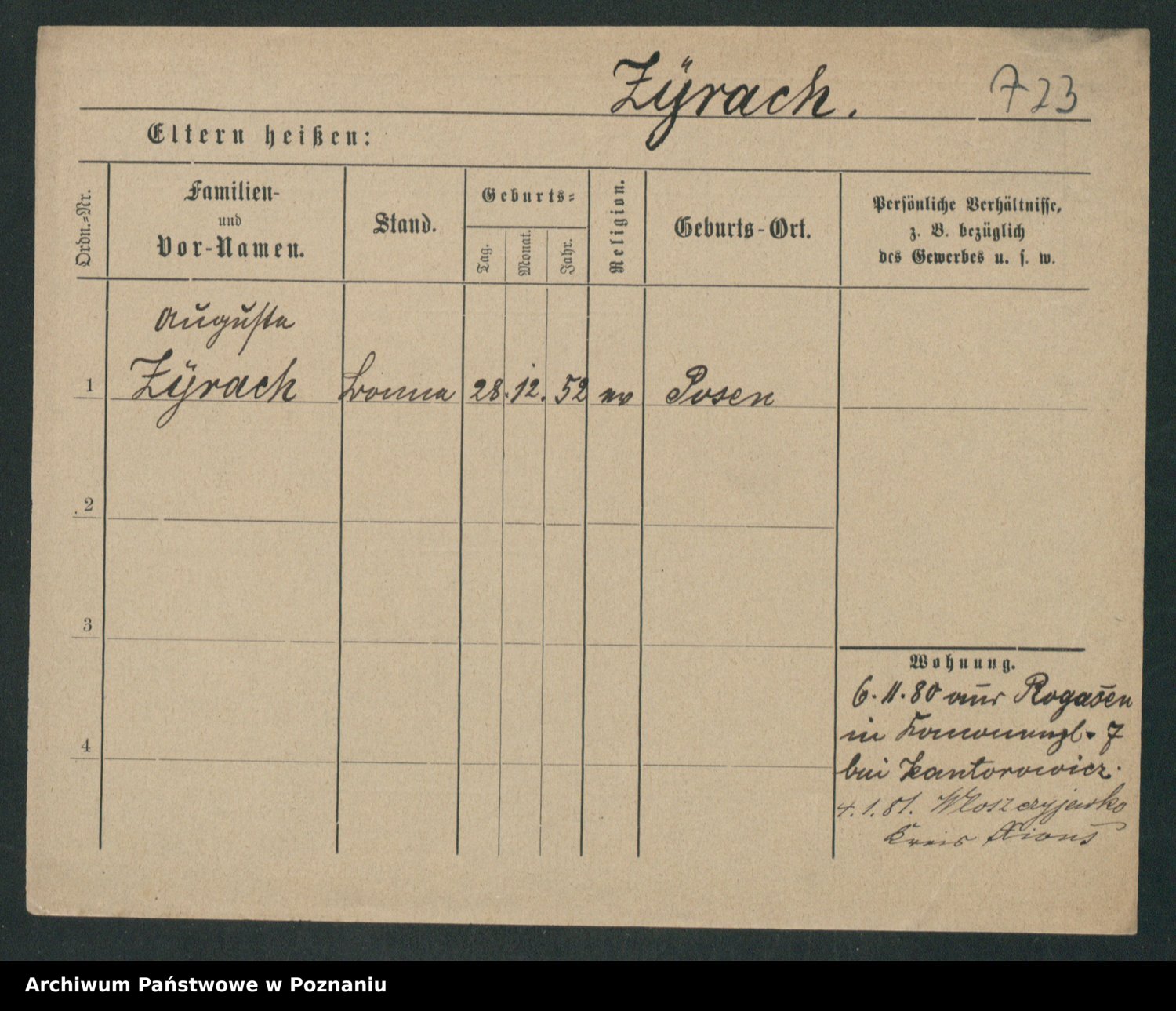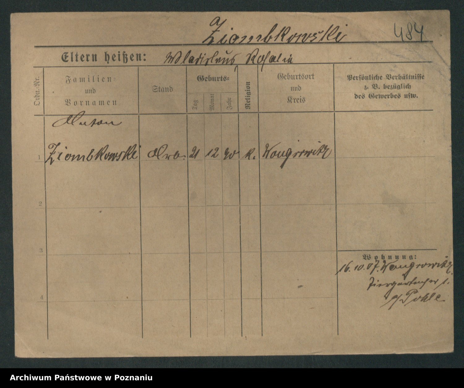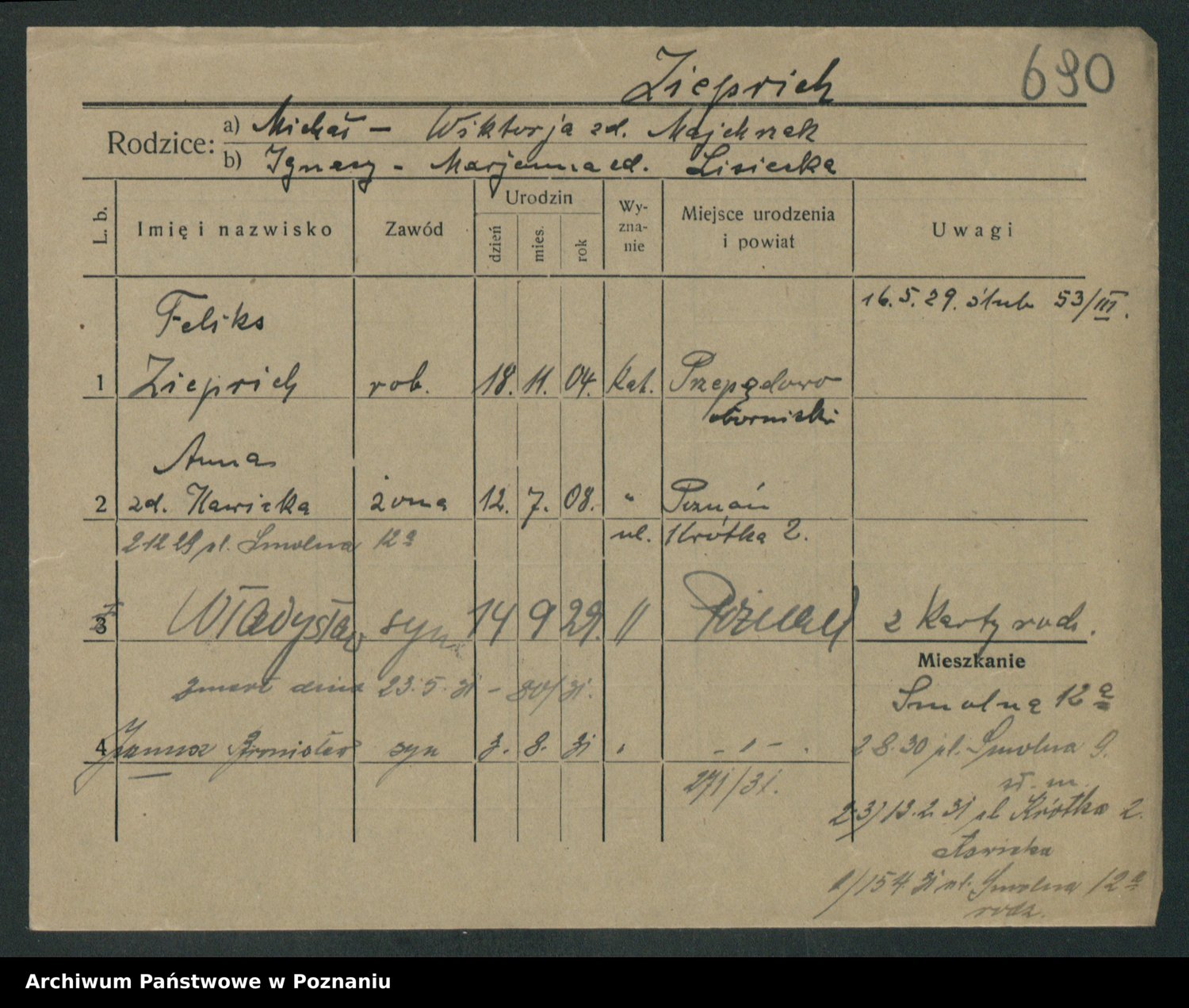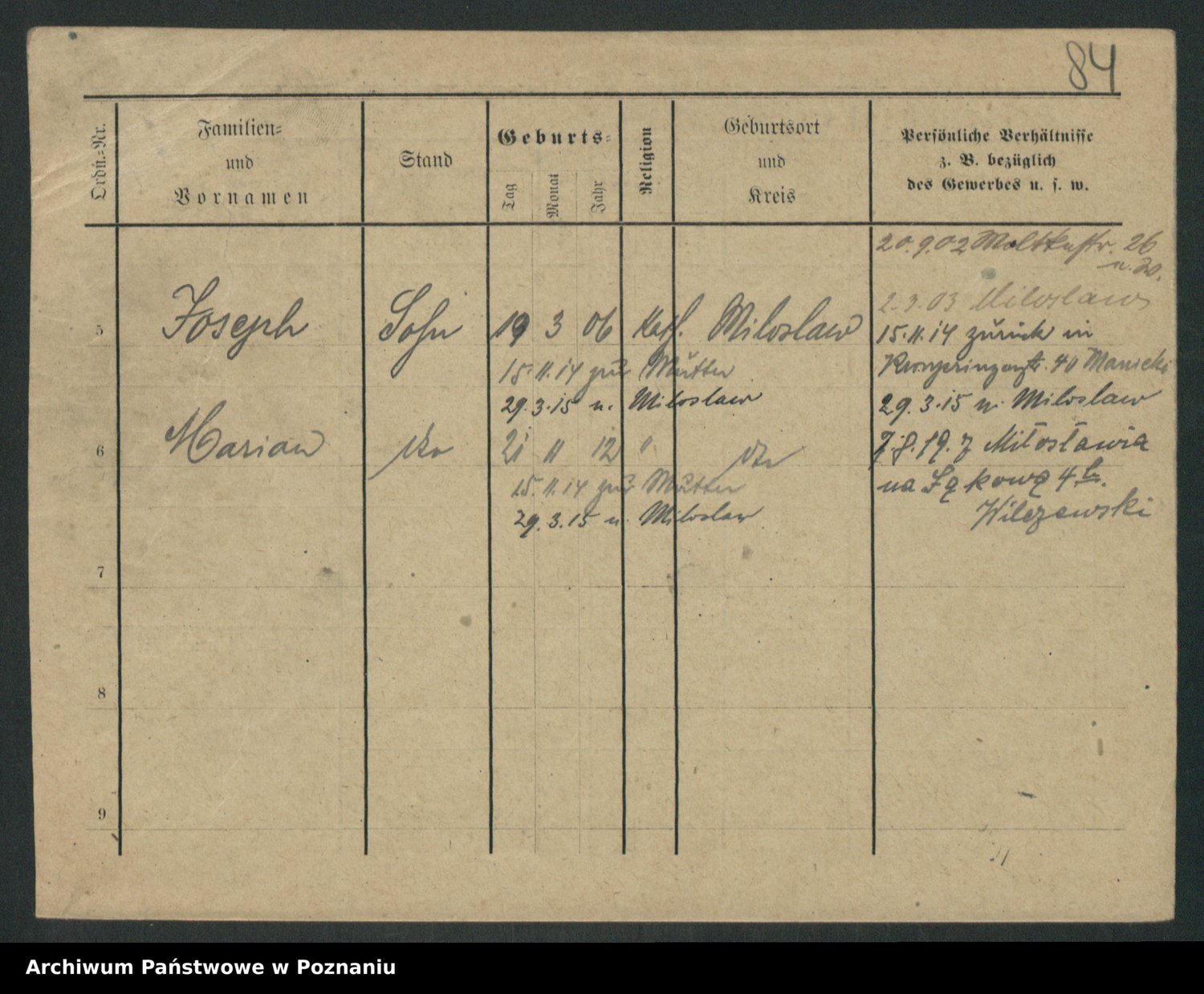 Podgląd karty osobowej dostępny jest po kliknięciu na nazwisko lub ikonkę karty. Można dokonywać powiększenia (ikony na górze) lub przechodzić między kolejnymi skanami (strzałki po bokach).