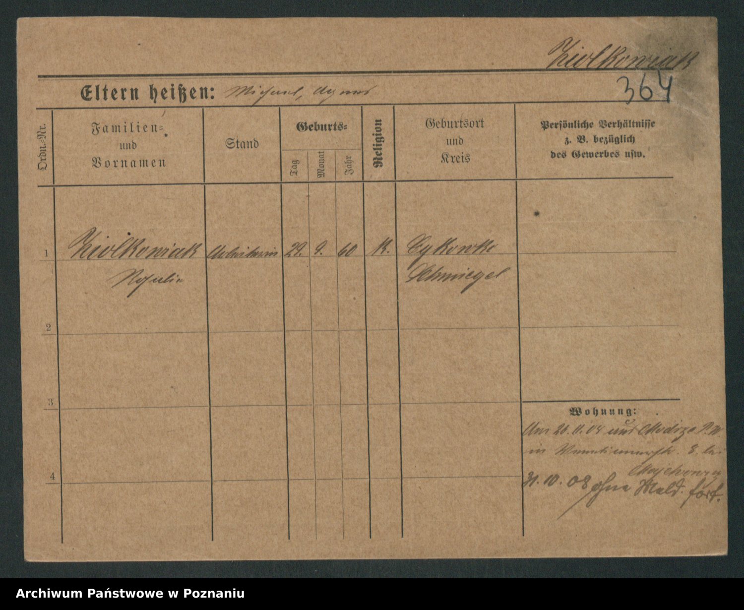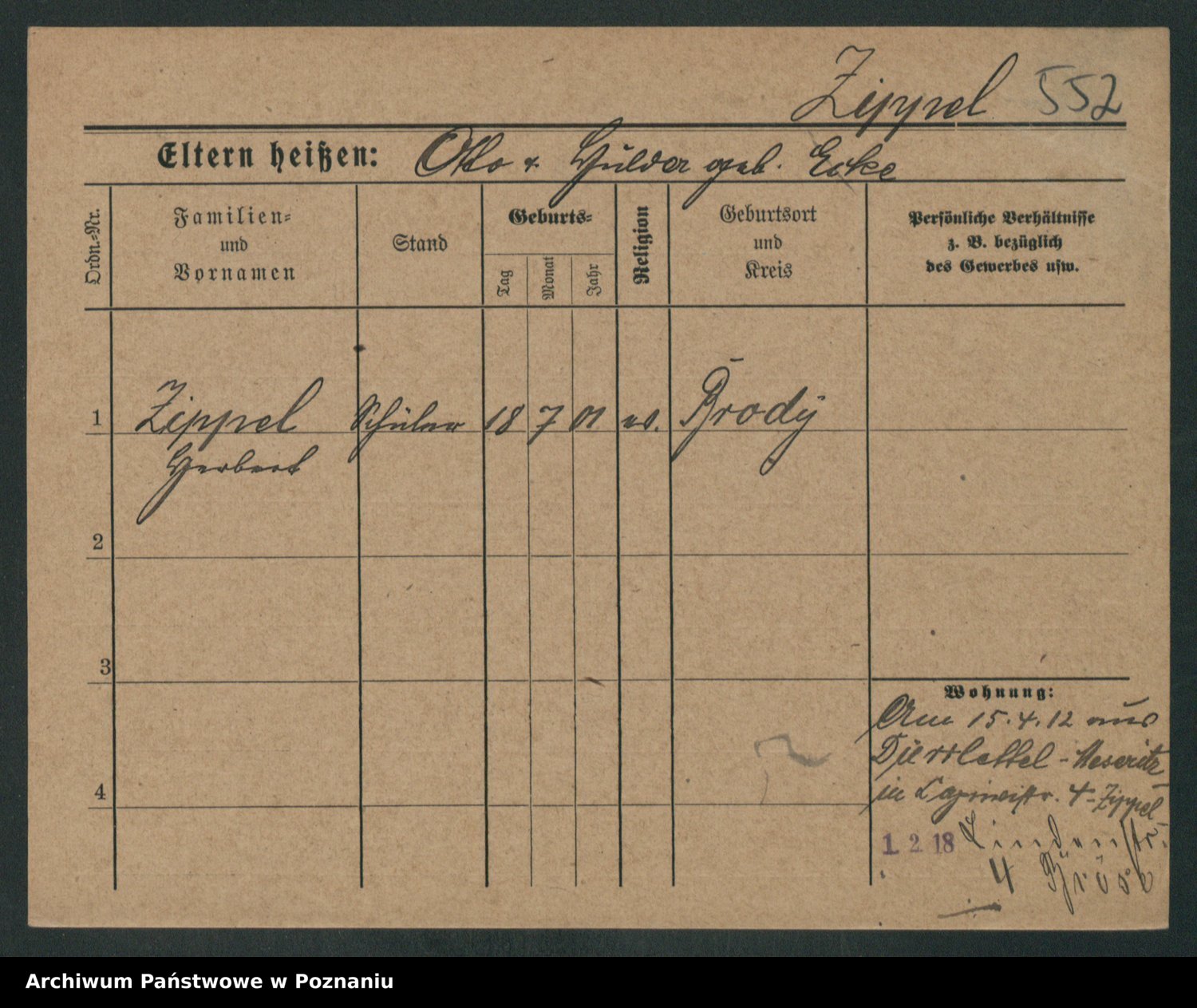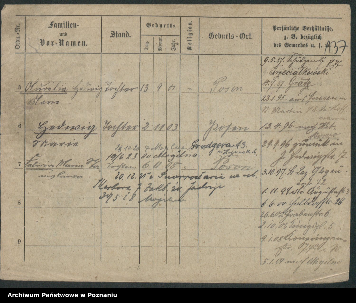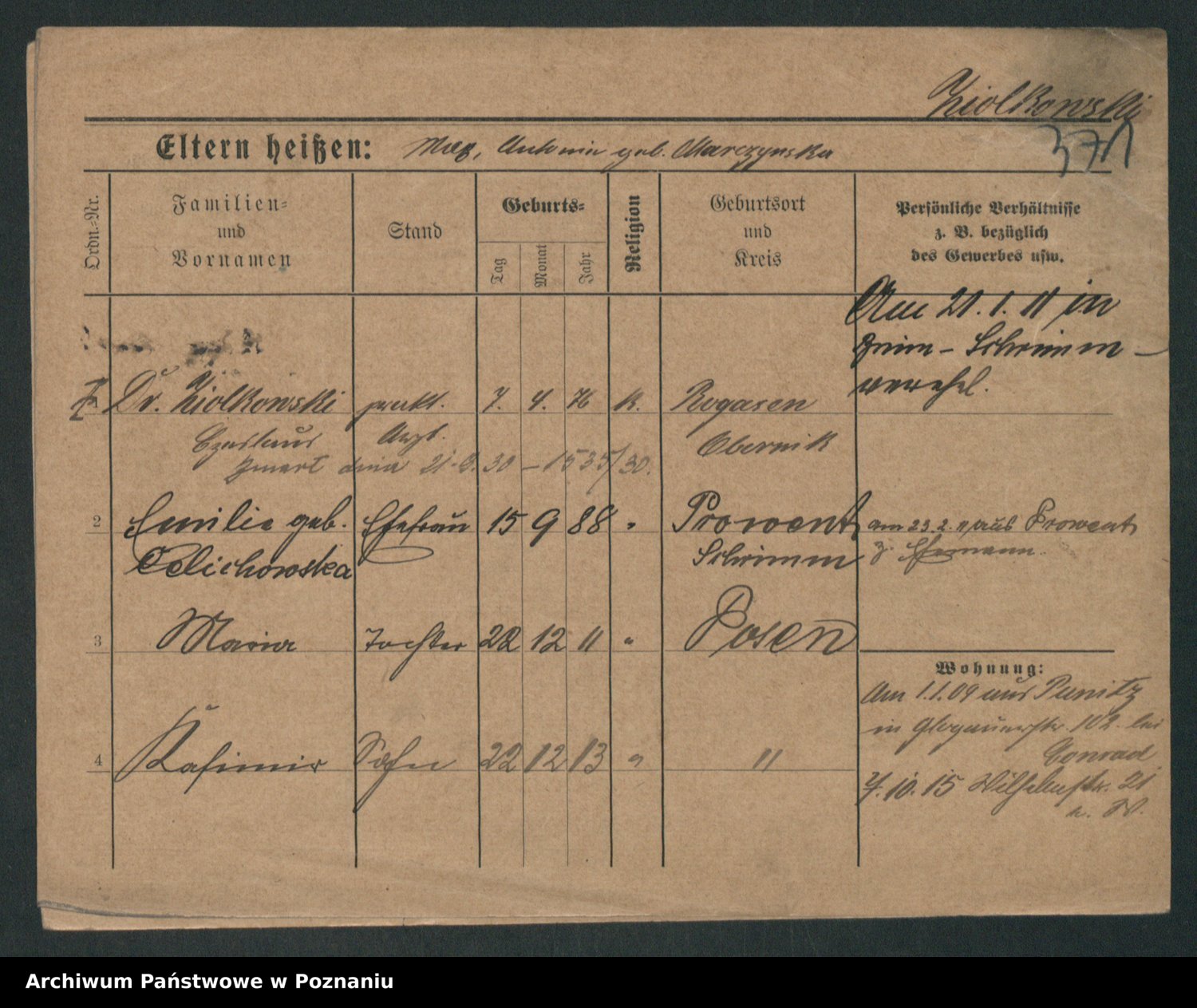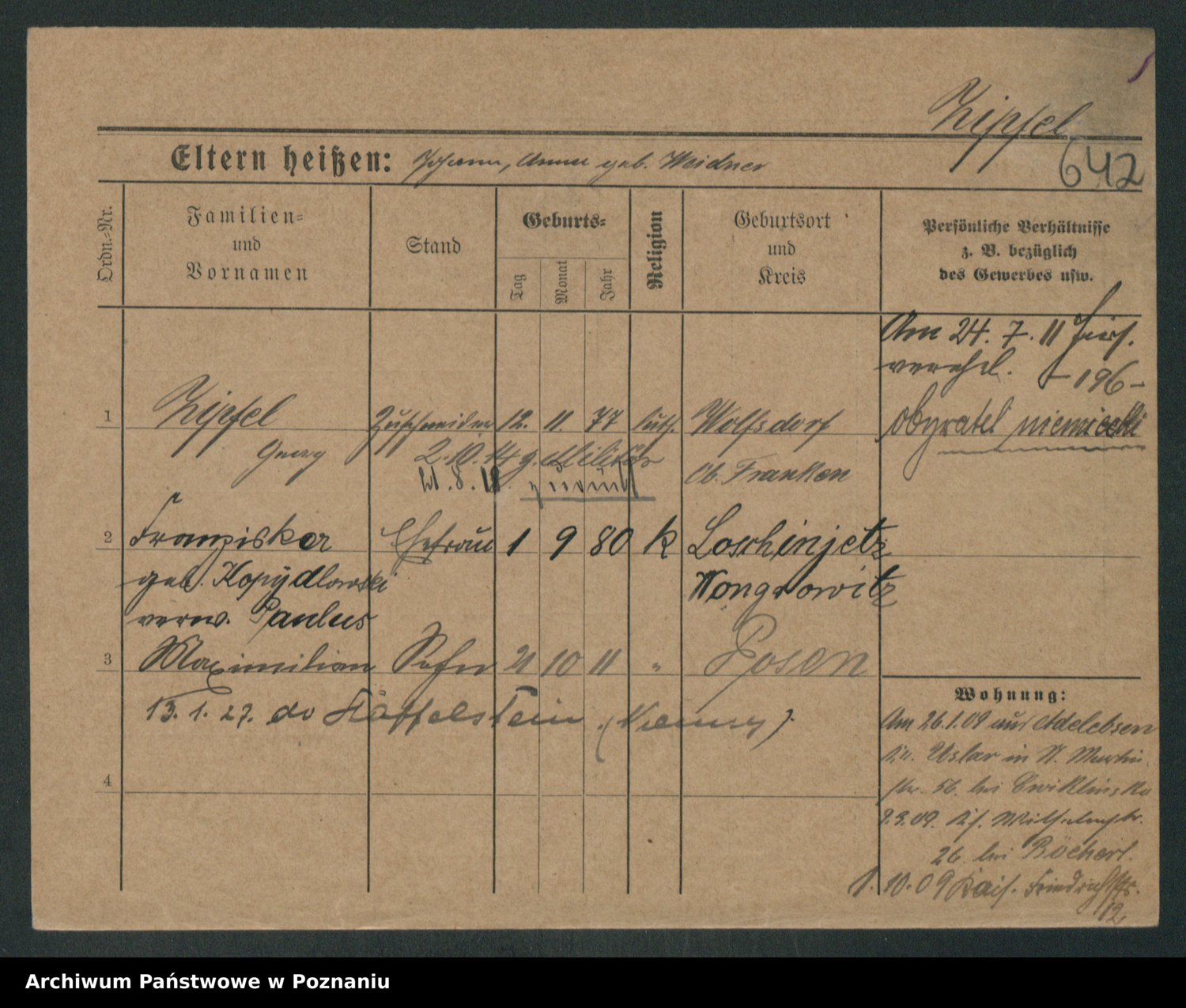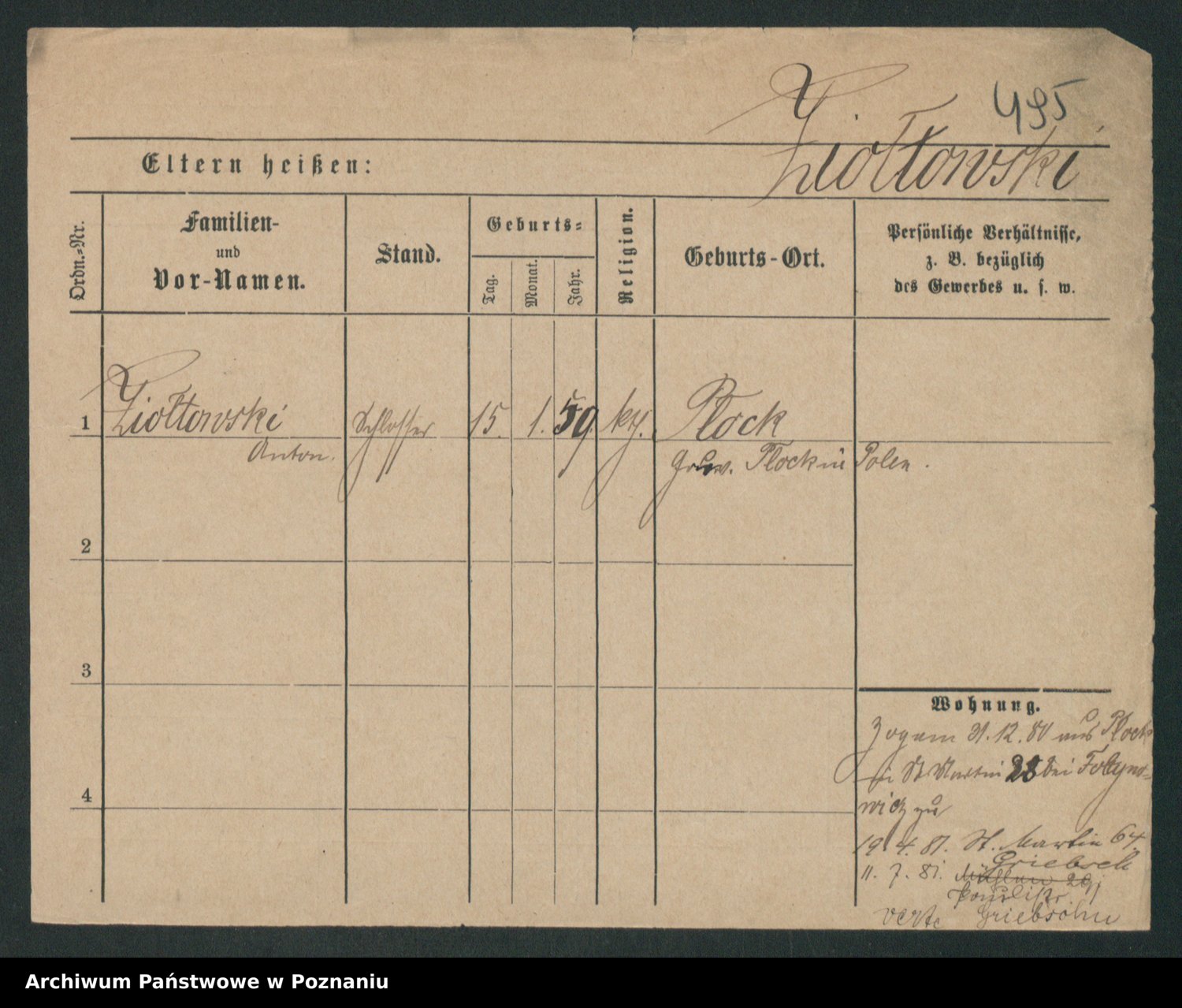 Podgląd karty osobowej dostępny jest po kliknięciu na nazwisko lub ikonkę karty. Można dokonywać powiększenia (ikony na górze) lub przechodzić między kolejnymi skanami (strzałki po bokach).