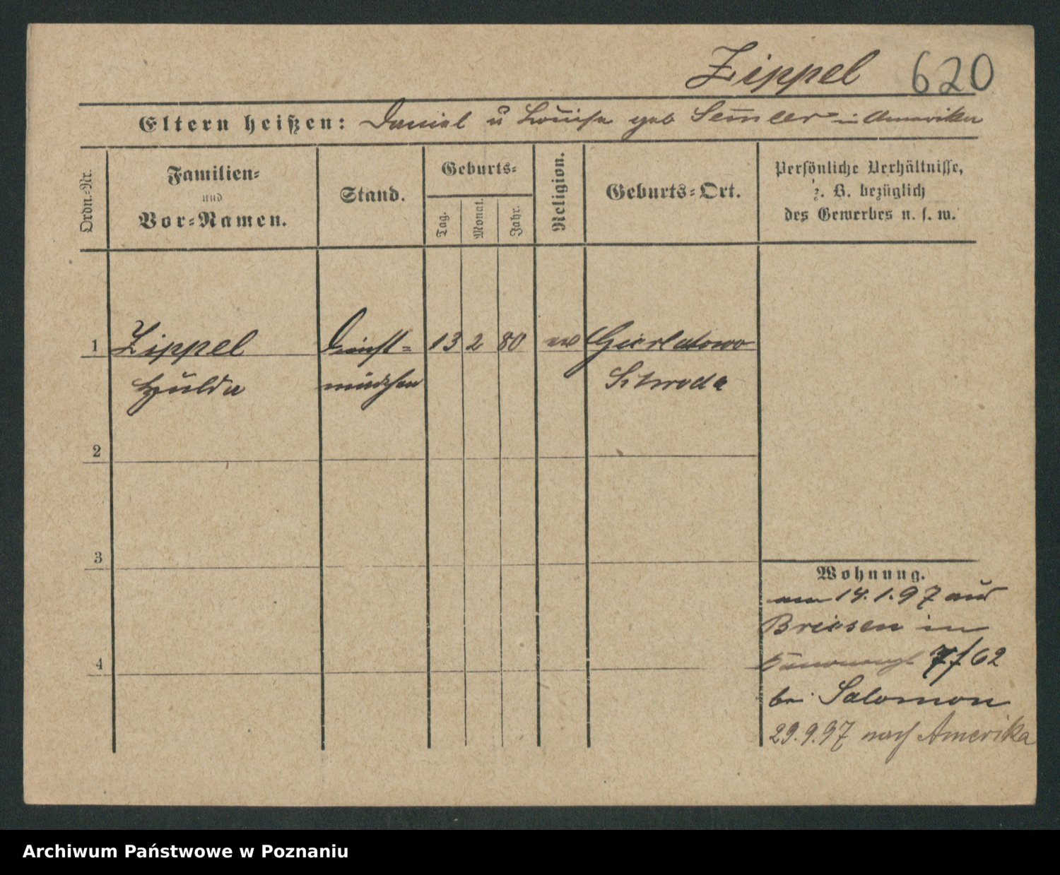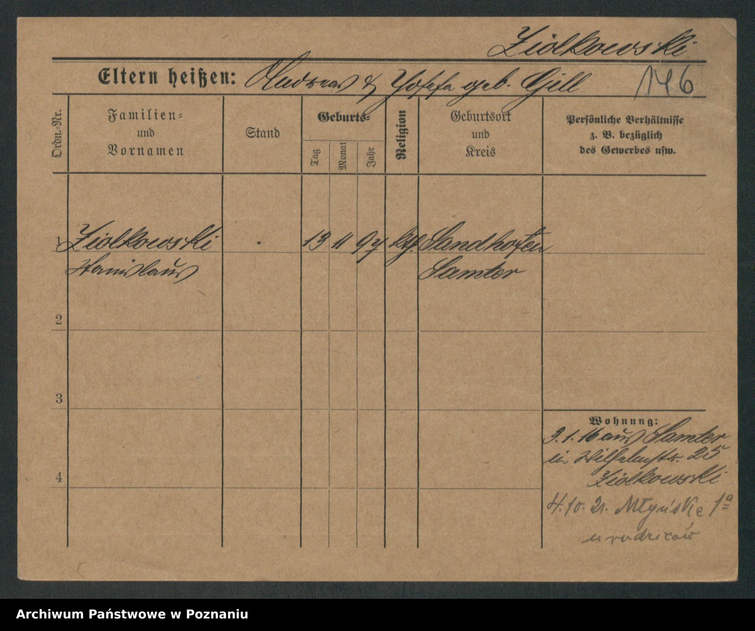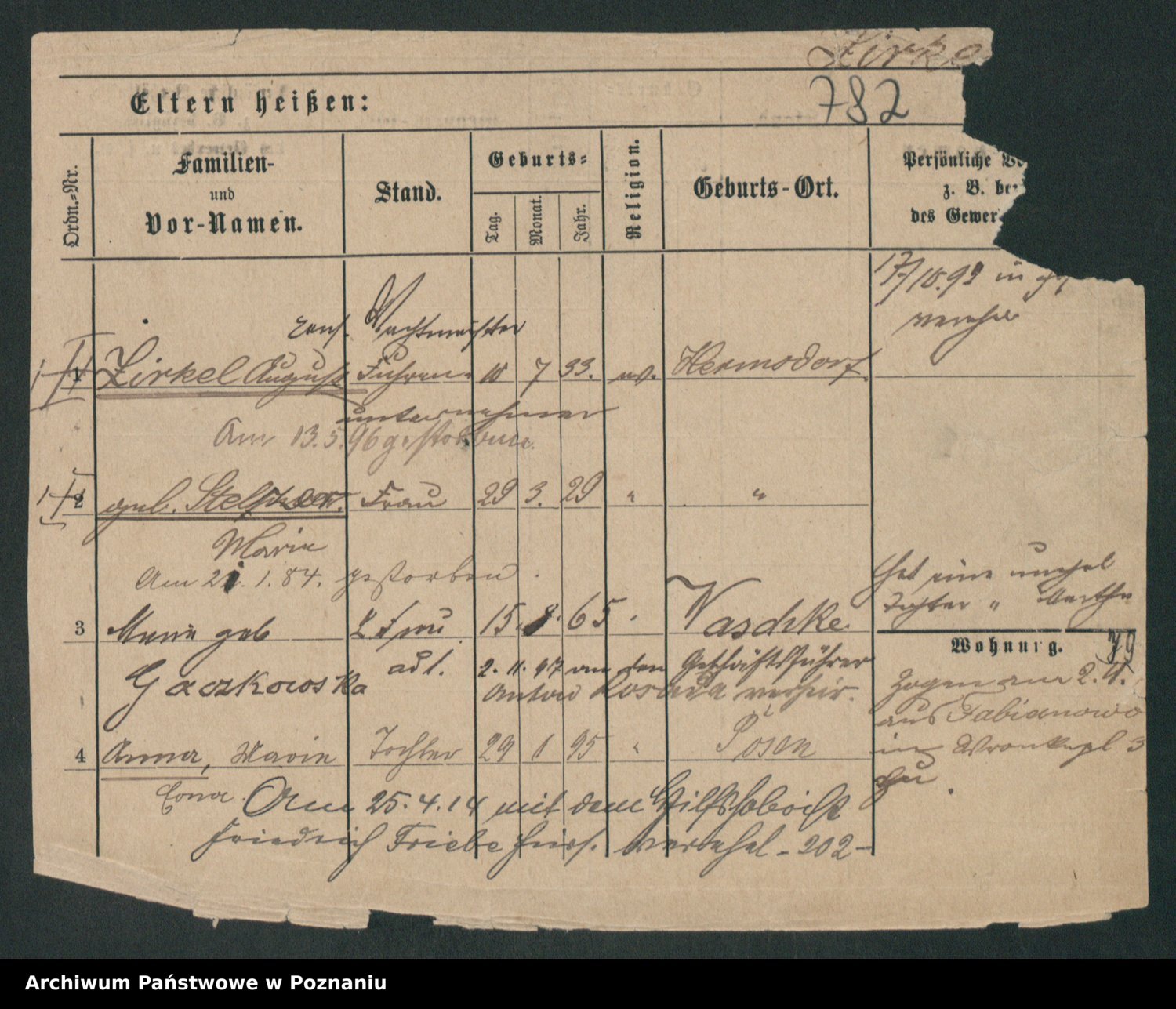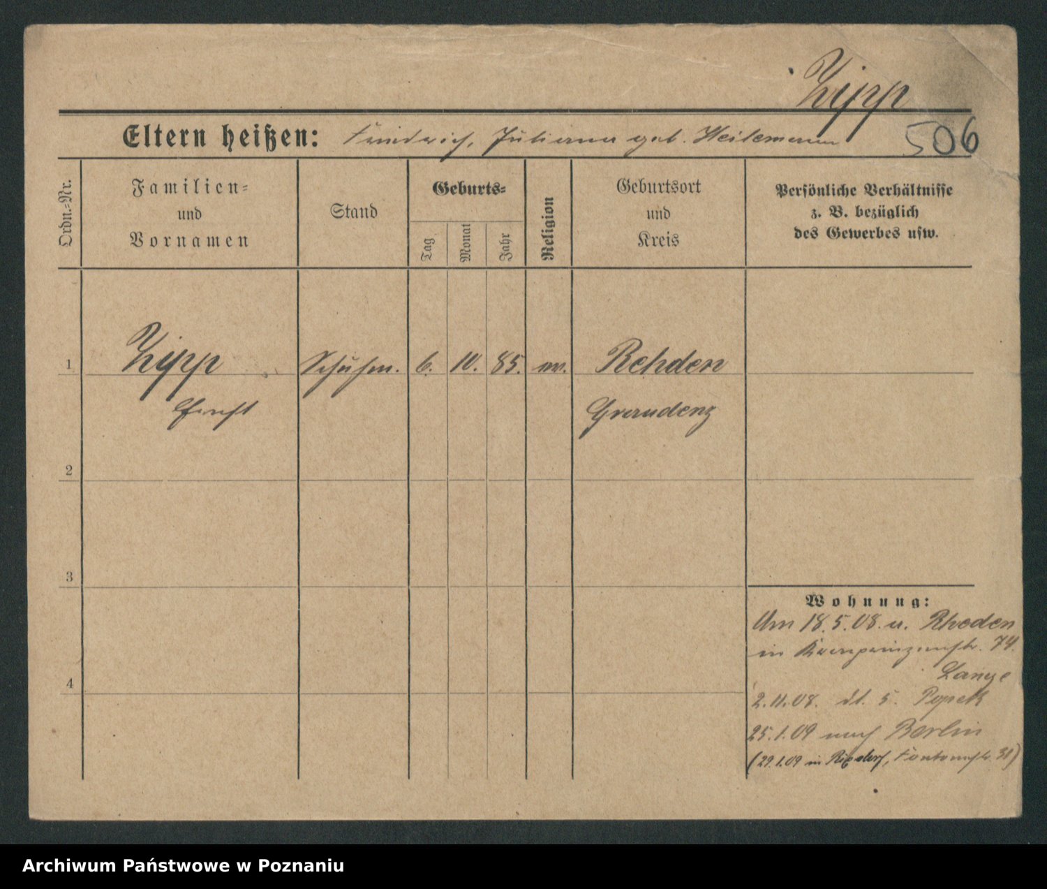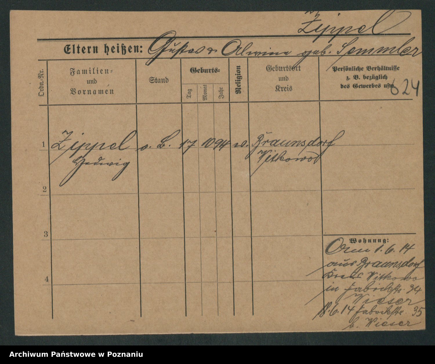 Podgląd karty osobowej dostępny jest po kliknięciu na nazwisko lub ikonkę karty. Można dokonywać powiększenia (ikony na górze) lub przechodzić między kolejnymi skanami (strzałki po bokach).
