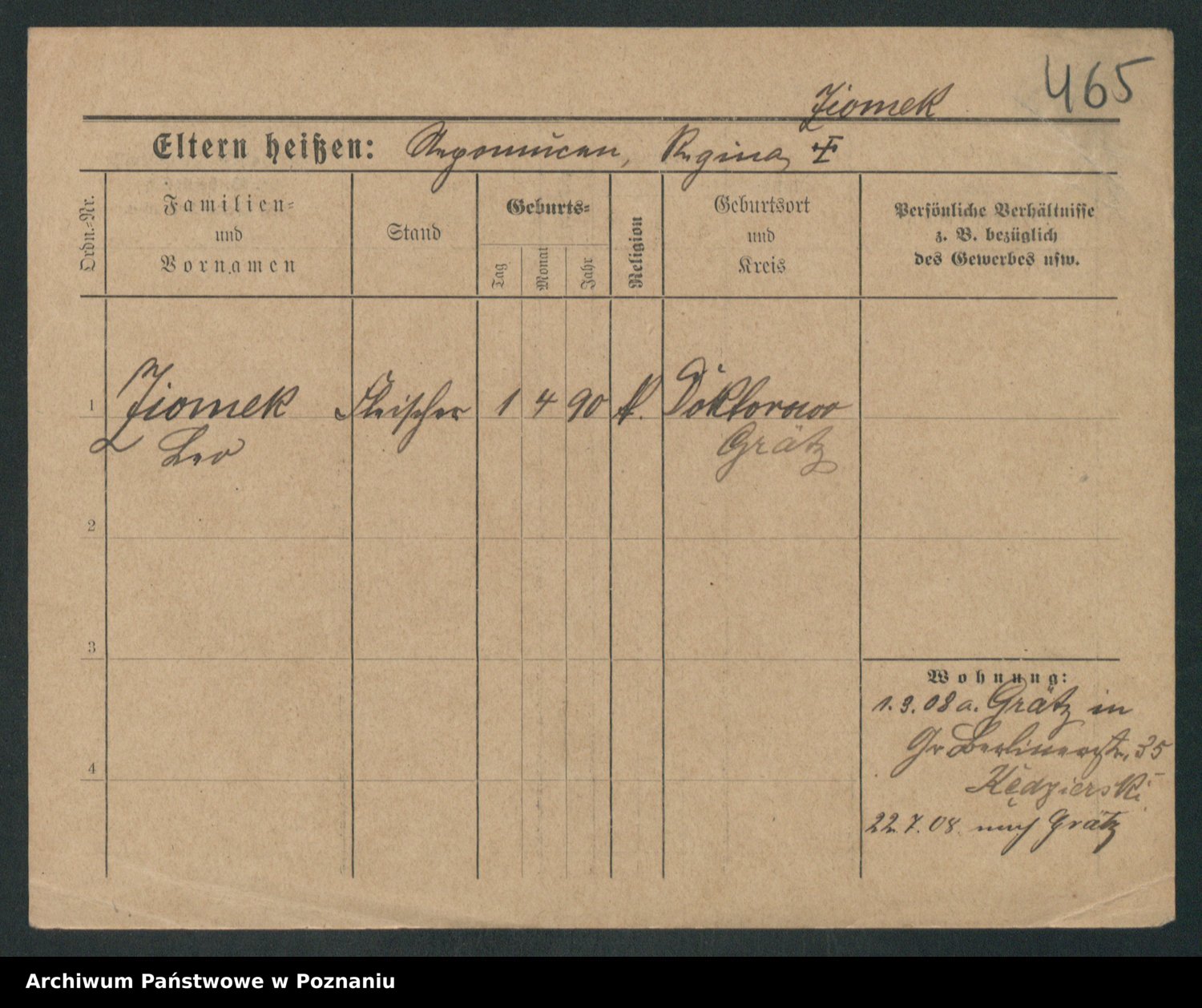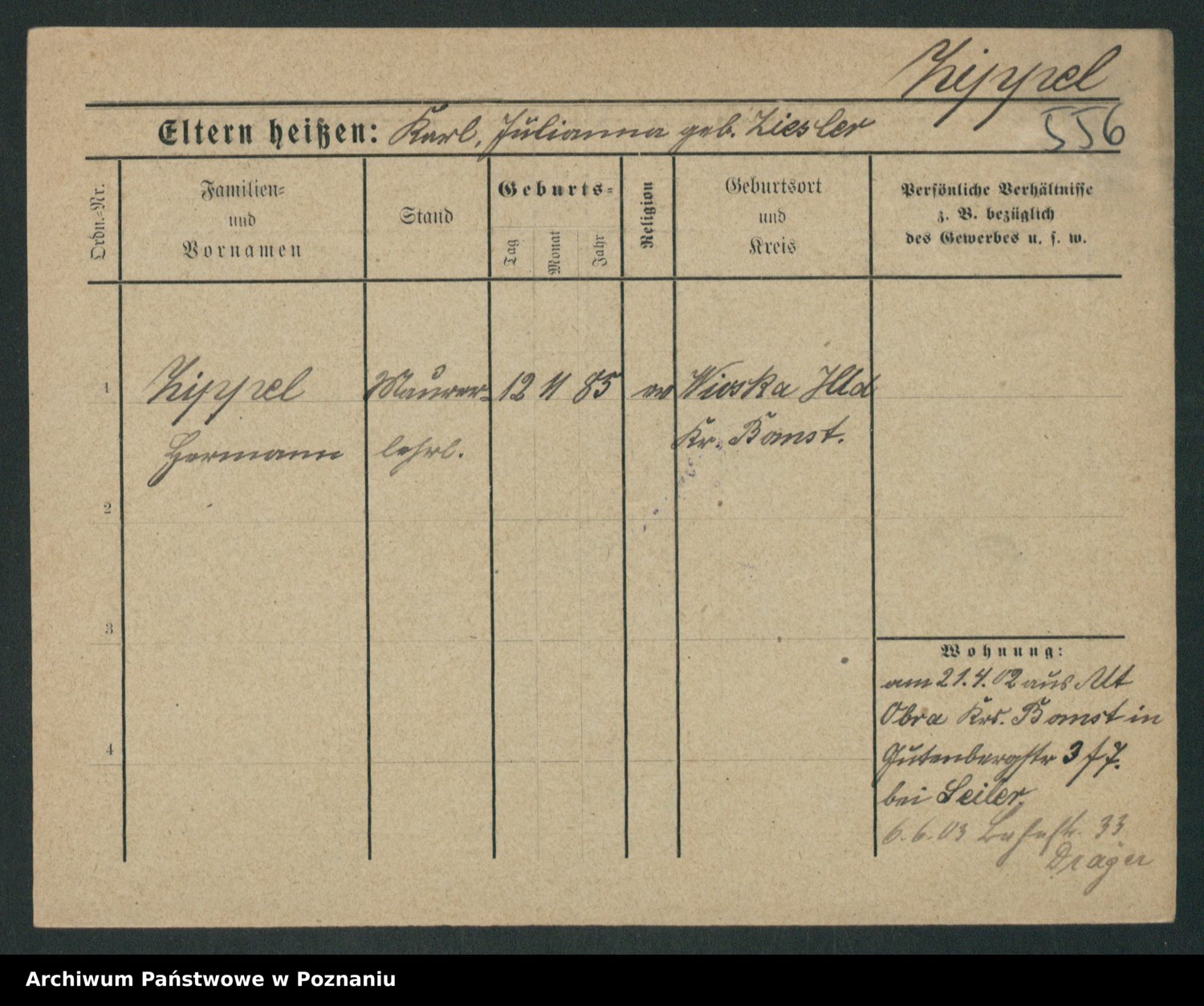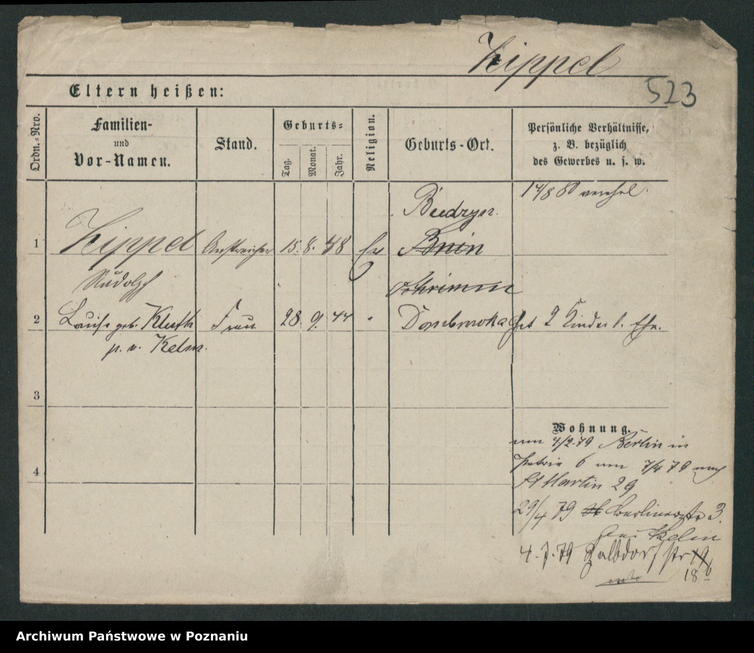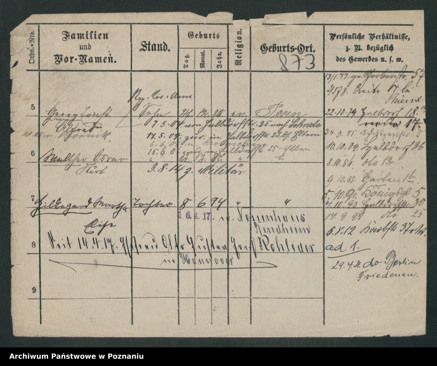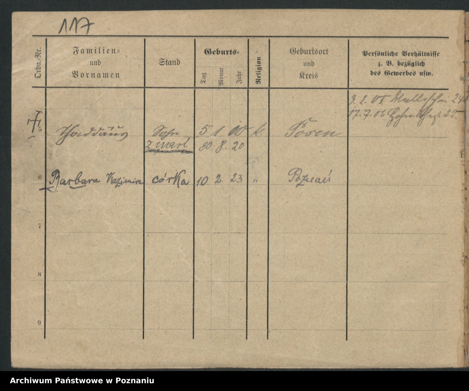 Podgląd karty osobowej dostępny jest po kliknięciu na nazwisko lub ikonkę karty. Można dokonywać powiększenia (ikony na górze) lub przechodzić między kolejnymi skanami (strzałki po bokach).