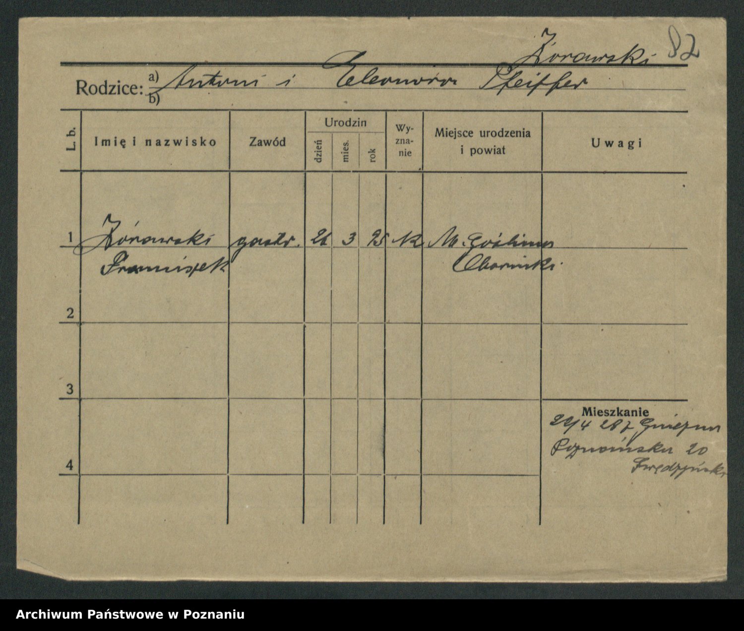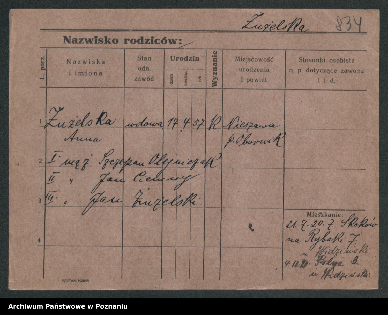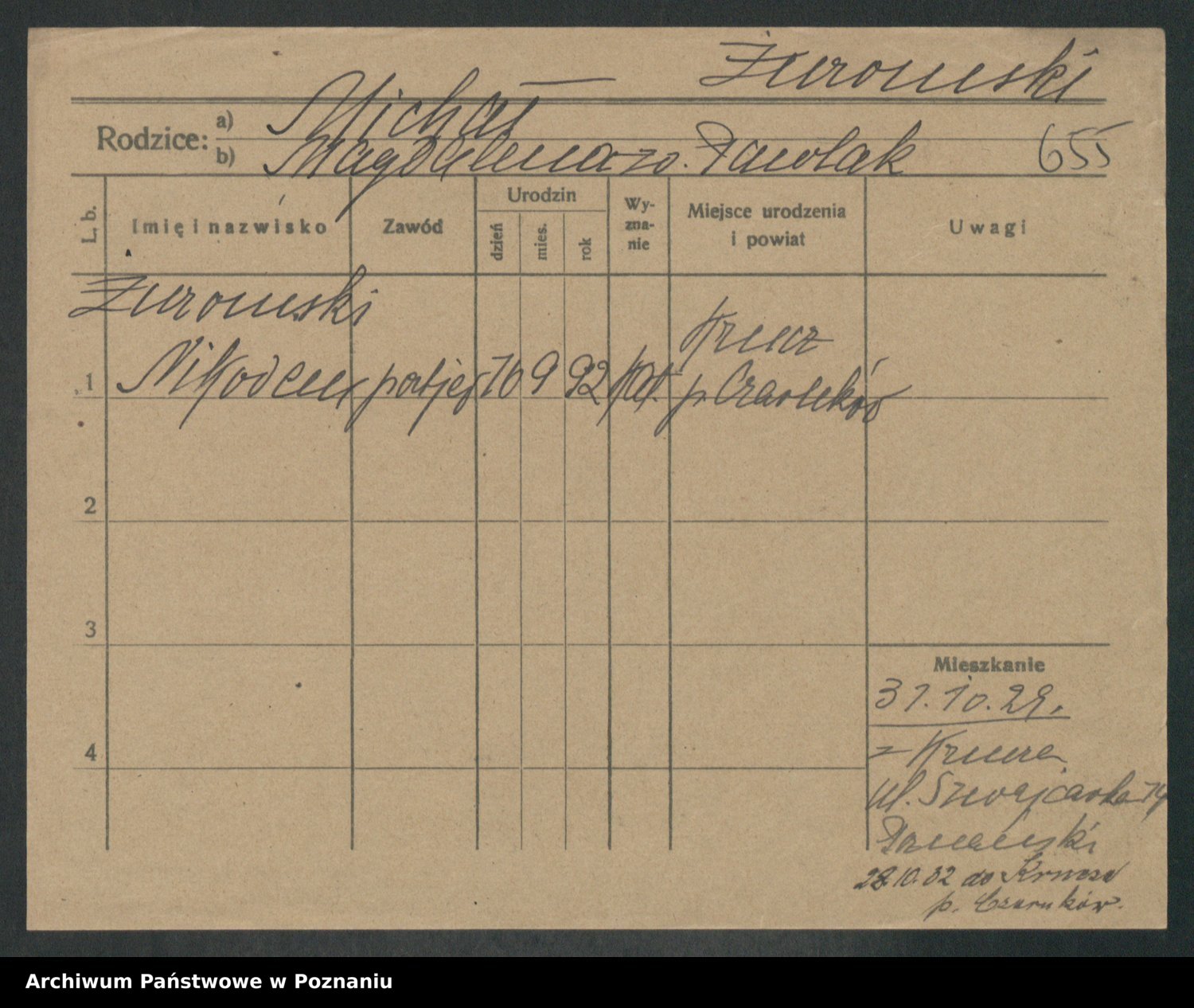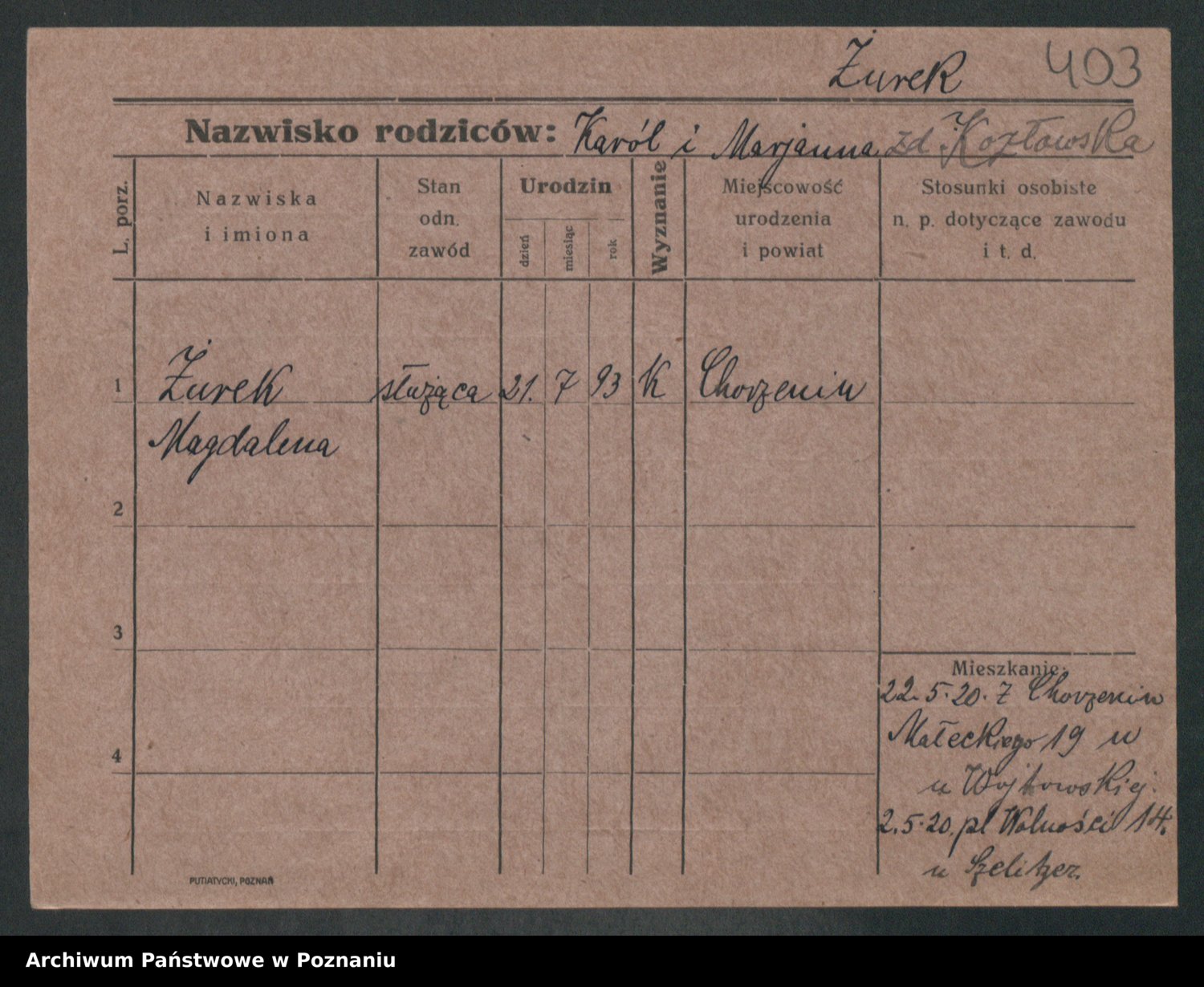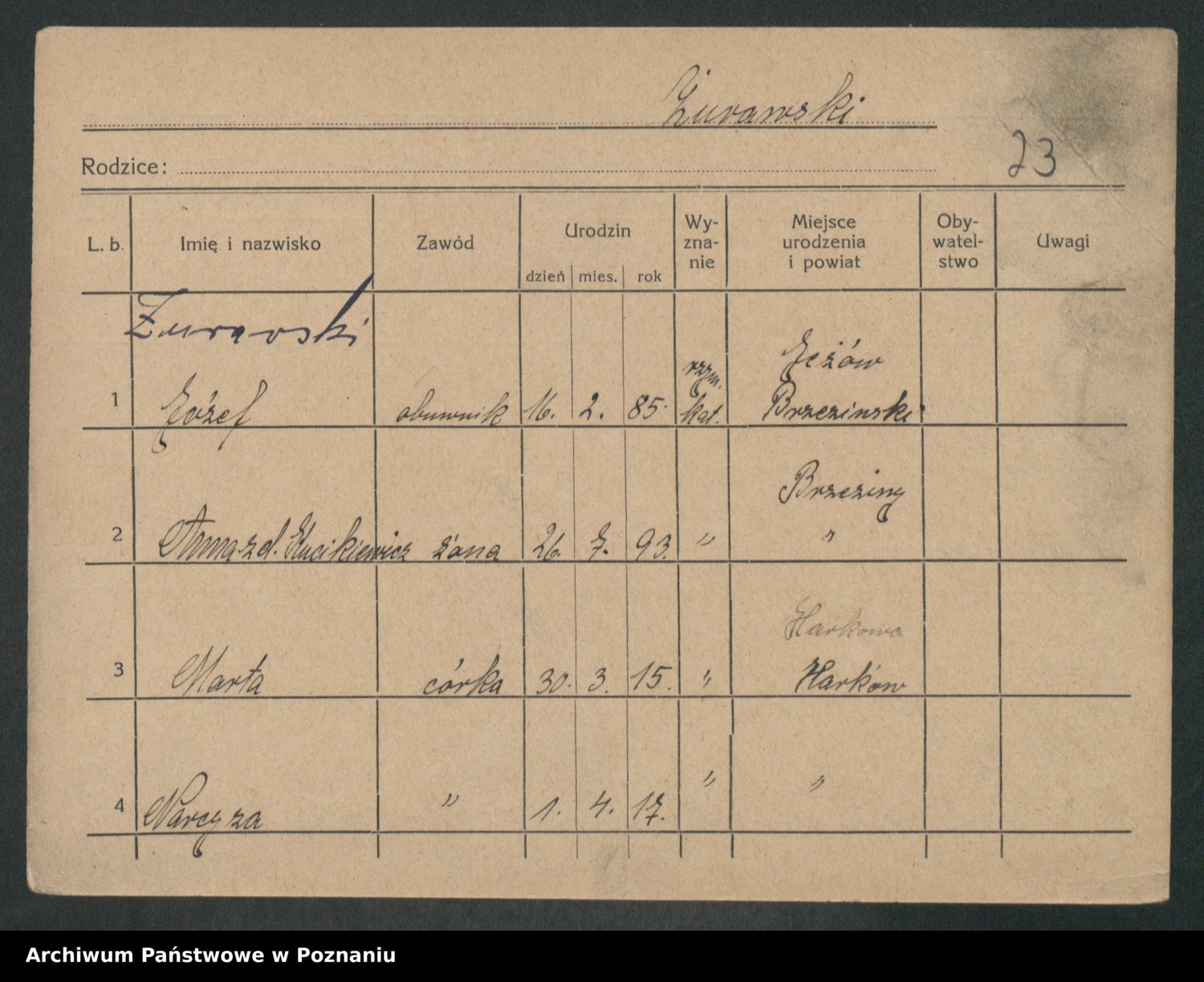 Podgląd karty osobowej dostępny jest po kliknięciu na nazwisko lub ikonkę karty. Można dokonywać powiększenia (ikony na górze) lub przechodzić między kolejnymi skanami (strzałki po bokach).
