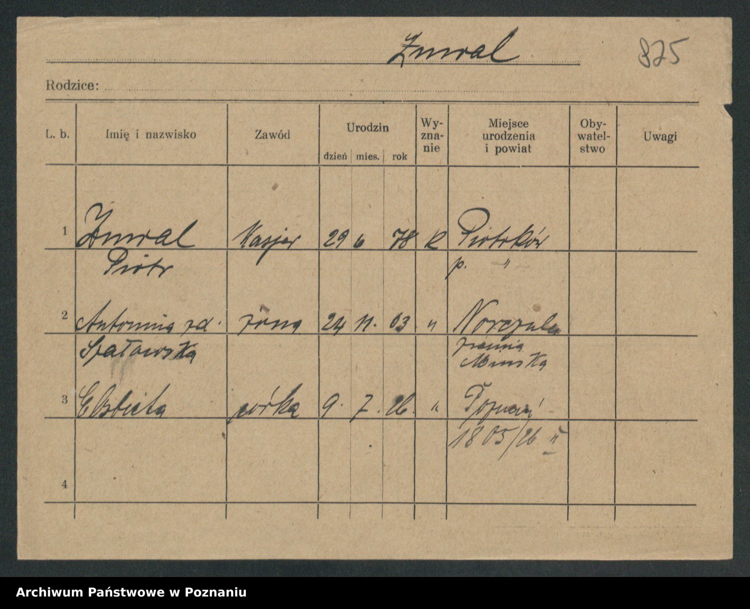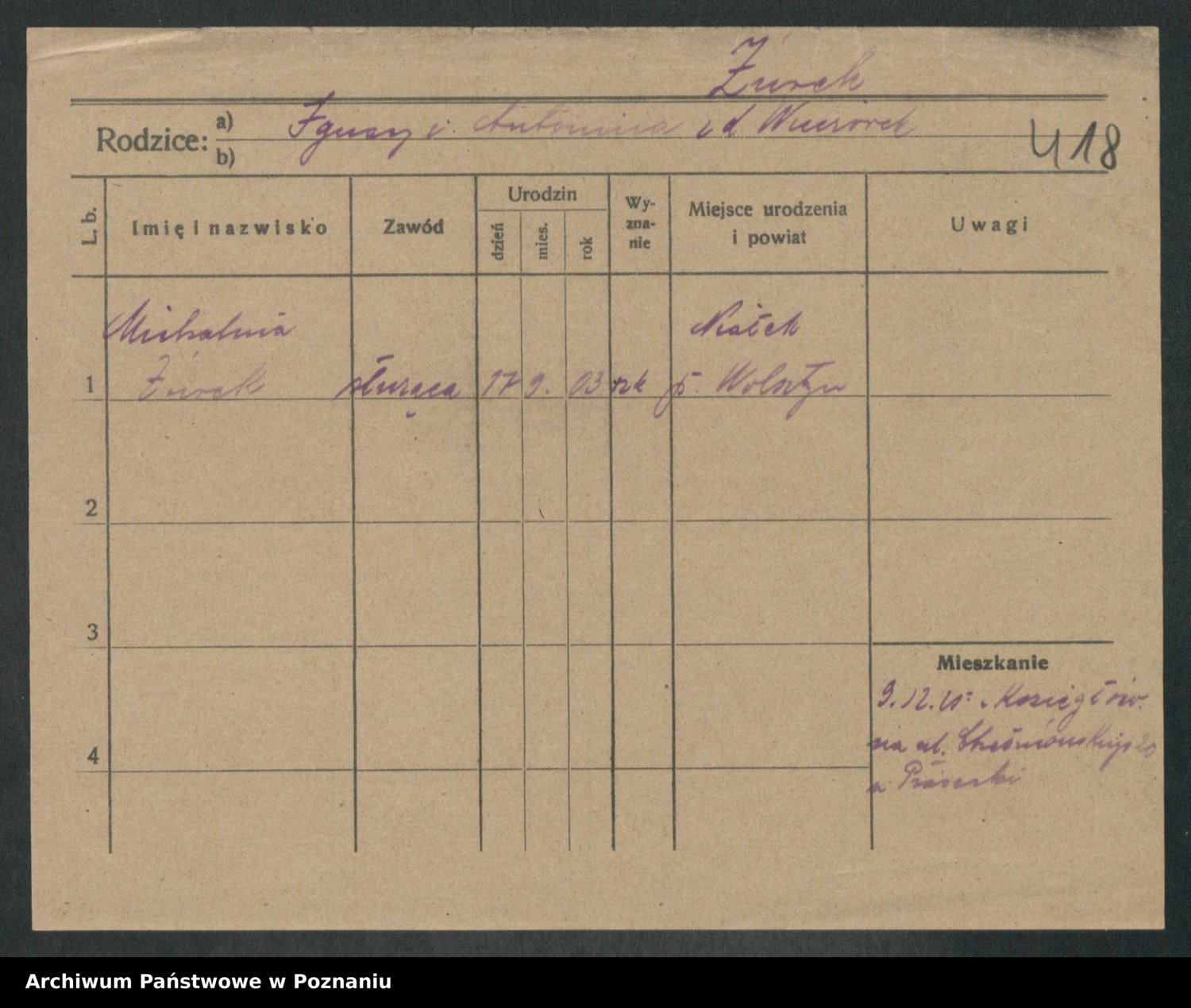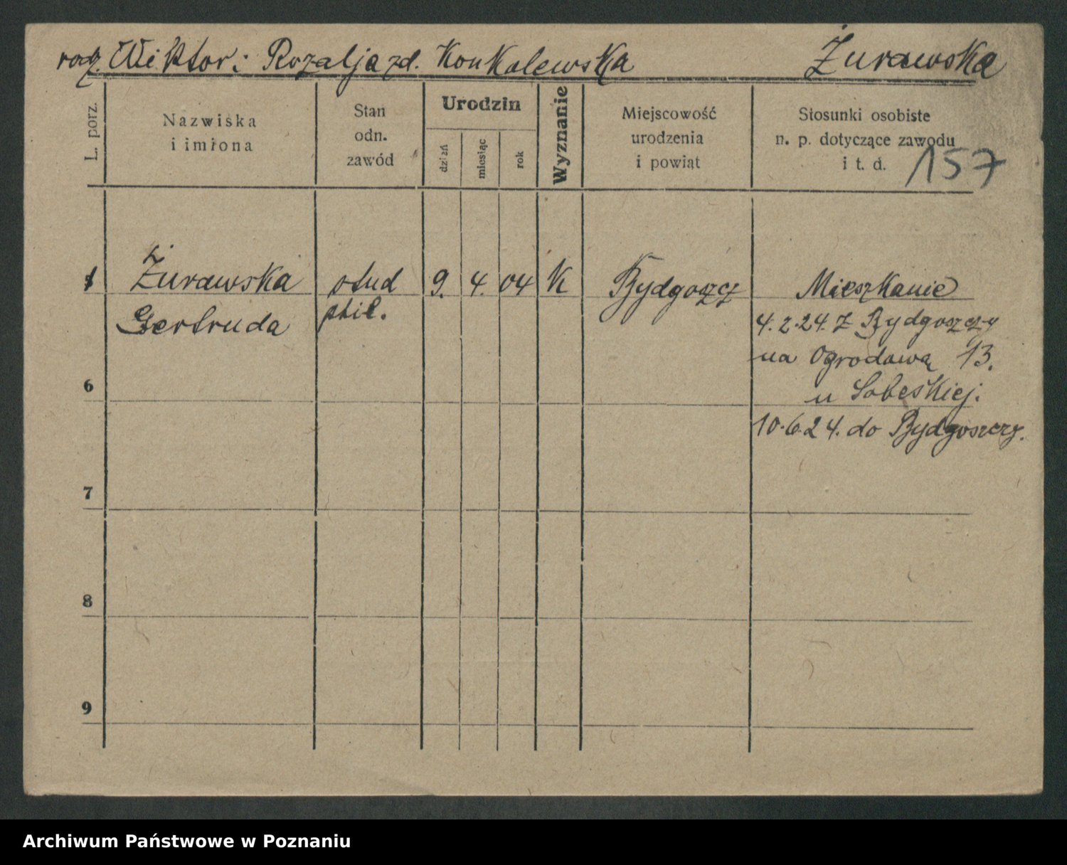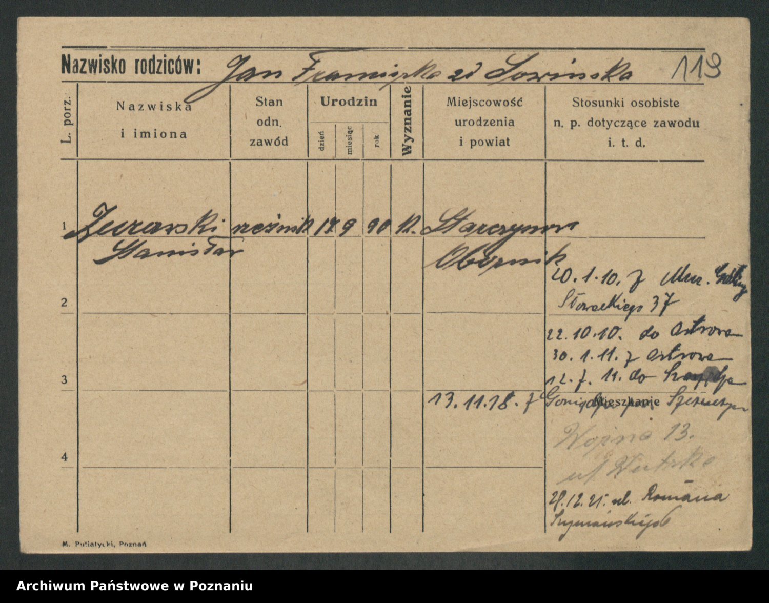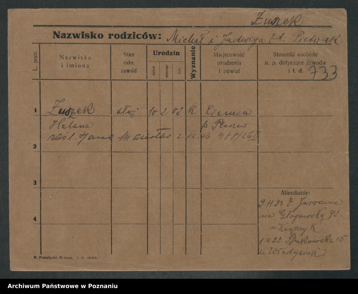 Podgląd karty osobowej dostępny jest po kliknięciu na nazwisko lub ikonkę karty. Można dokonywać powiększenia (ikony na górze) lub przechodzić między kolejnymi skanami (strzałki po bokach).
