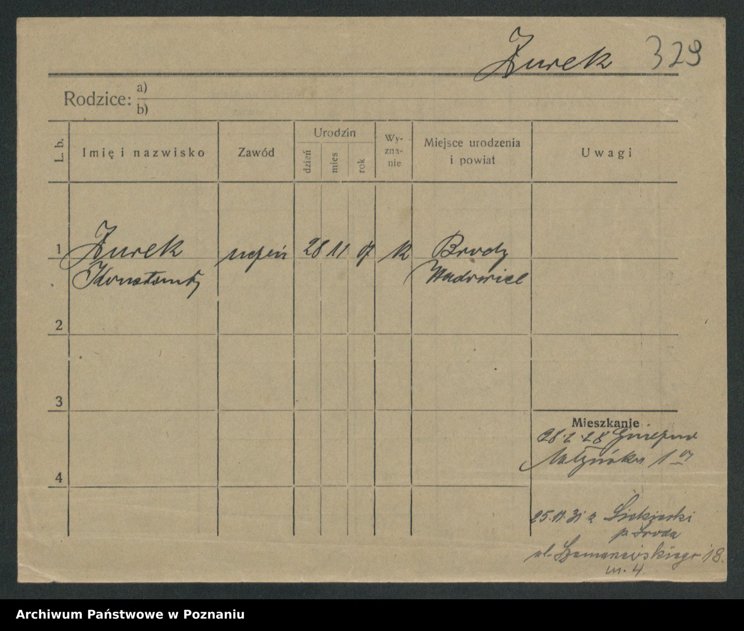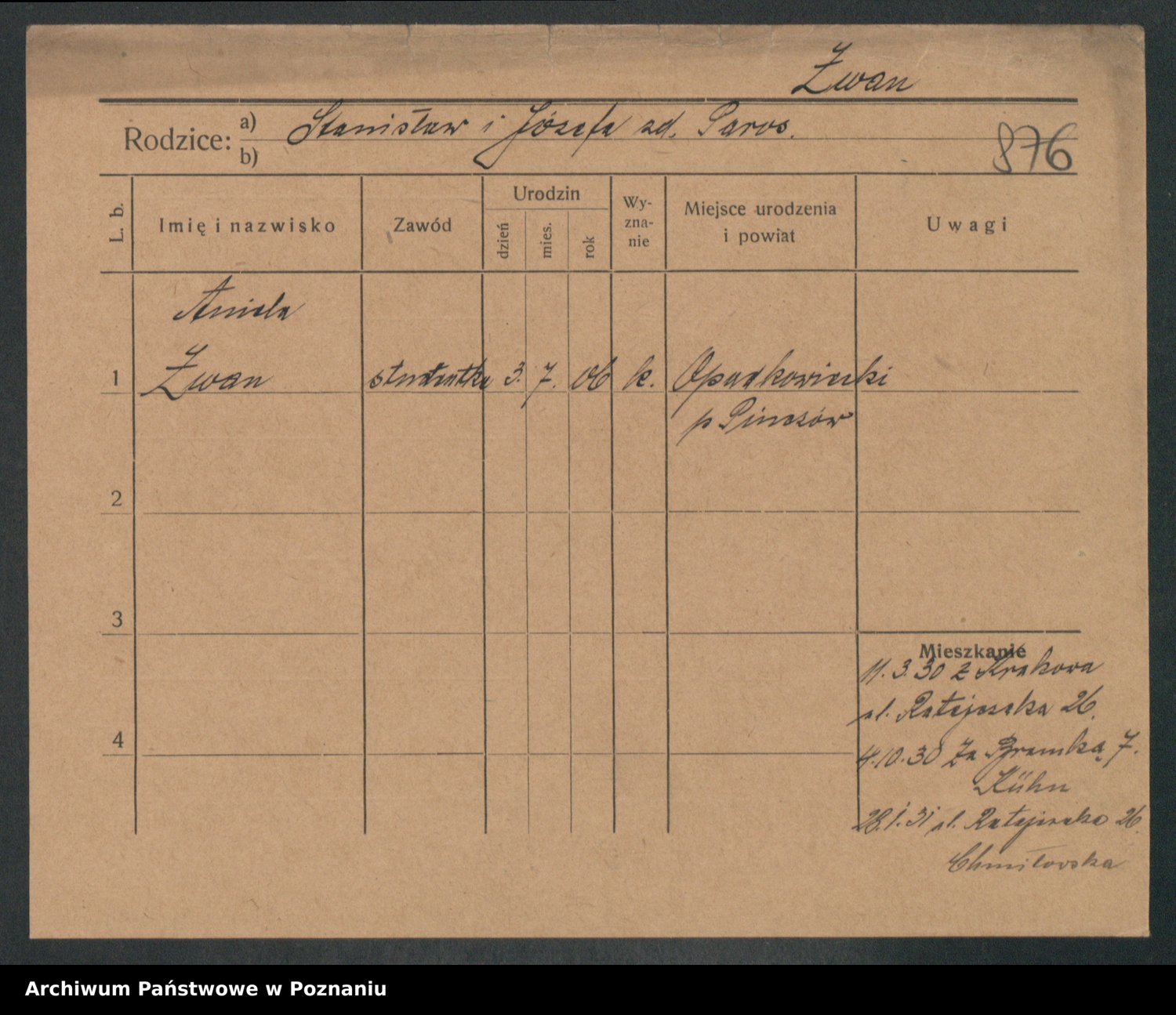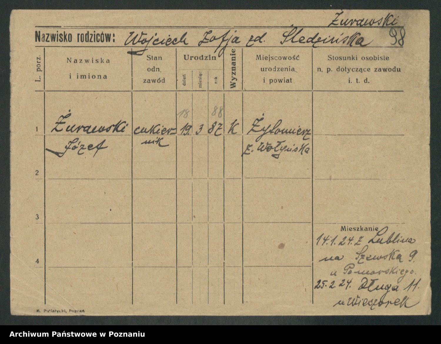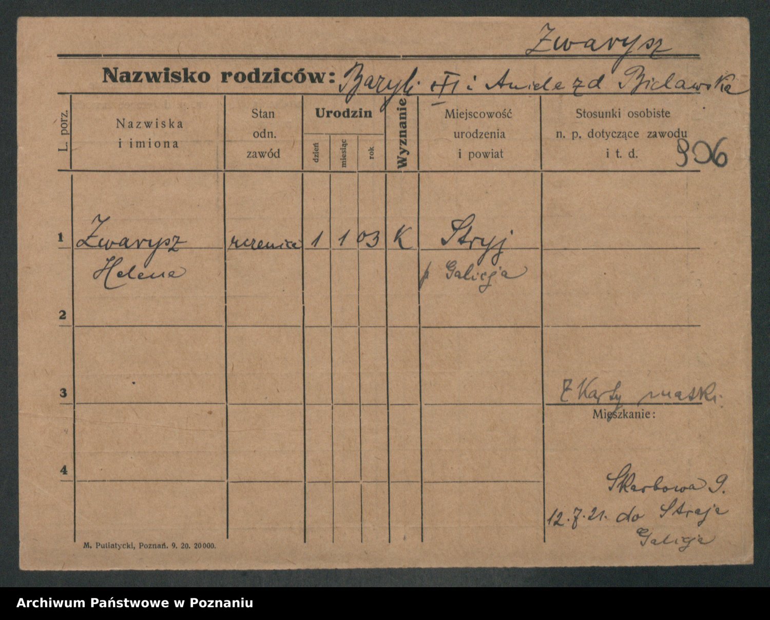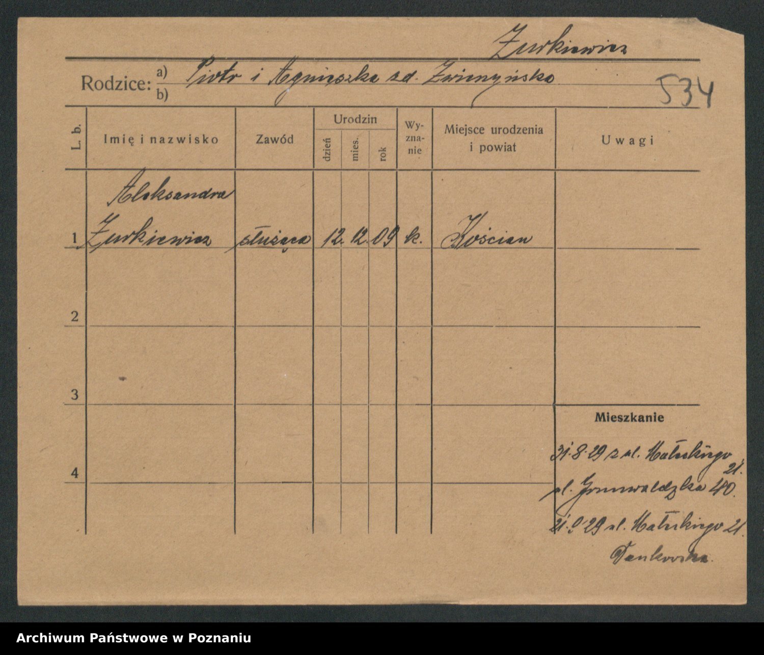 Podgląd karty osobowej dostępny jest po kliknięciu na nazwisko lub ikonkę karty. Można dokonywać powiększenia (ikony na górze) lub przechodzić między kolejnymi skanami (strzałki po bokach).