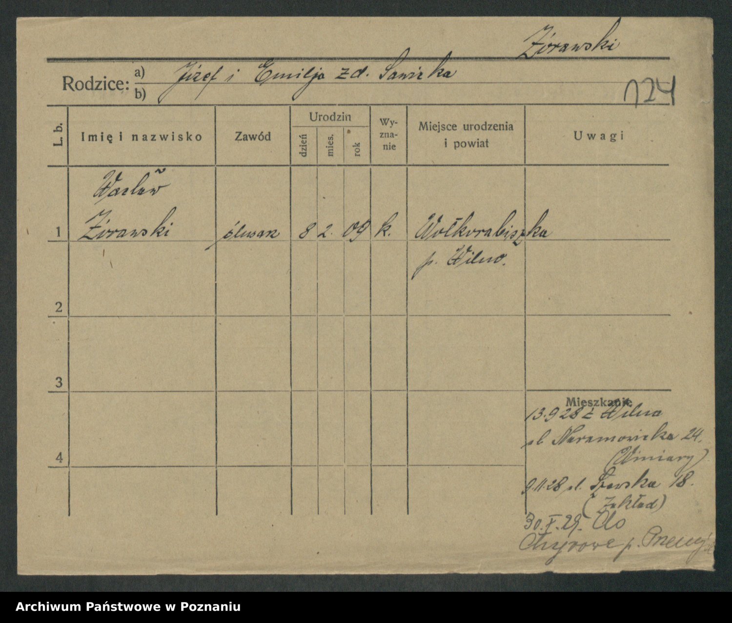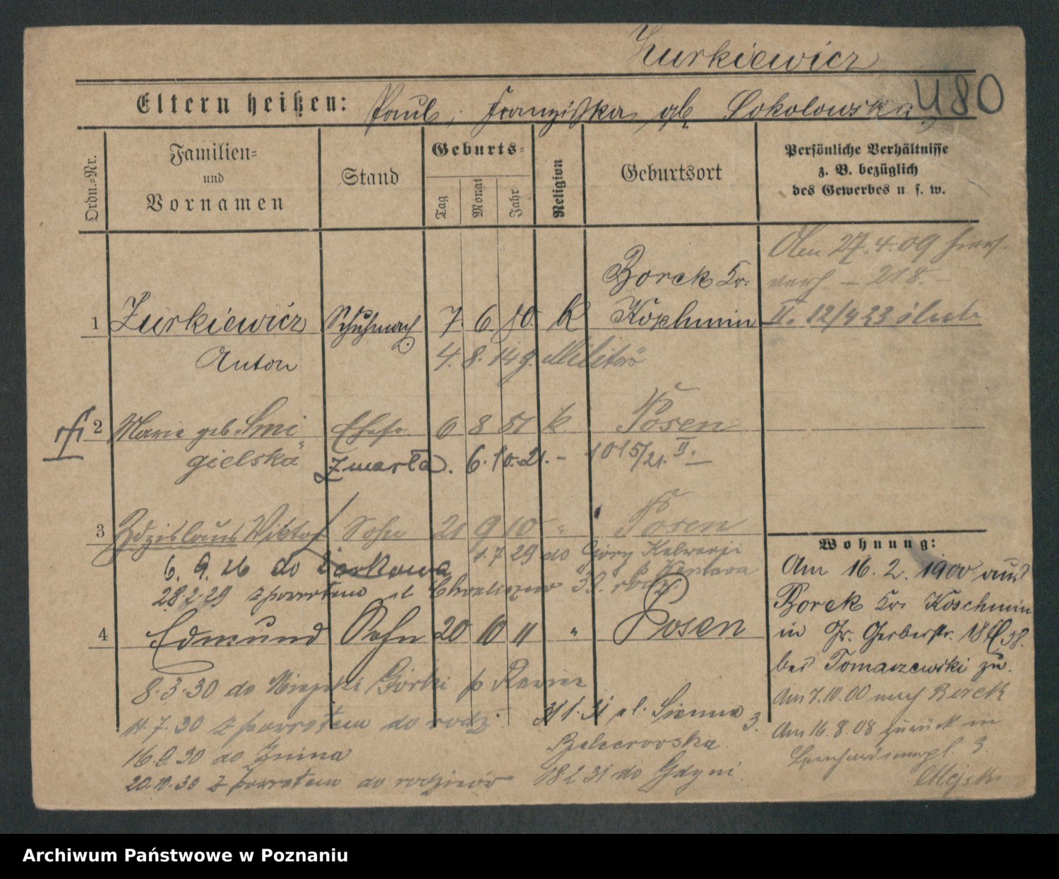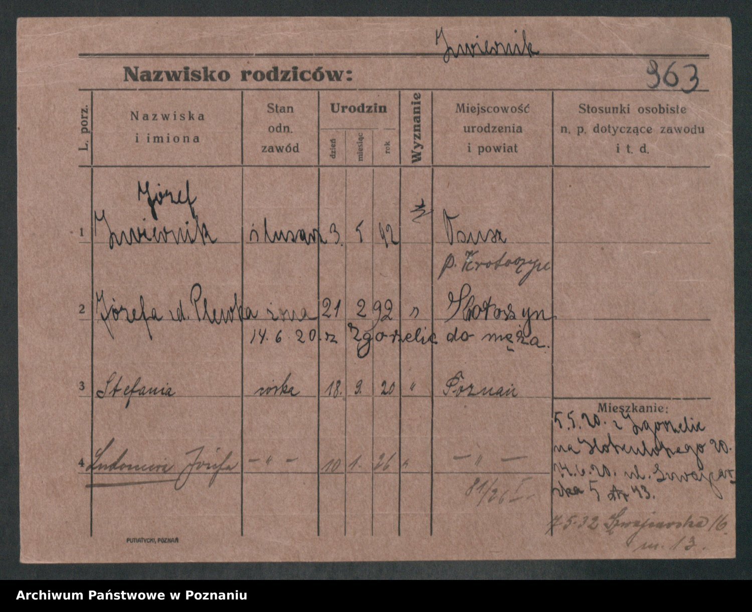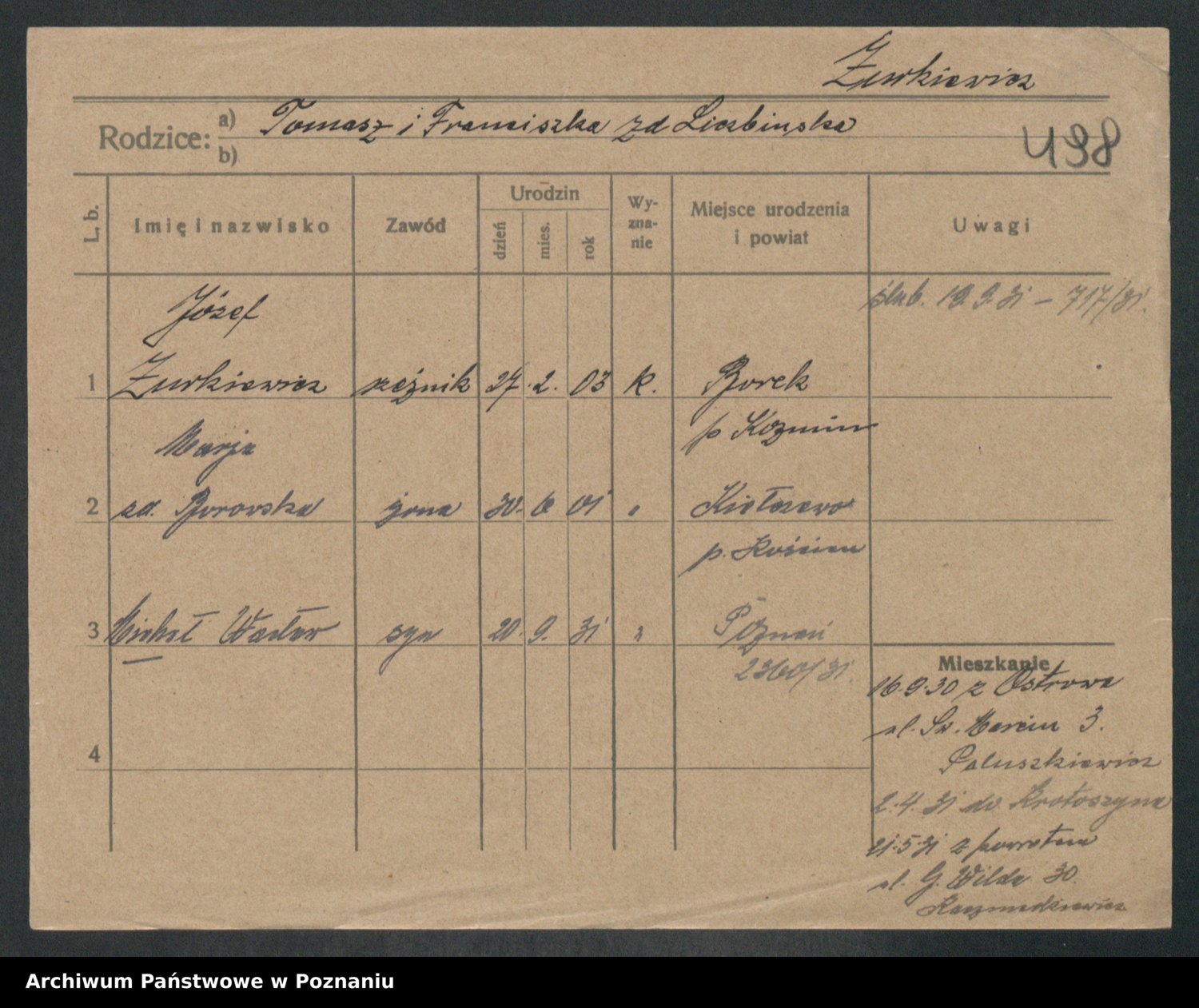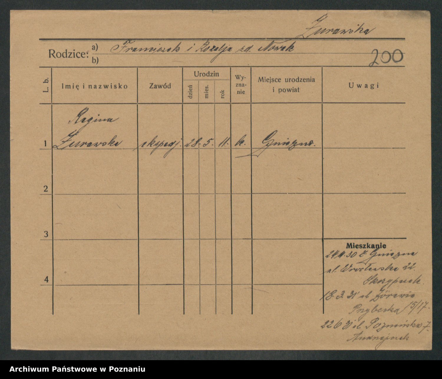 Podgląd karty osobowej dostępny jest po kliknięciu na nazwisko lub ikonkę karty. Można dokonywać powiększenia (ikony na górze) lub przechodzić między kolejnymi skanami (strzałki po bokach).