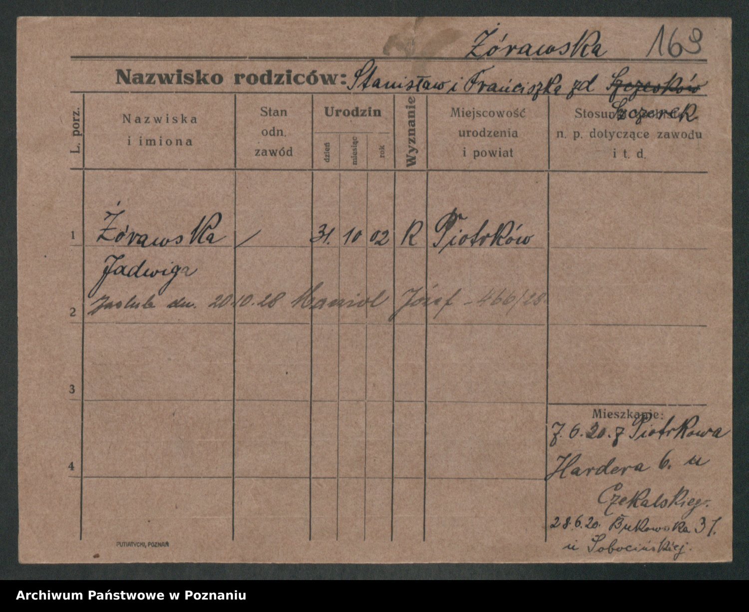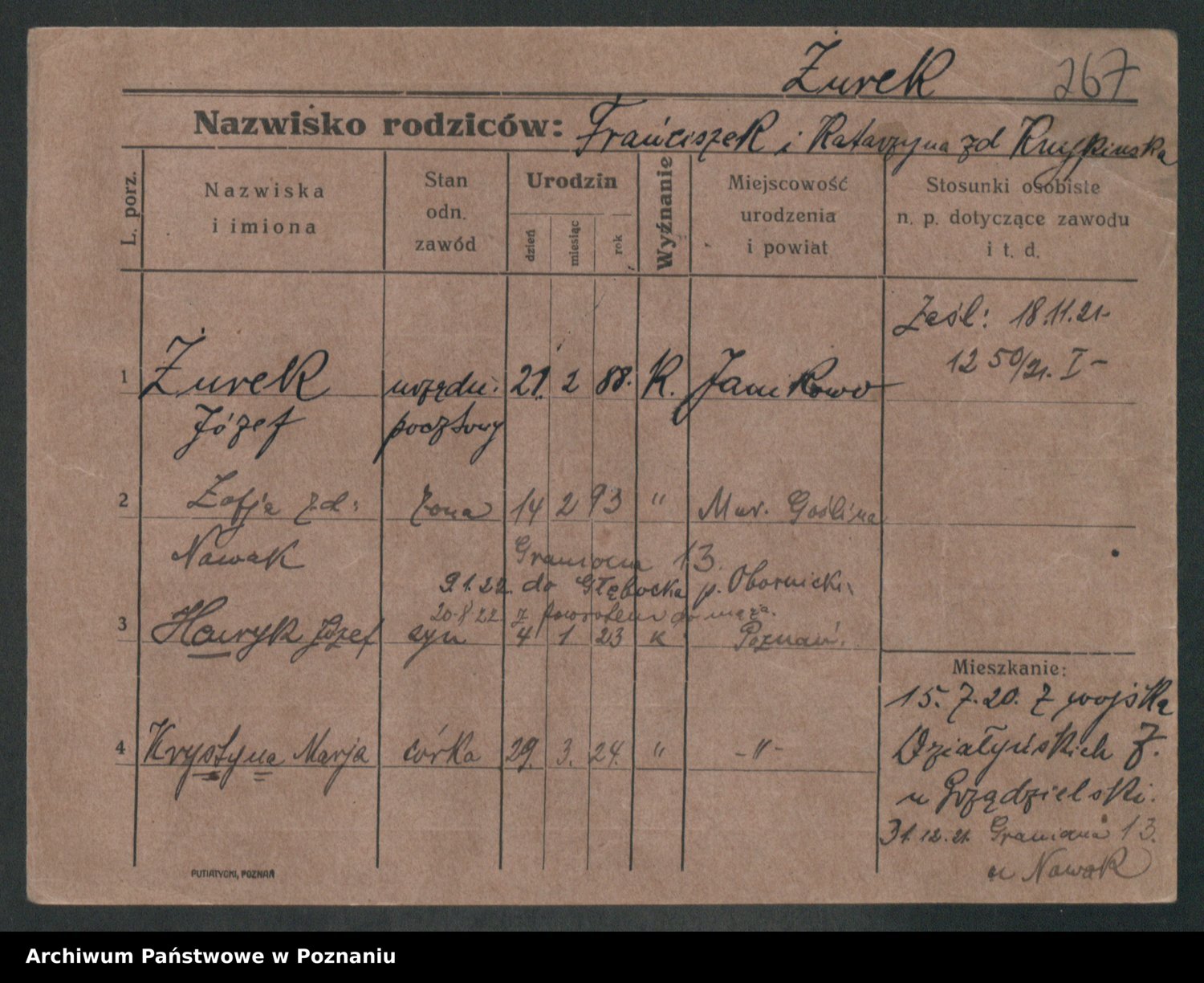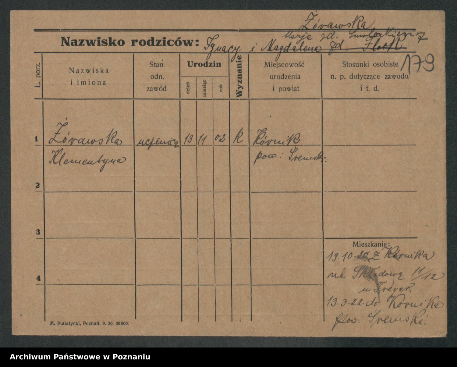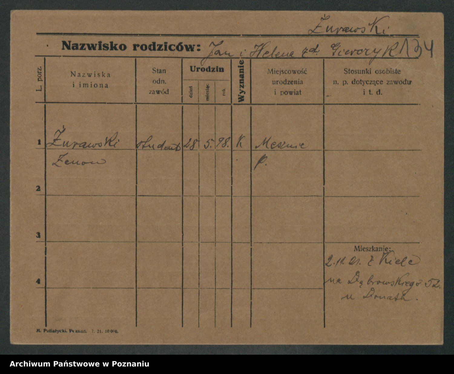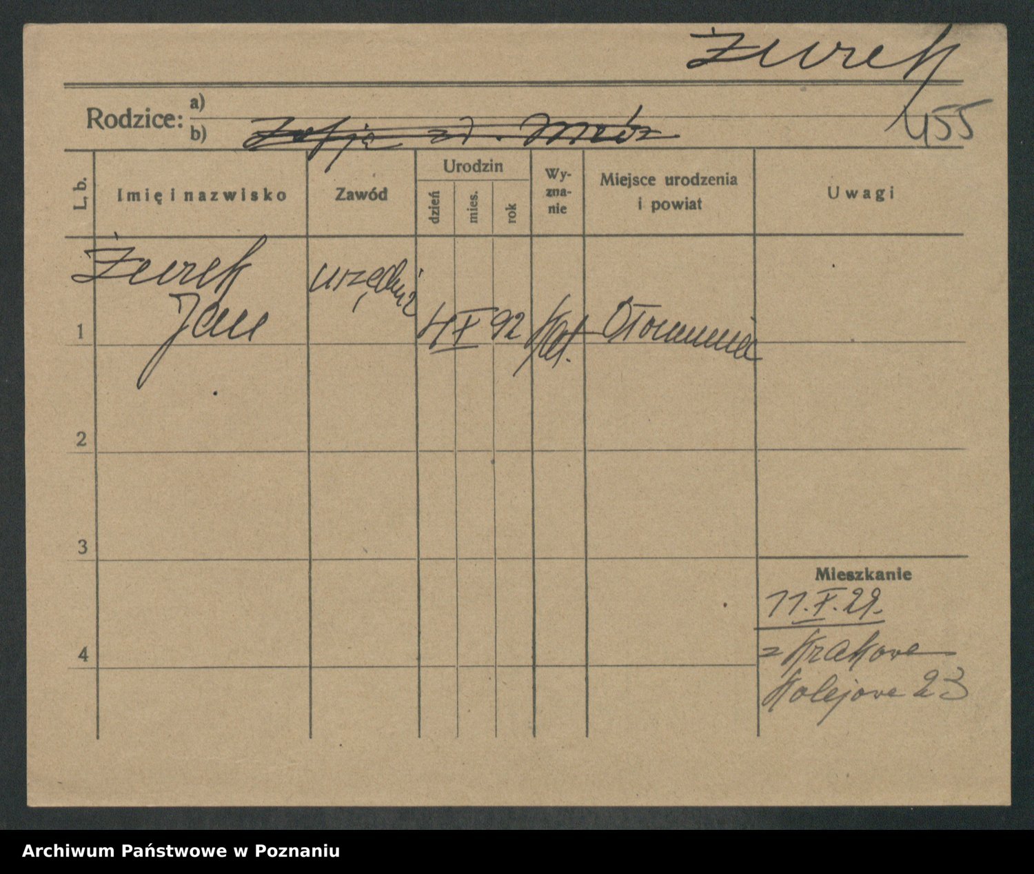 Podgląd karty osobowej dostępny jest po kliknięciu na nazwisko lub ikonkę karty. Można dokonywać powiększenia (ikony na górze) lub przechodzić między kolejnymi skanami (strzałki po bokach).