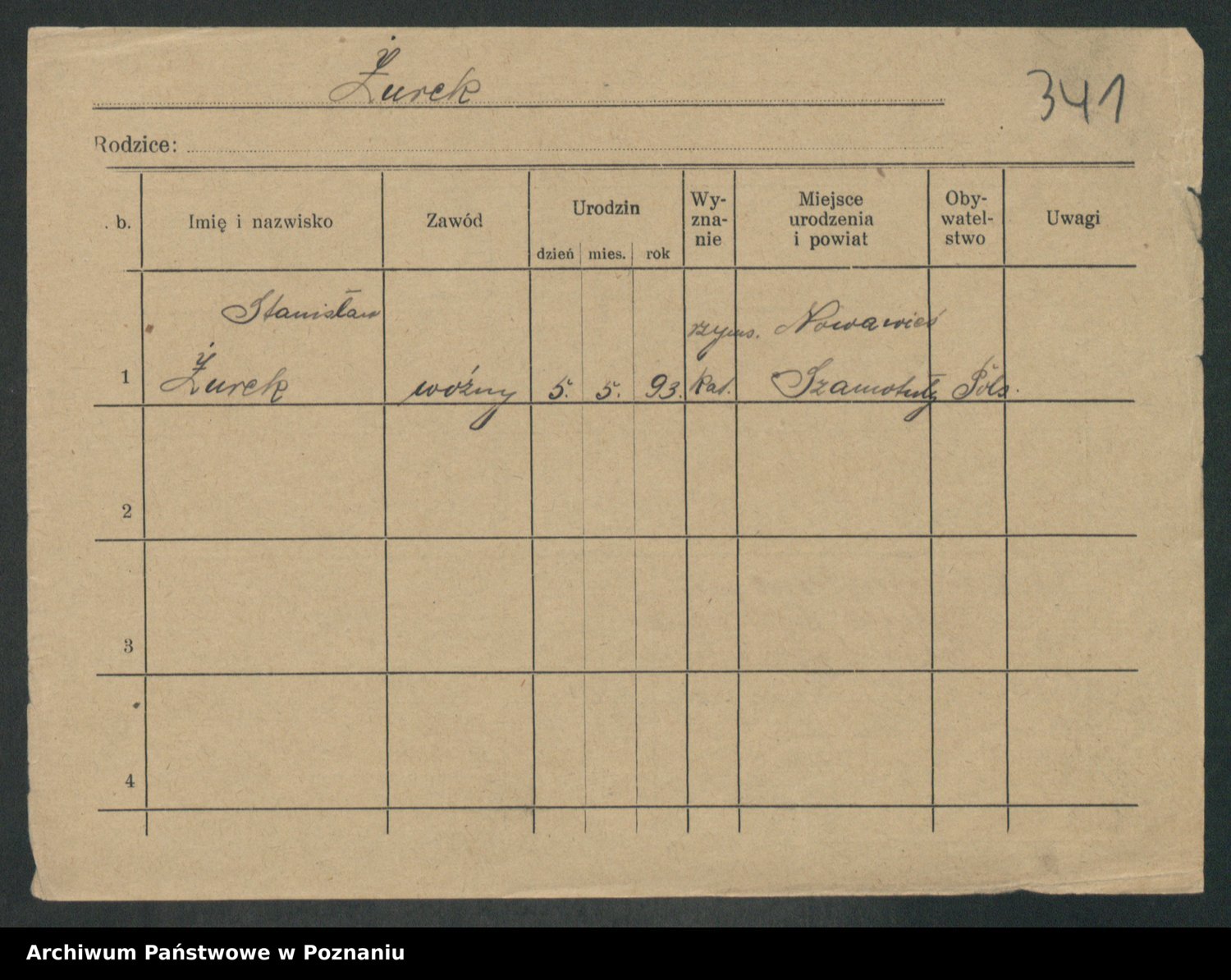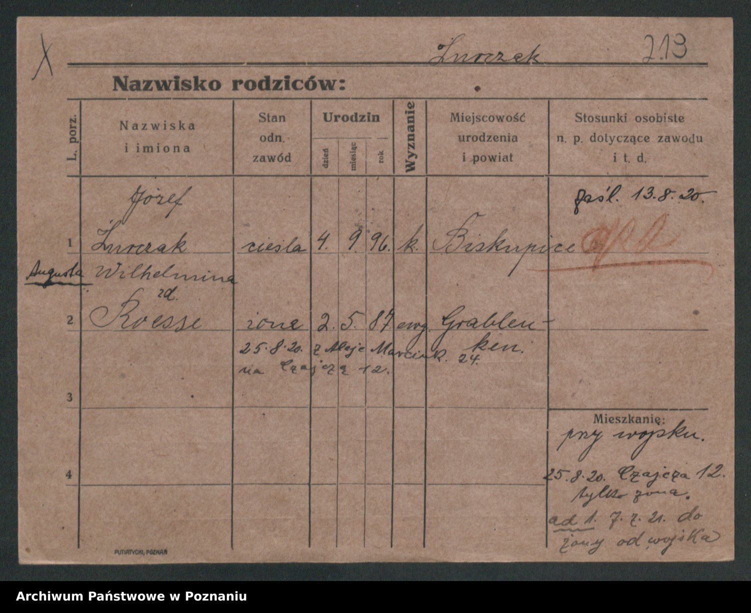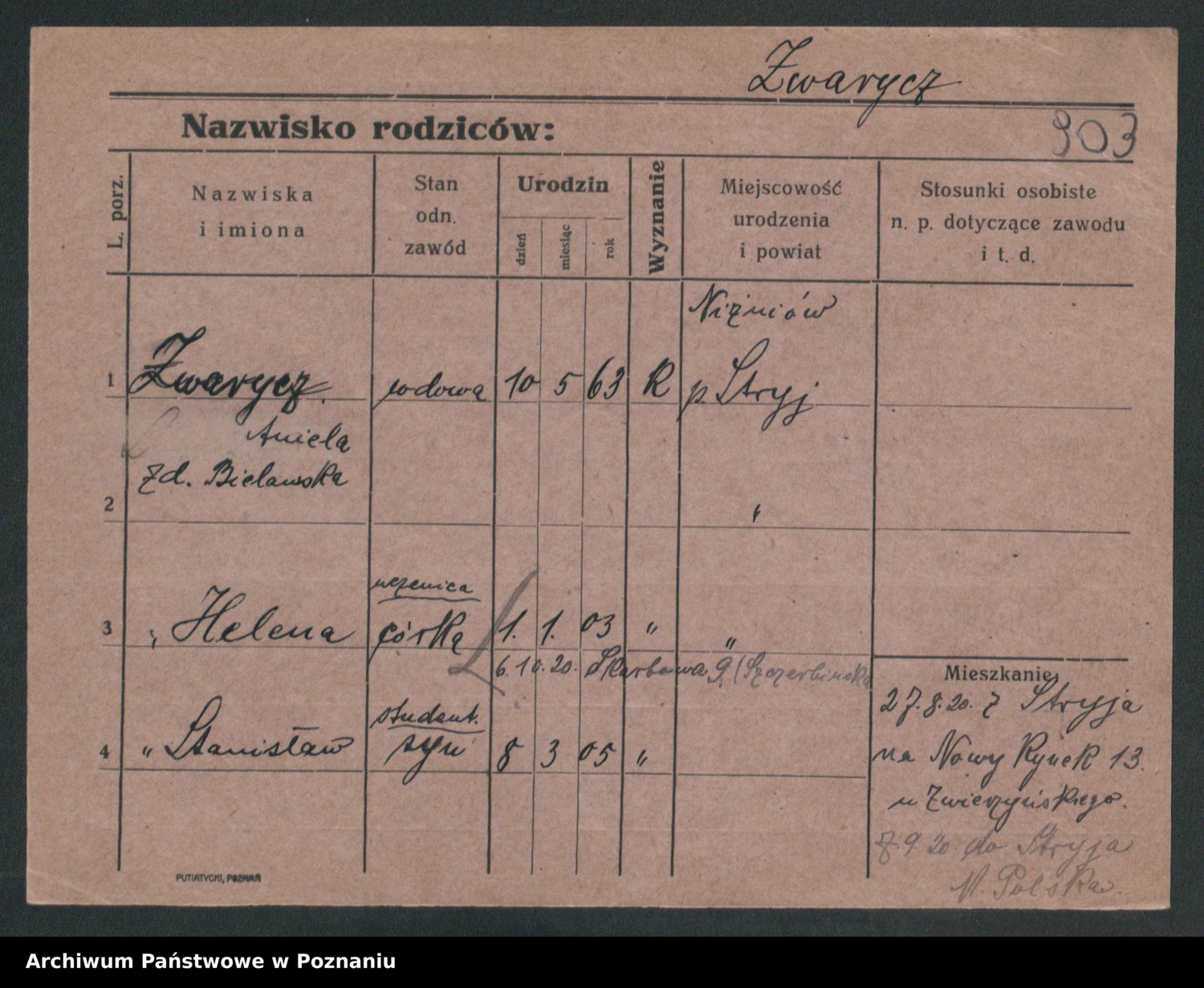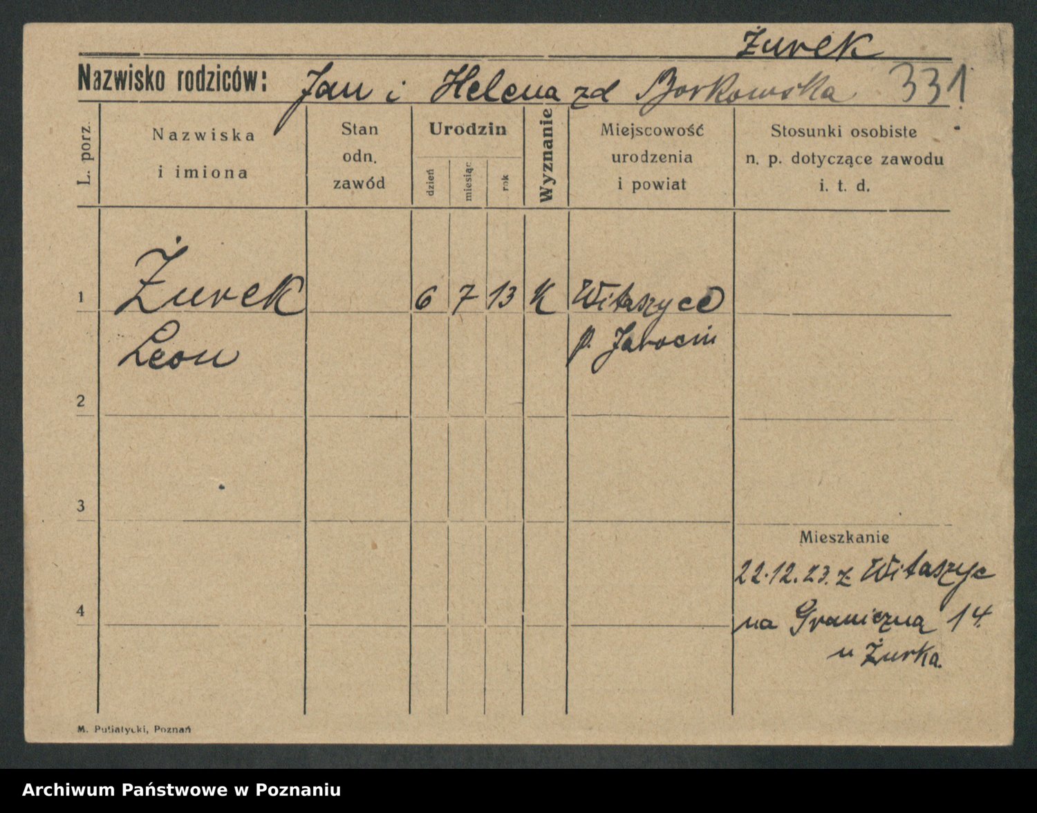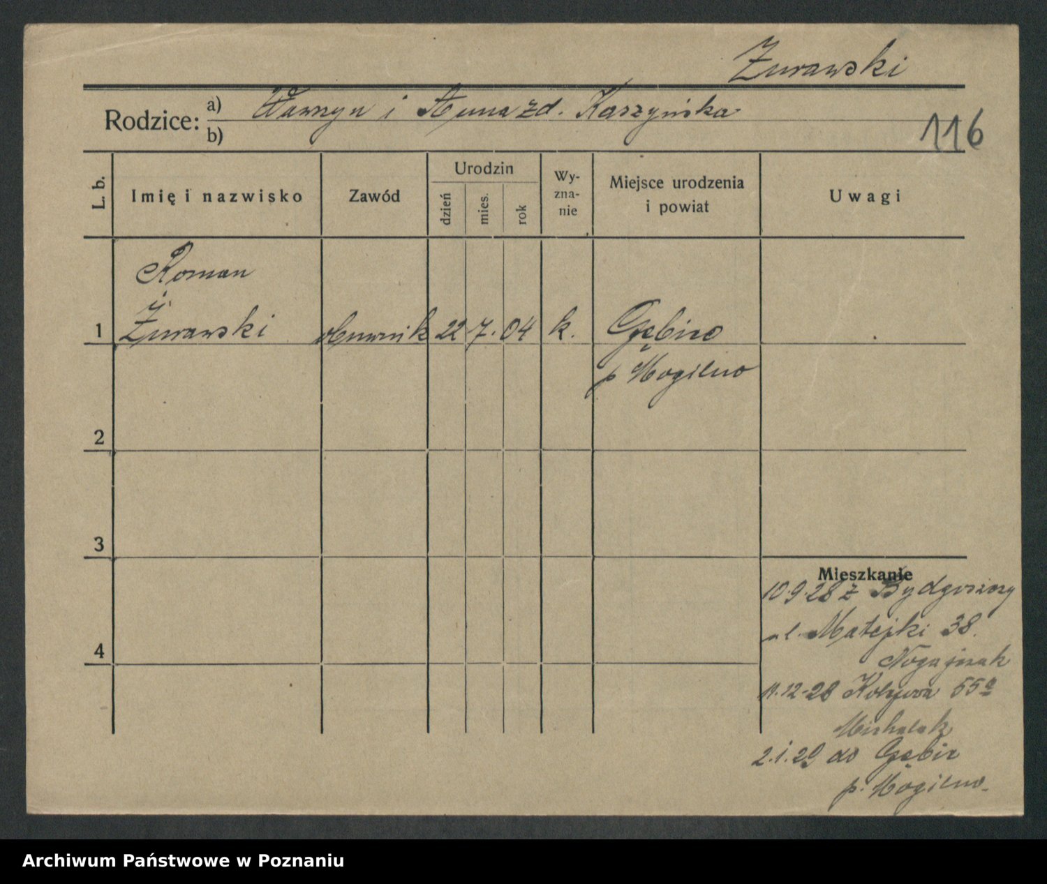 Podgląd karty osobowej dostępny jest po kliknięciu na nazwisko lub ikonkę karty. Można dokonywać powiększenia (ikony na górze) lub przechodzić między kolejnymi skanami (strzałki po bokach).