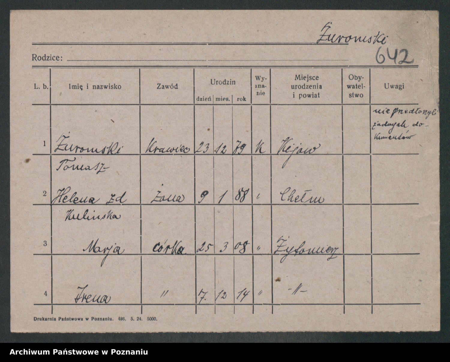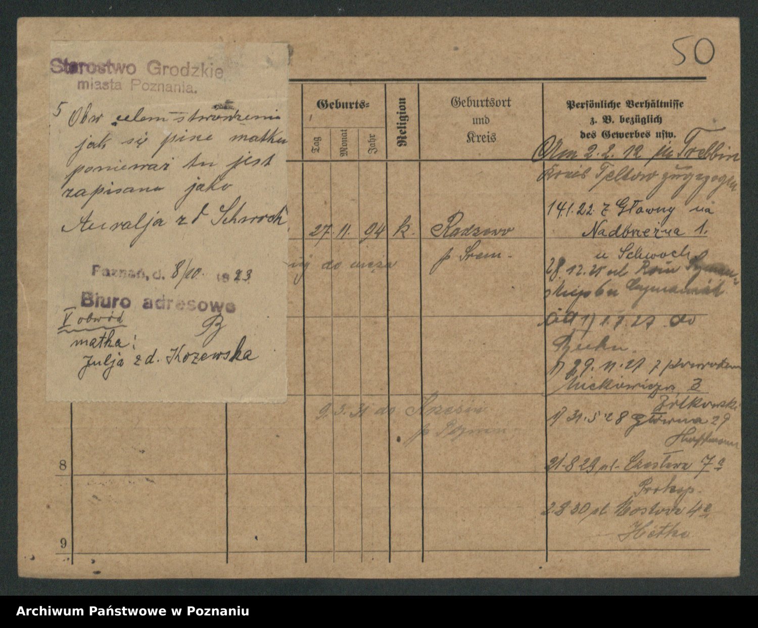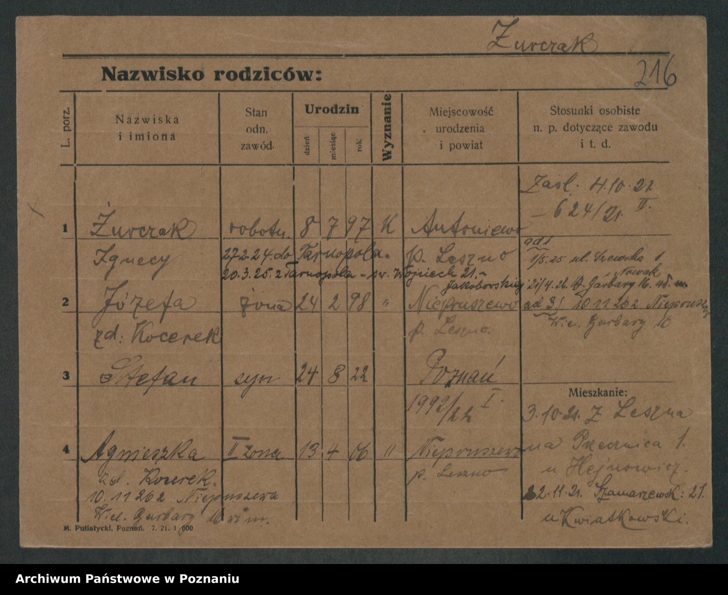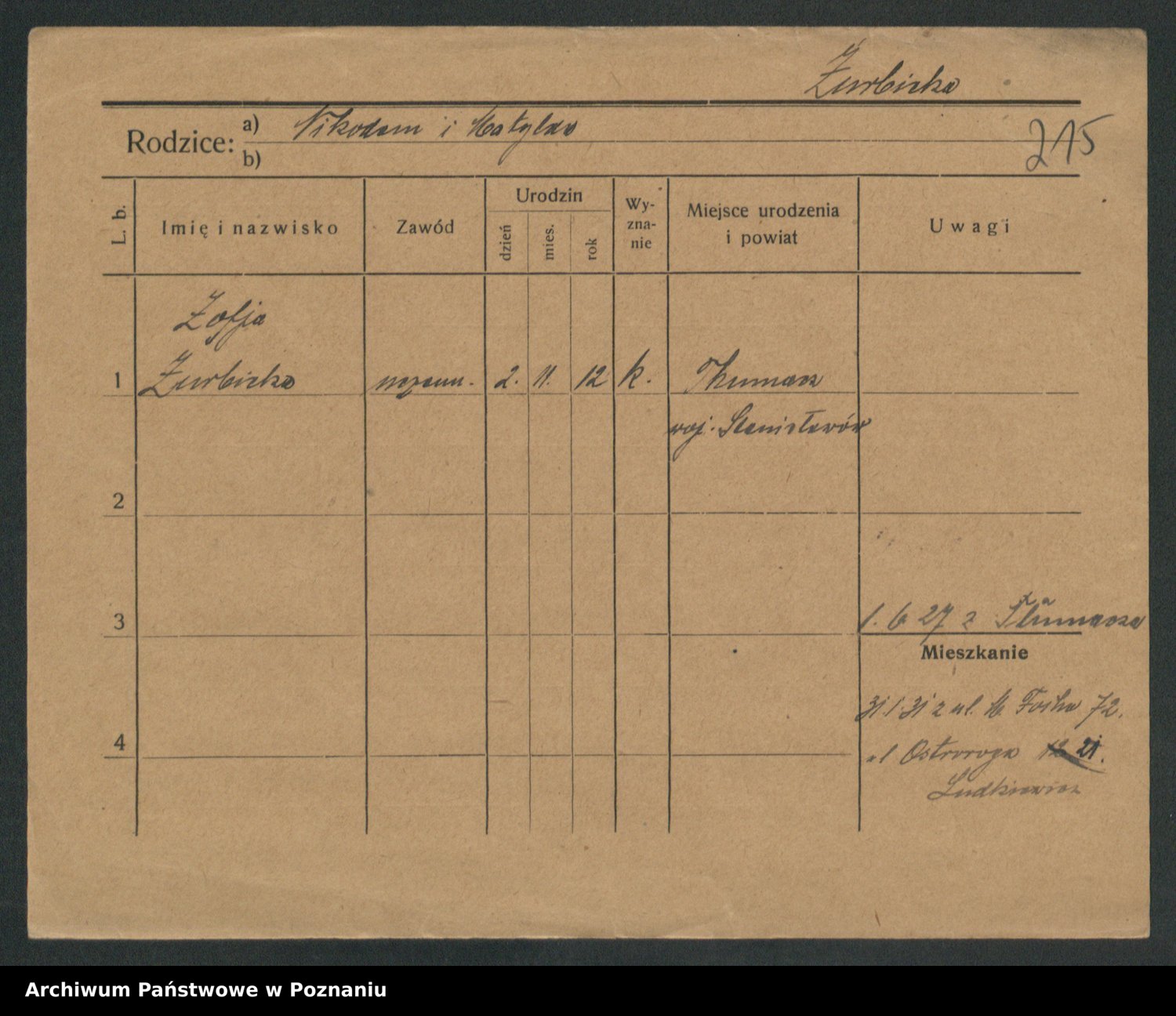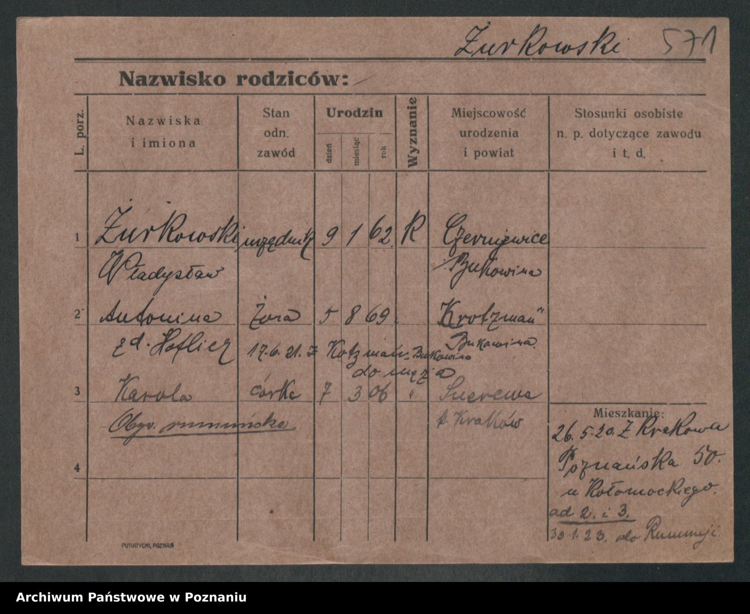 Podgląd karty osobowej dostępny jest po kliknięciu na nazwisko lub ikonkę karty. Można dokonywać powiększenia (ikony na górze) lub przechodzić między kolejnymi skanami (strzałki po bokach).