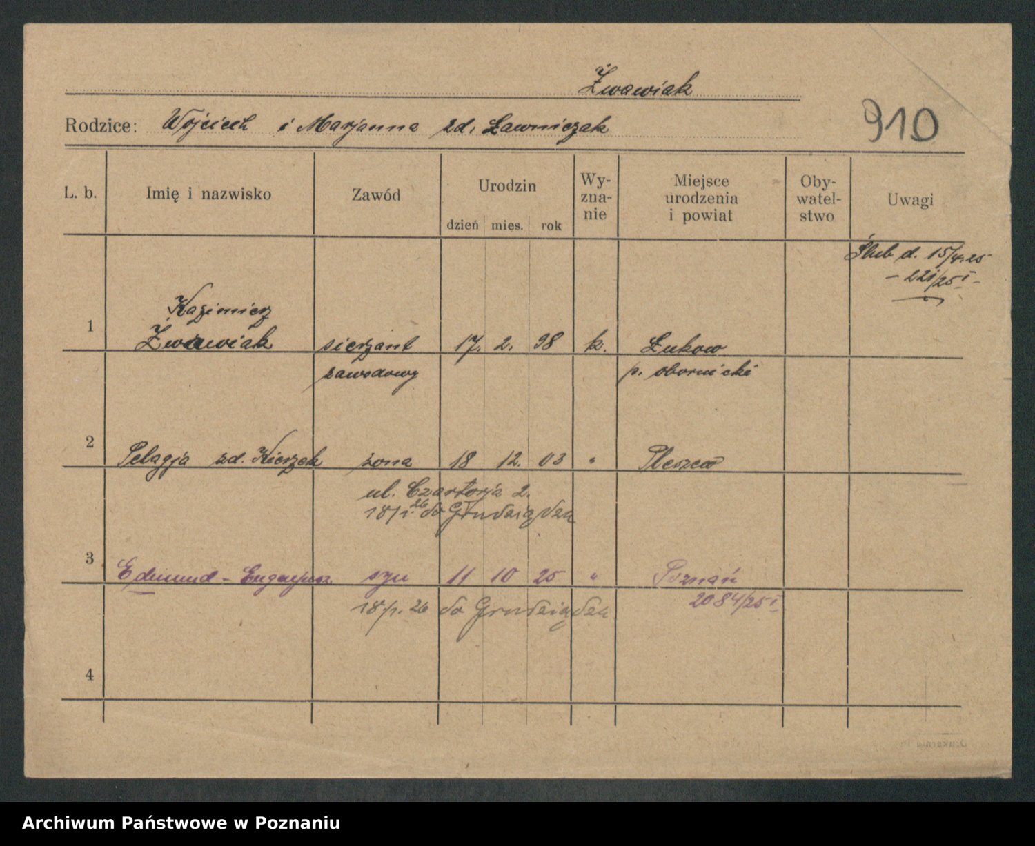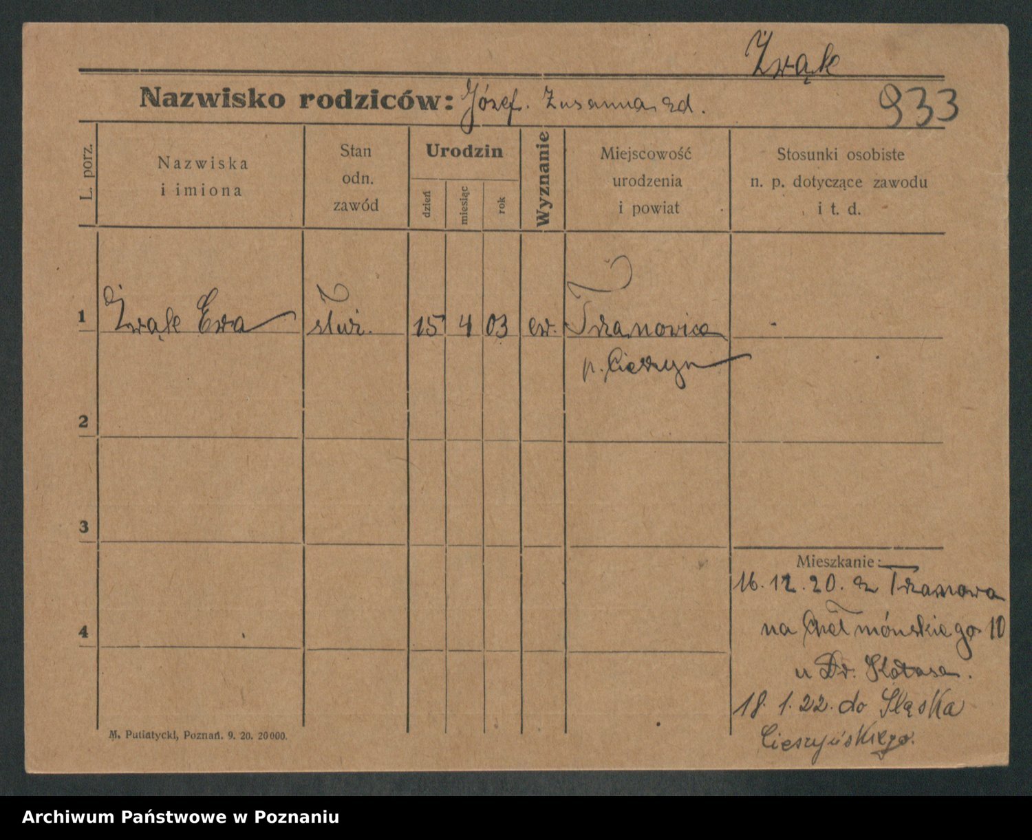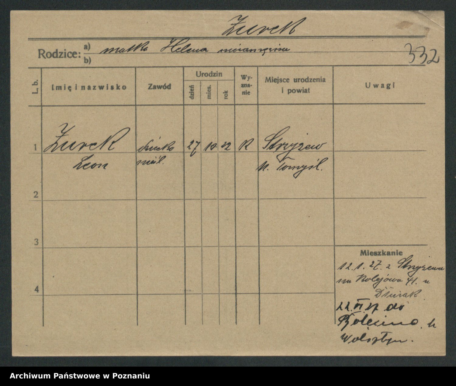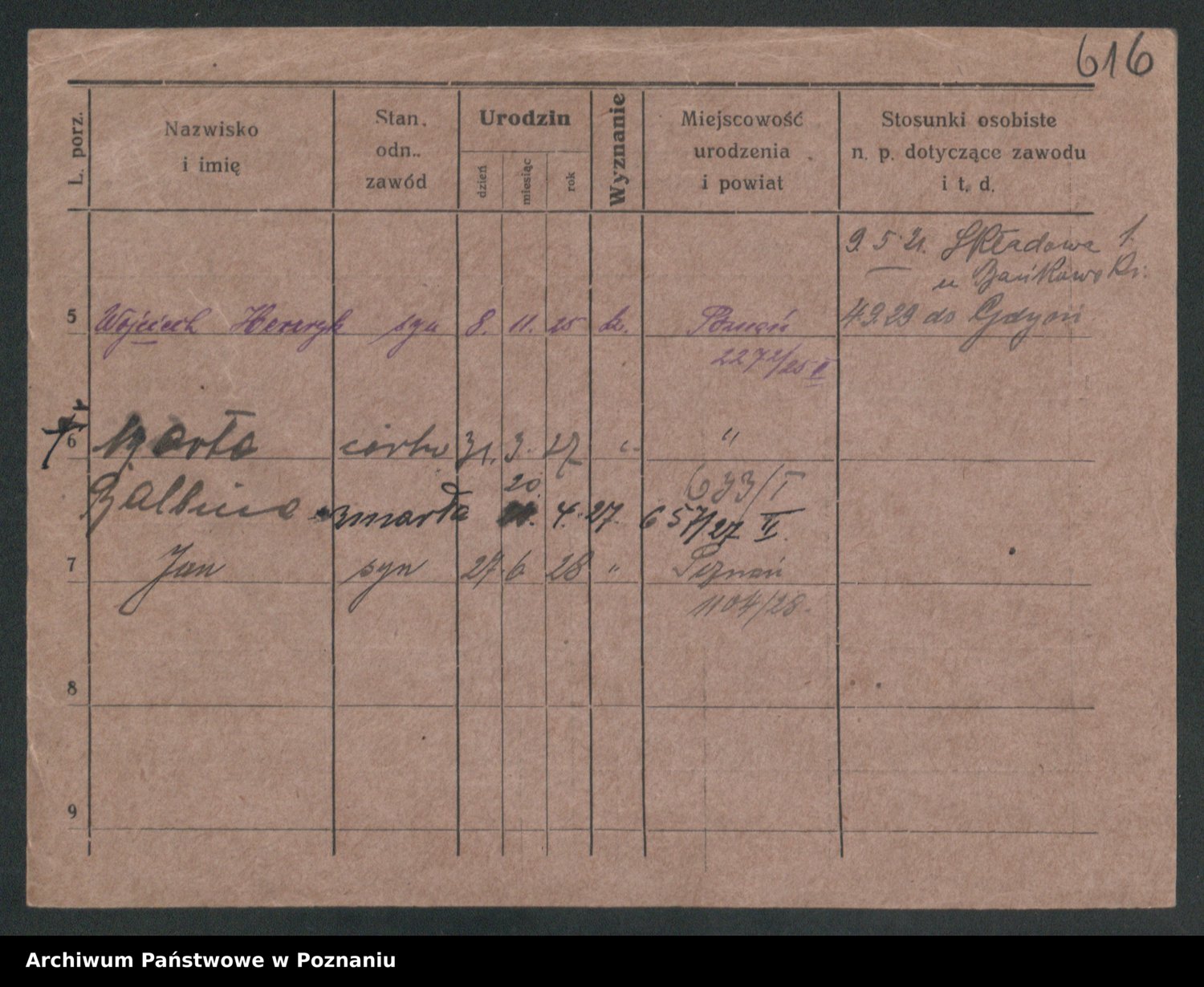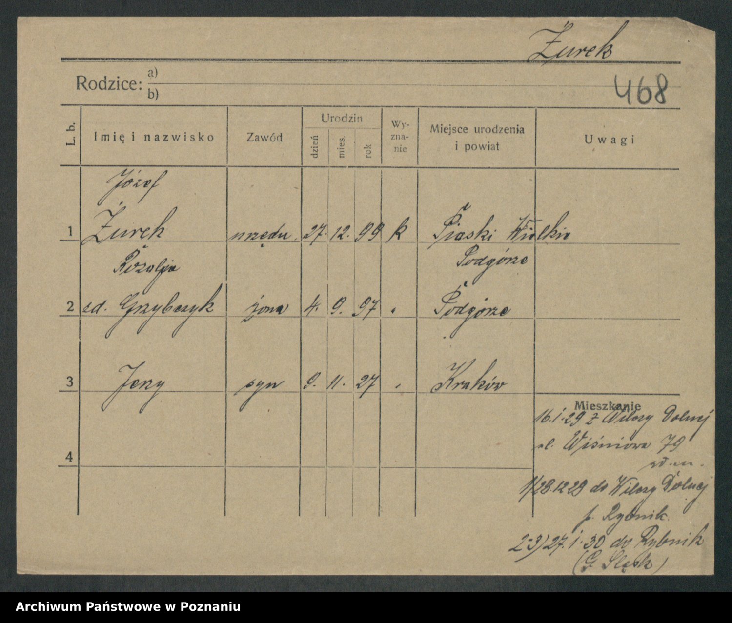 Podgląd karty osobowej dostępny jest po kliknięciu na nazwisko lub ikonkę karty. Można dokonywać powiększenia (ikony na górze) lub przechodzić między kolejnymi skanami (strzałki po bokach).