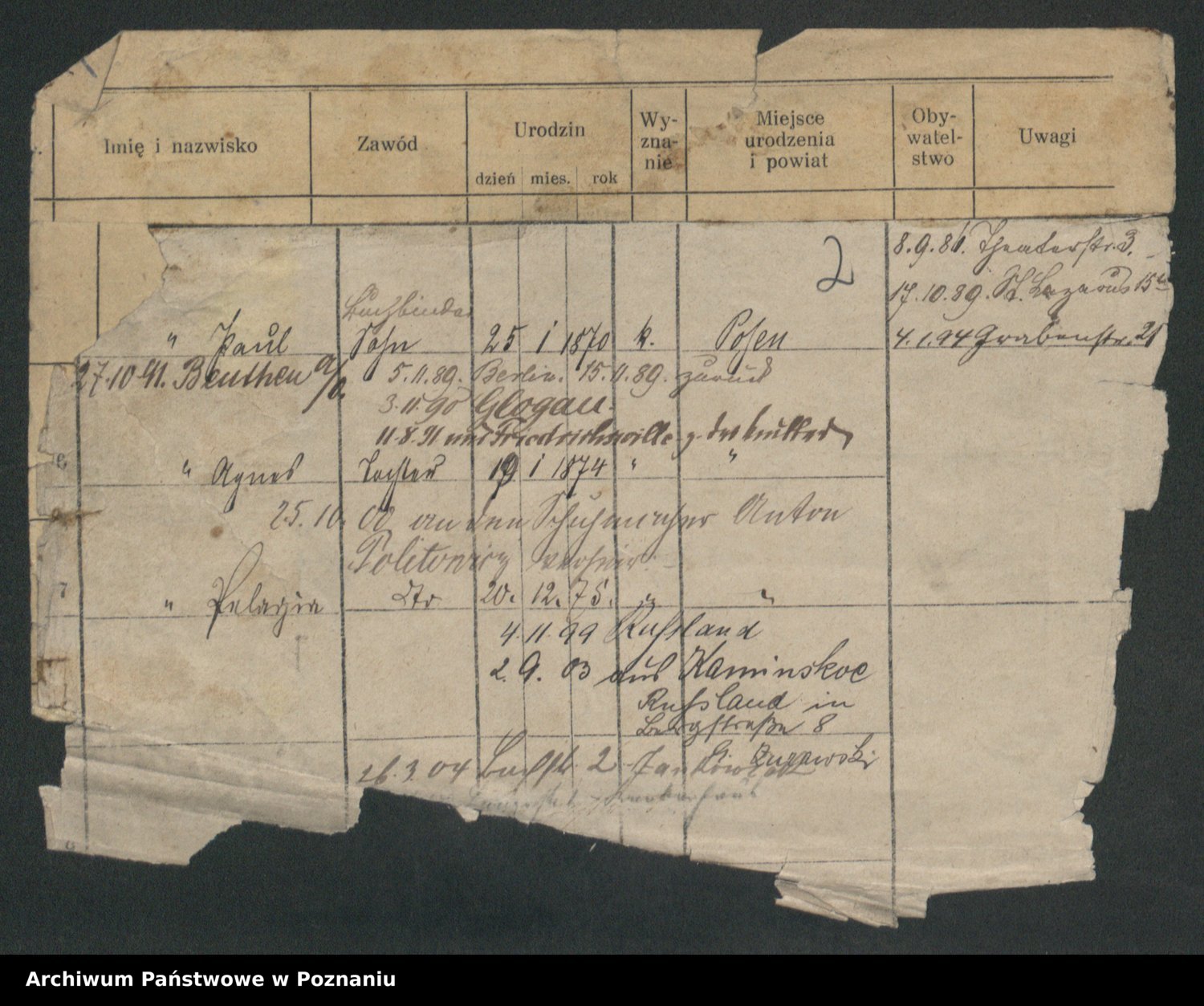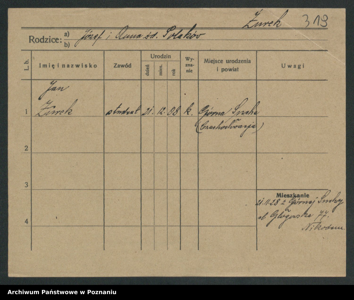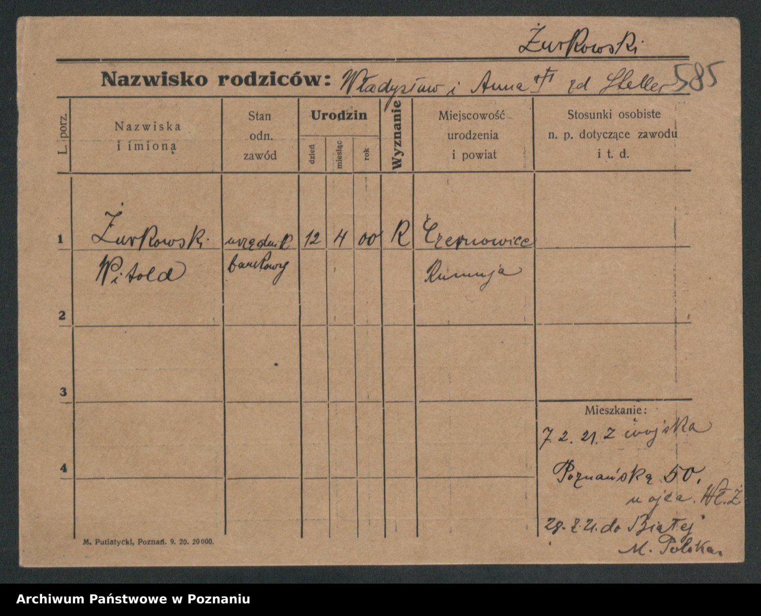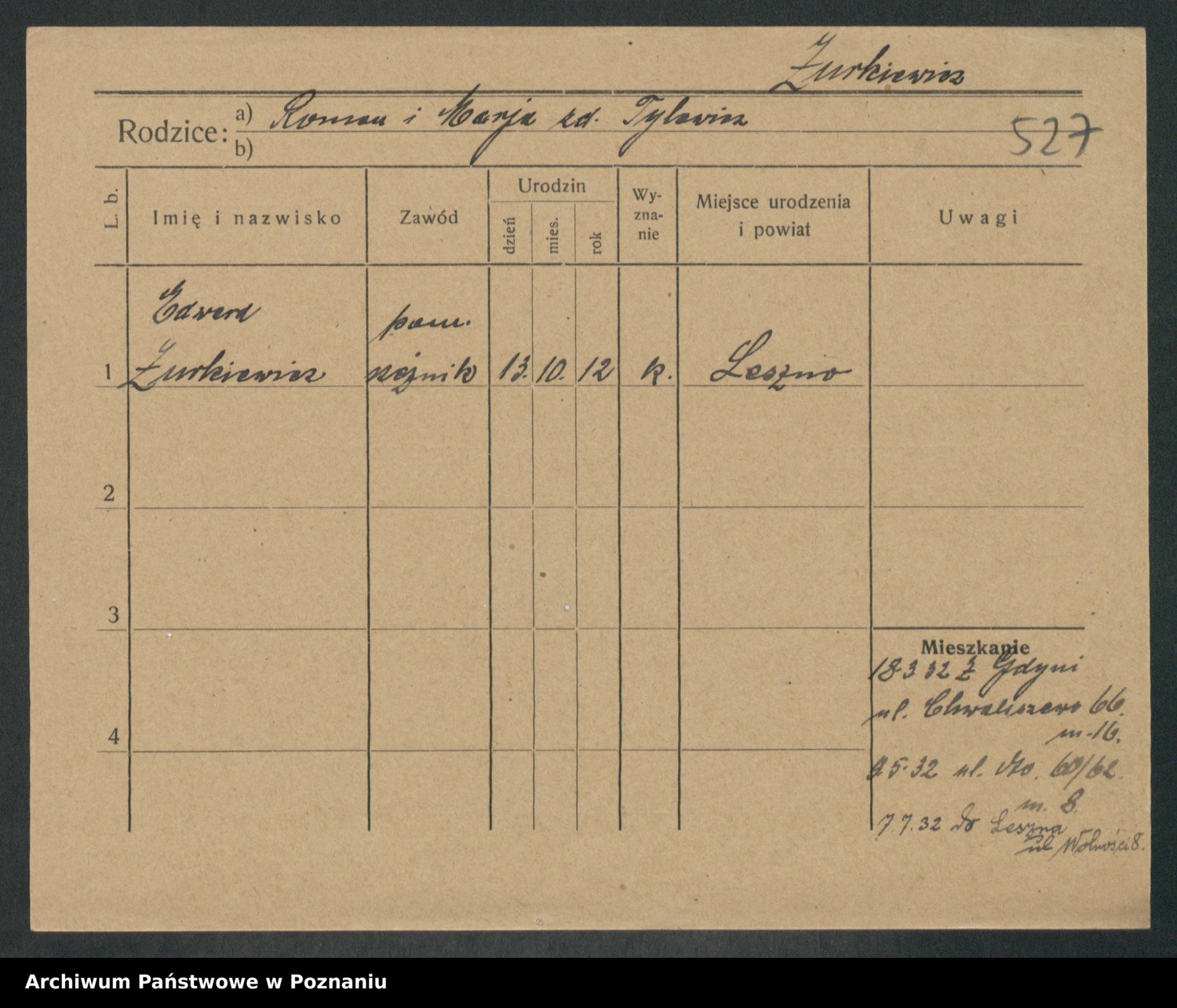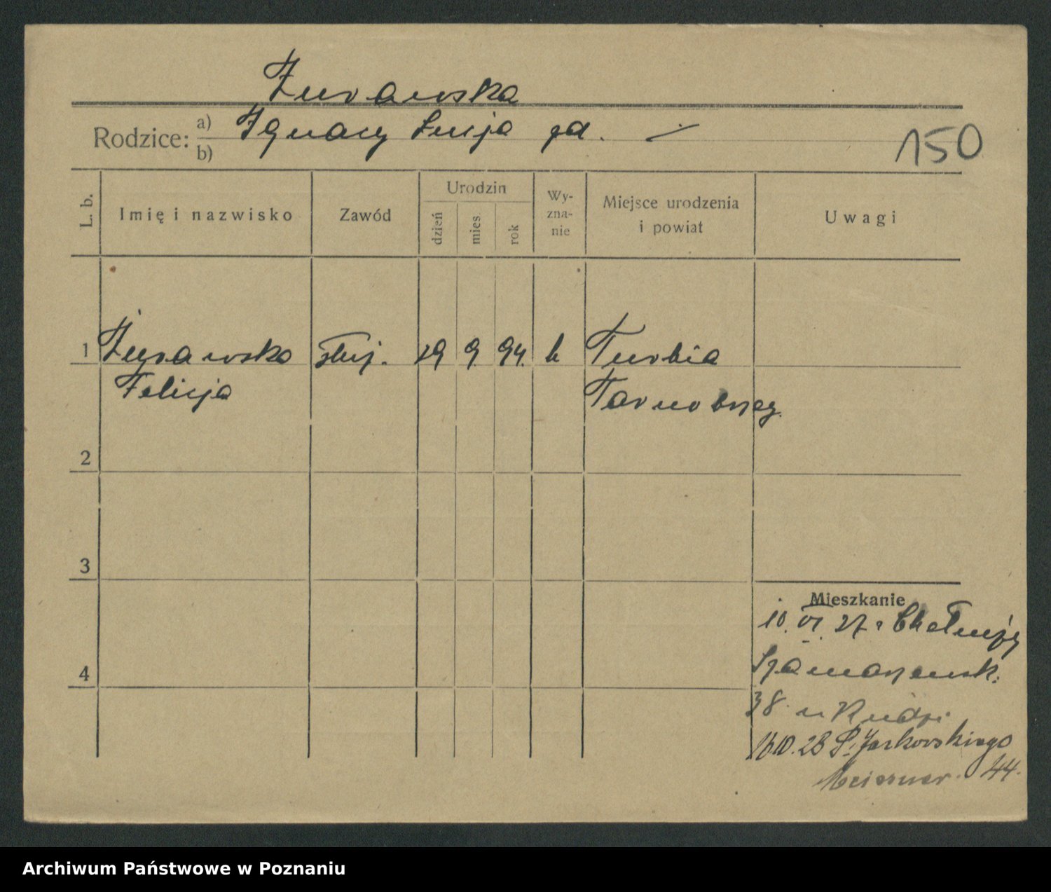Podgląd karty osobowej dostępny jest po kliknięciu na nazwisko lub ikonkę karty. Można dokonywać powiększenia (ikony na górze) lub przechodzić między kolejnymi skanami (strzałki po bokach).
