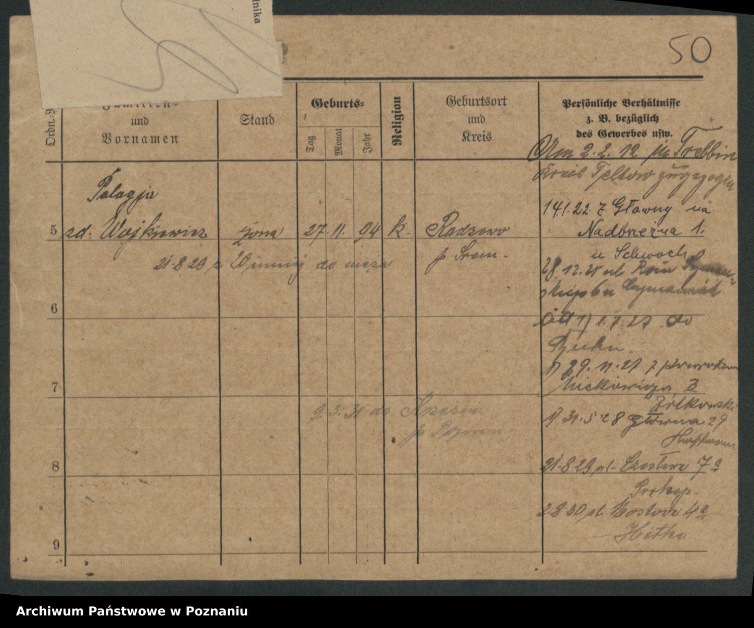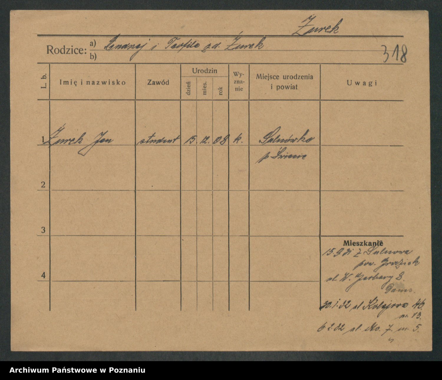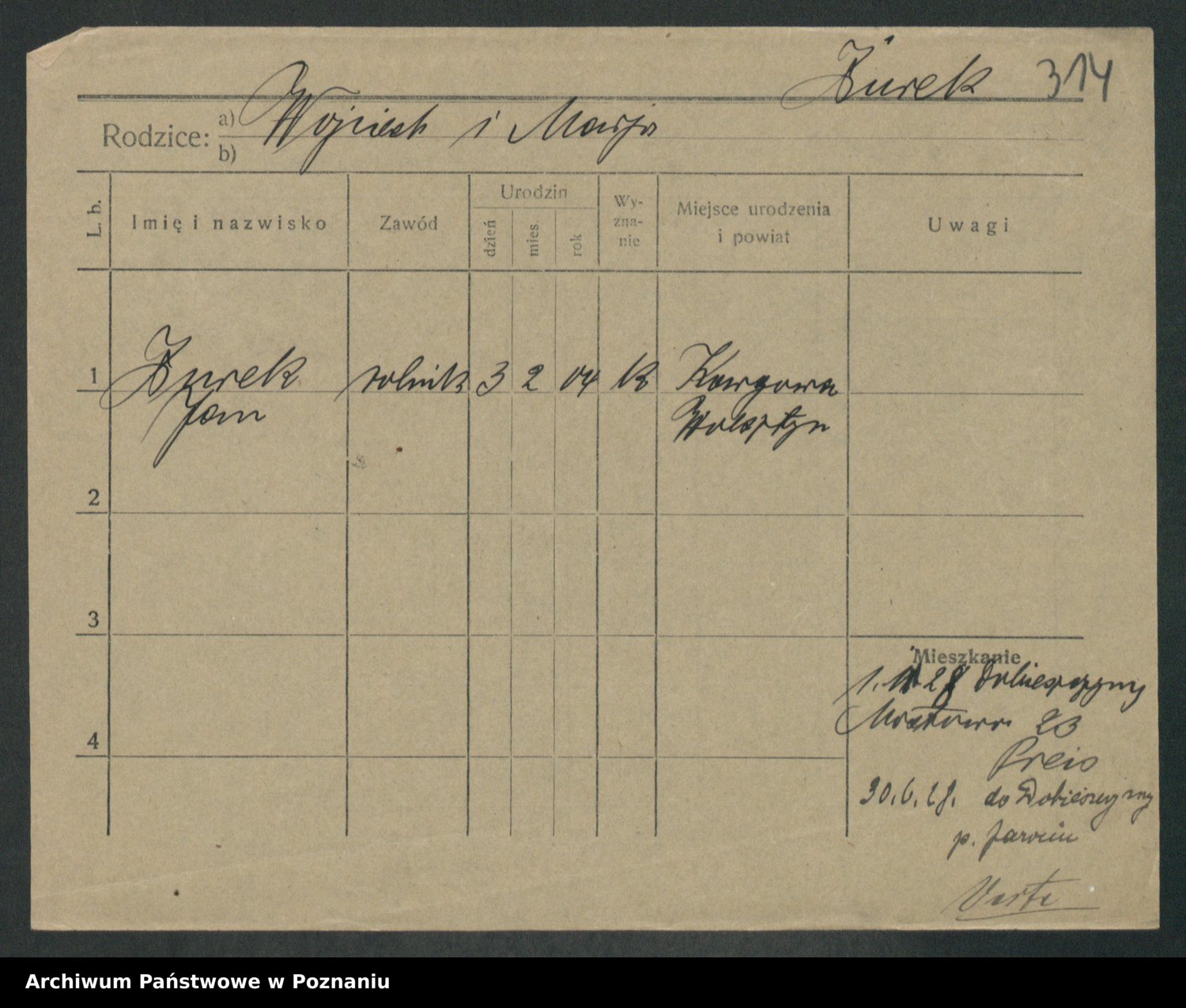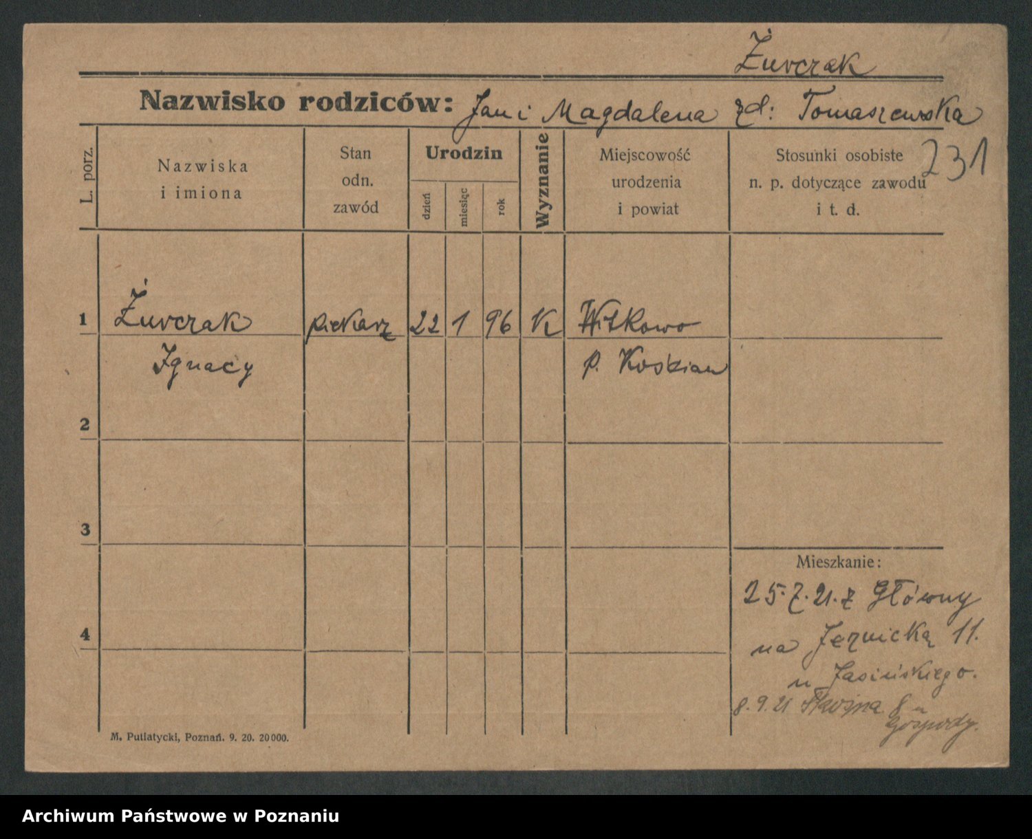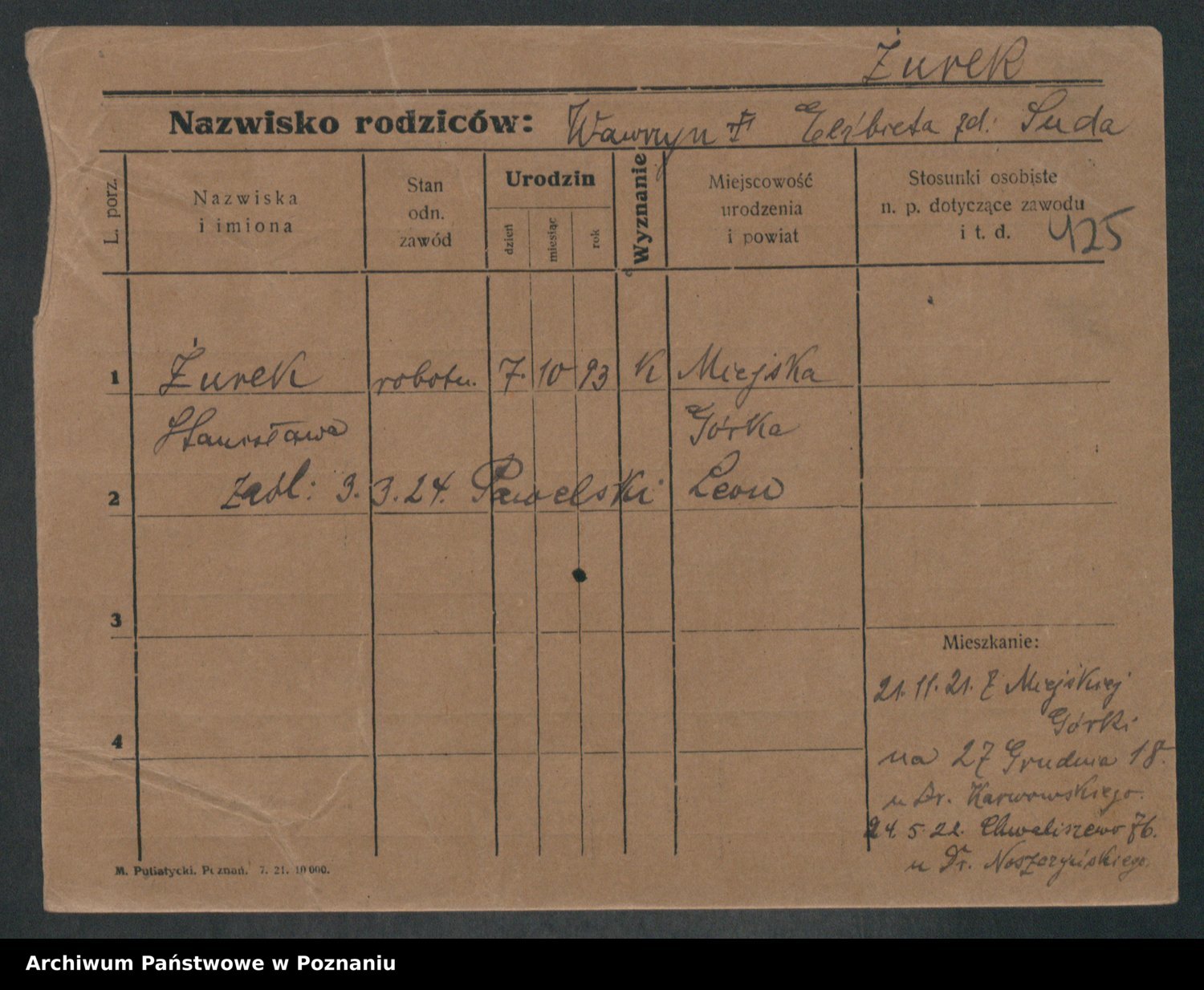 Podgląd karty osobowej dostępny jest po kliknięciu na nazwisko lub ikonkę karty. Można dokonywać powiększenia (ikony na górze) lub przechodzić między kolejnymi skanami (strzałki po bokach).