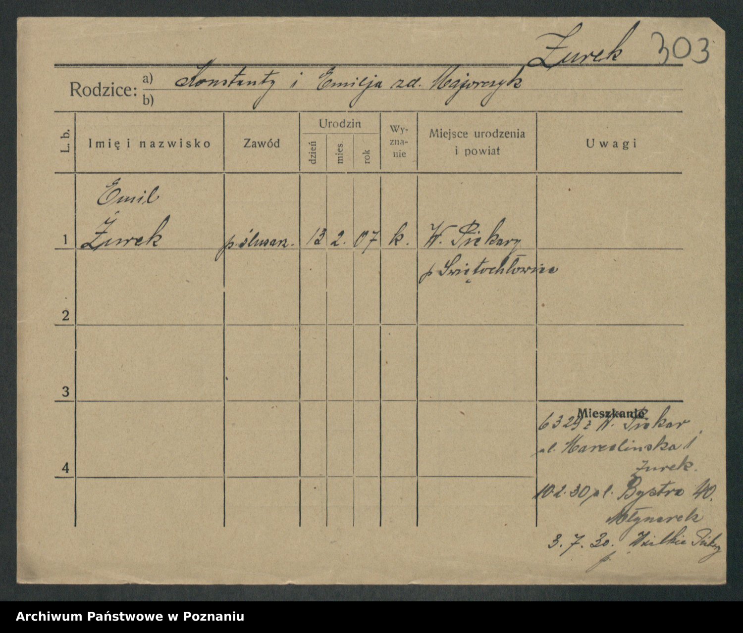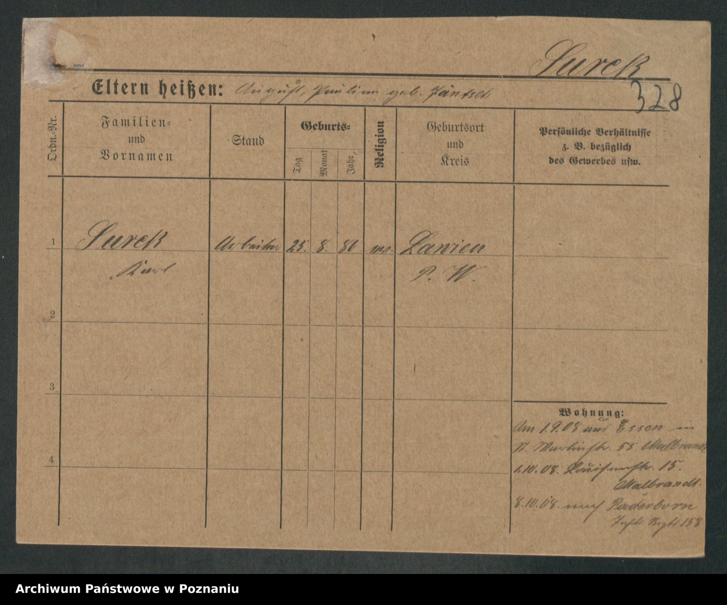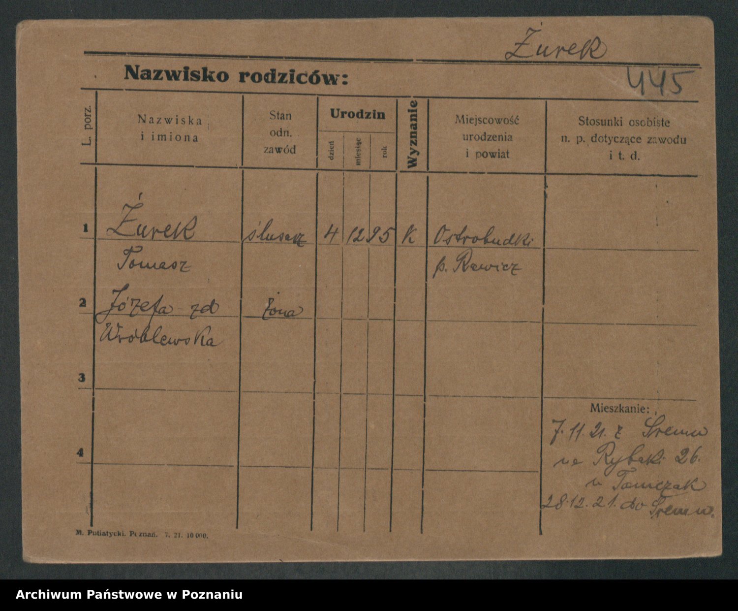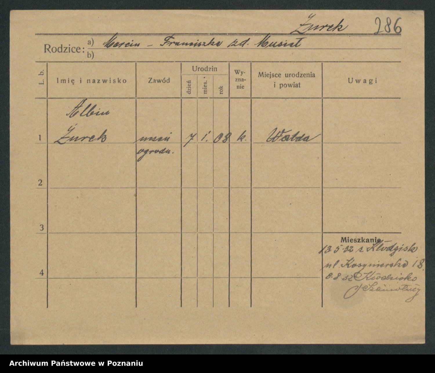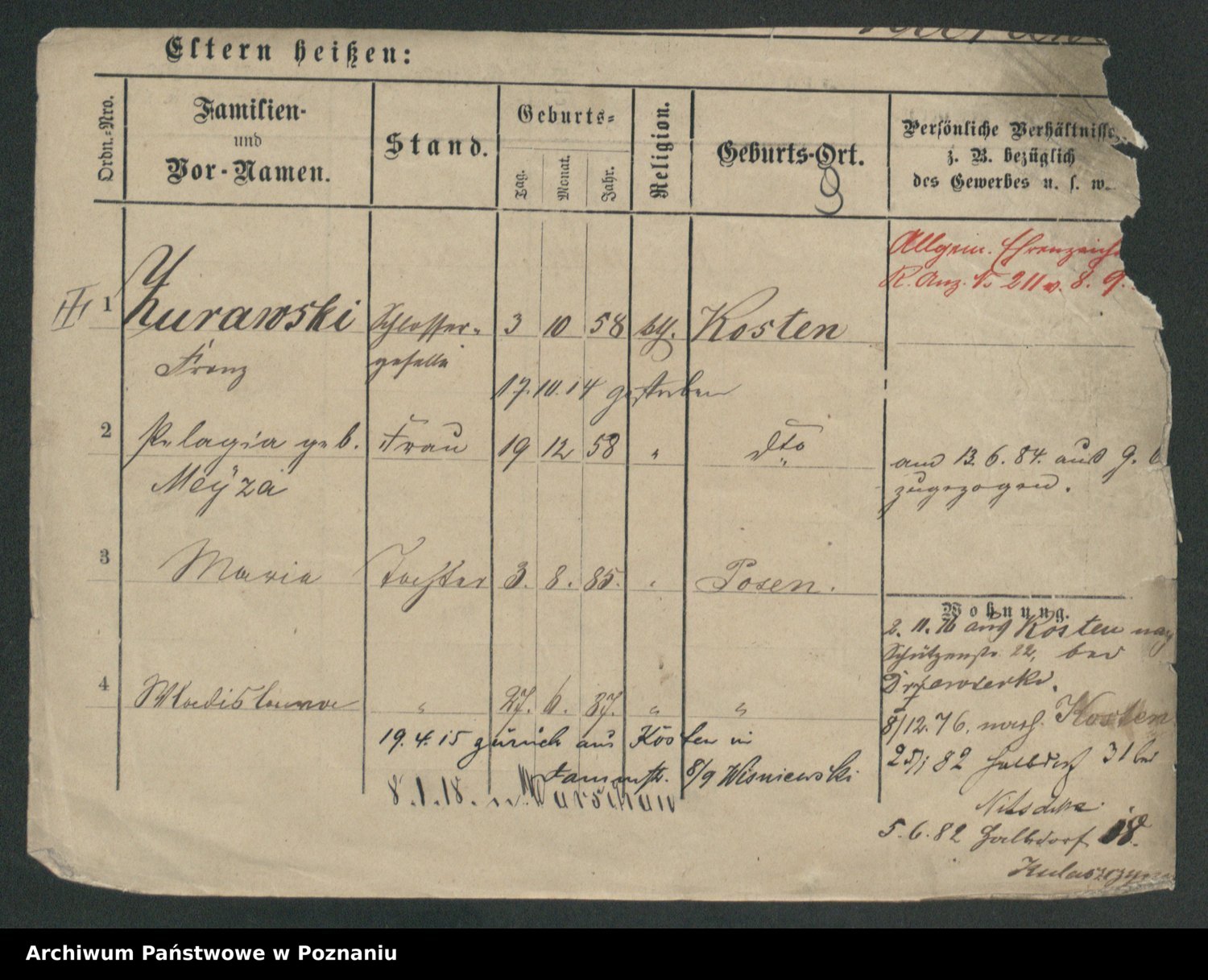 Podgląd karty osobowej dostępny jest po kliknięciu na nazwisko lub ikonkę karty. Można dokonywać powiększenia (ikony na górze) lub przechodzić między kolejnymi skanami (strzałki po bokach).