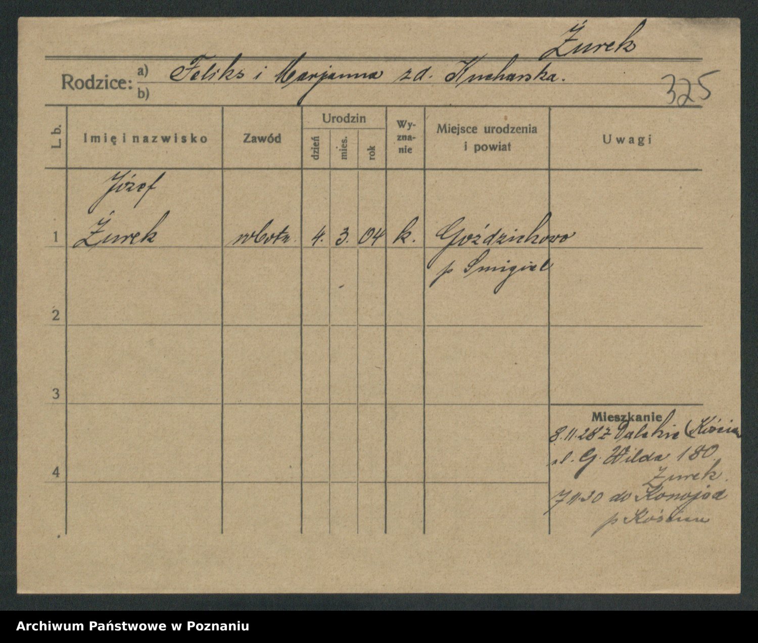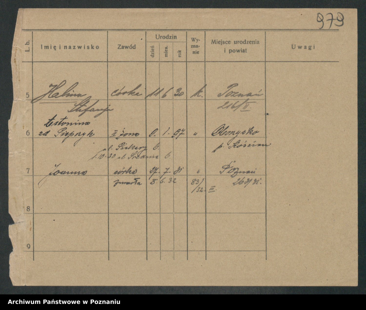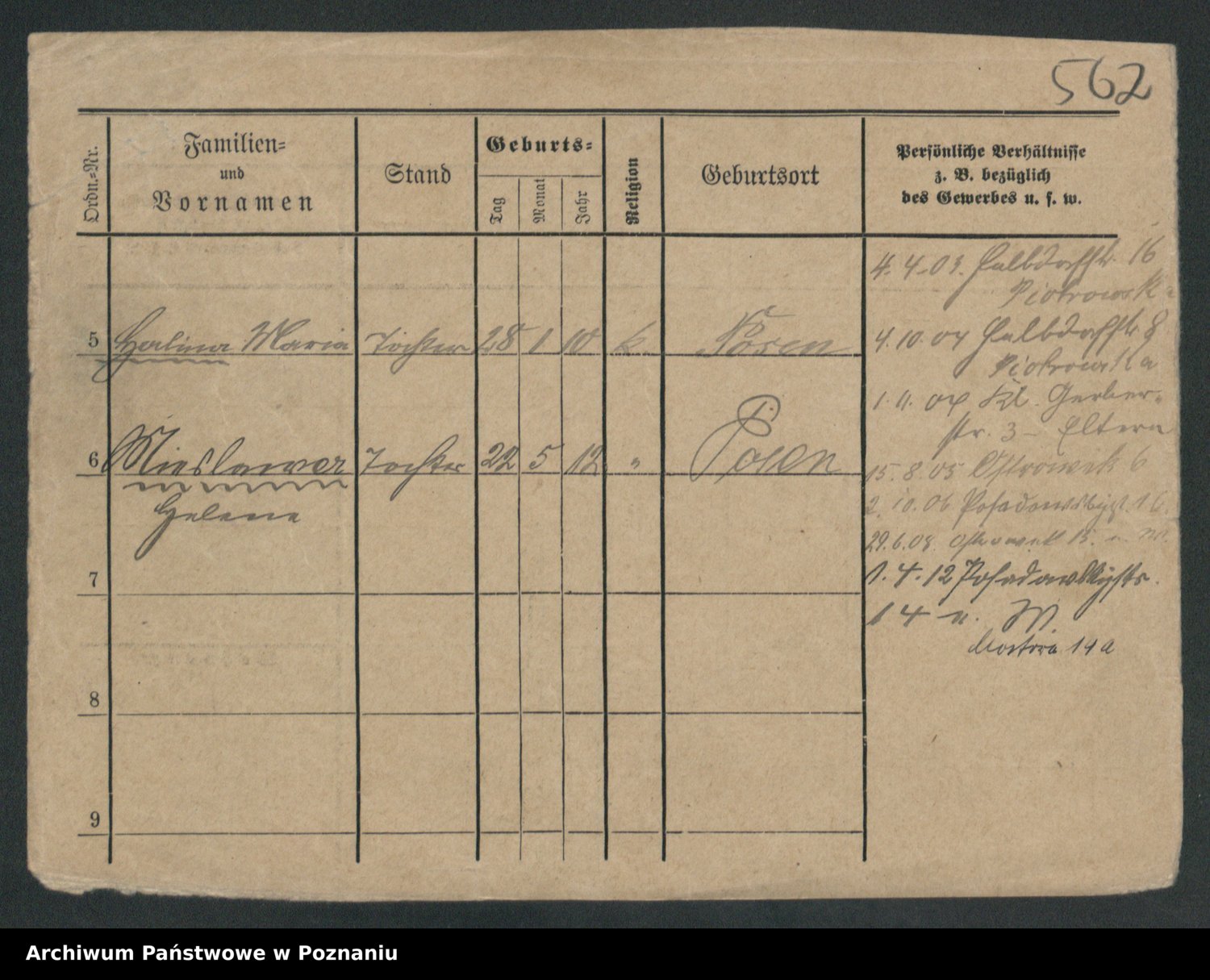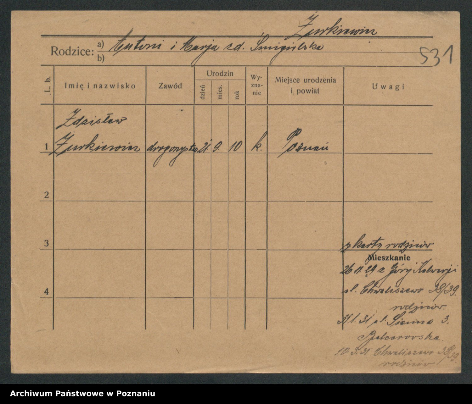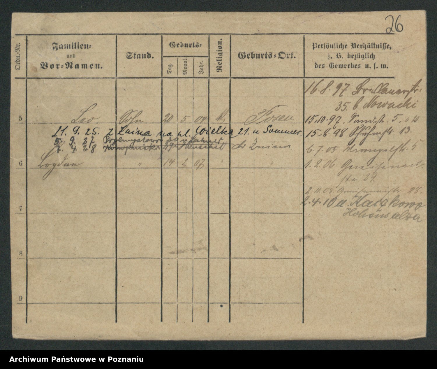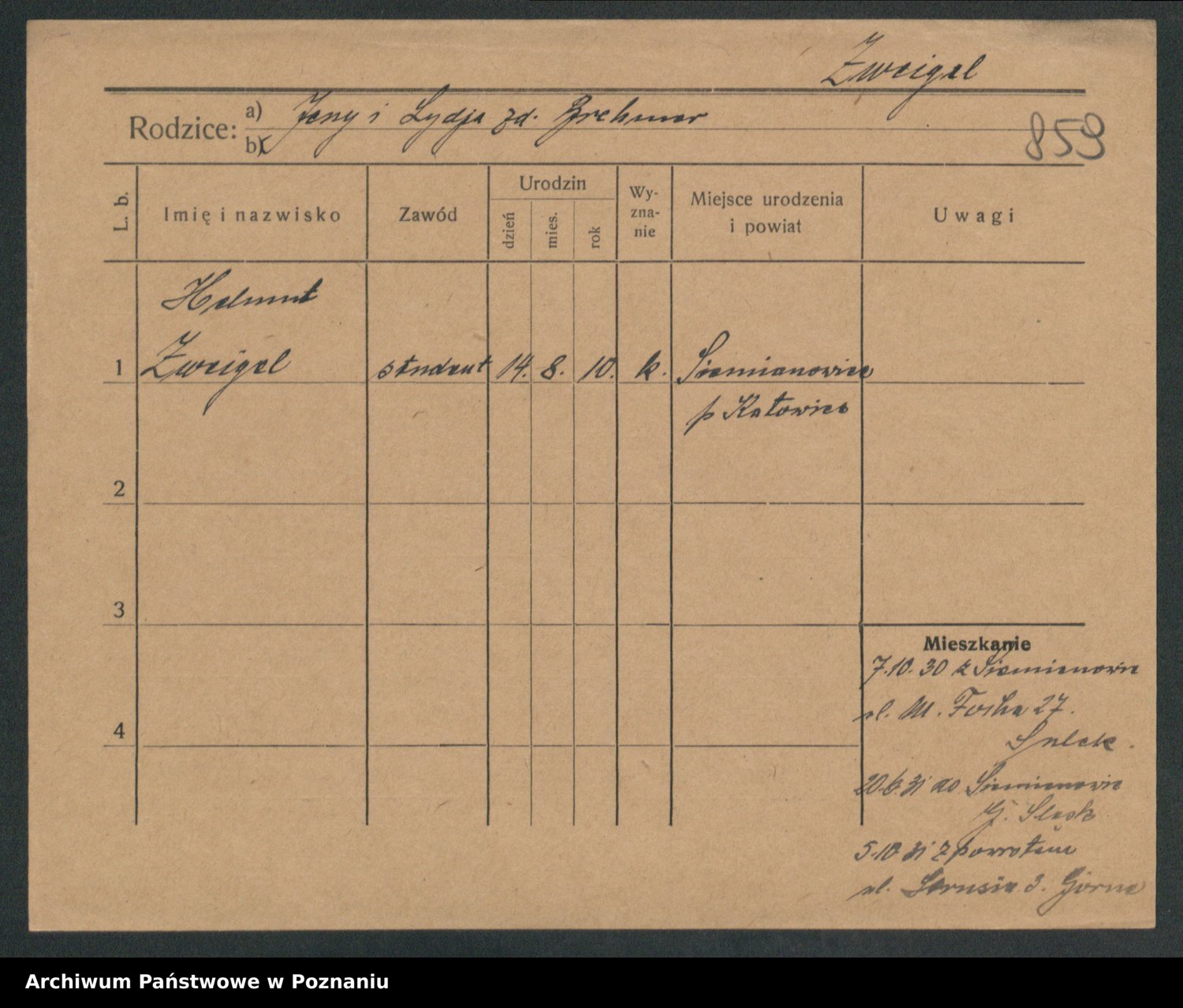 Podgląd karty osobowej dostępny jest po kliknięciu na nazwisko lub ikonkę karty. Można dokonywać powiększenia (ikony na górze) lub przechodzić między kolejnymi skanami (strzałki po bokach).