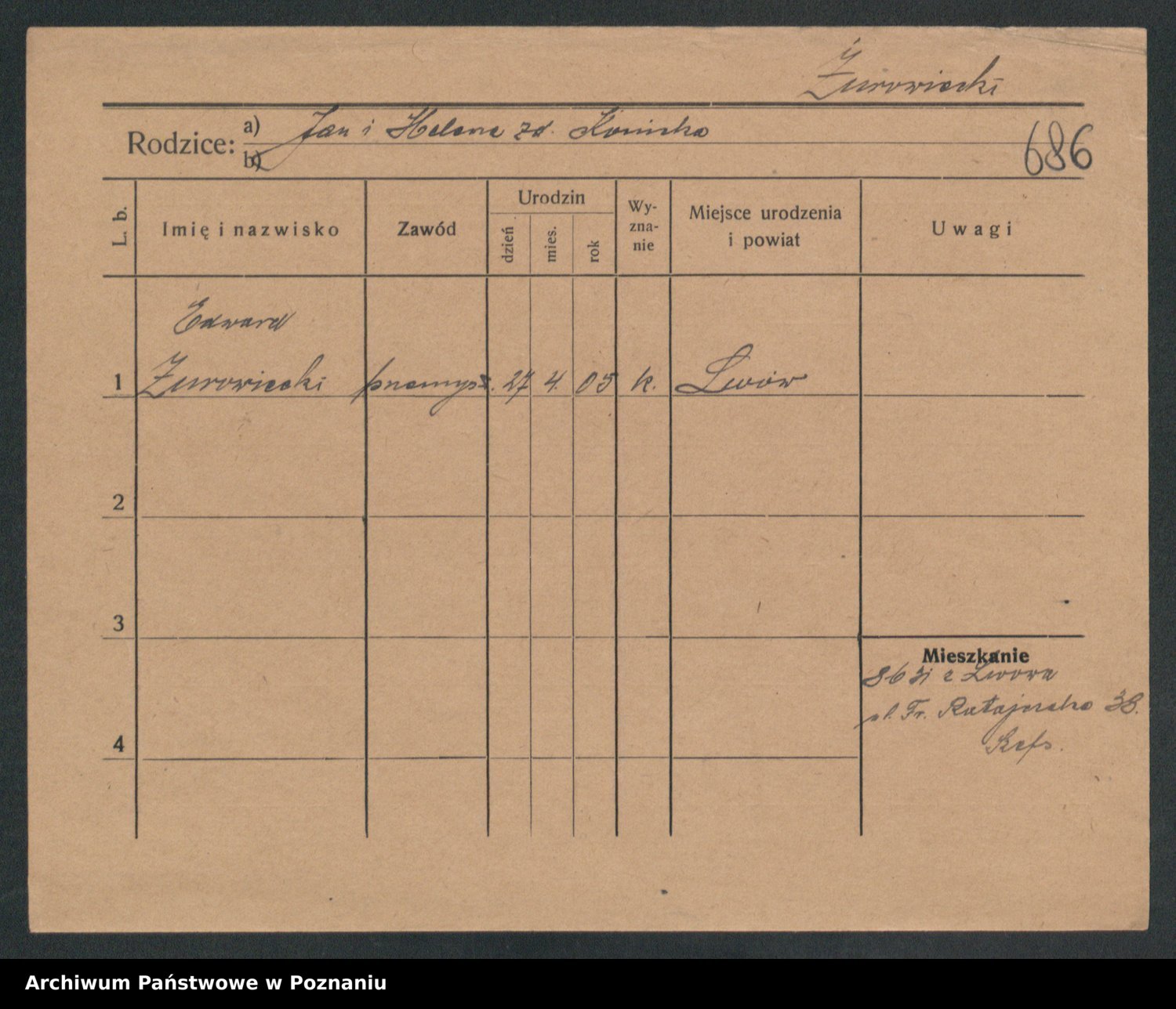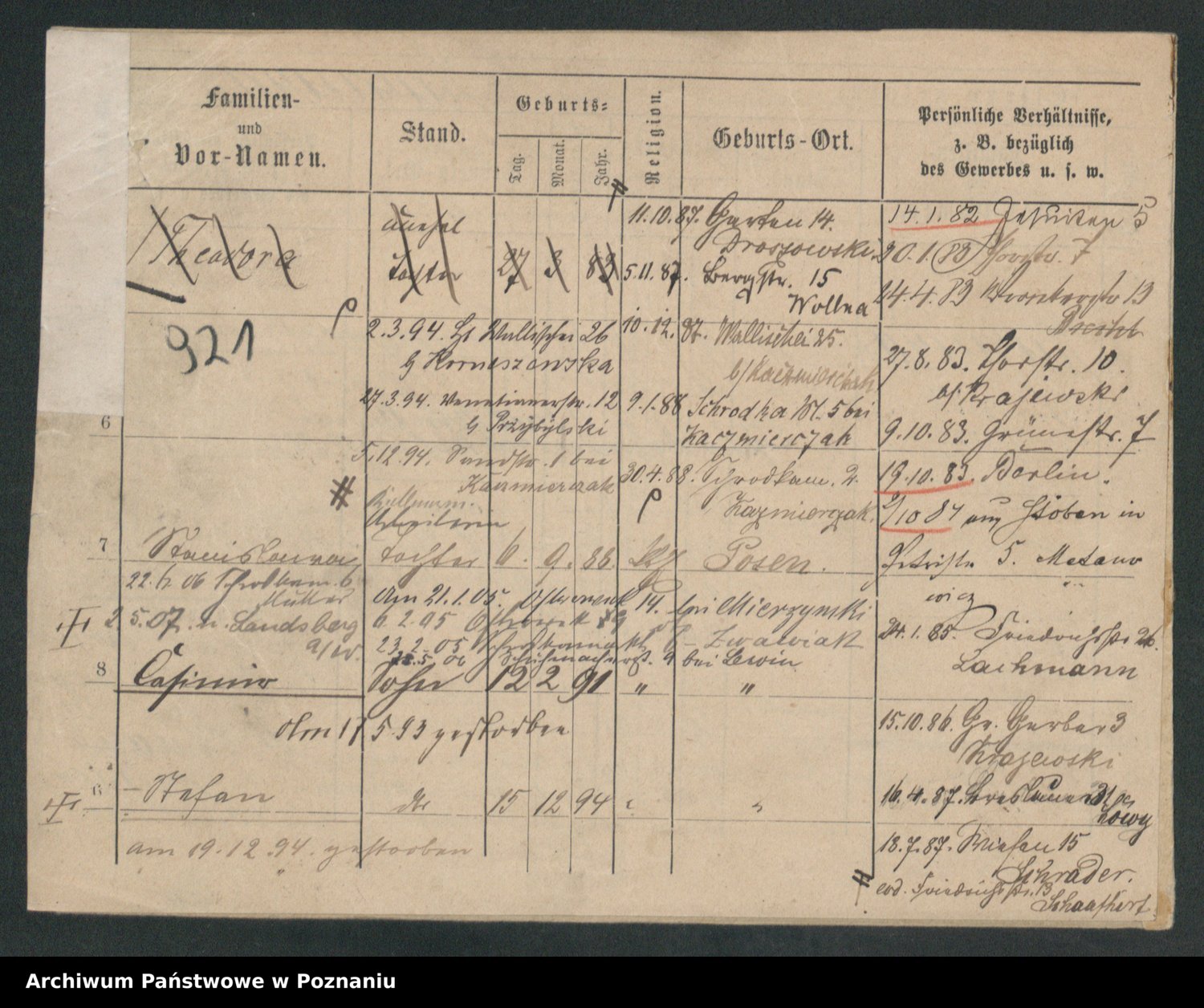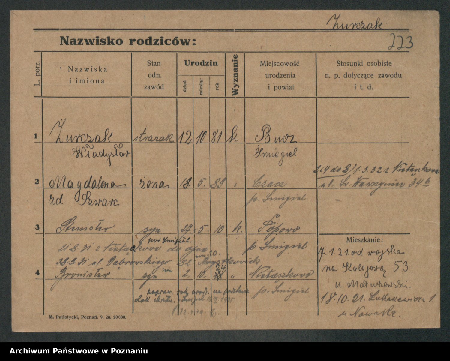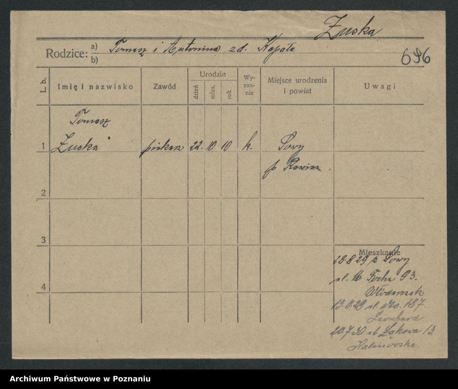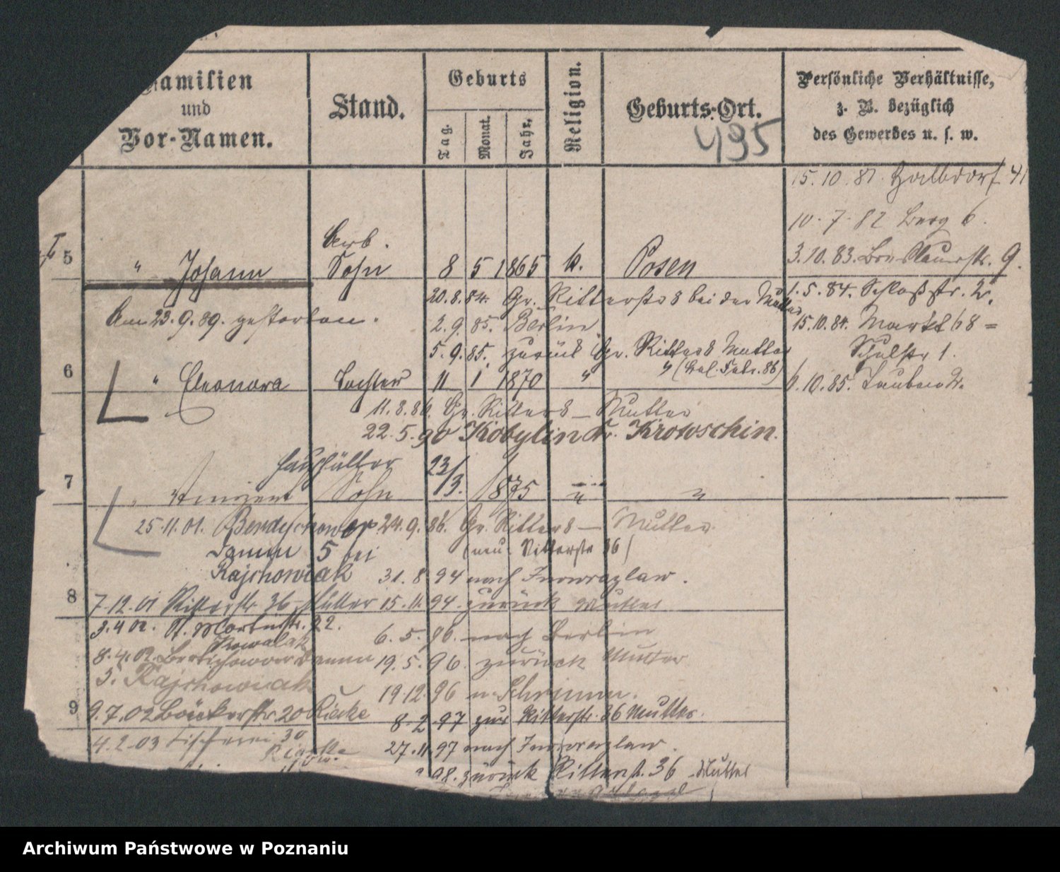 Podgląd karty osobowej dostępny jest po kliknięciu na nazwisko lub ikonkę karty. Można dokonywać powiększenia (ikony na górze) lub przechodzić między kolejnymi skanami (strzałki po bokach).