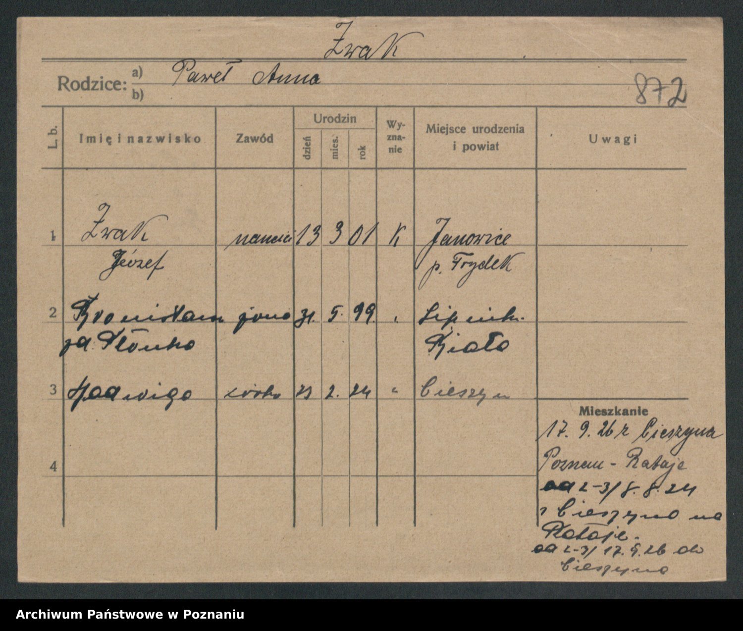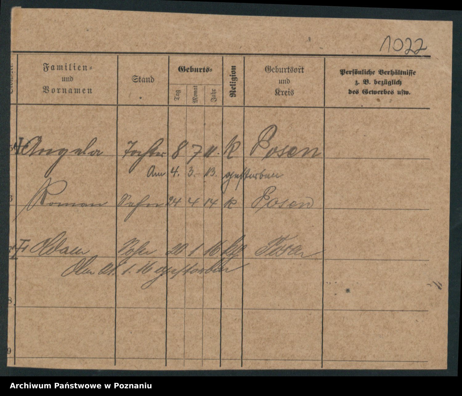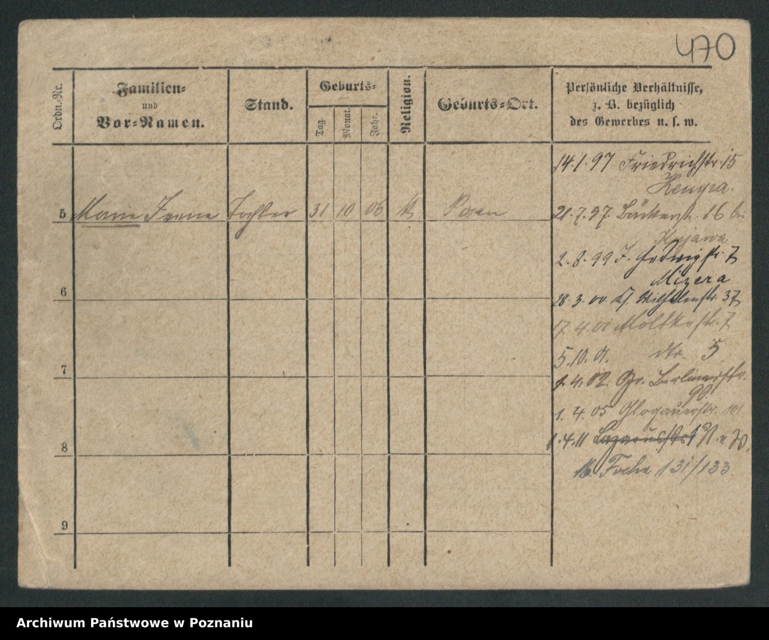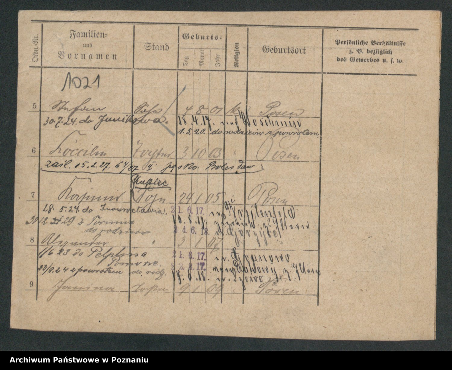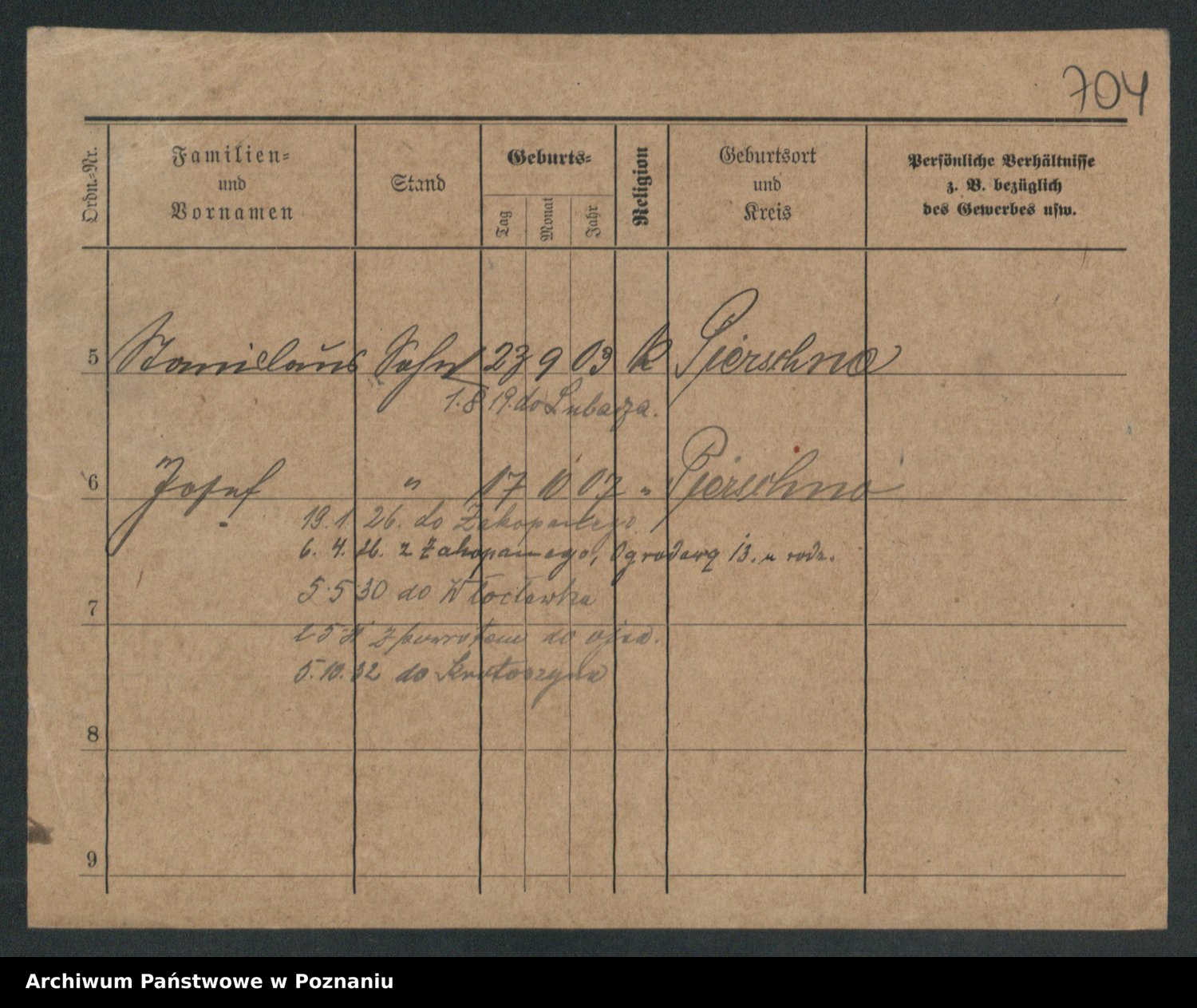Podgląd karty osobowej dostępny jest po kliknięciu na nazwisko lub ikonkę karty. Można dokonywać powiększenia (ikony na górze) lub przechodzić między kolejnymi skanami (strzałki po bokach).