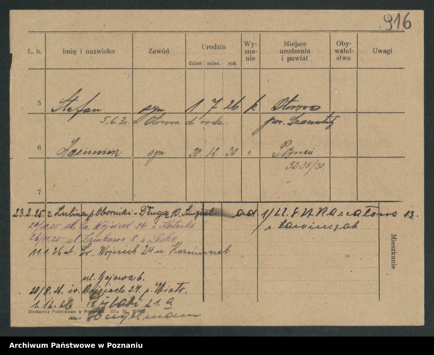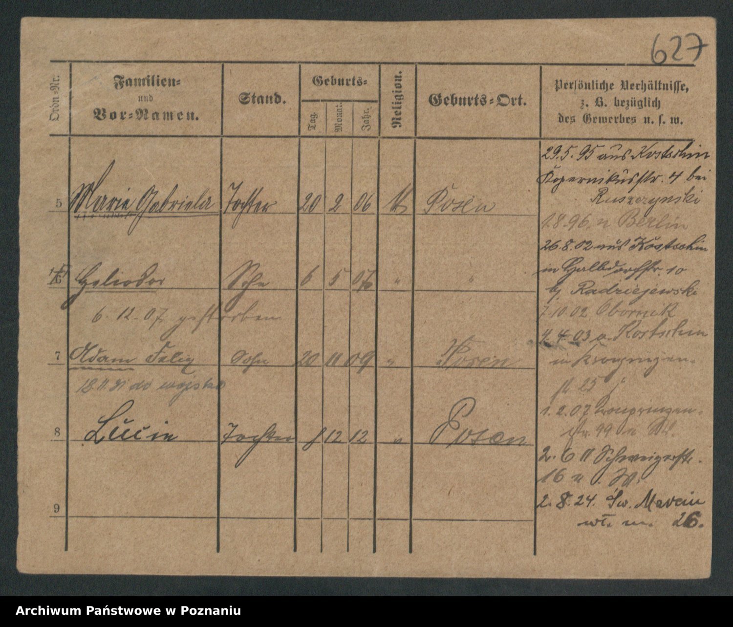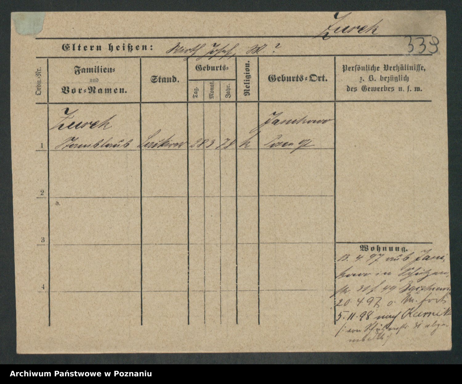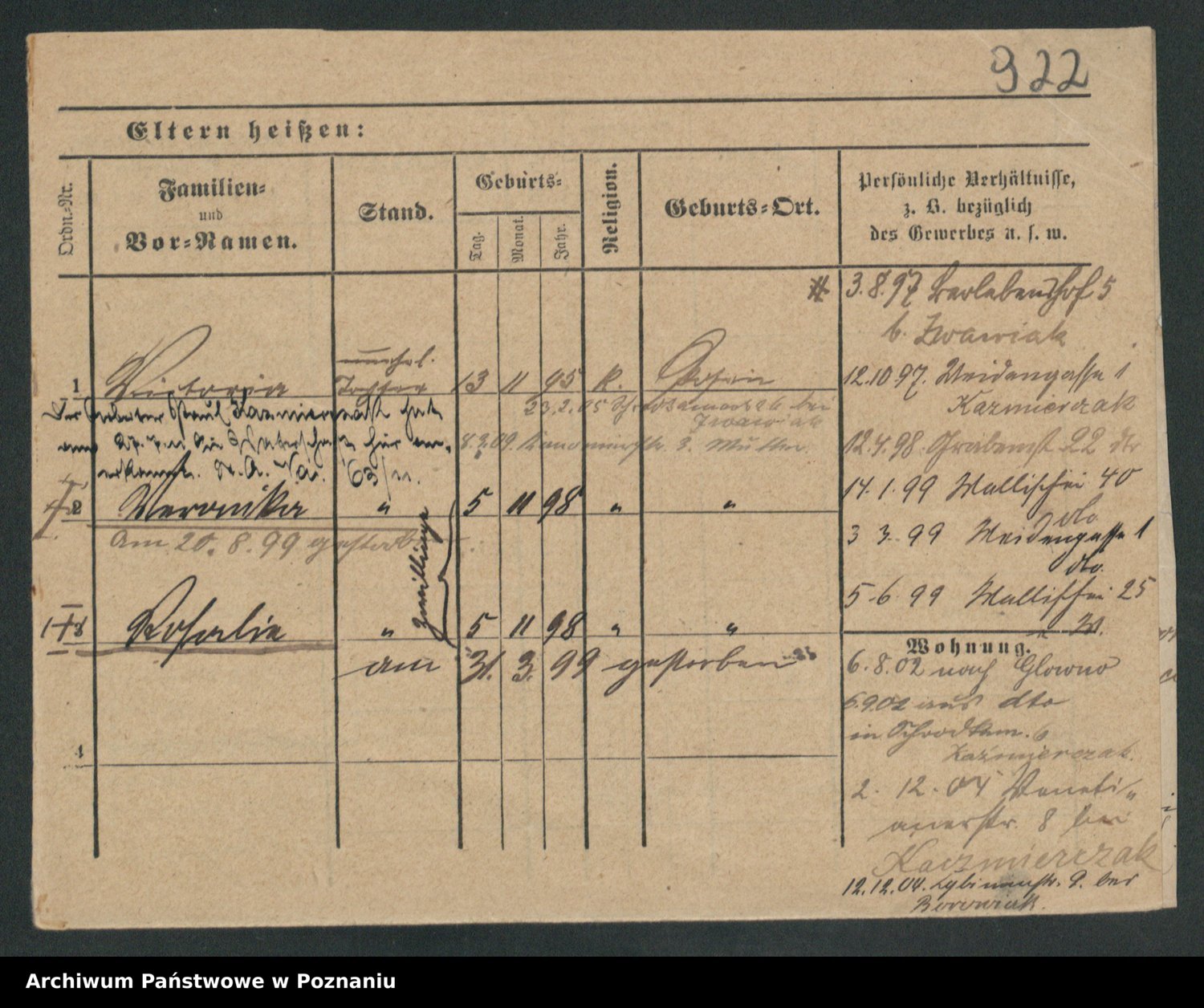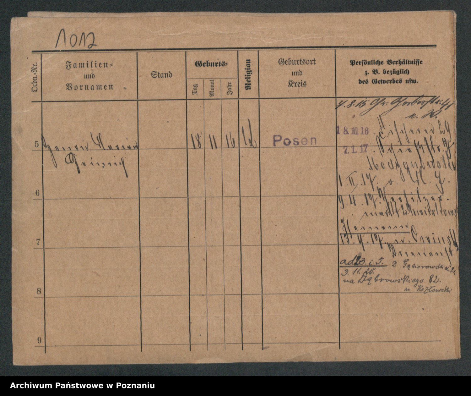 Podgląd karty osobowej dostępny jest po kliknięciu na nazwisko lub ikonkę karty. Można dokonywać powiększenia (ikony na górze) lub przechodzić między kolejnymi skanami (strzałki po bokach).