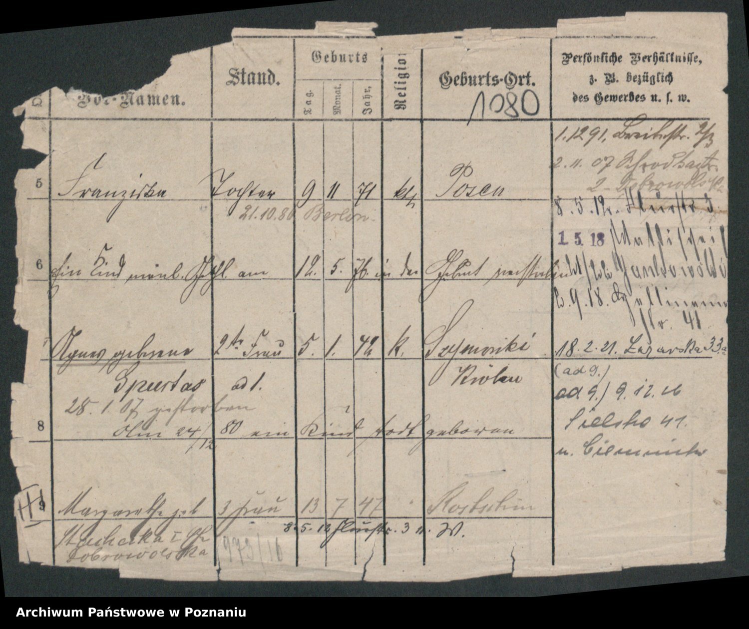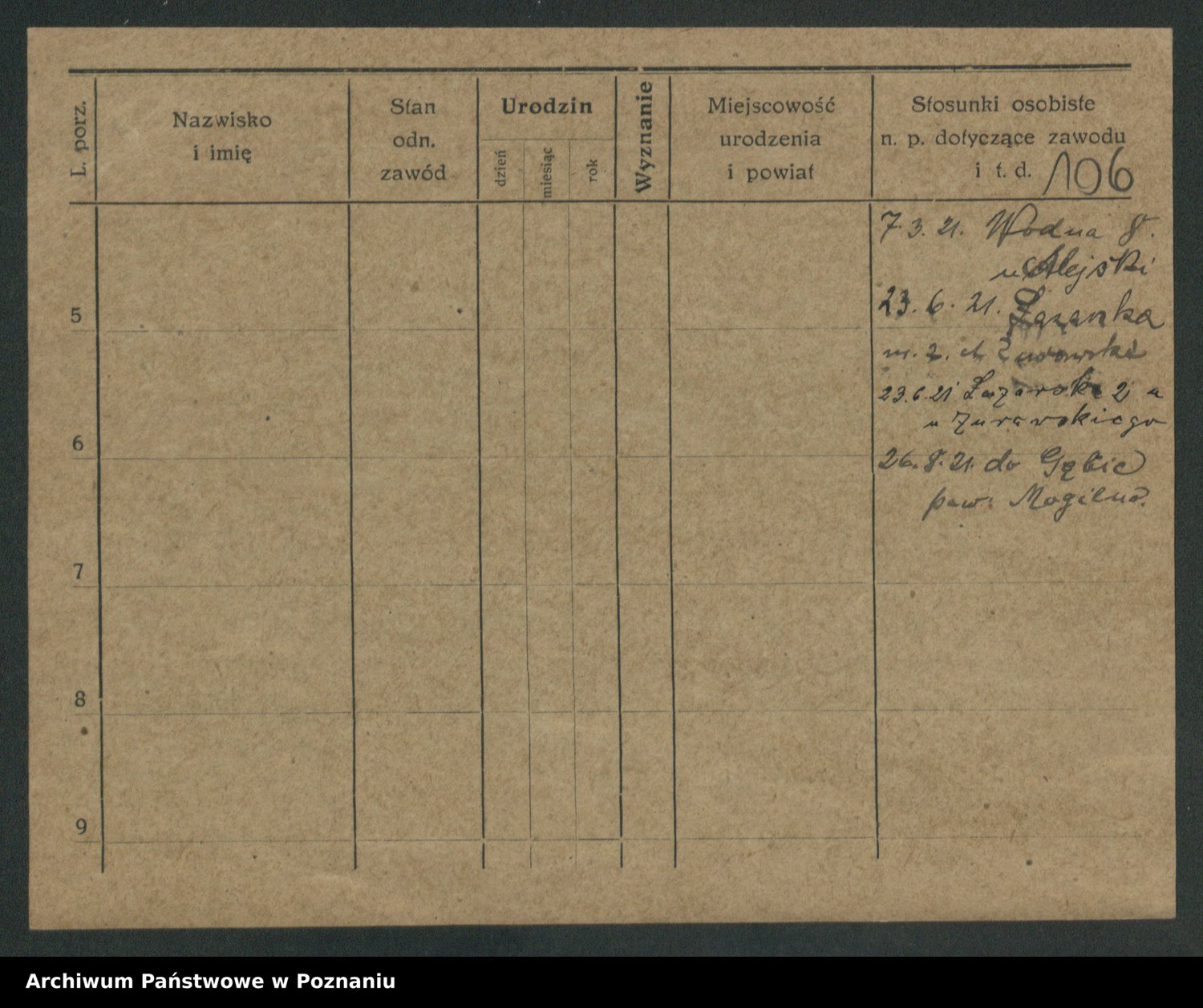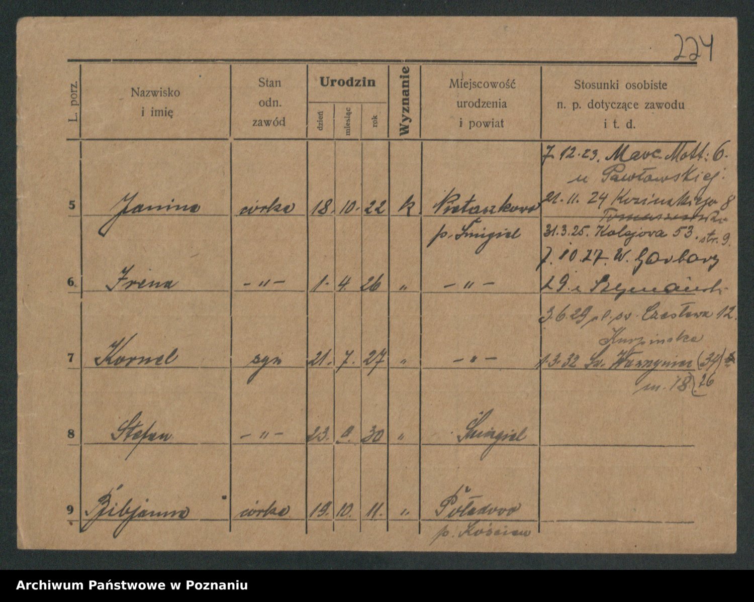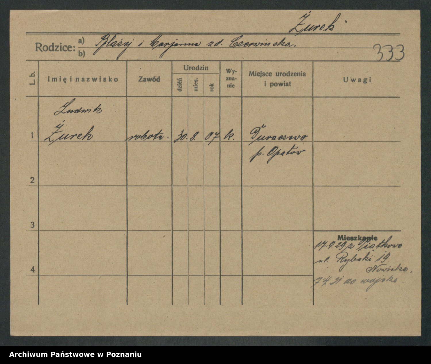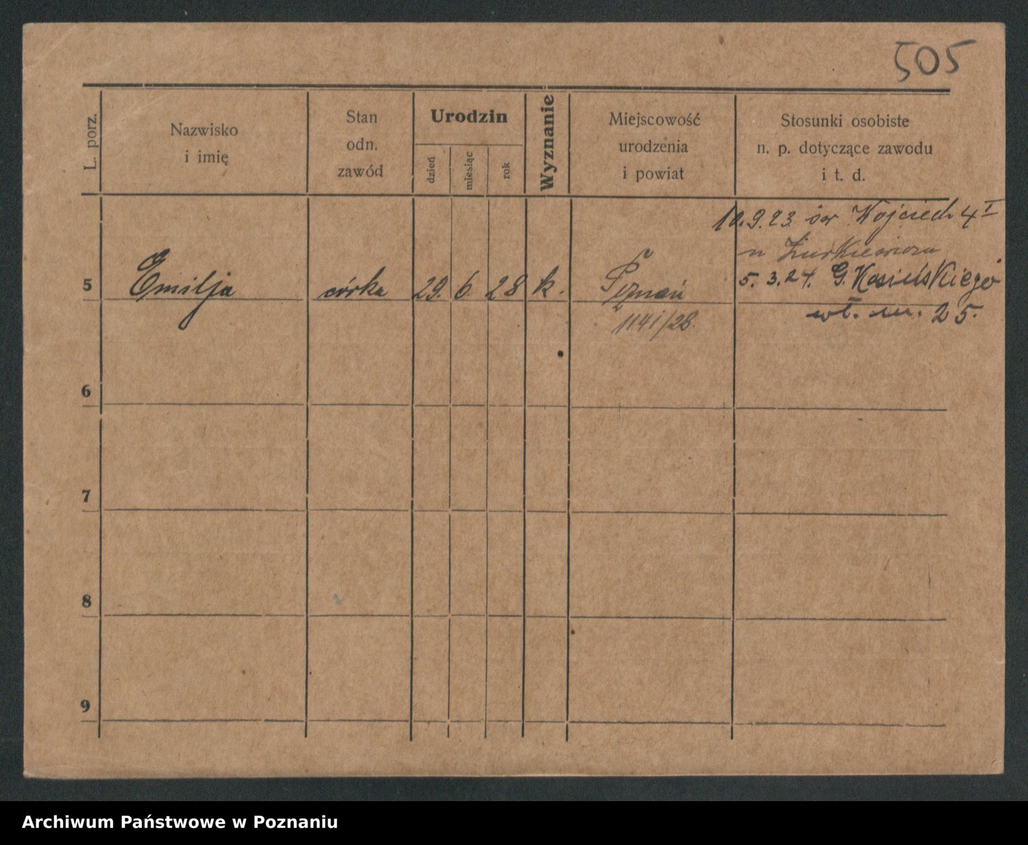 Podgląd karty osobowej dostępny jest po kliknięciu na nazwisko lub ikonkę karty. Można dokonywać powiększenia (ikony na górze) lub przechodzić między kolejnymi skanami (strzałki po bokach).