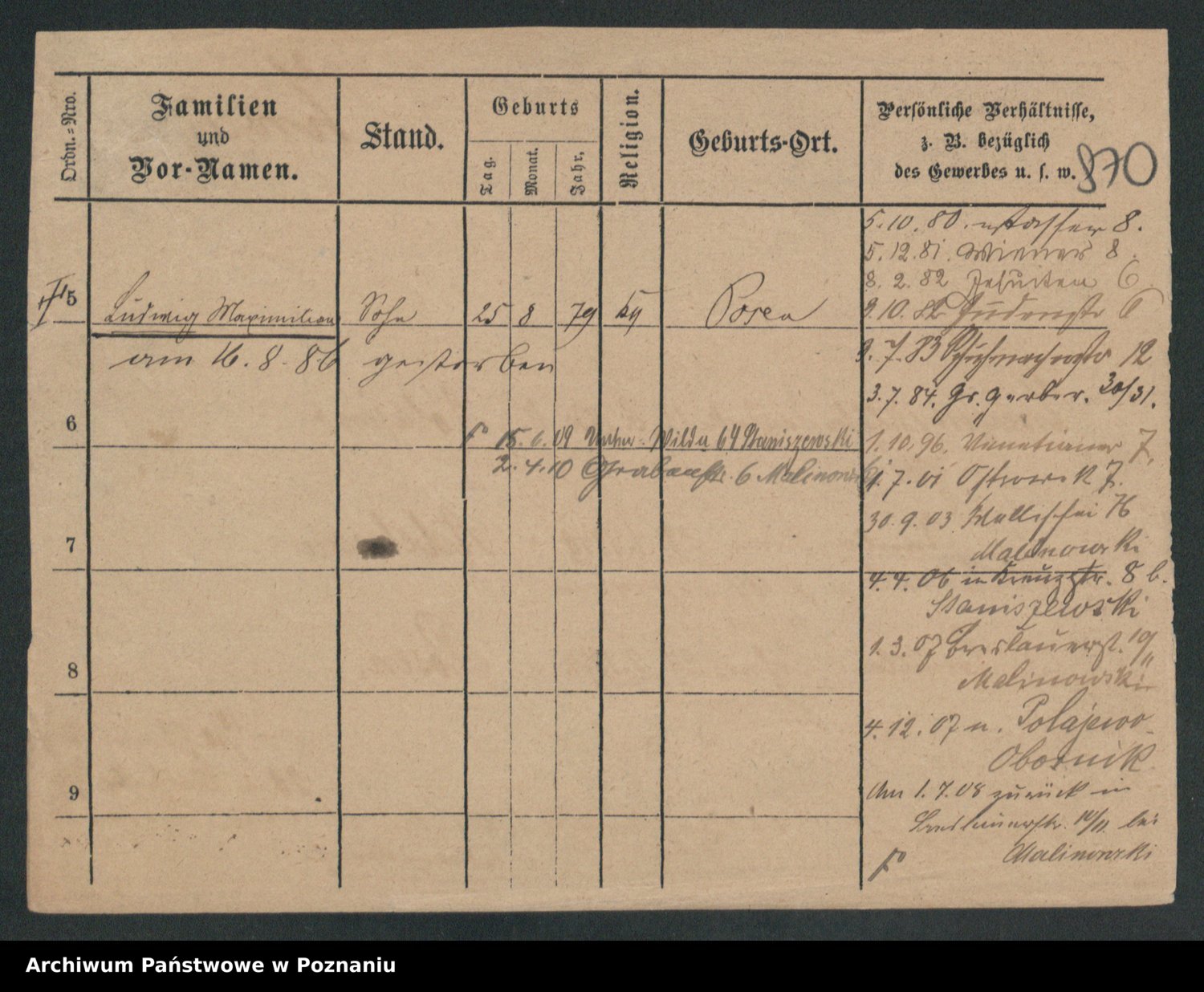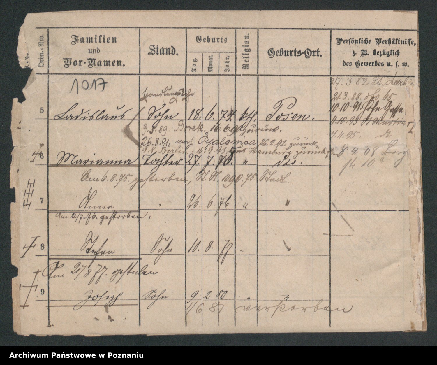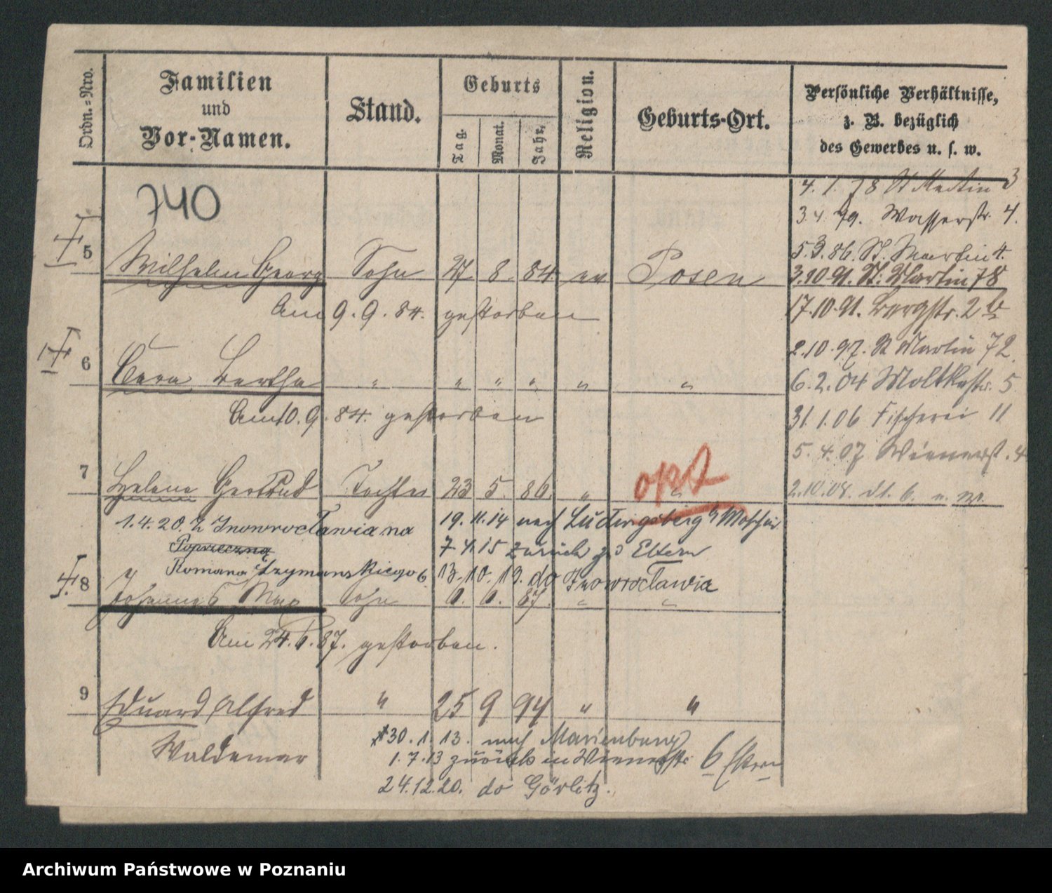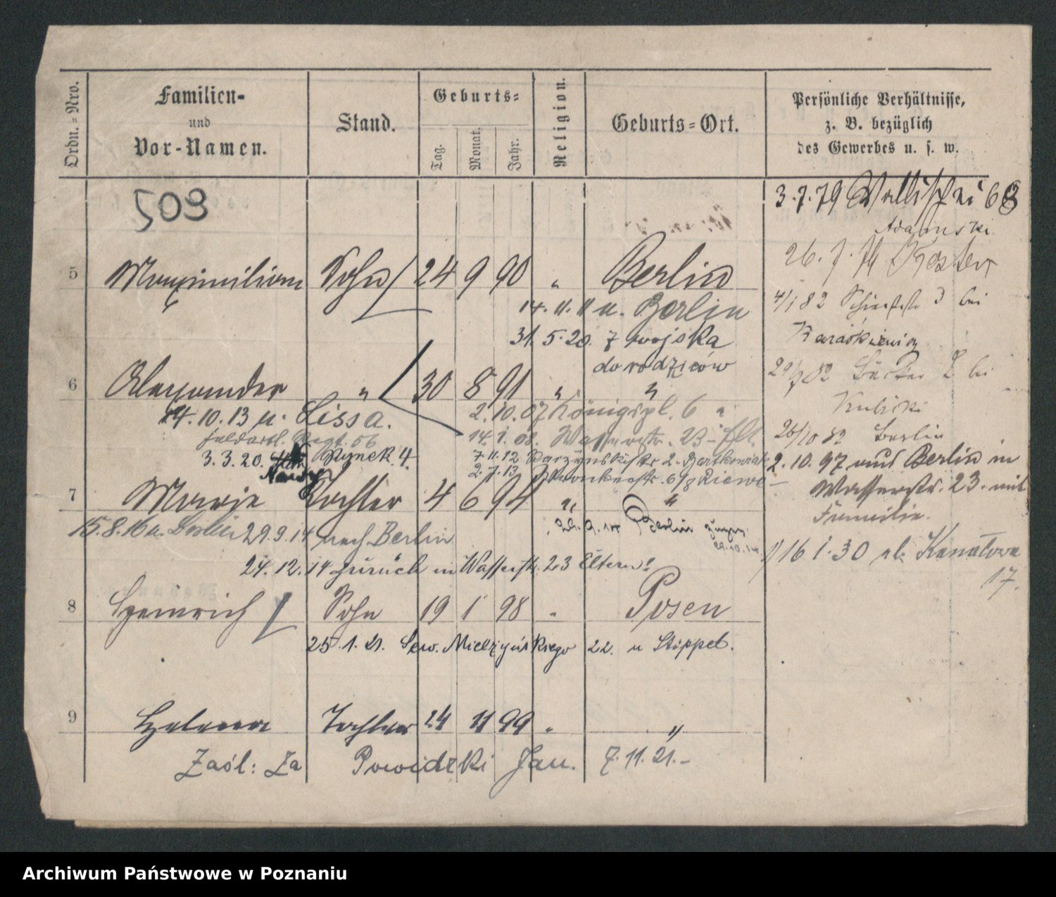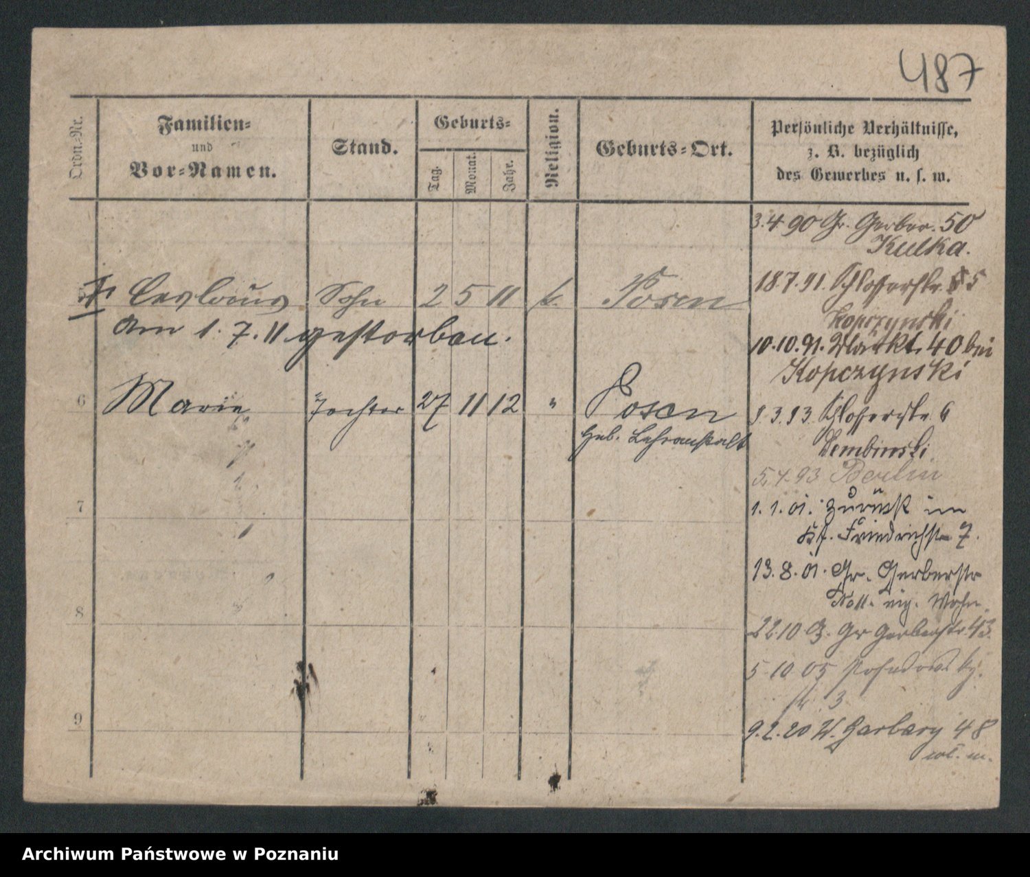 Podgląd karty osobowej dostępny jest po kliknięciu na nazwisko lub ikonkę karty. Można dokonywać powiększenia (ikony na górze) lub przechodzić między kolejnymi skanami (strzałki po bokach).
