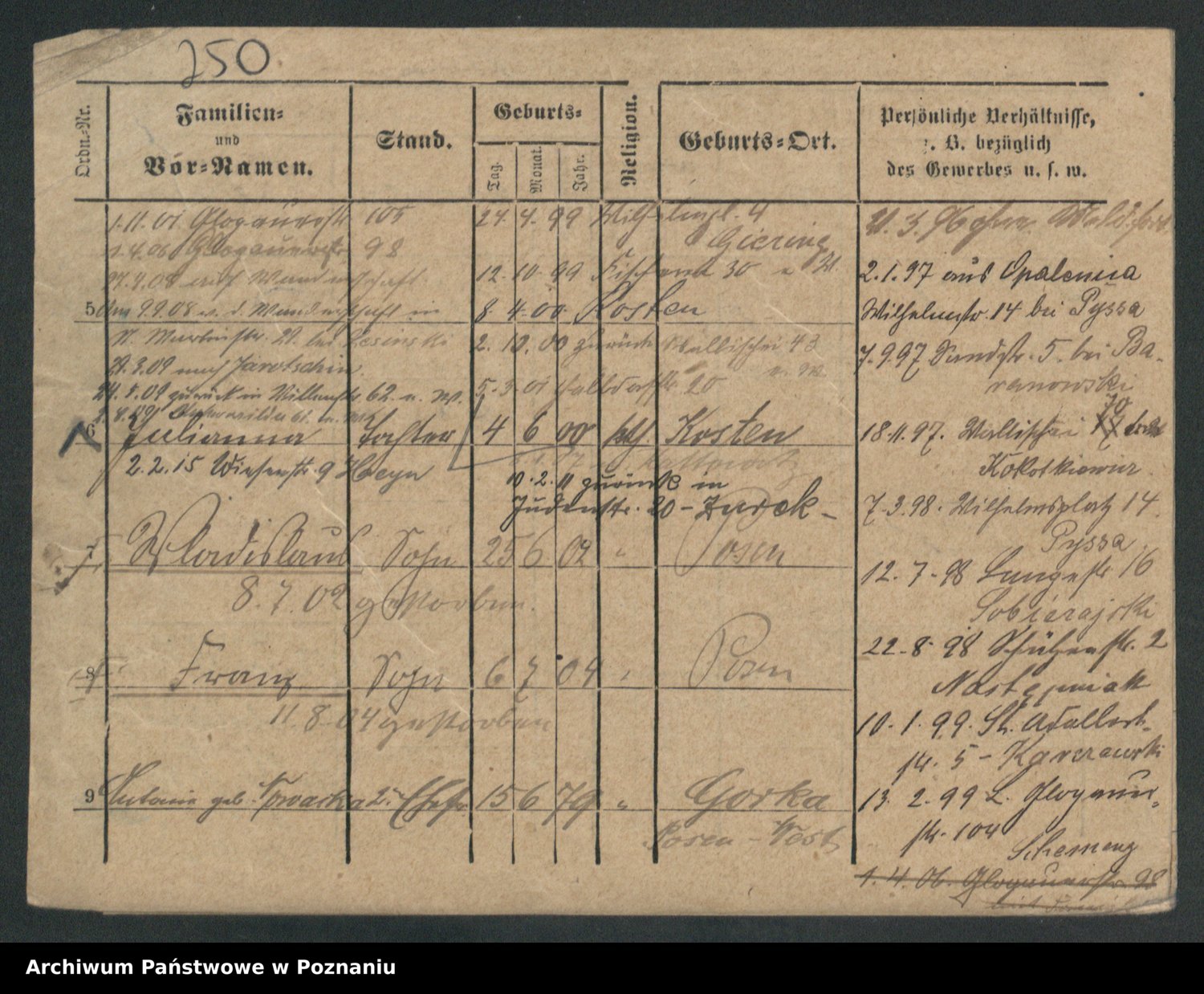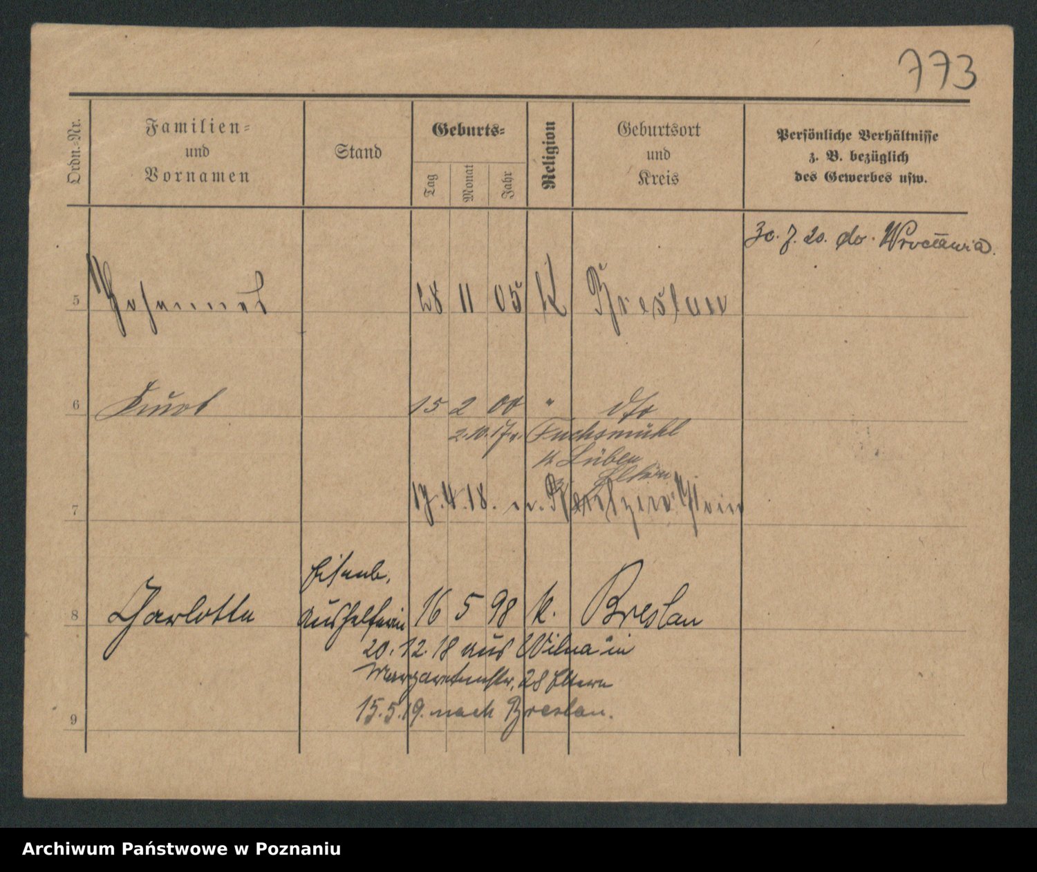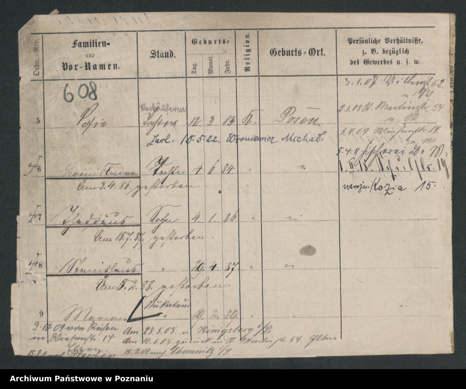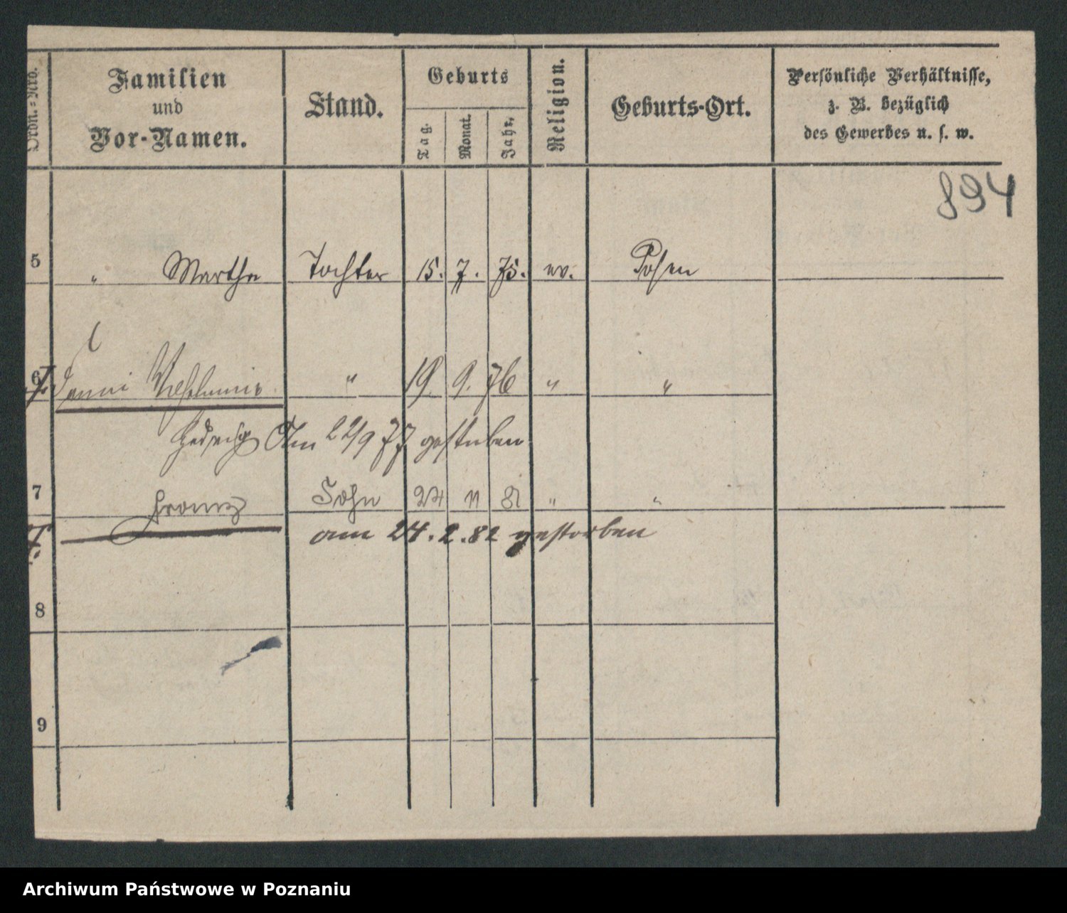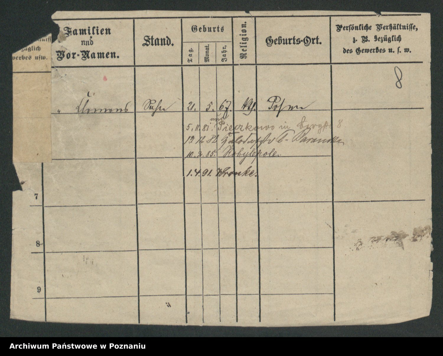 Podgląd karty osobowej dostępny jest po kliknięciu na nazwisko lub ikonkę karty. Można dokonywać powiększenia (ikony na górze) lub przechodzić między kolejnymi skanami (strzałki po bokach).